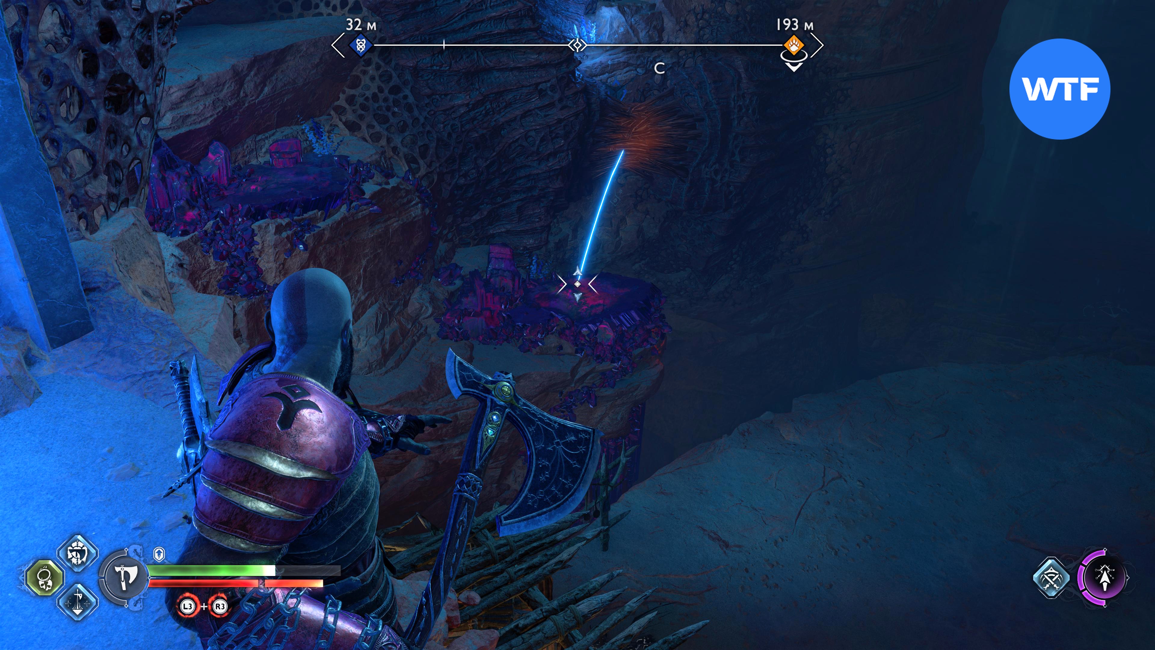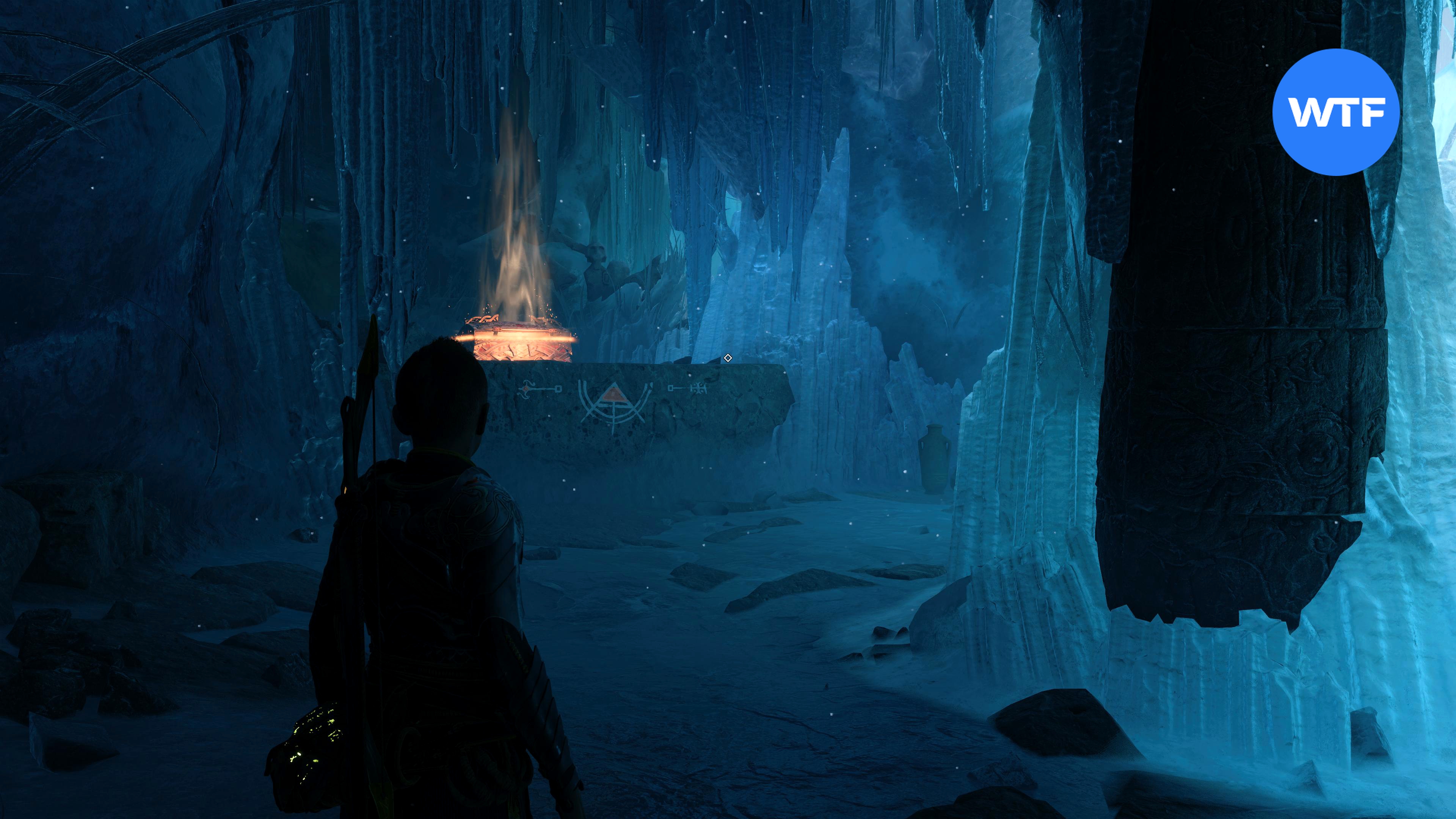 После этого следуйте за квестовой меткой и спускайтесь в логово дракона (см. скриншот 2). Внизу вам нужно кинуть топор в вертушку, а затем заморозить печать, чтобы поднять прутья клетки и добраться до сундука.
