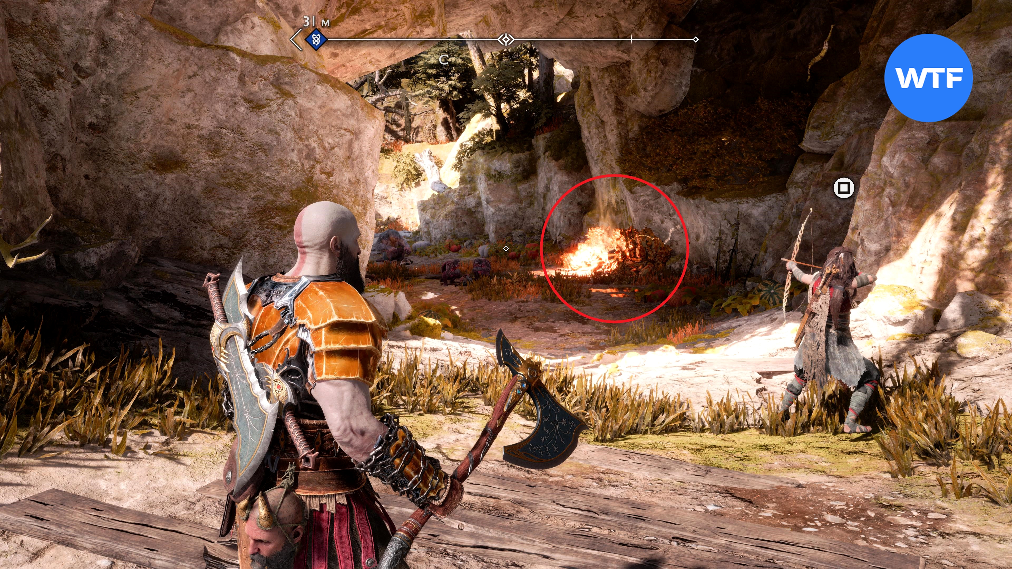 Перед стеной Асгарда, где вам нужно сжечь лозы, чтобы пройти дальше. Вы можете использовать этот же источник огня, чтобы убрать лозы с легендарного сундука, который стоит левее и ниже.