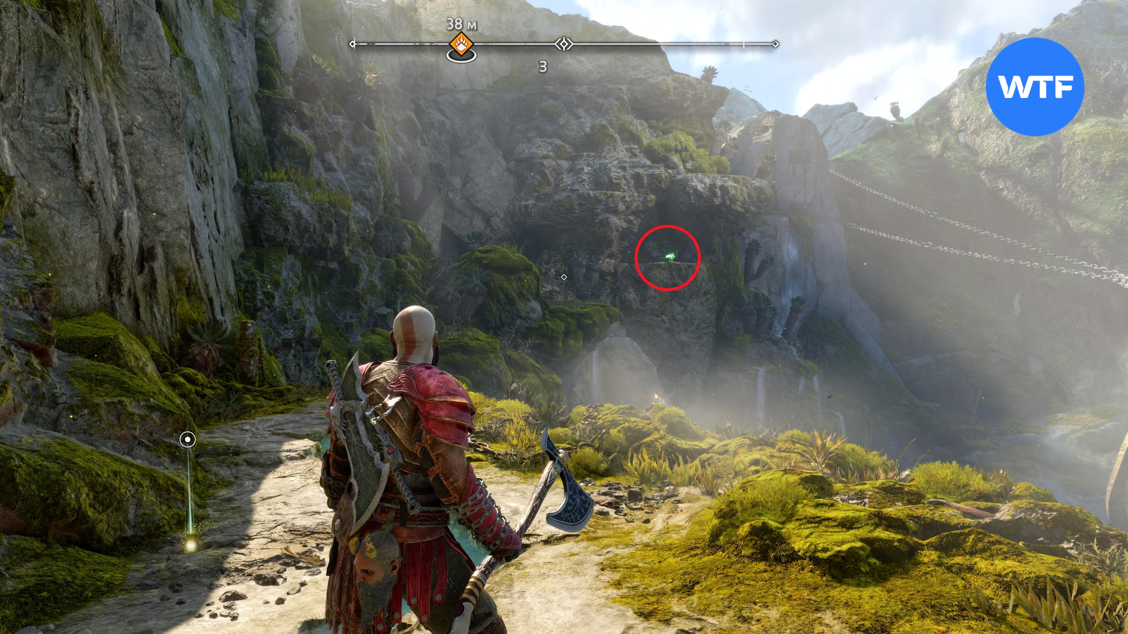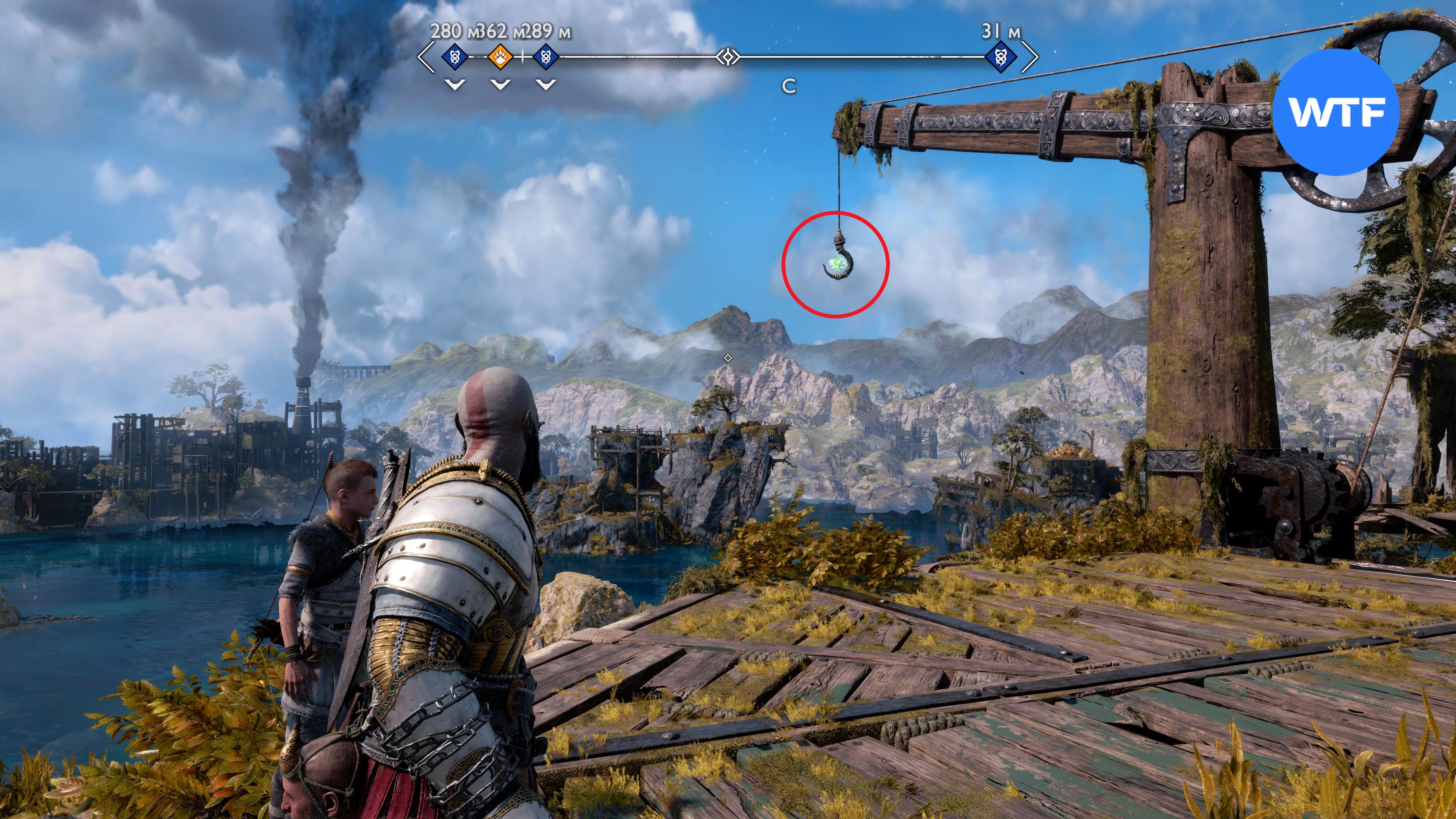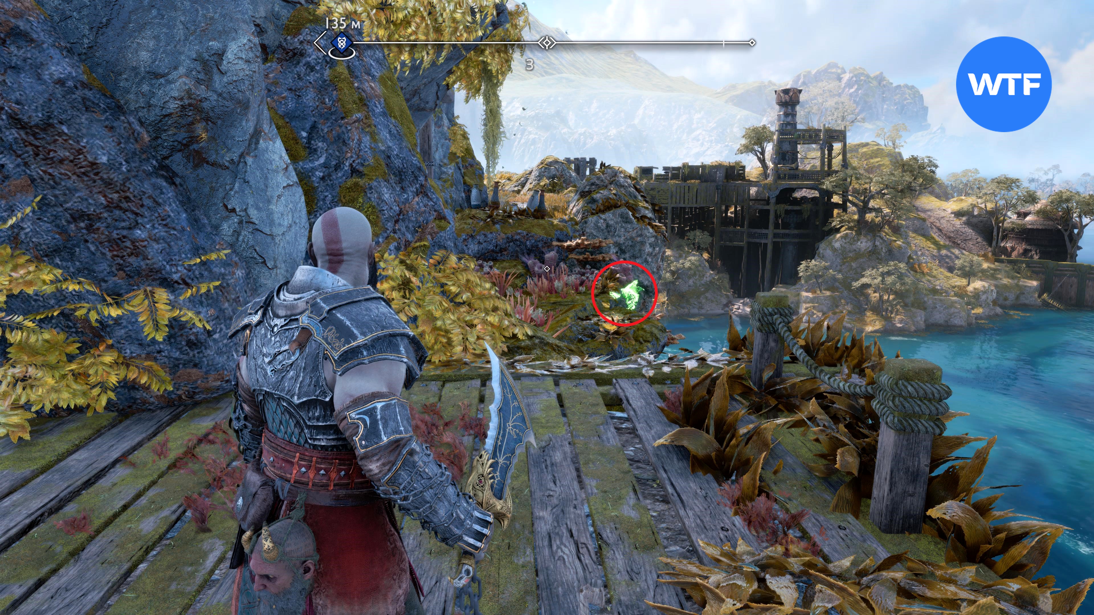 Прежде чем отплыть, освободите от лоз цепь, свисающую со скалы слева от сундука норн, и заберитесь по ней наверх. Там вы сможете использовать резец, чтобы открыть путь через реку.