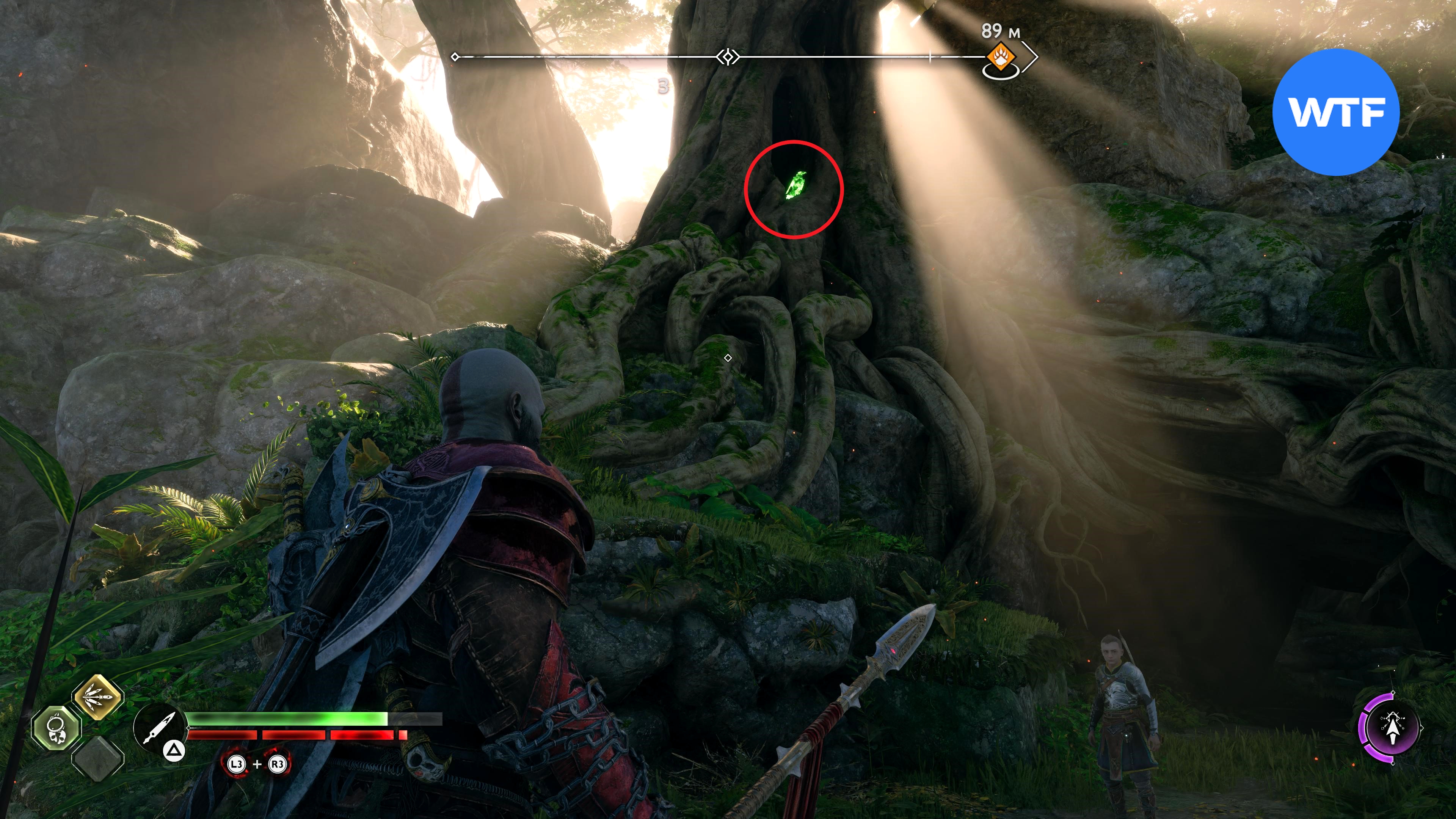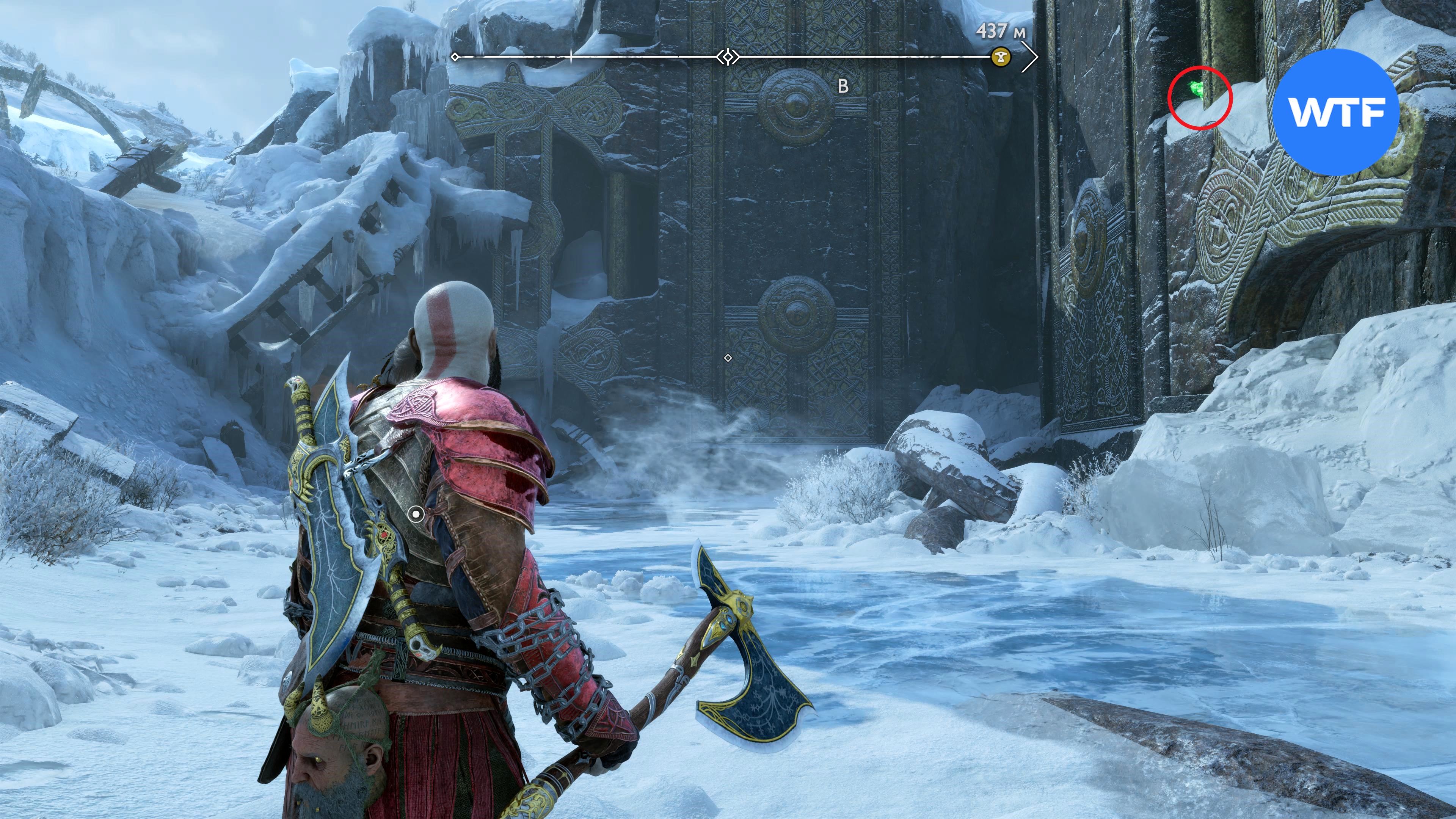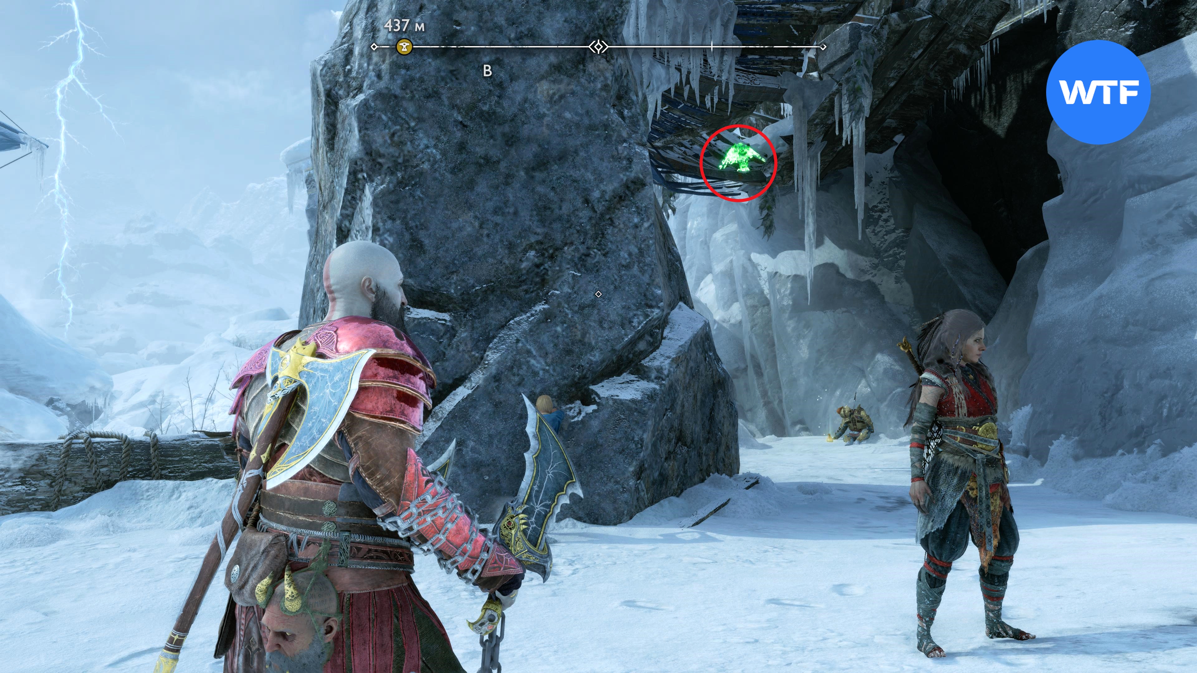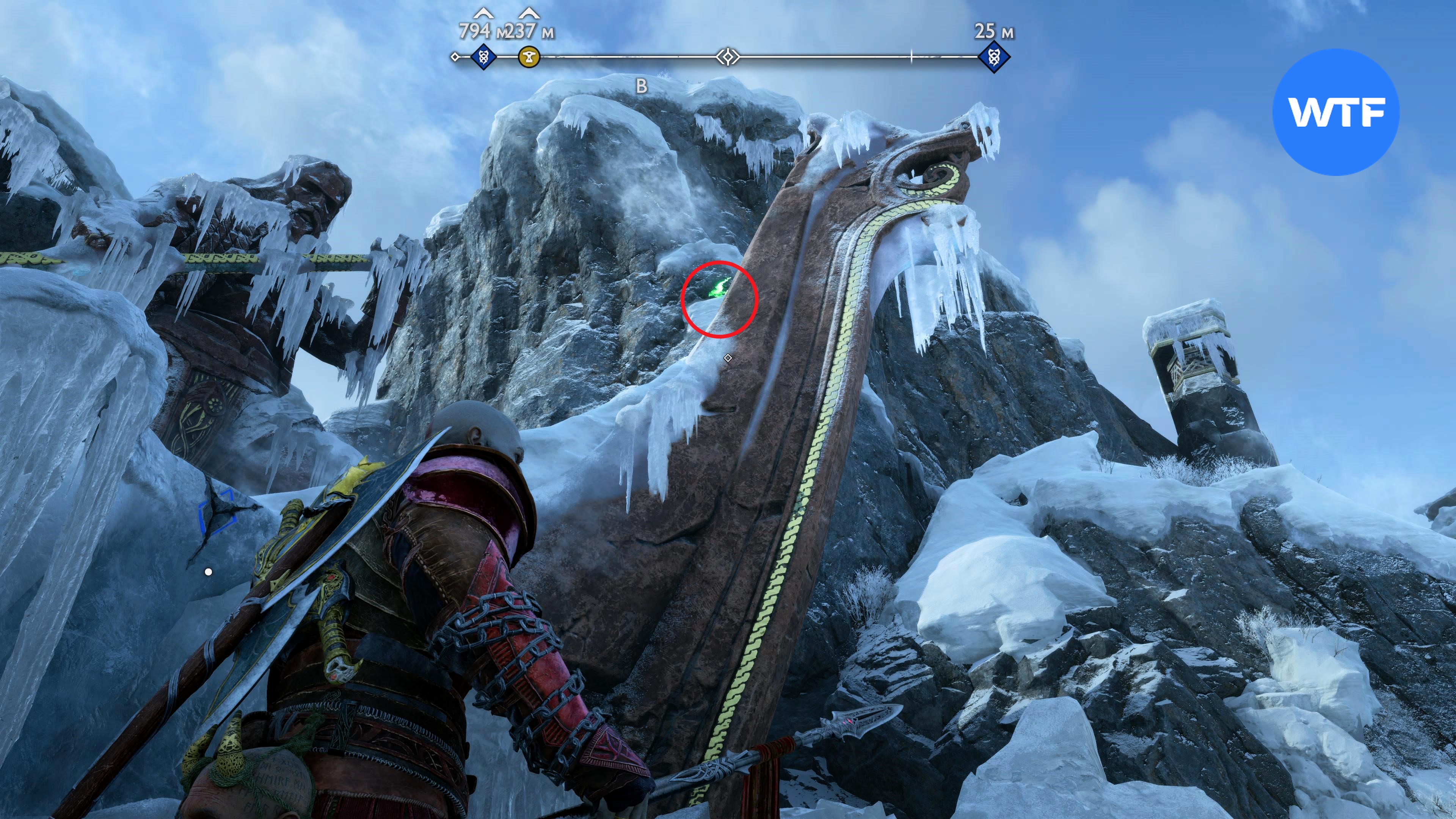 Прежде чем отплыть, освободите от лоз цепь, свисающую со скалы слева от сундука норн, и заберитесь по ней наверх. Там вы сможете использовать резец, чтобы открыть путь через реку.