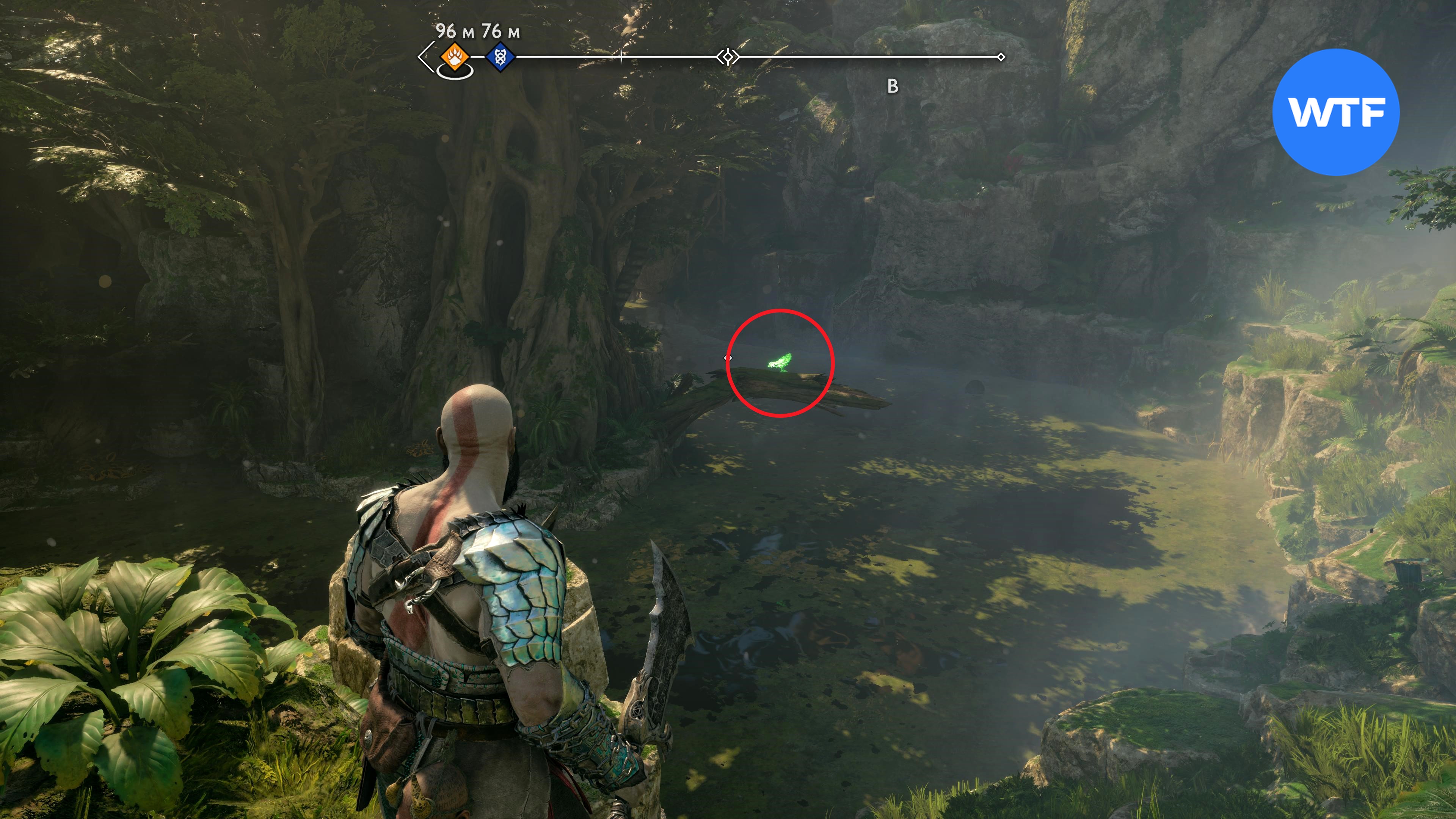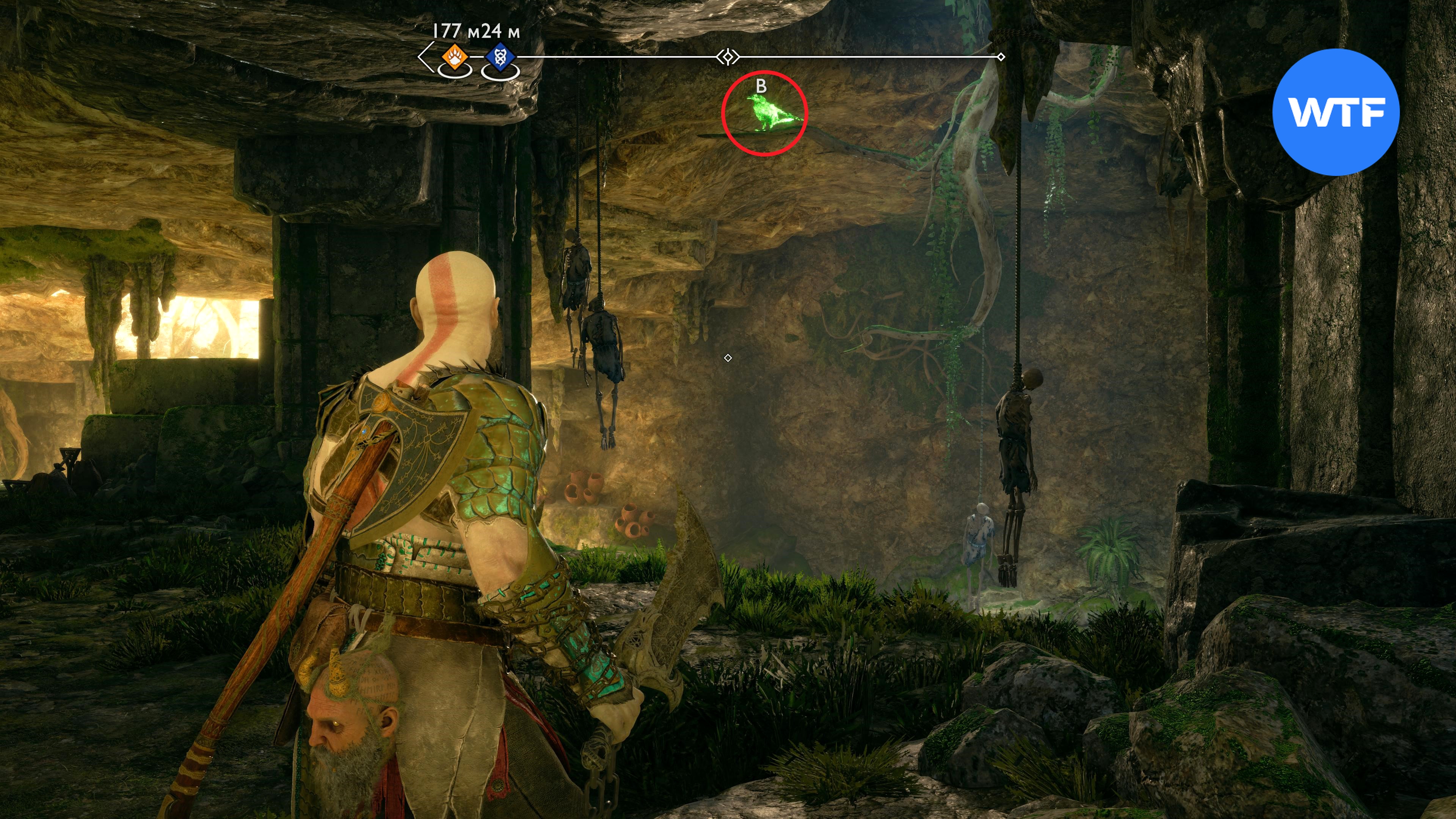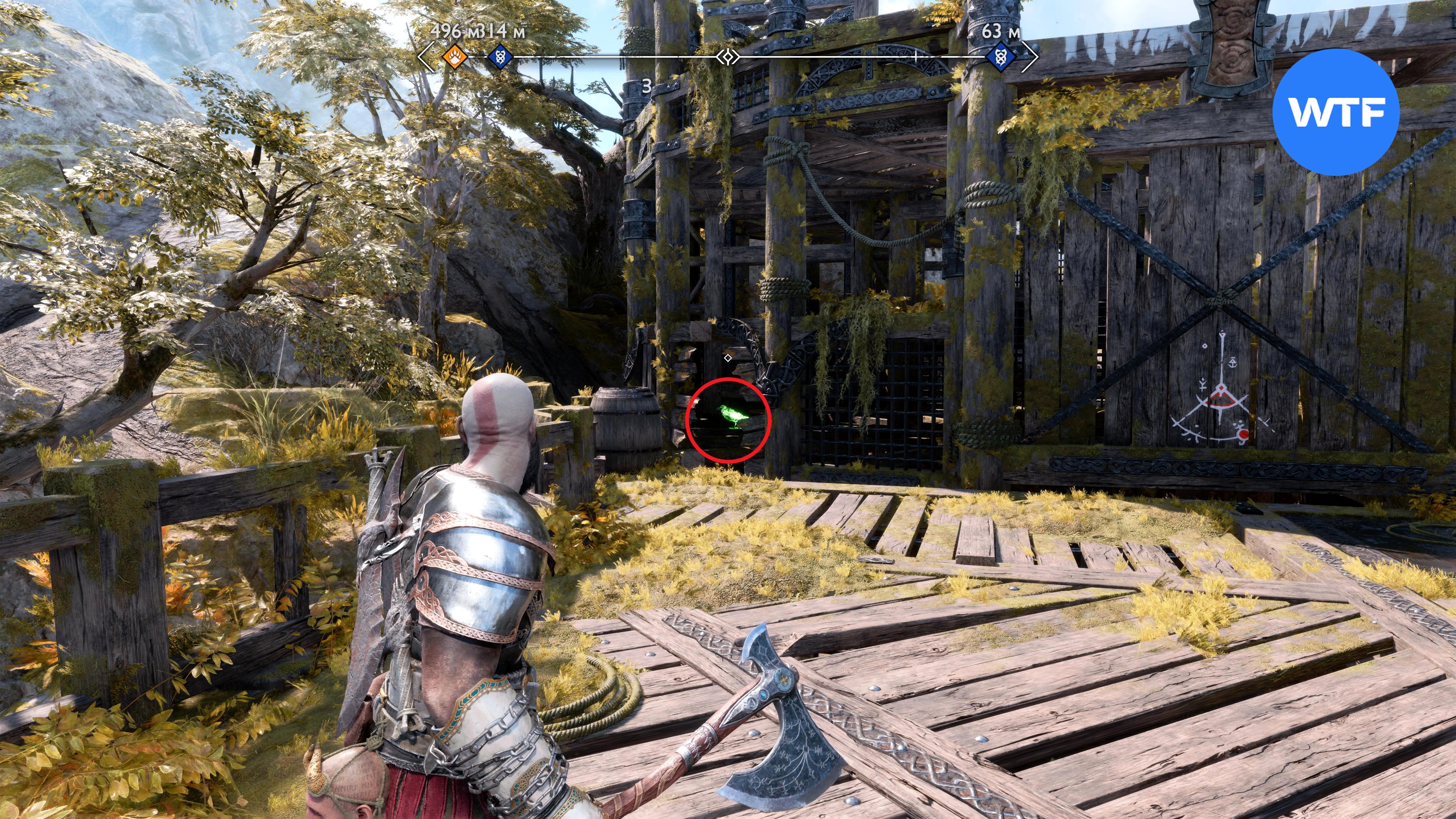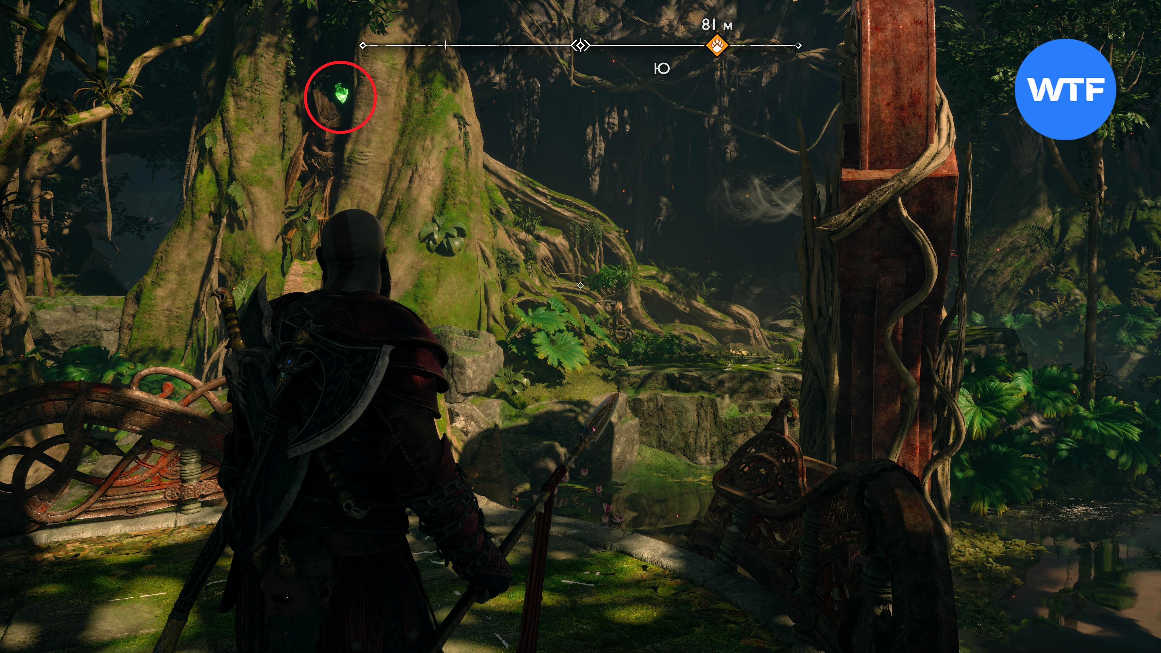 Снова раскачав подвес, вы подпалите жаровню на камнях с лозами, ведущими к мосту. Останется только выстрелить в пламя и разбить печати на мосту топором. После этого подойдите к легендарному сундуку и посмотрите налево, чтобы увидеть ворона на камне.