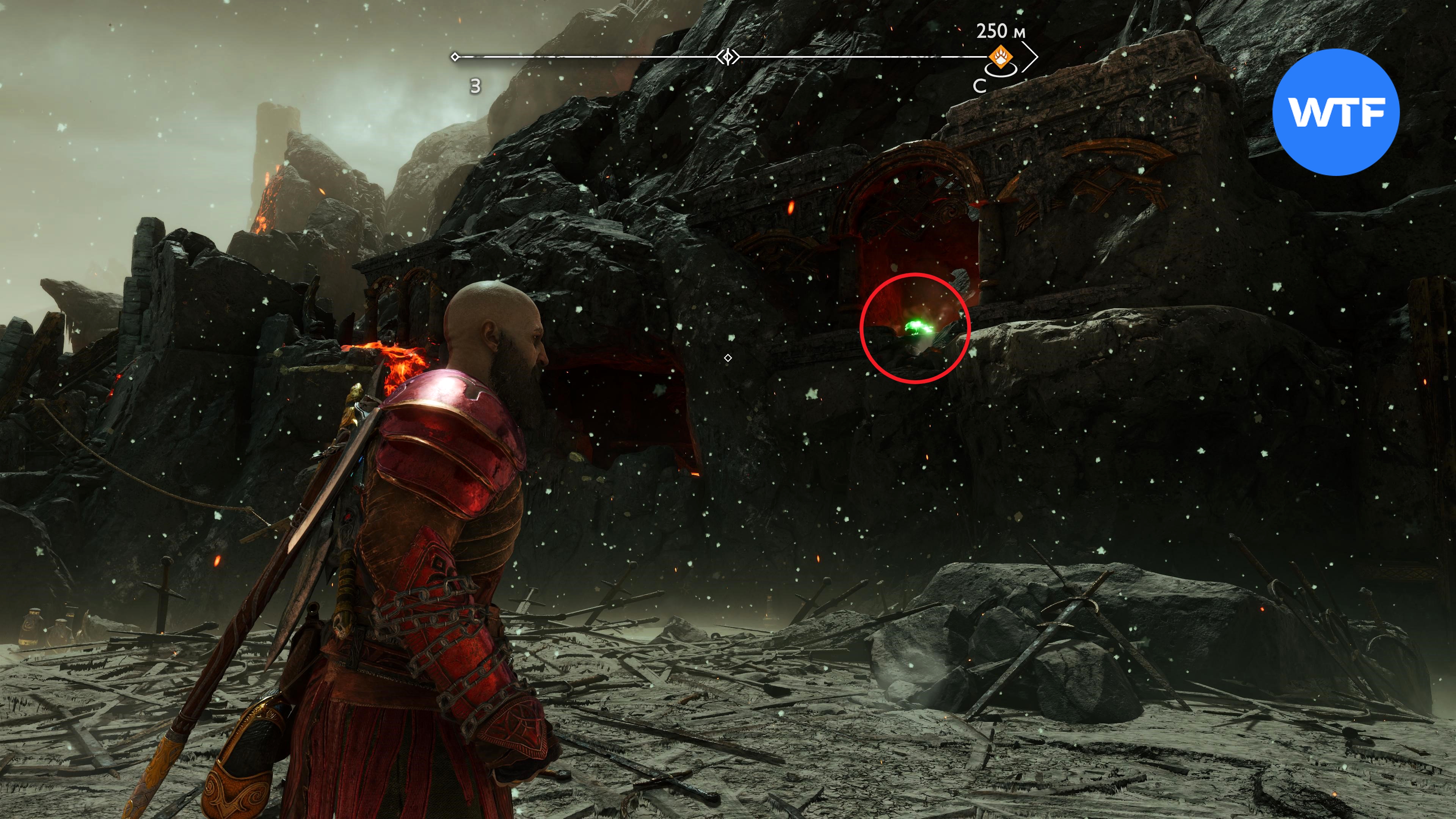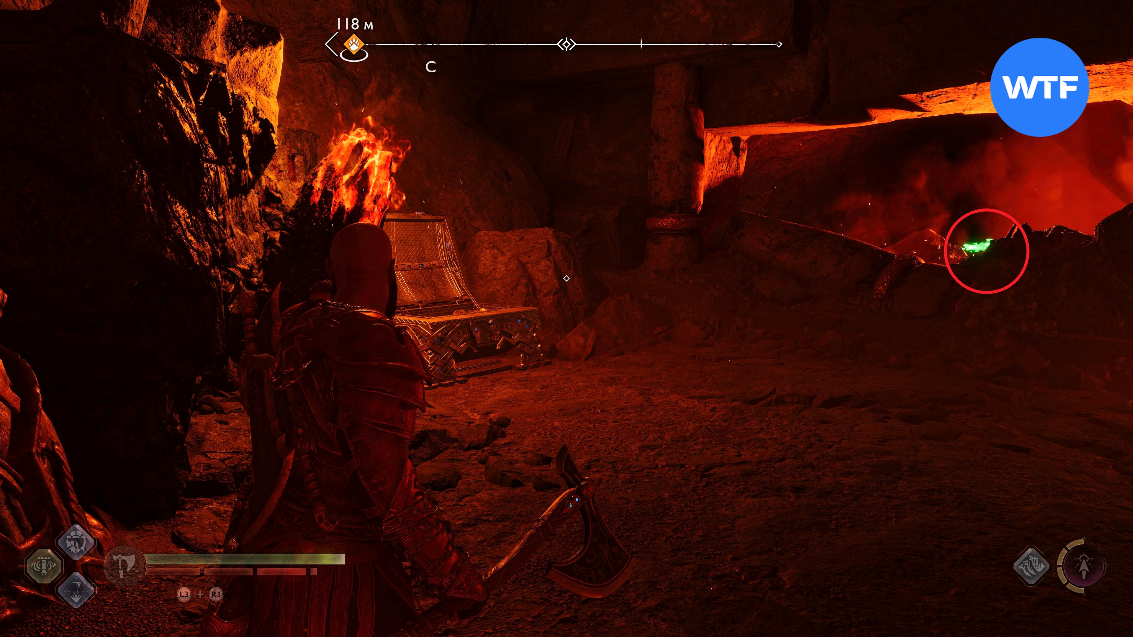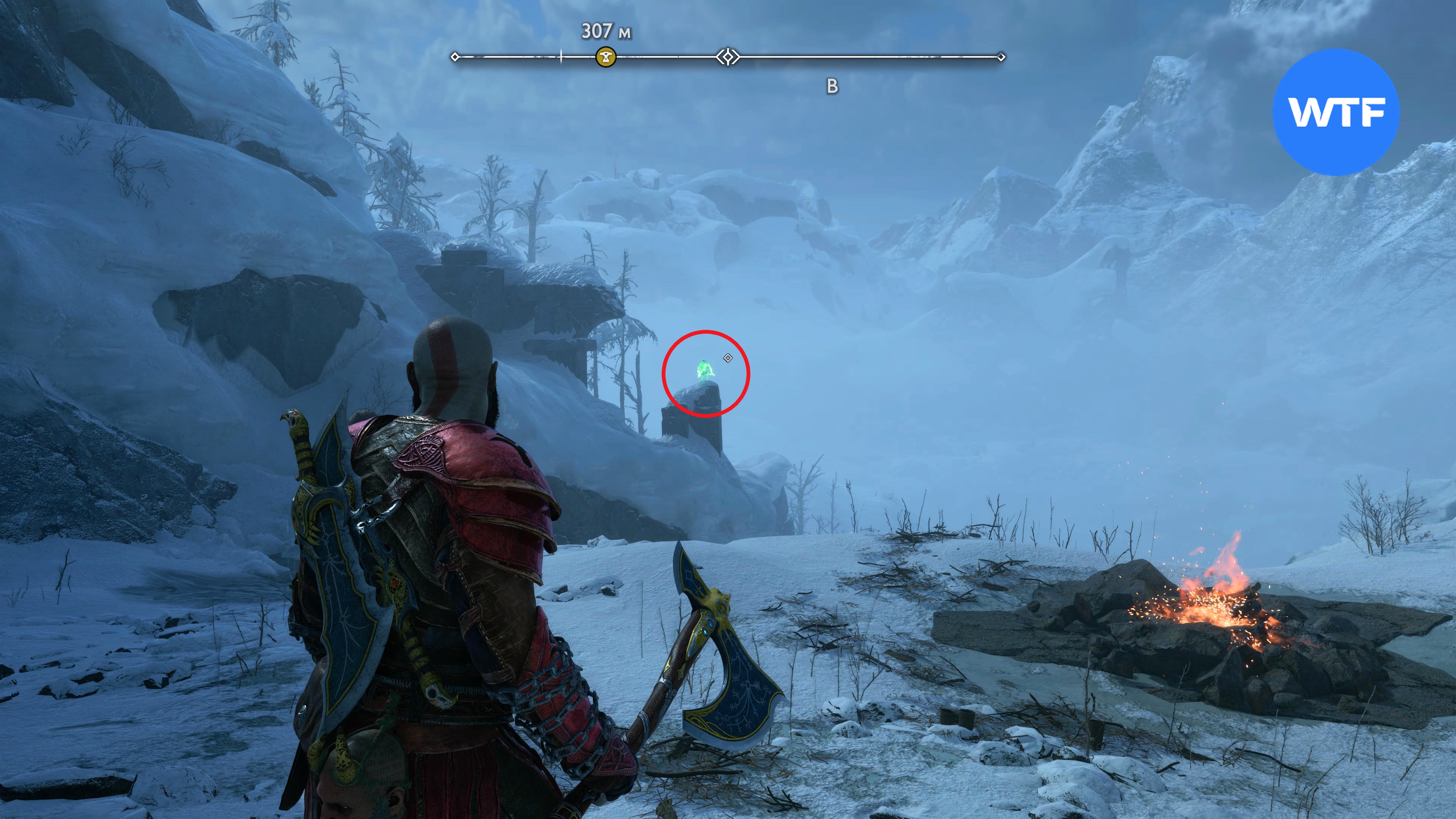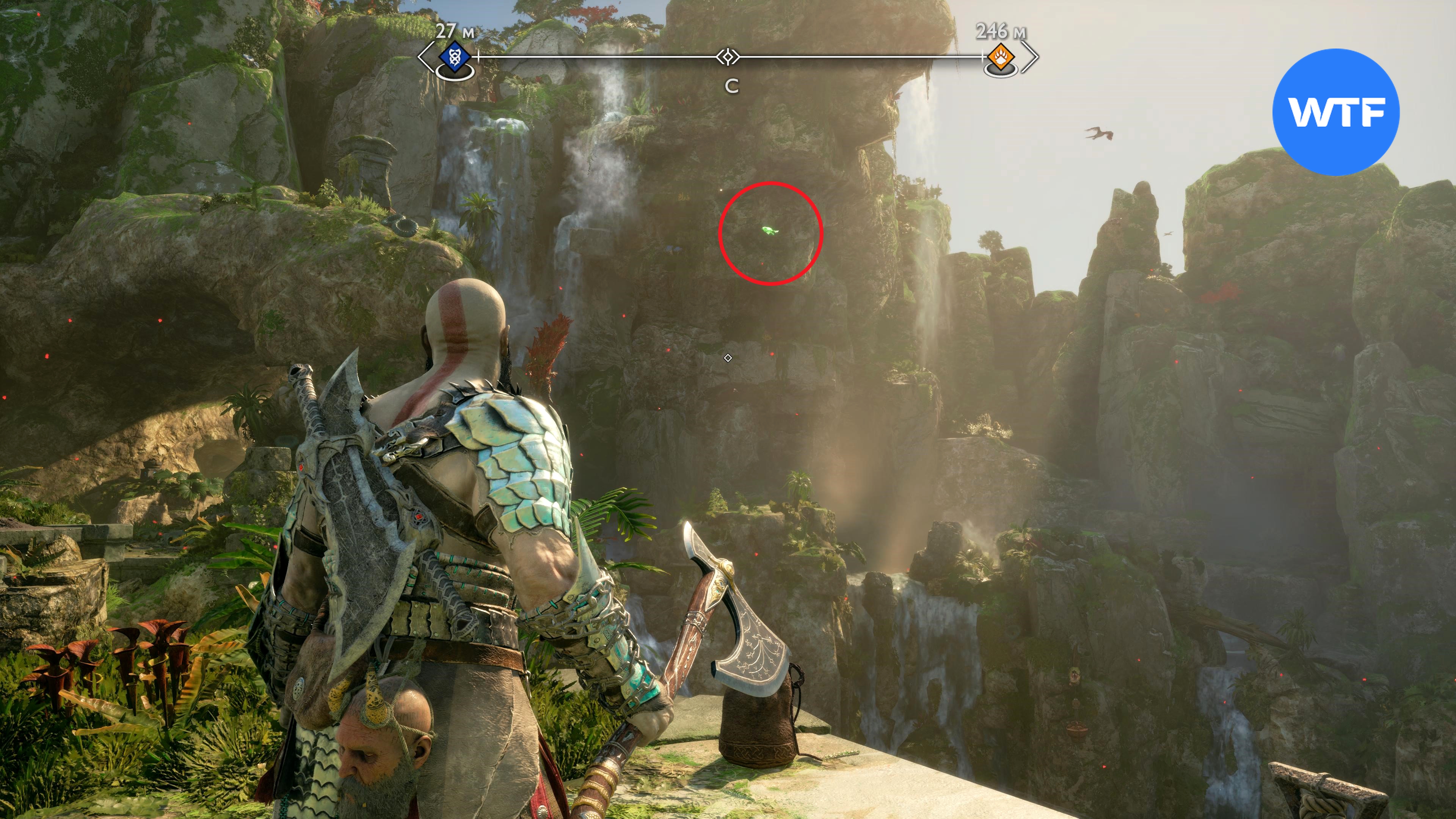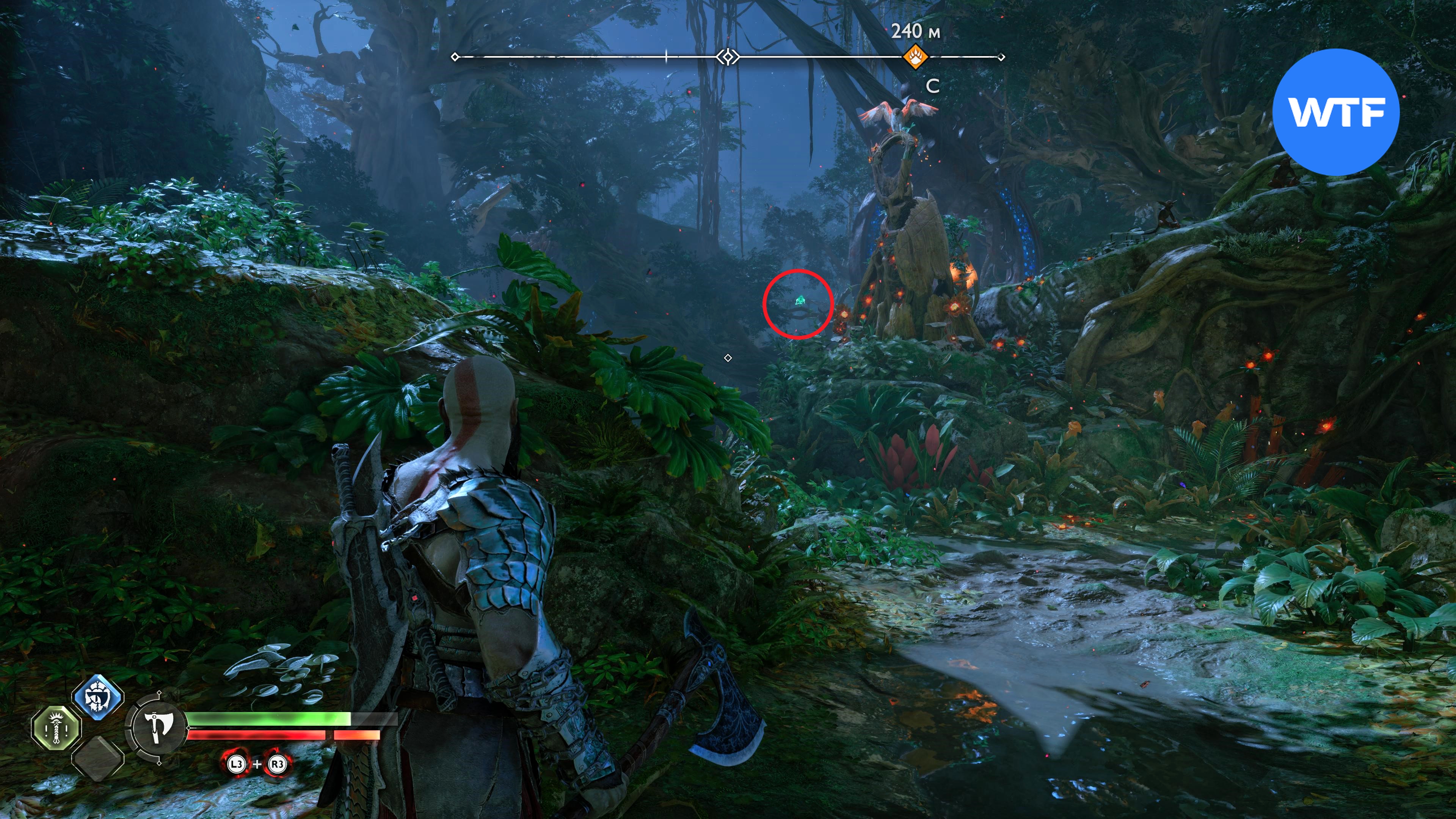Снова раскачав подвес, вы подпалите жаровню на камнях с лозами, ведущими к мосту. Останется только выстрелить в пламя и разбить печати на мосту топором. После этого подойдите к легендарному сундуку и посмотрите налево, чтобы увидеть ворона на камне.