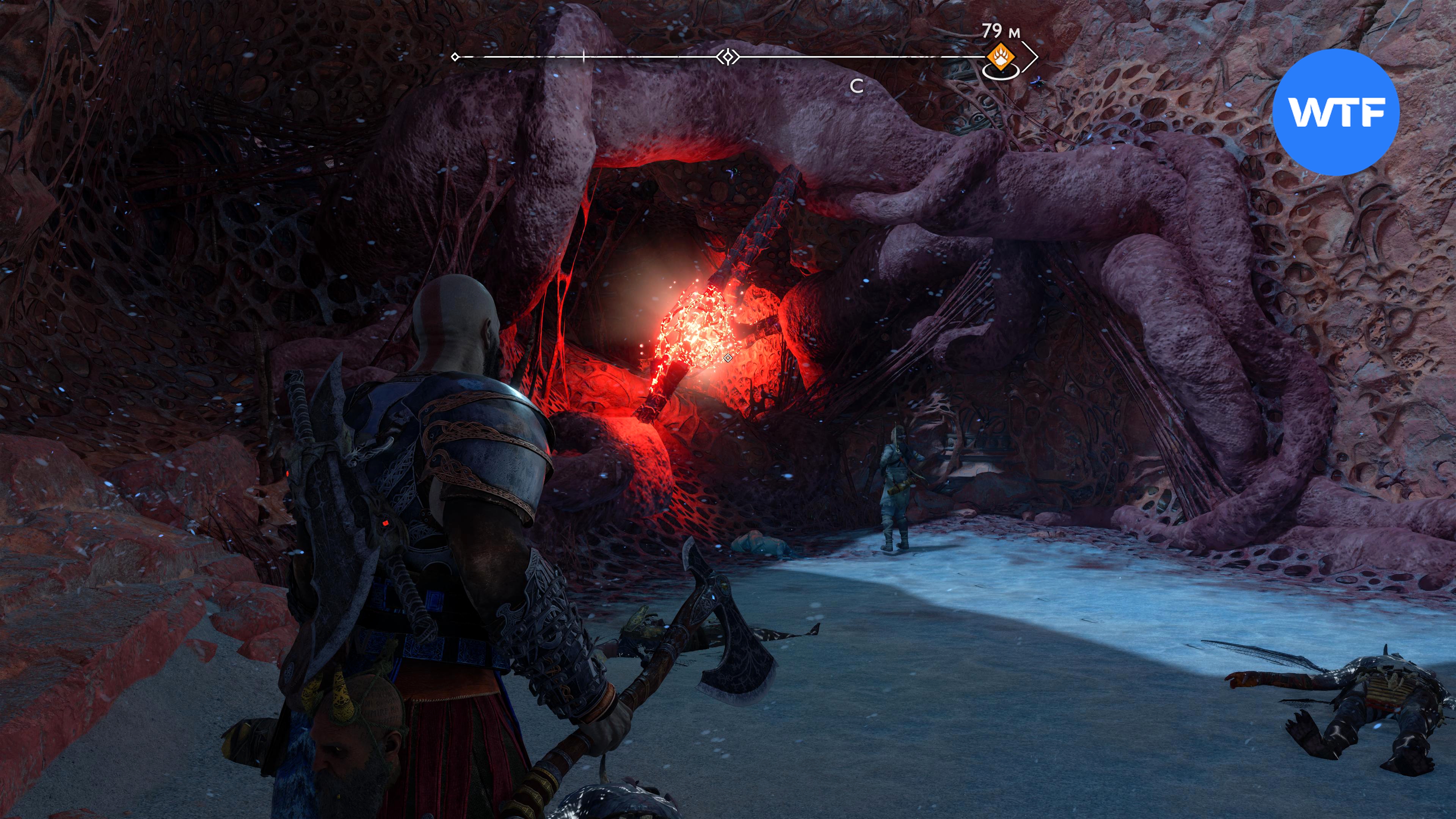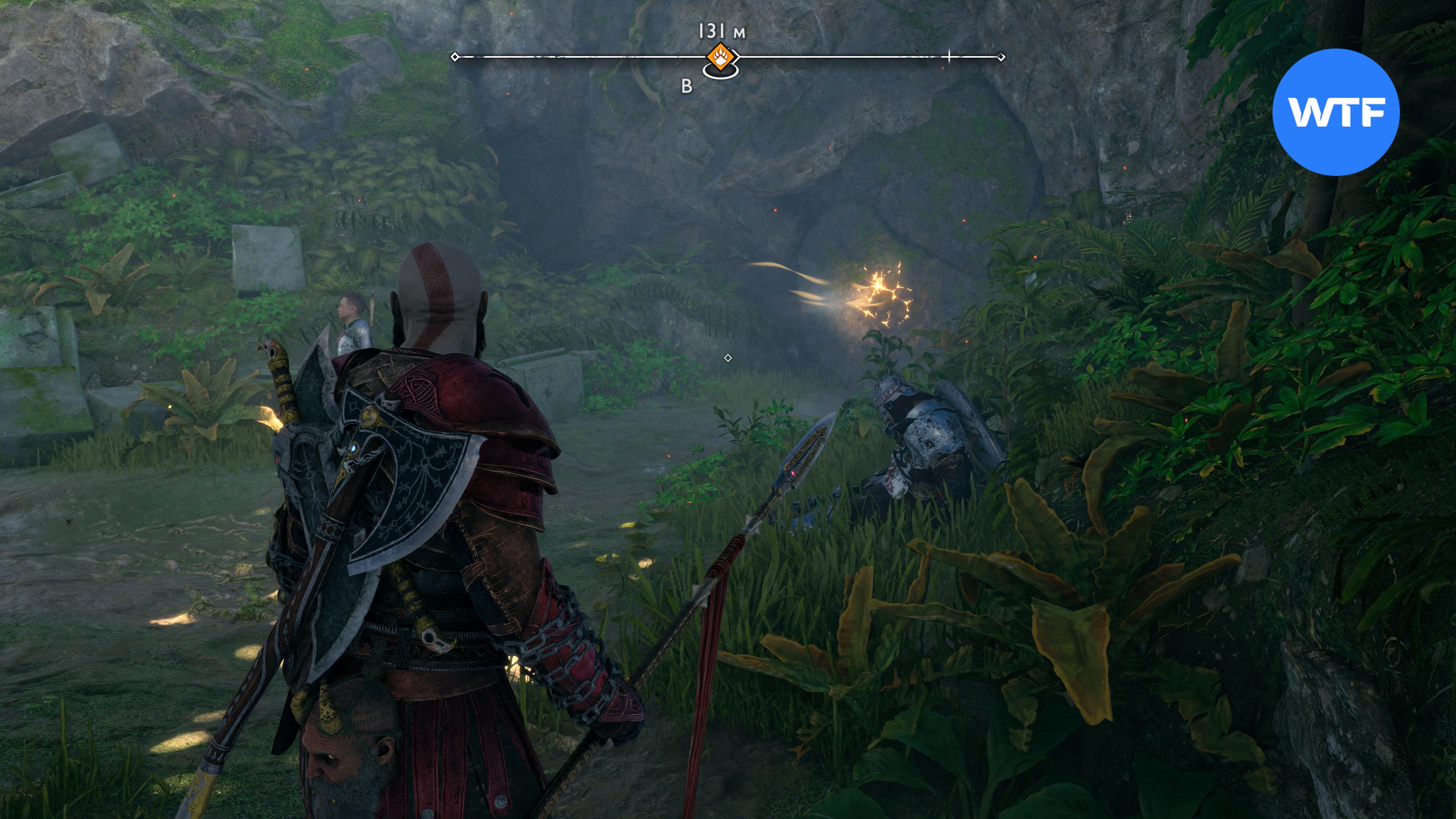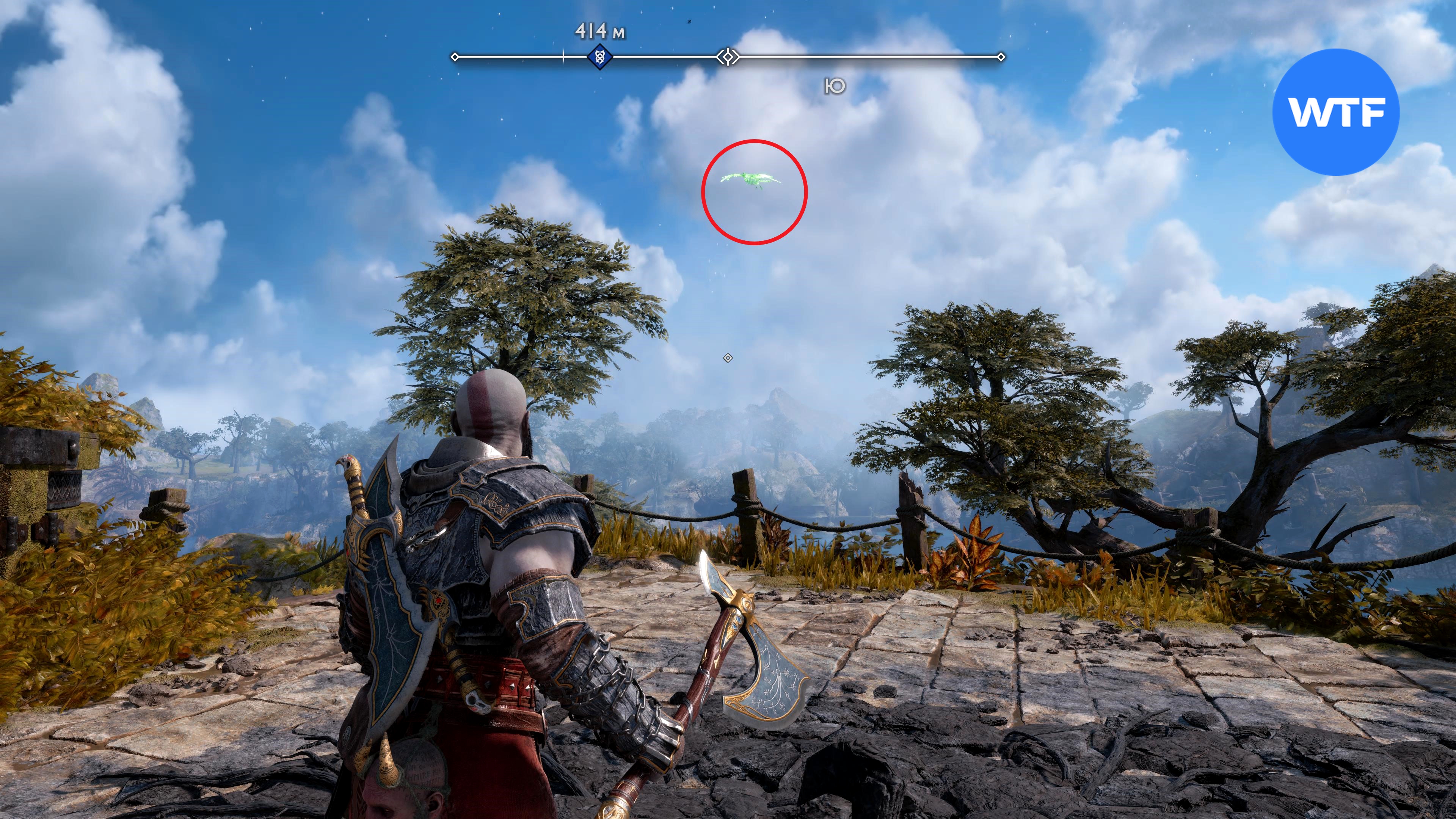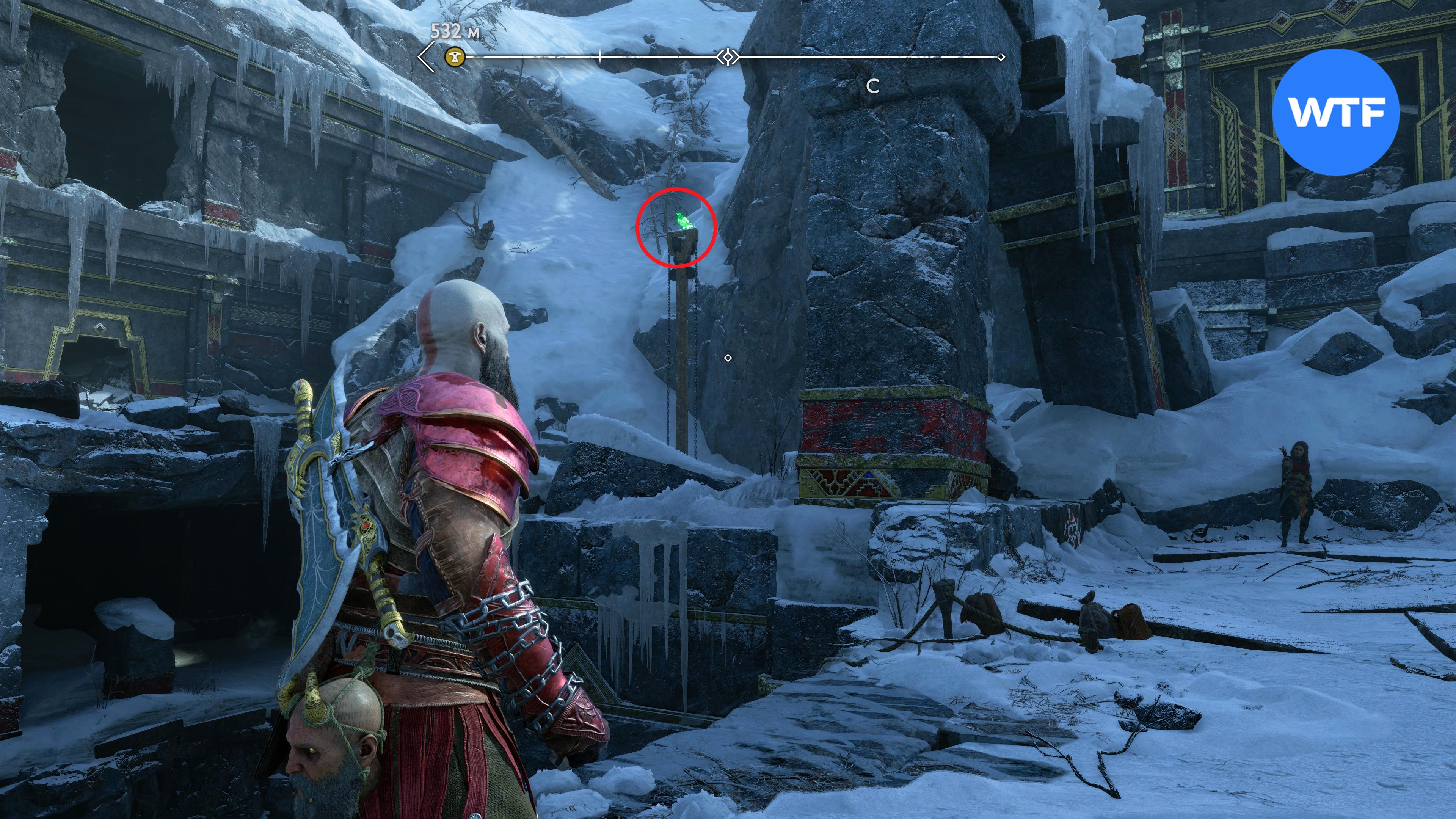 Снова раскачав подвес, вы подпалите жаровню на камнях с лозами, ведущими к мосту. Останется только выстрелить в пламя и разбить печати на мосту топором. После этого подойдите к легендарному сундуку и посмотрите налево, чтобы увидеть ворона на камне.