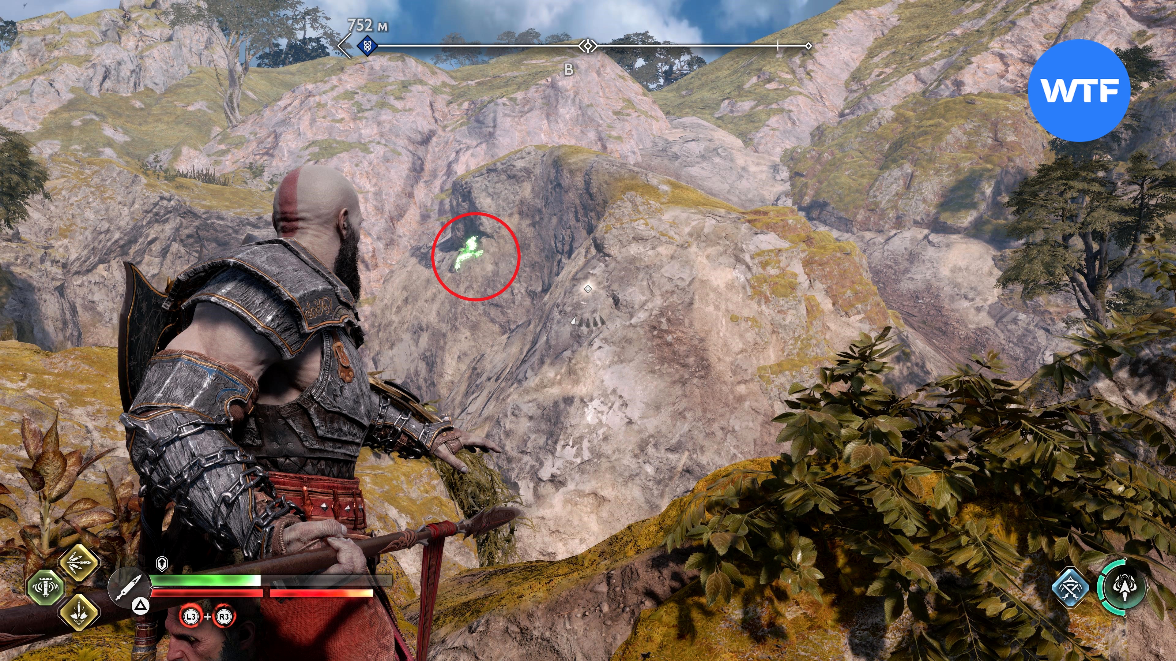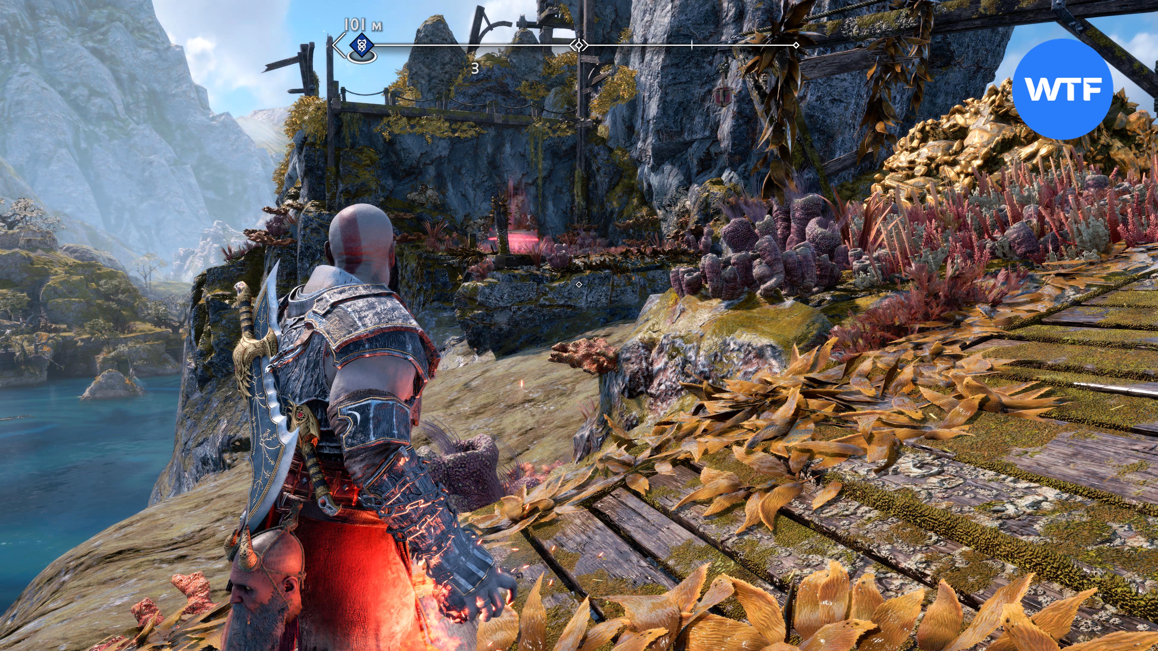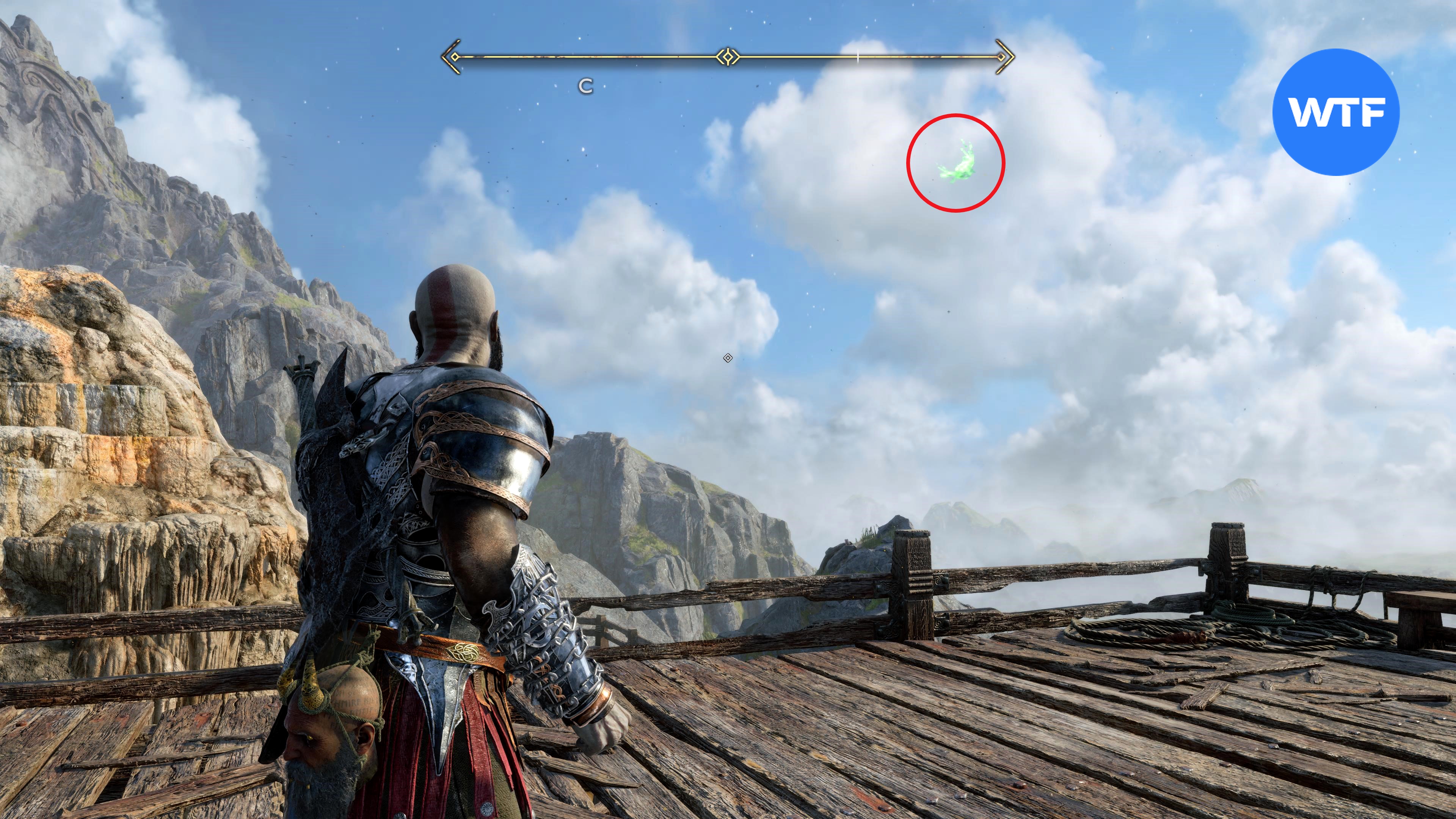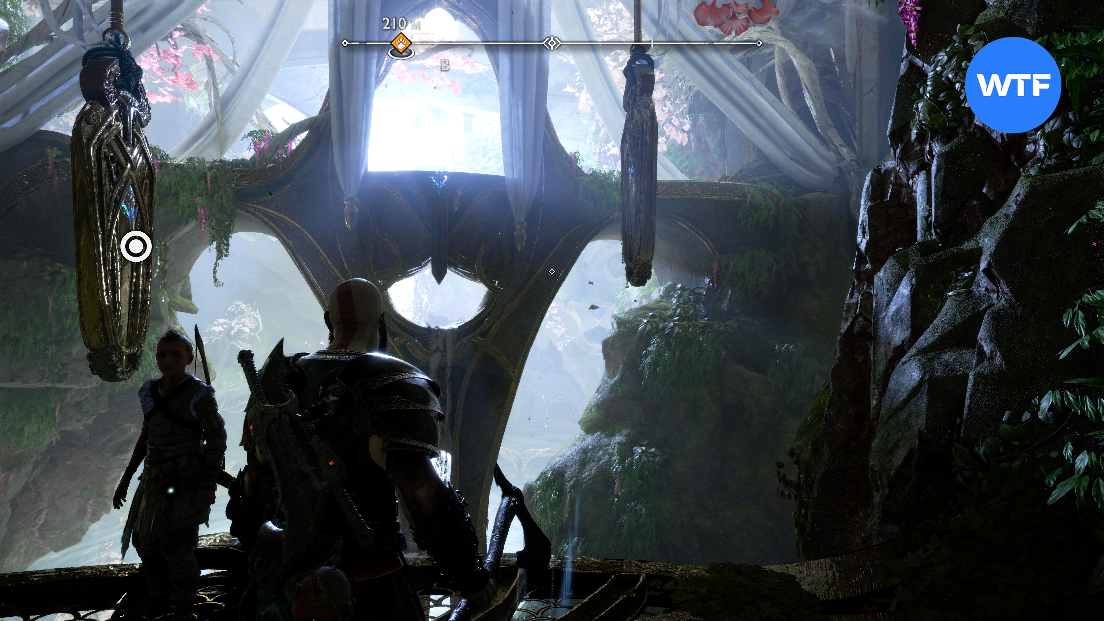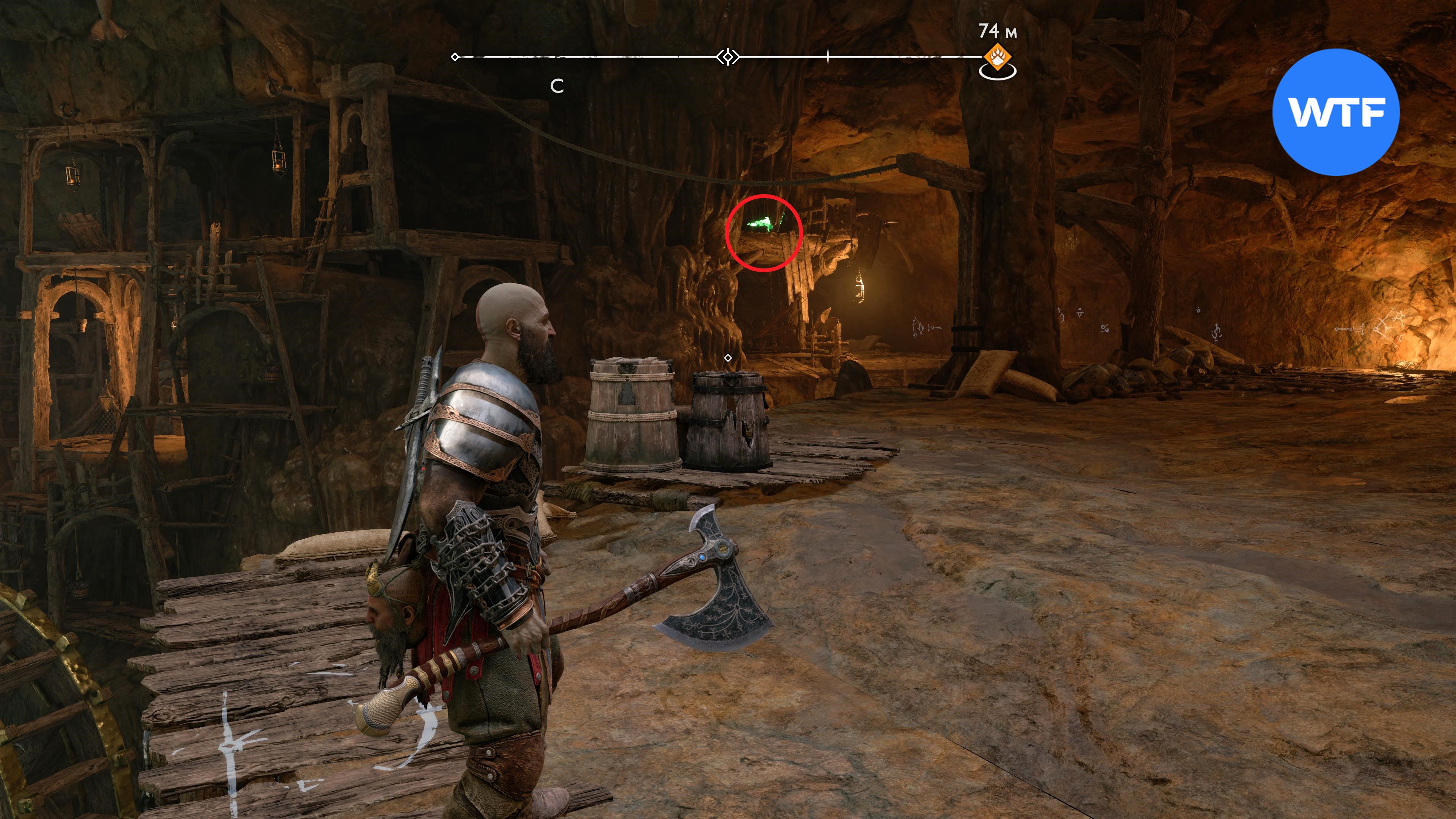 Снова раскачав подвес, вы подпалите жаровню на камнях с лозами, ведущими к мосту. Останется только выстрелить в пламя и разбить печати на мосту топором. После этого подойдите к легендарному сундуку и посмотрите налево, чтобы увидеть ворона на камне.