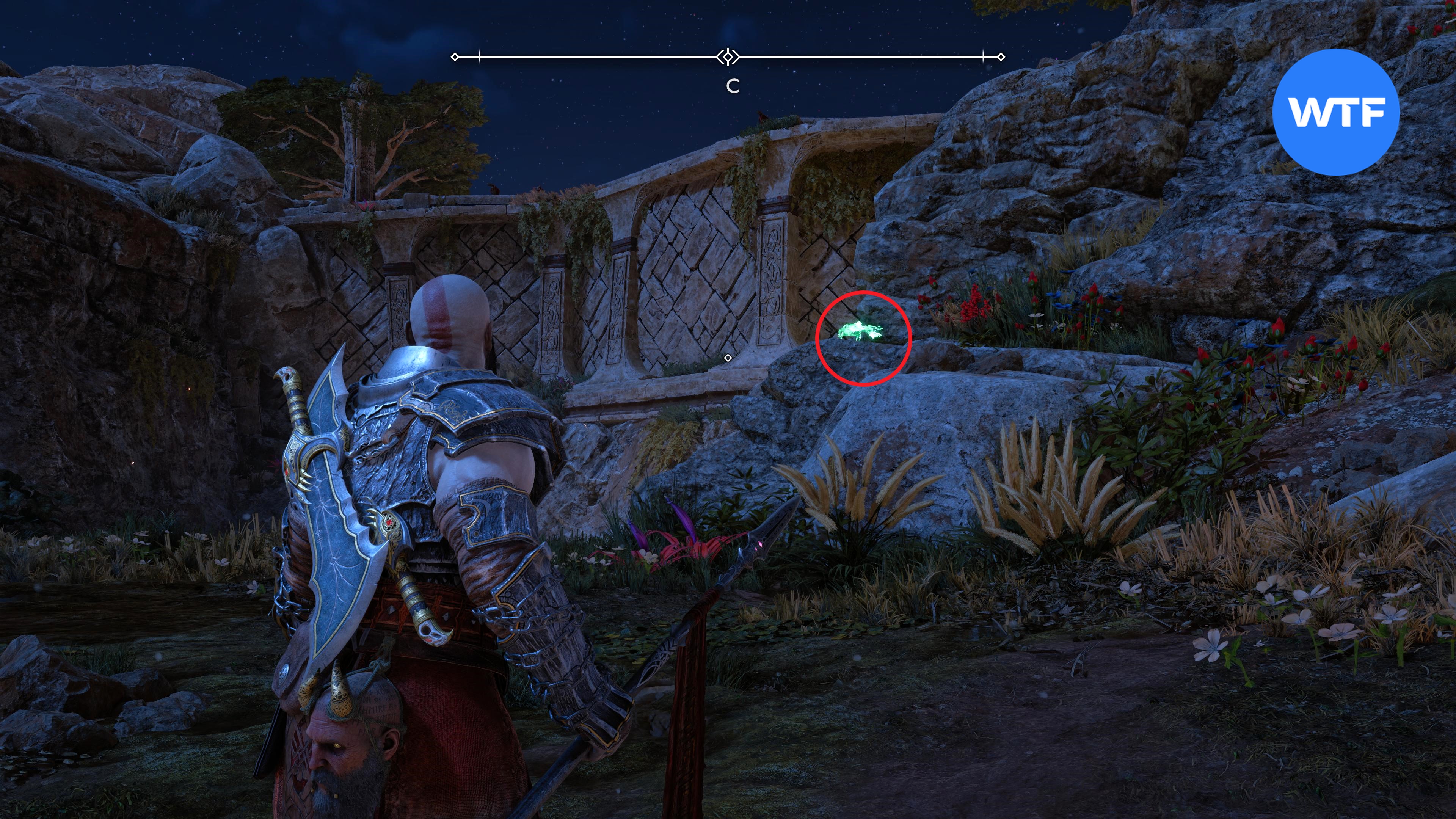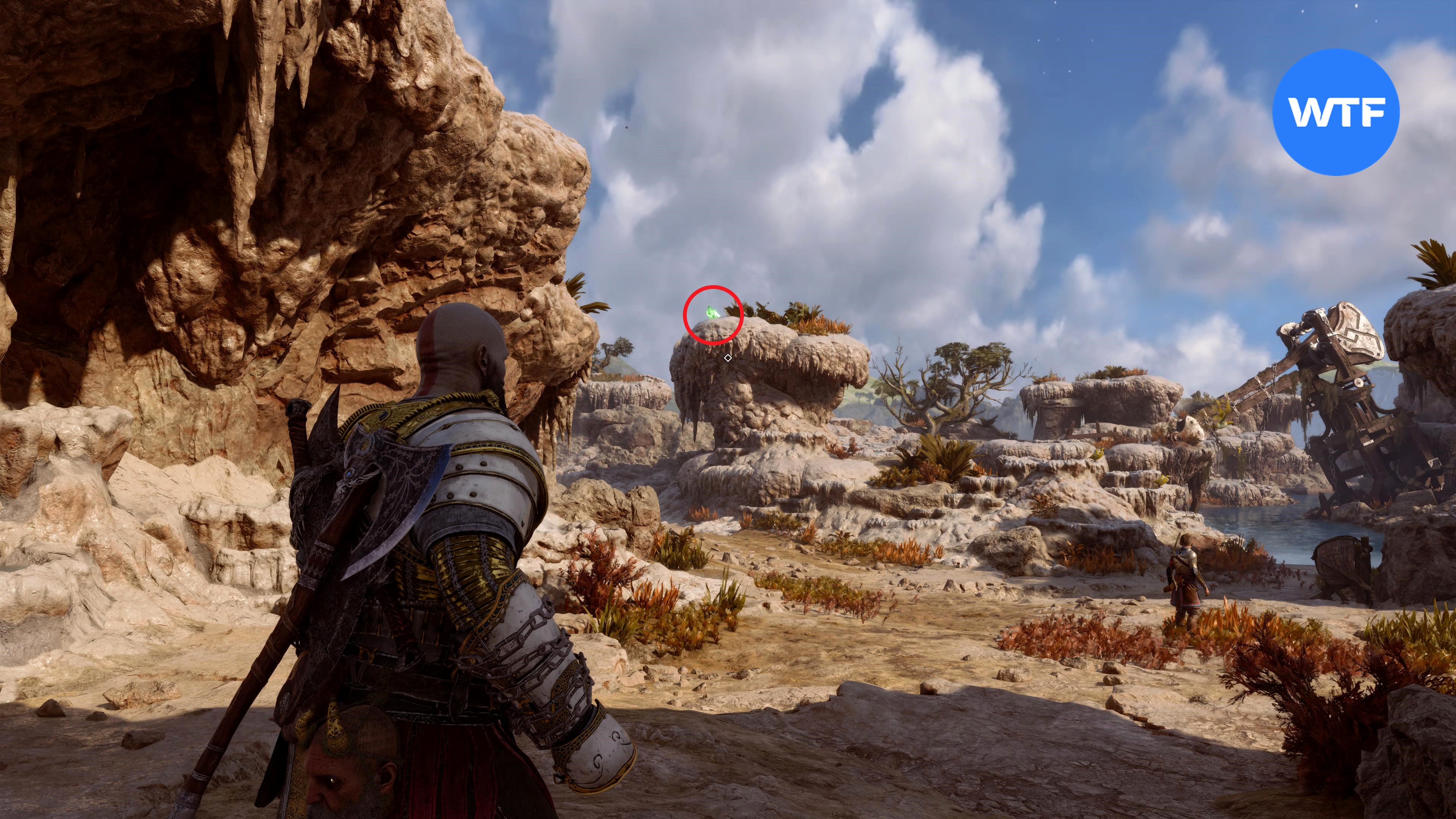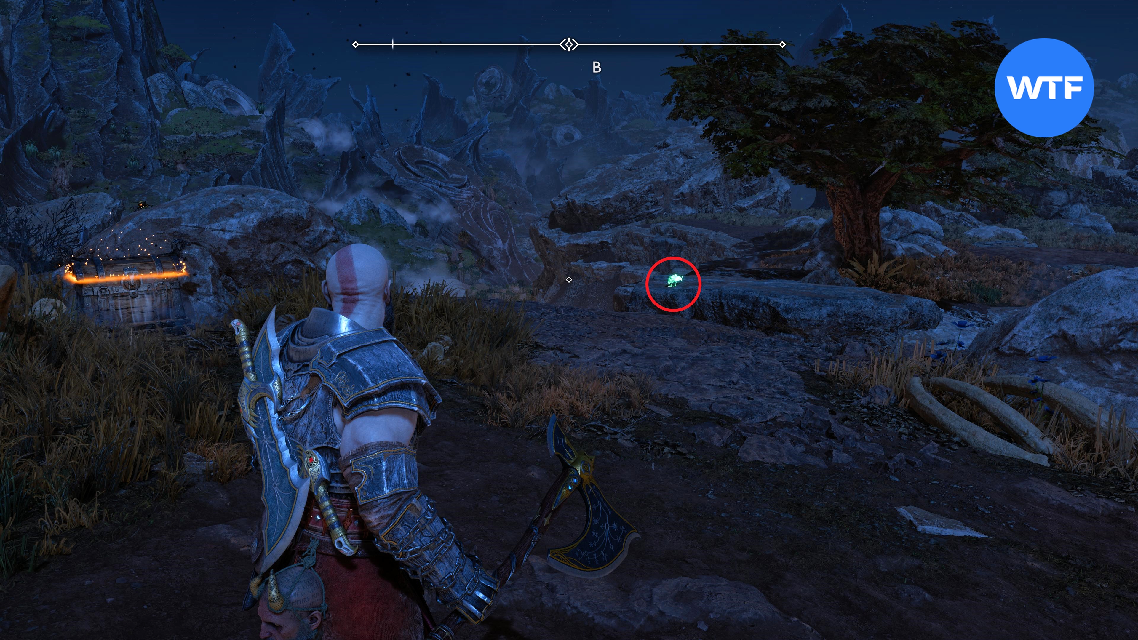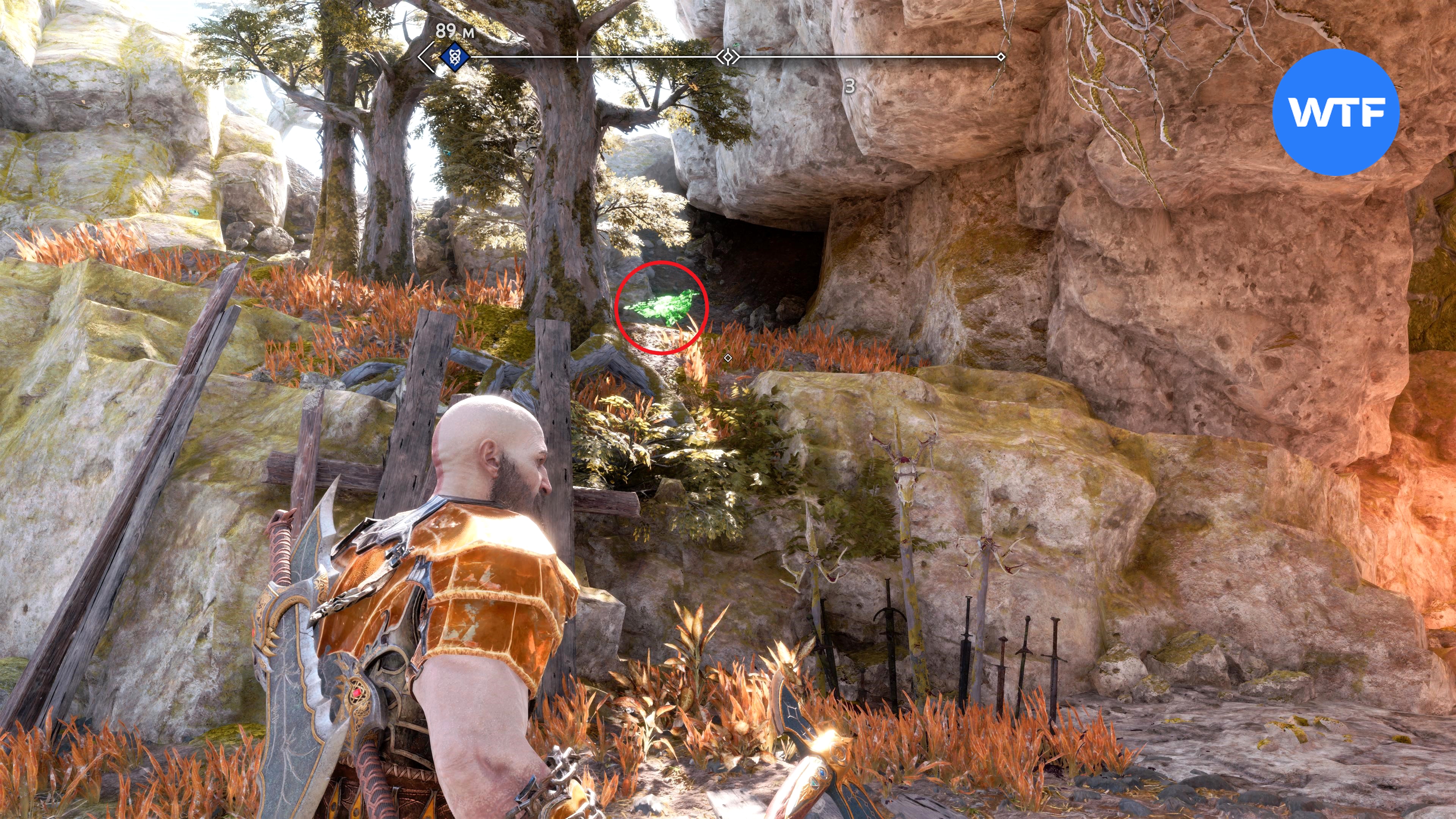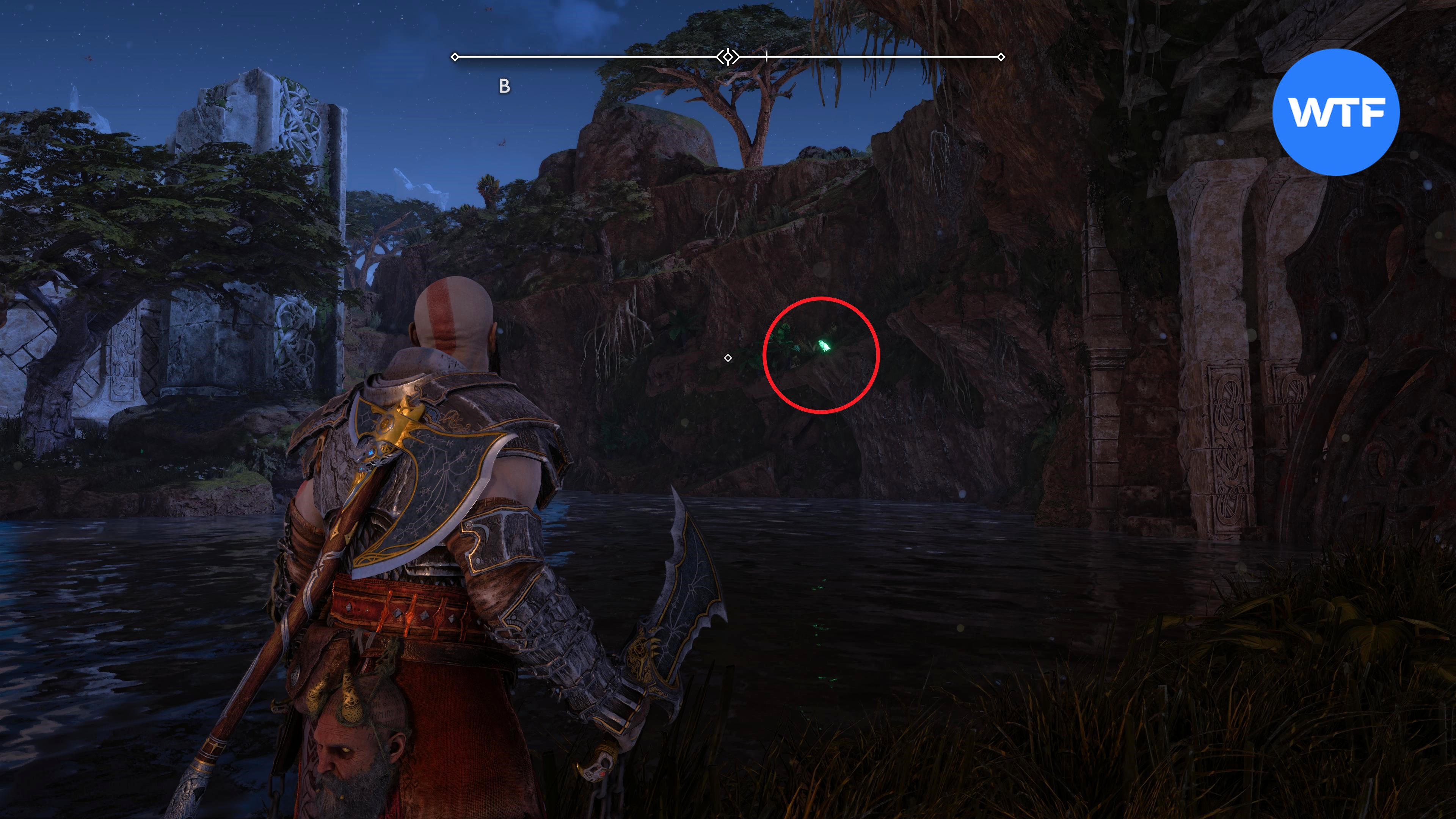 К северо-востоку от храма Тюра есть деревянные обломки, через которые вы можете перелезть для доступа к локации Берега Девяти. После этого пролезьте под большим камнем и идите к обломкам статуи перед вами.