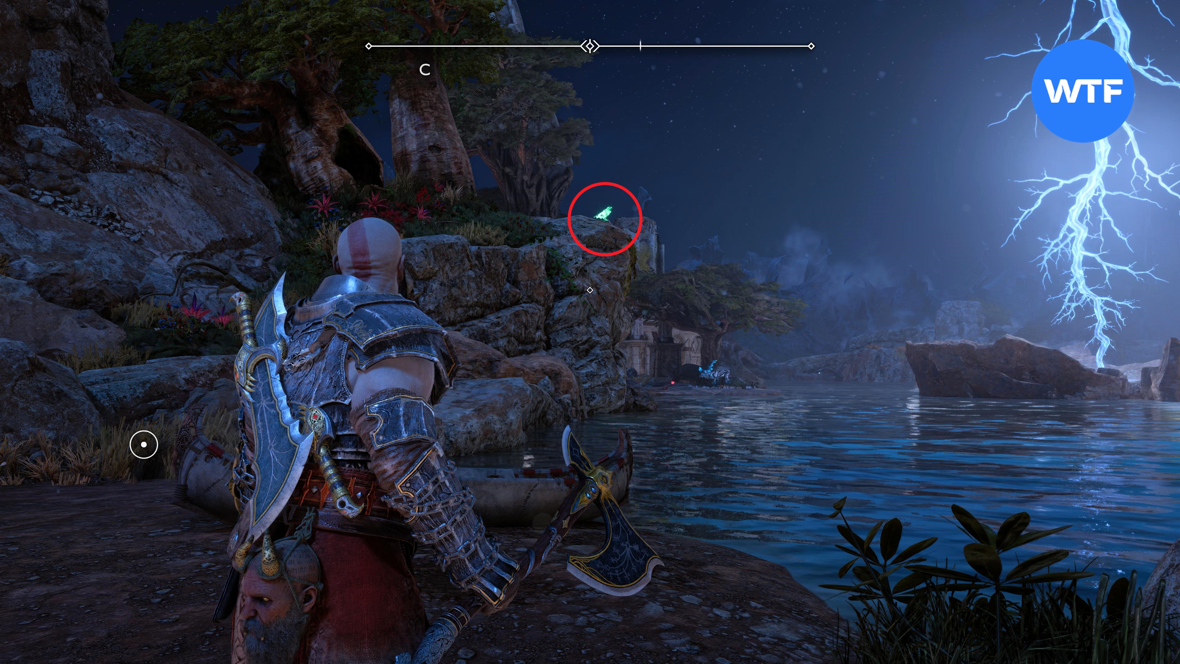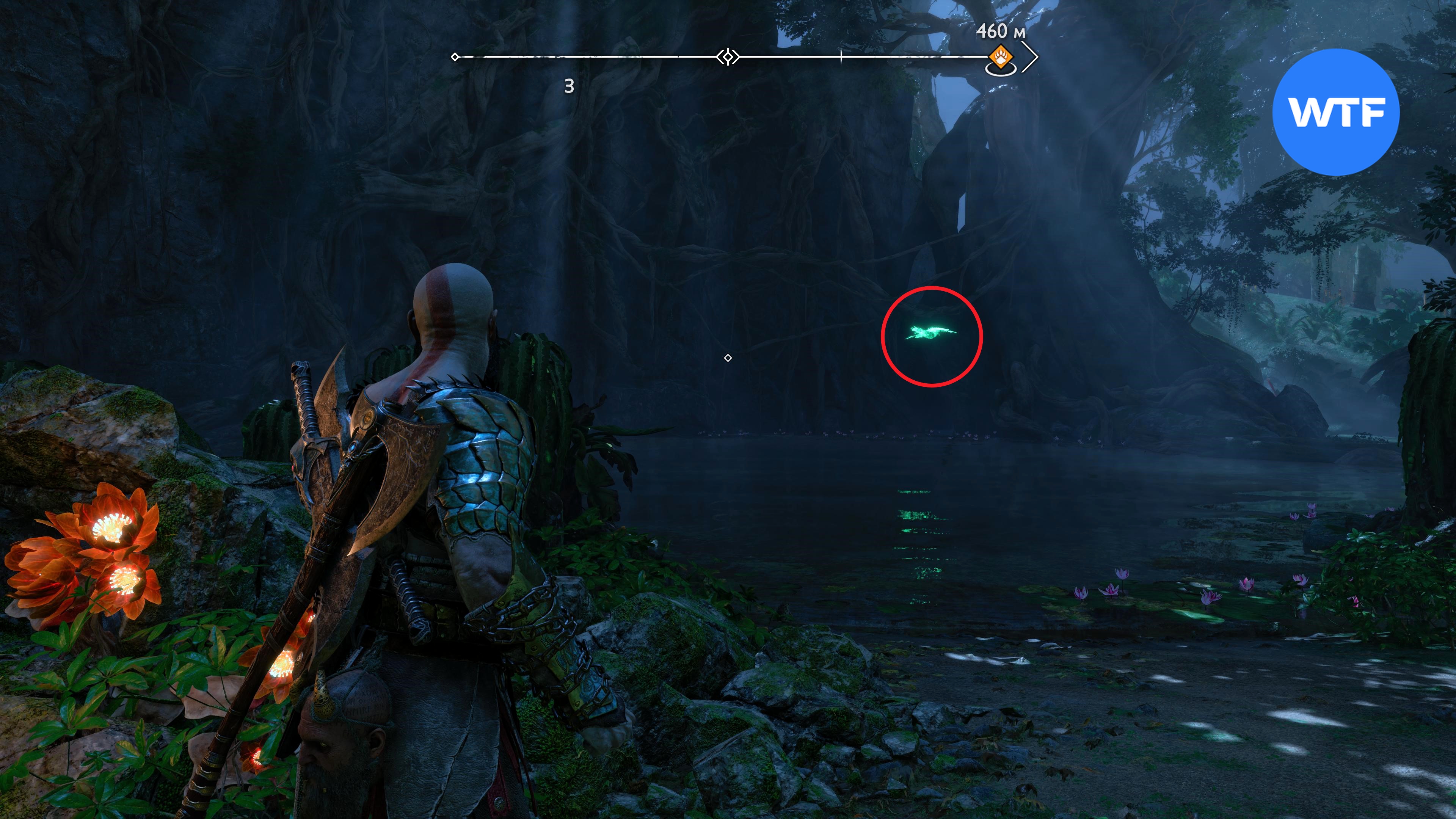 После того как вы потянете за цепь и откроете вторые ворота вокруг площадки с мистическими вратами, вы сможете проплыть по реке в следующую область. Высадитесь на причале, где есть еще одни ворота с цепью. Оттуда можно достать этого ворона.