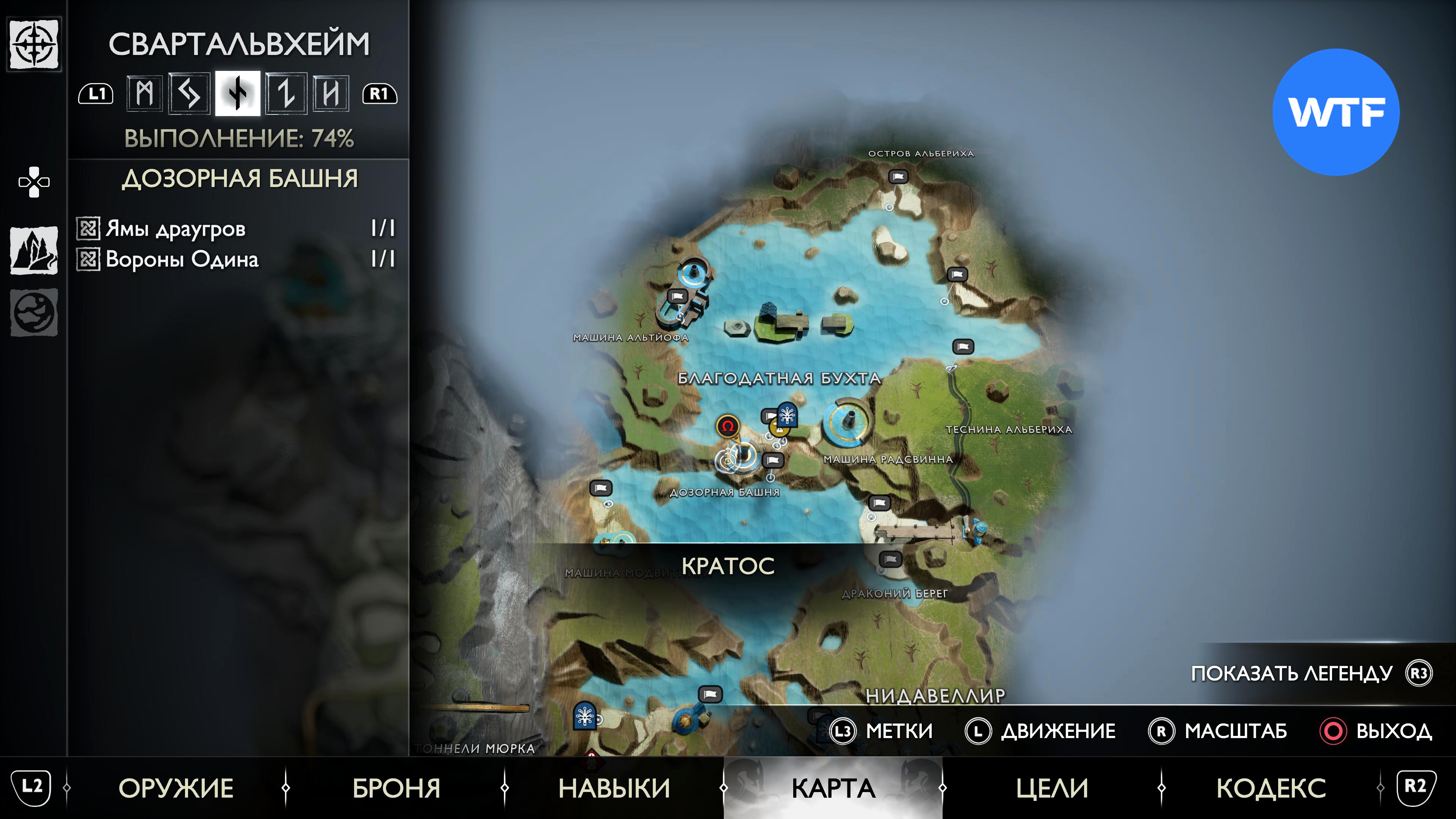 Чтобы добраться этого до ворона, высадитесь на Берег паломника. В этой локации вам нужно опустить два подъемных моста. С первым все просто — выстрелите в факел фиолетовой стрелой, а затем кинь топор в обе печати.