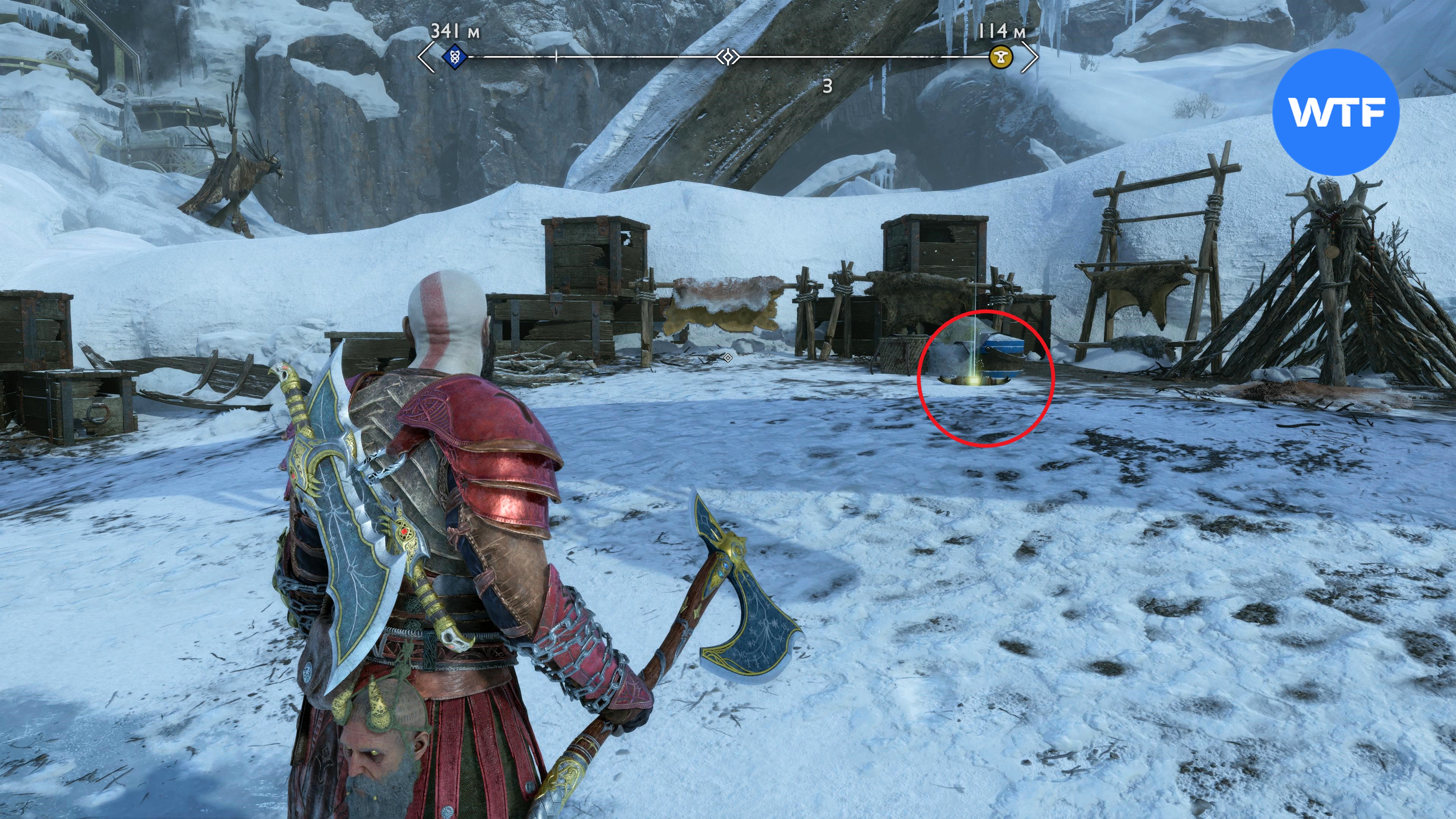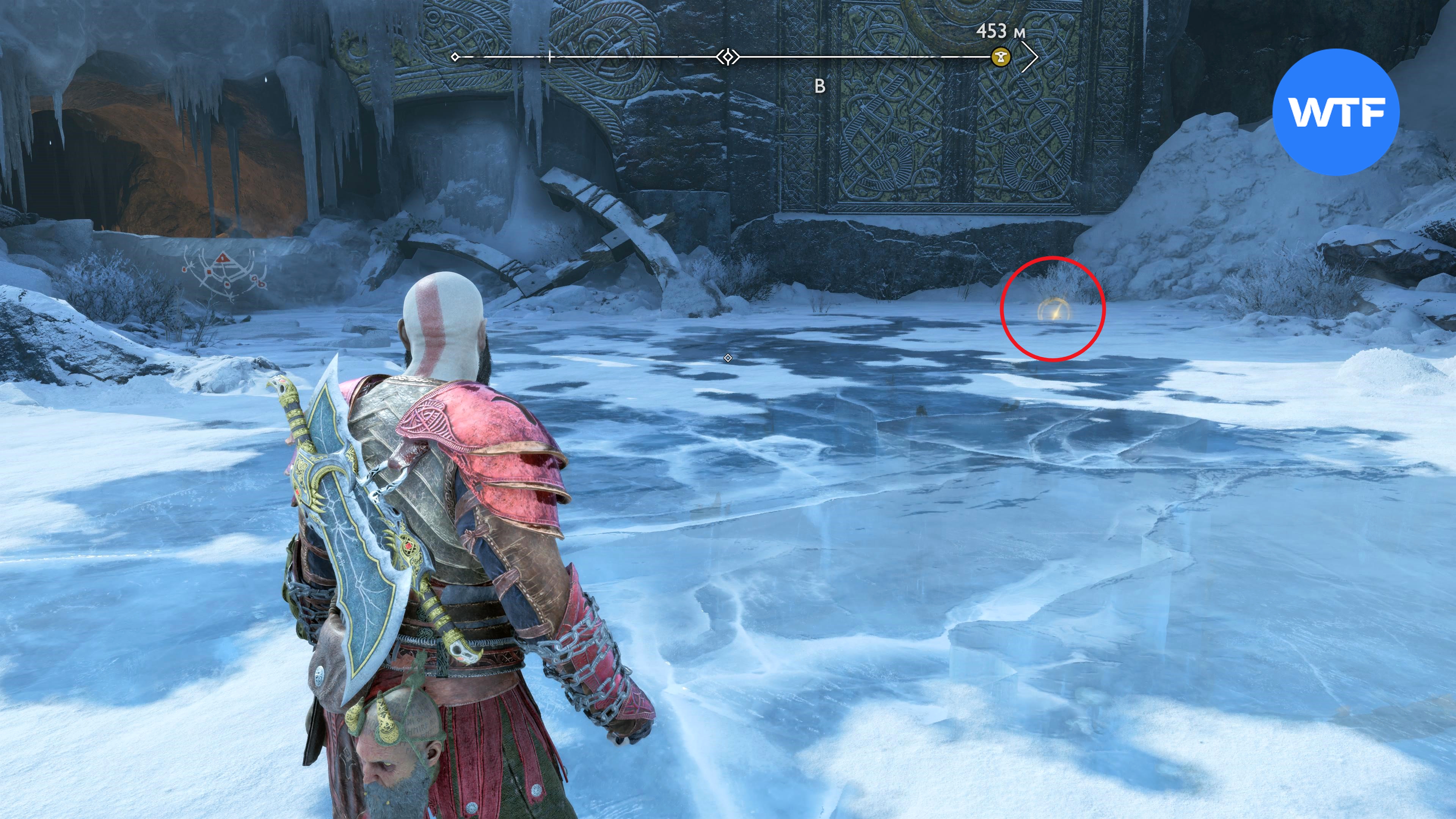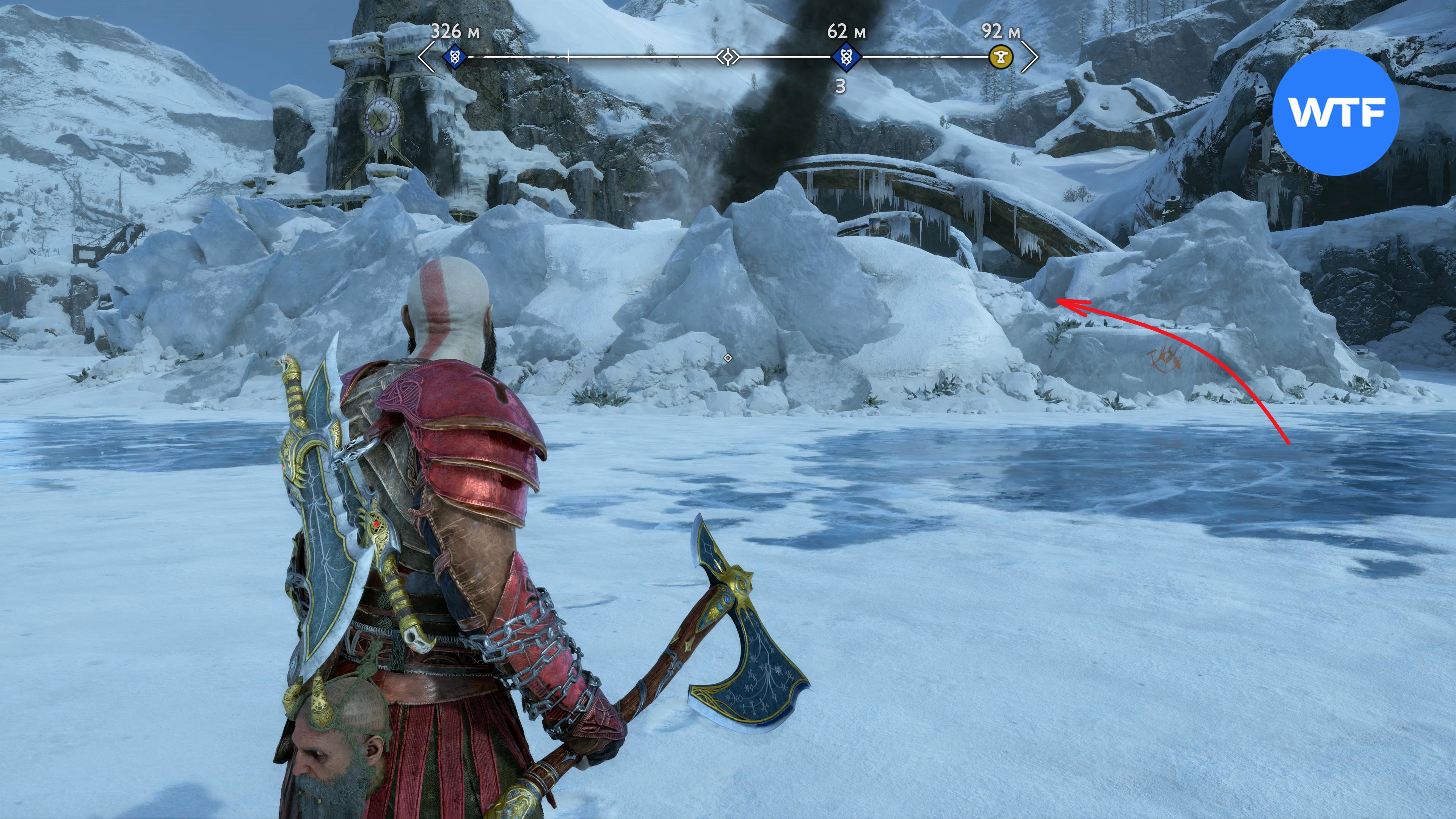 - Где сокровище: в Мидгарде, слева от одной из башен на западе Озера Девяти, есть ледяная скала, которую можно разрушить копьем. За ней открывается проход, который в итоге и приведет вас к дракону с сокровищем.
