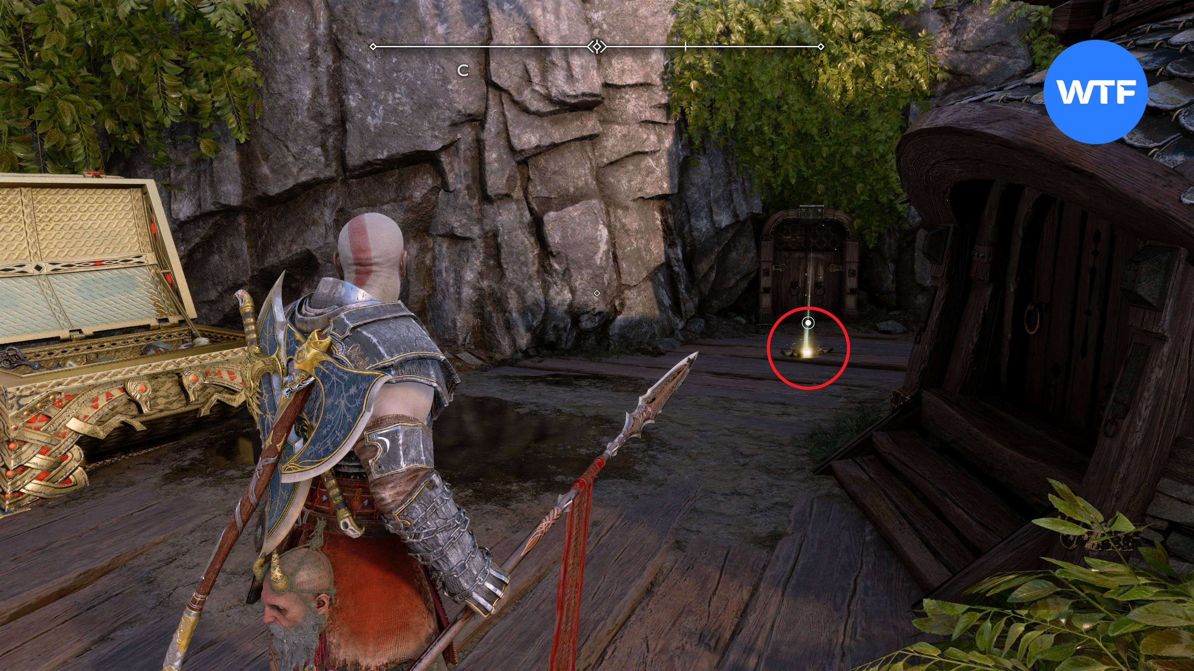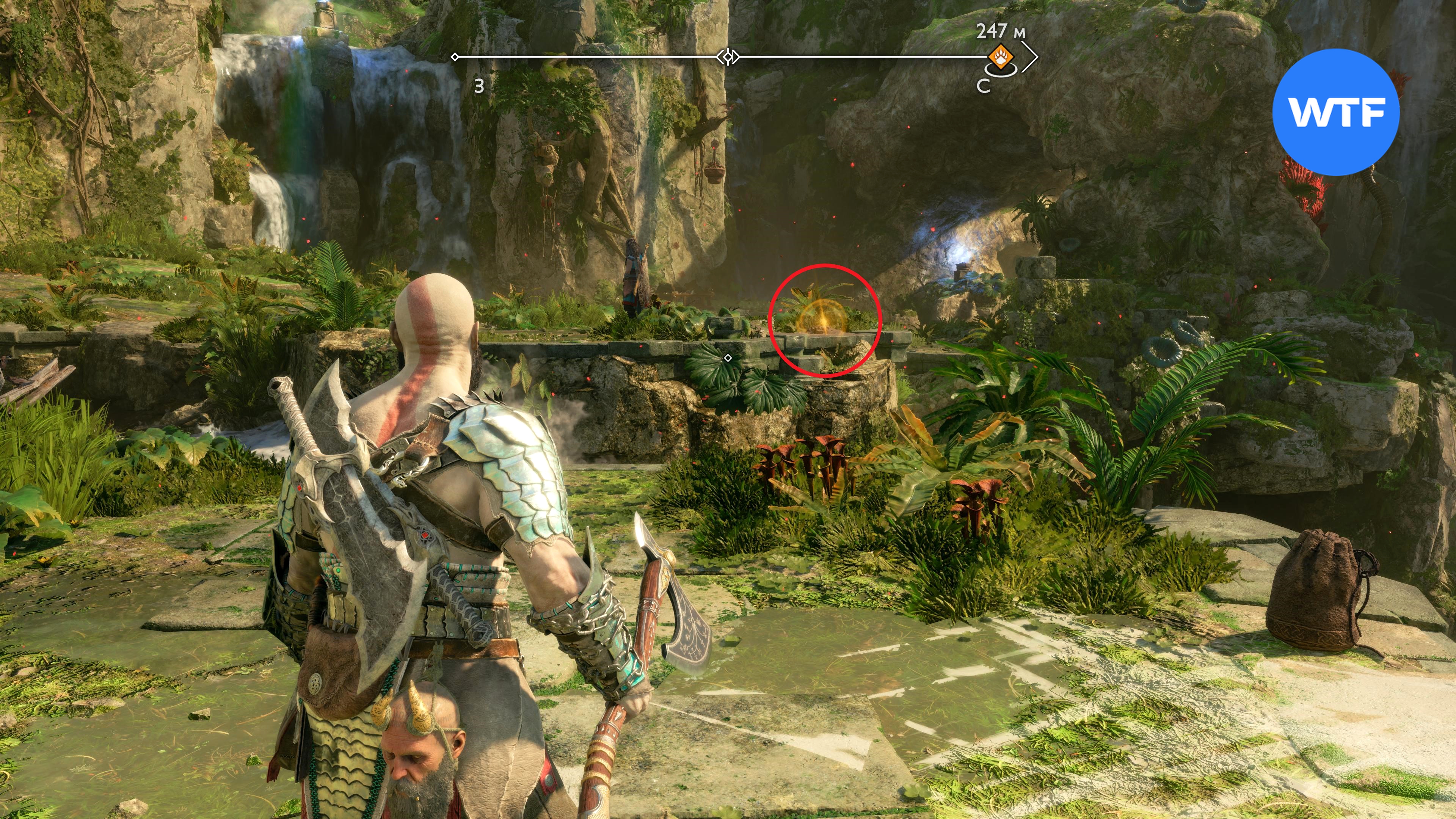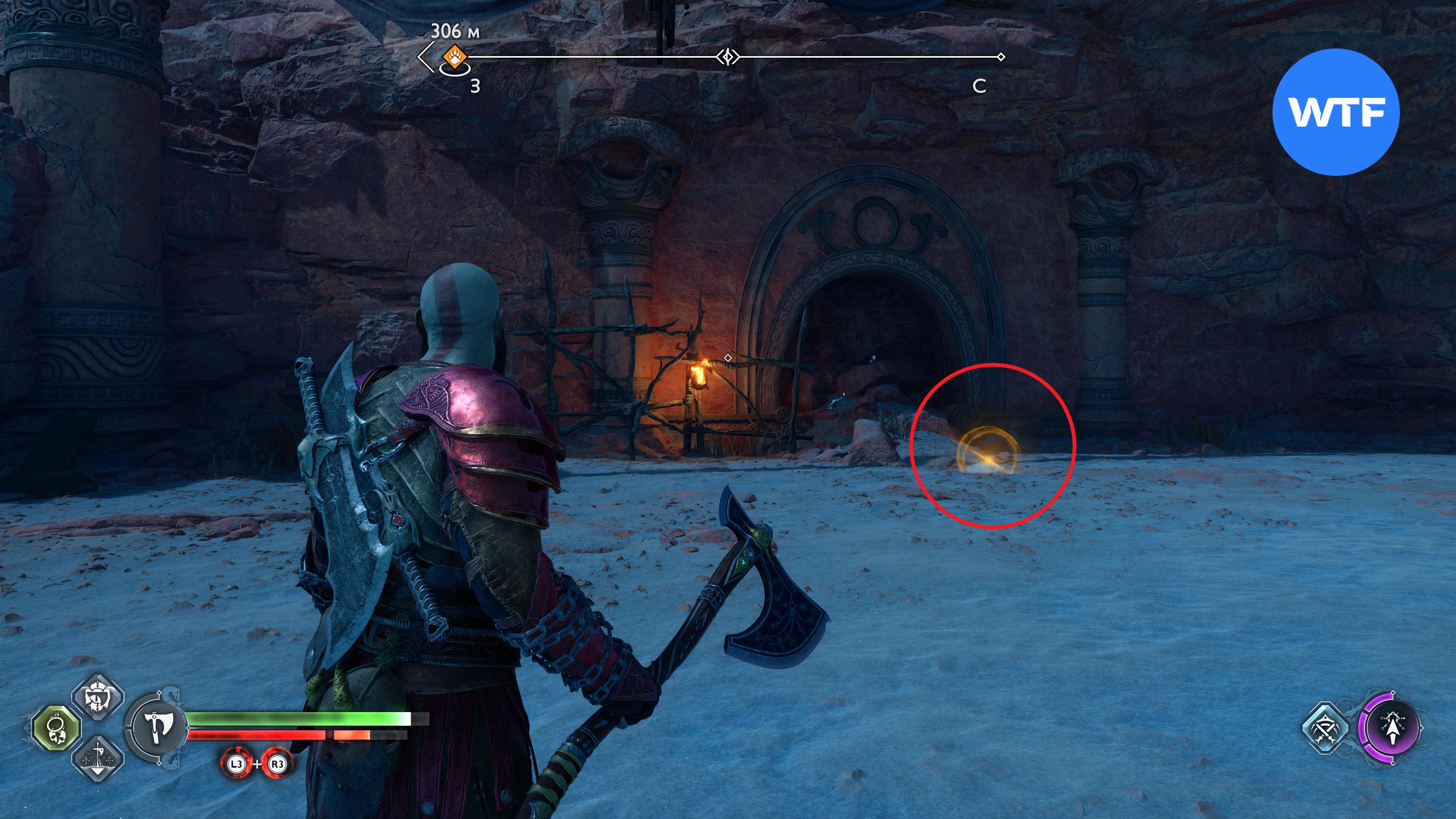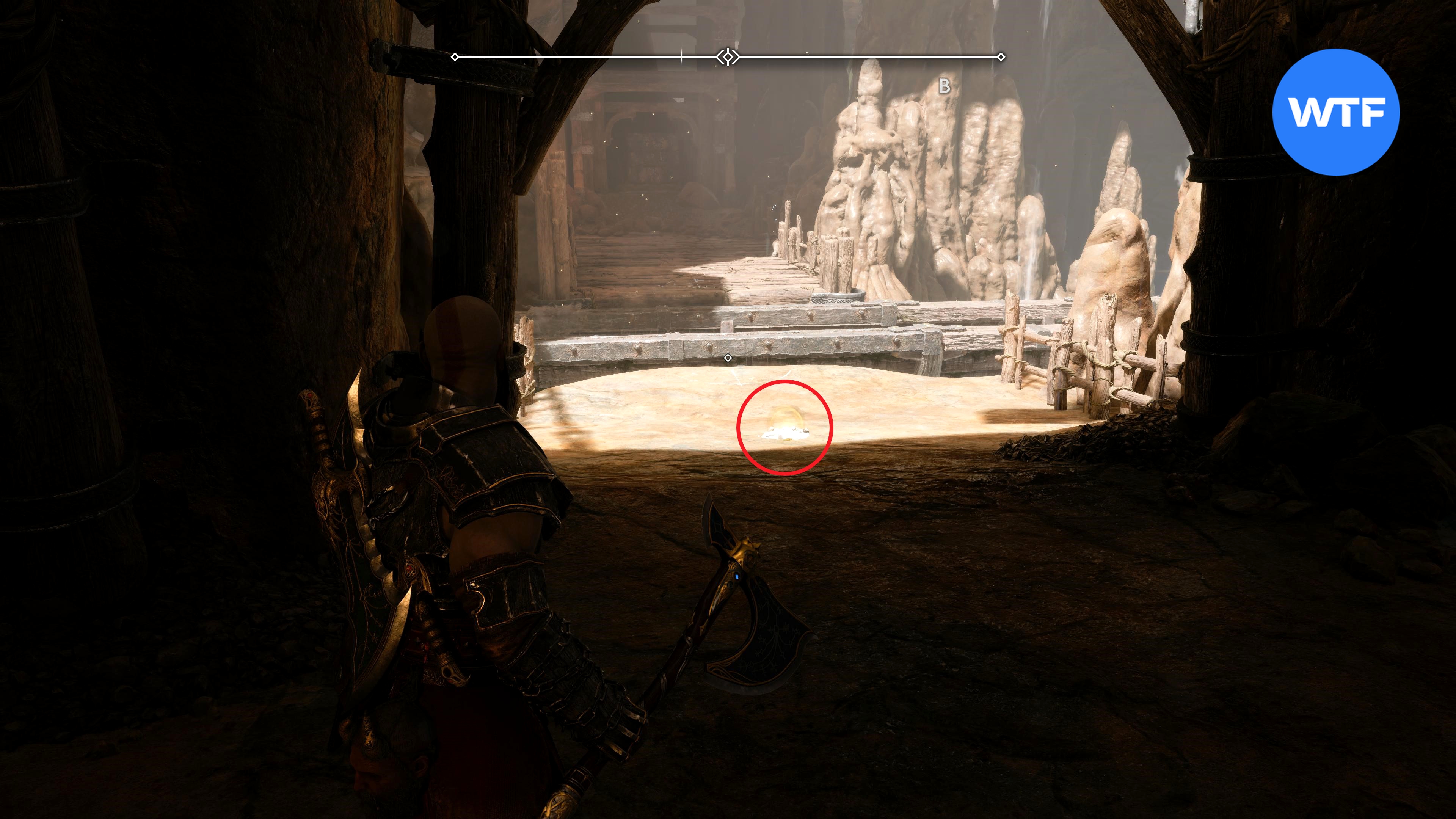 - Где сокровище: от мистических врат в Болотах Аурванга садитесь на паром к Пескам Сверда. Там вы найдете лифт, который вернет вас в Сердцевину. Идите по туннелю вперед до конца. Используйте копье, чтобы подняться наверх. Разрушьте скалу с желтой отметкой и продолжайте двигаться вперед по этому пути. Дорога тут одна, в итоге она приведет вас к комнате с головоломкой и подъемником, где Атрей бросал в желоб камни по сюжету. Вместо подъемника, пролезьте по стене справа и в итоге доберетесь до места, где находится яма драугров. Оттуда используйте точку зацепа под водопадом, сворачивайте направо, а потом при первой возможности прыгайте вправо вниз, на мост. После этого вам нужно идти вниз по спиралевидной шахте, в конце пути сокровище будет справа от вас.