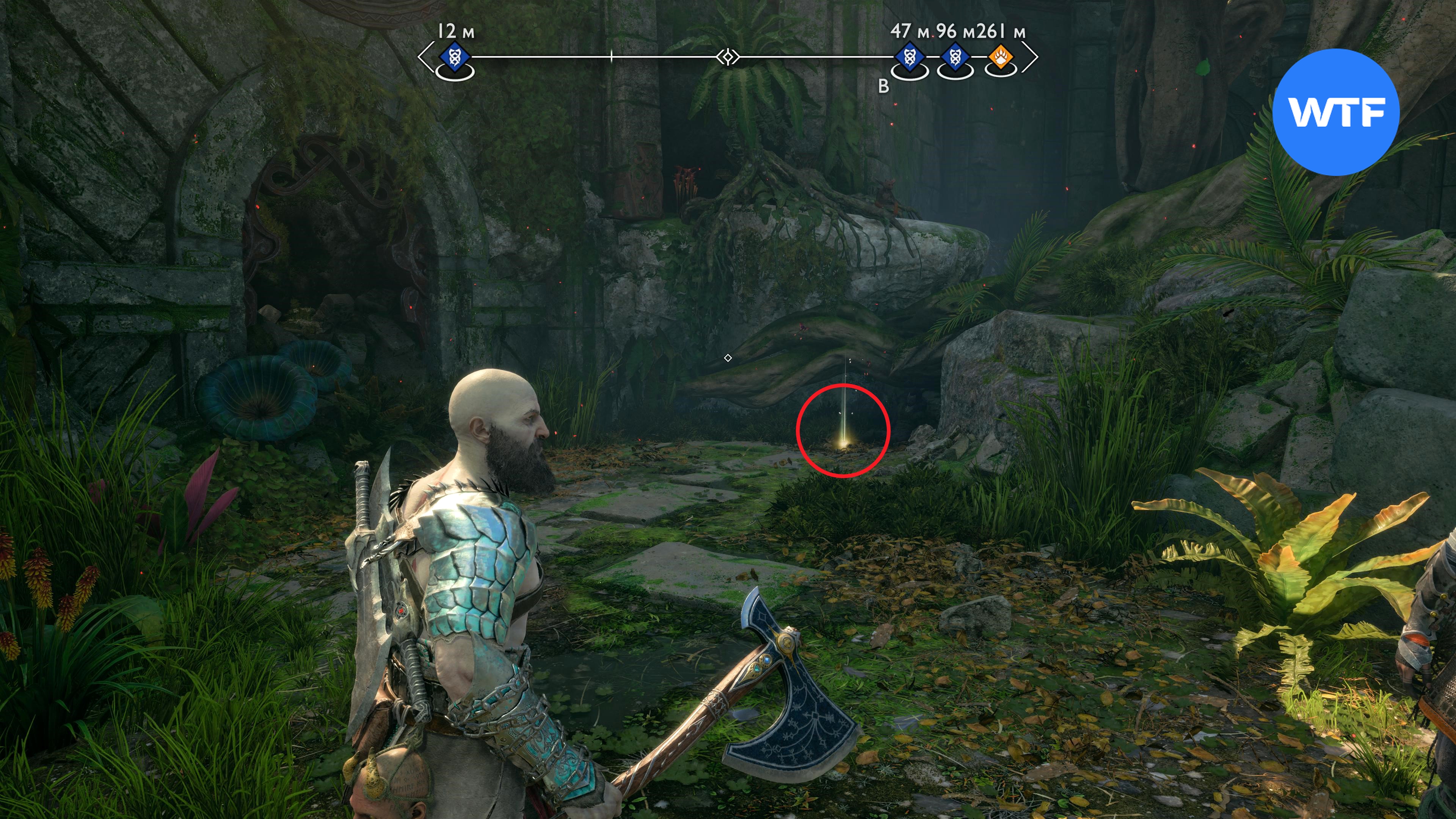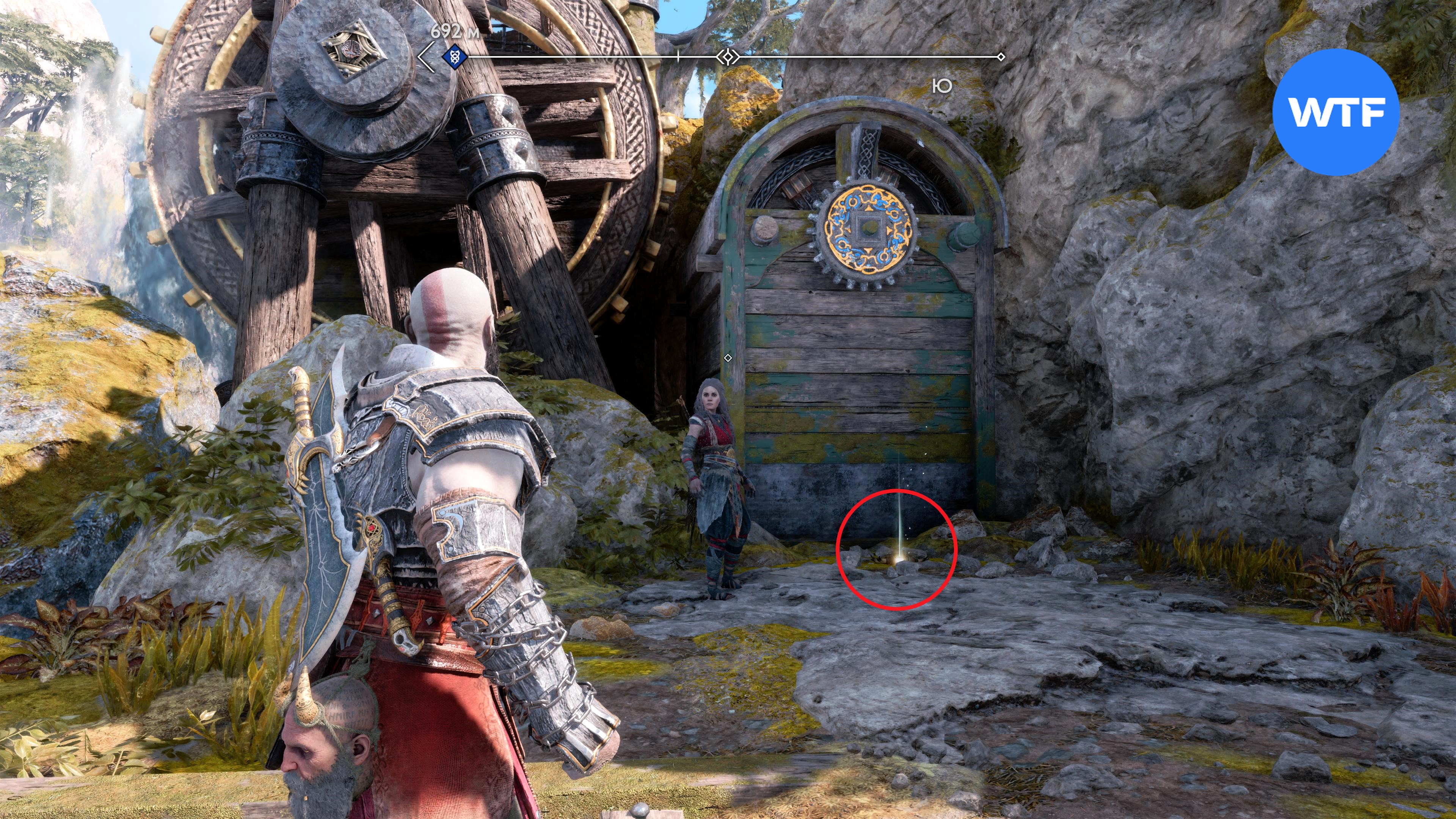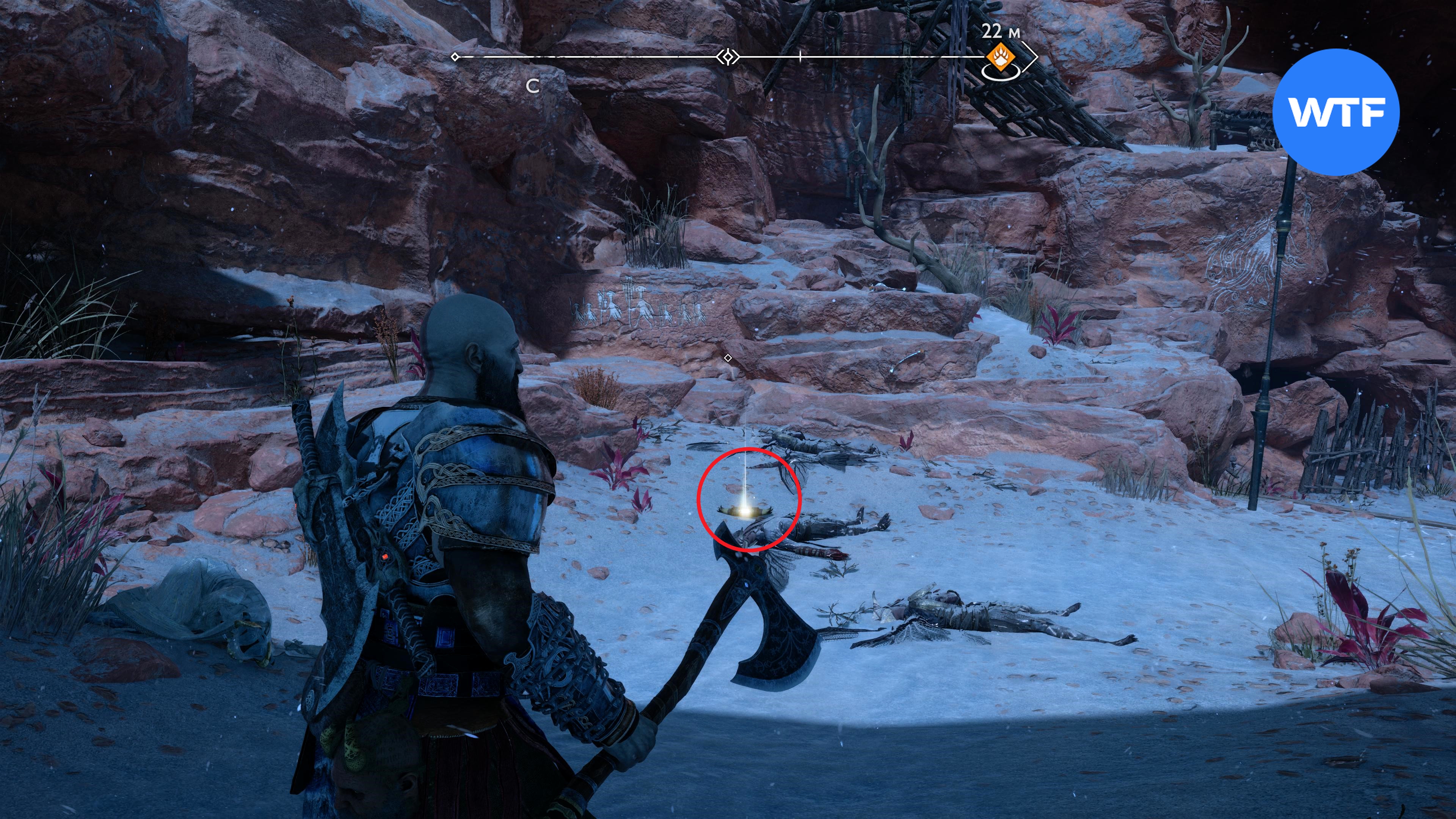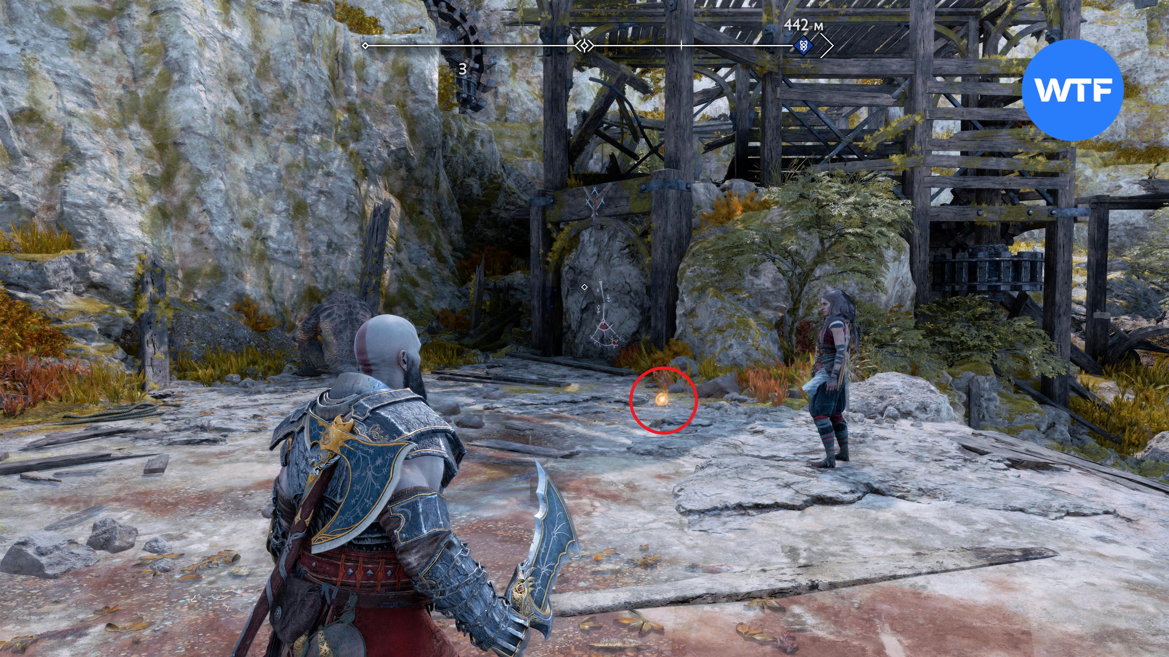 - Где сокровище: от мистических врат в Болотах Аурванга садитесь на паром к Пескам Сверда. Там вы найдете лифт, который вернет вас в Сердцевину. Идите по туннелю вперед до конца. Используйте копье, чтобы подняться наверх. Разрушьте скалу с желтой отметкой и продолжайте двигаться вперед по этому пути. Дорога тут одна, в итоге она приведет вас к комнате с головоломкой и подъемником, где Атрей бросал в желоб камни по сюжету. Вместо подъемника, пролезьте по стене справа и в итоге доберетесь до места, где находится яма драугров. Оттуда используйте точку зацепа под водопадом, сворачивайте направо, а потом при первой возможности прыгайте вправо вниз, на мост. После этого вам нужно идти вниз по спиралевидной шахте, в конце пути сокровище будет справа от вас.
