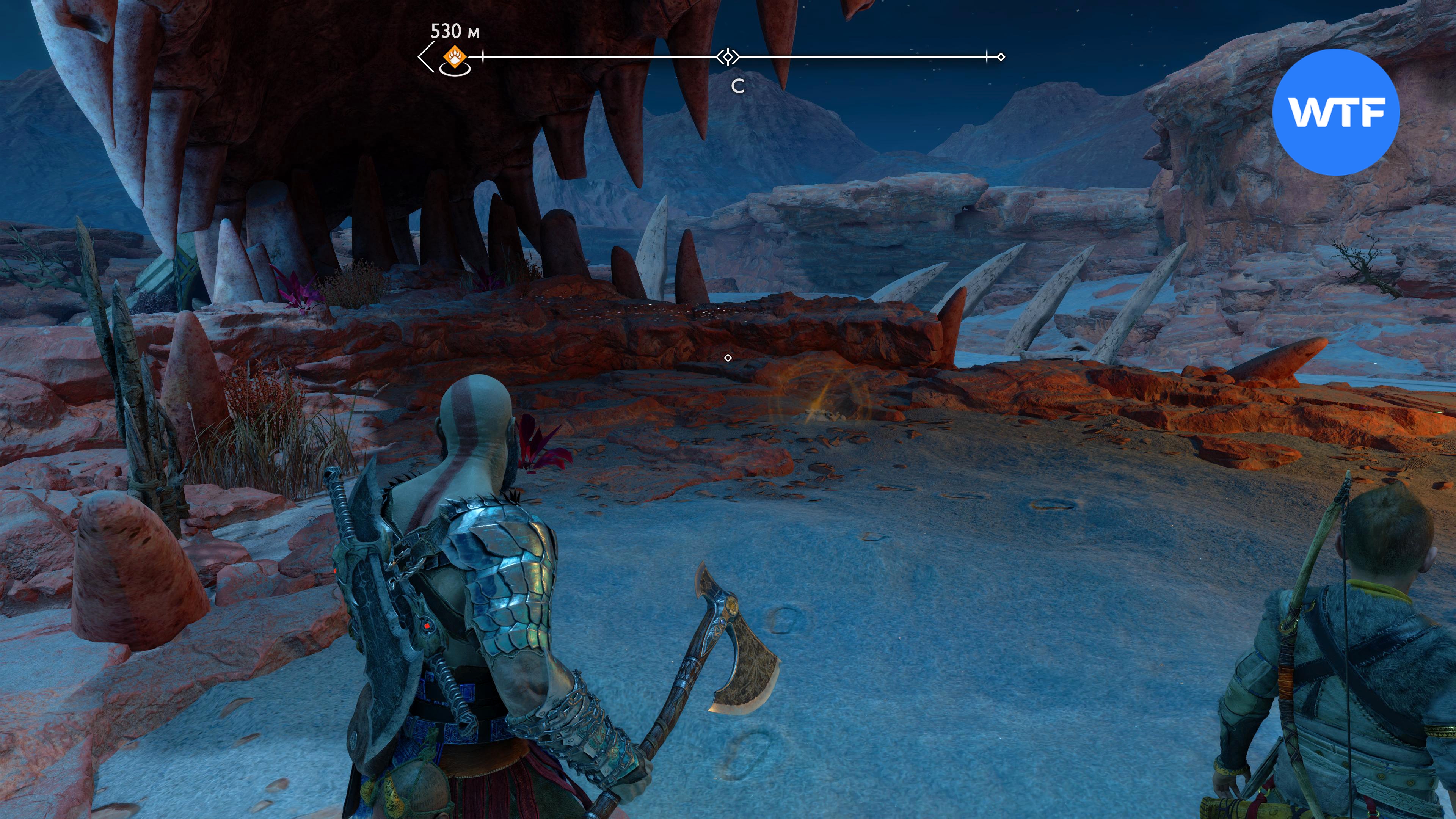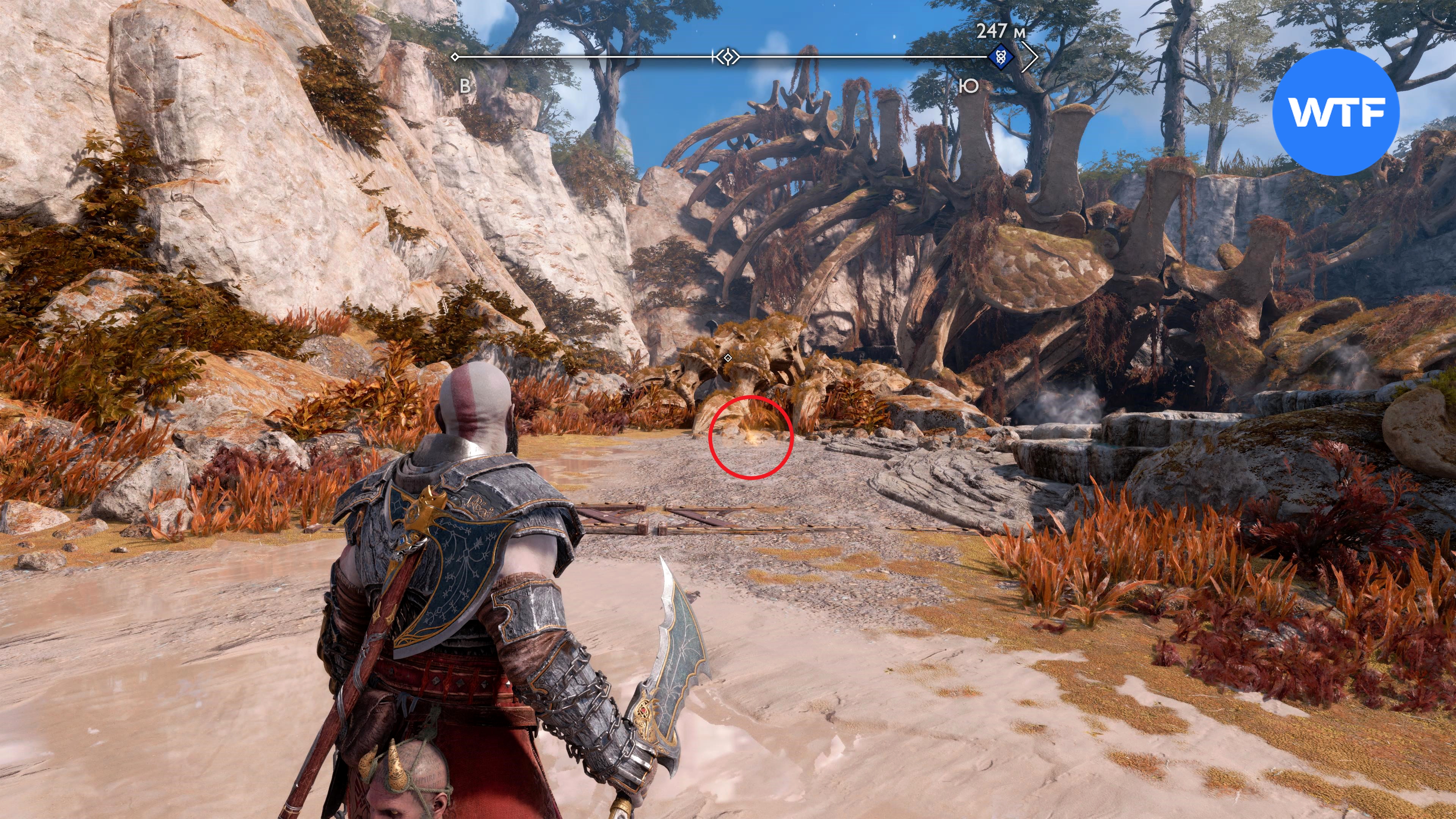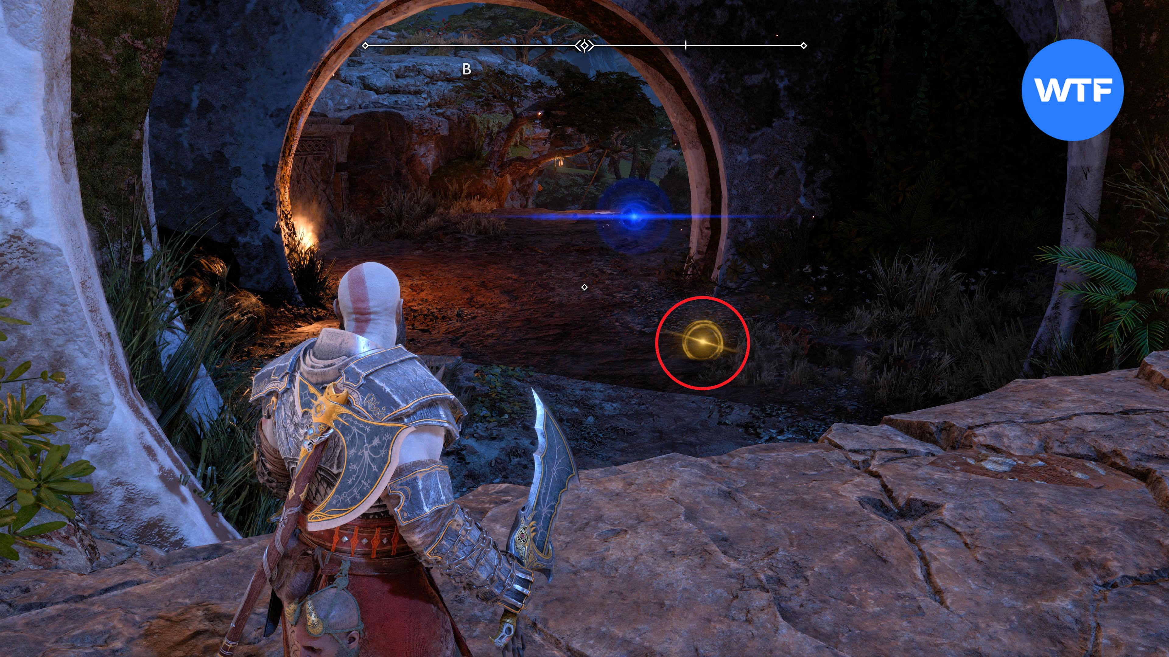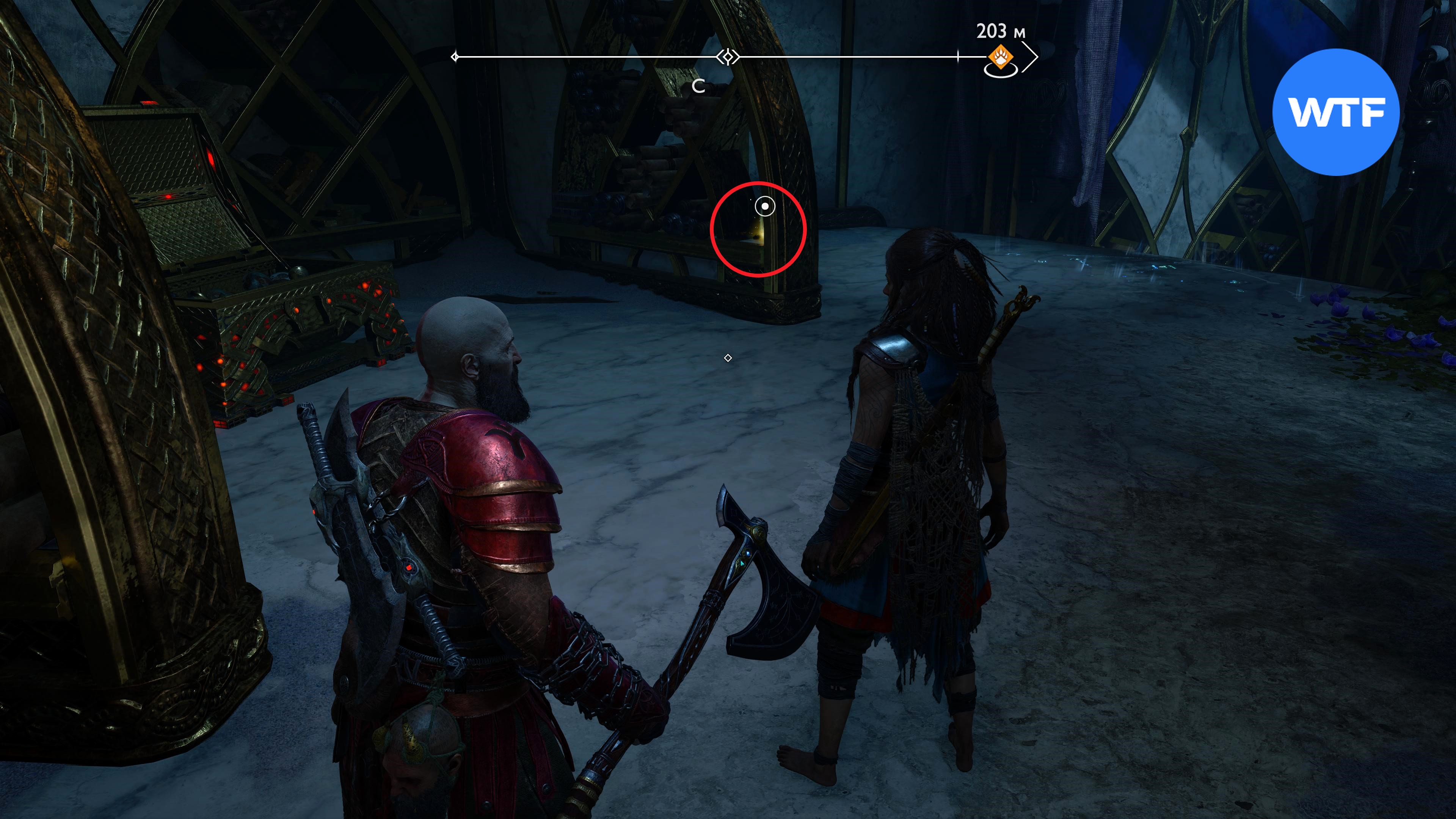 - Где сокровище: от мистических врат в Болотах Аурванга садитесь на паром к Пескам Сверда. Там вы найдете лифт, который вернет вас в Сердцевину. Идите по туннелю вперед до конца. Используйте копье, чтобы подняться наверх. Разрушьте скалу с желтой отметкой и продолжайте двигаться вперед по этому пути. Дорога тут одна, в итоге она приведет вас к комнате с головоломкой и подъемником, где Атрей бросал в желоб камни по сюжету. Вместо подъемника, пролезьте по стене справа и в итоге доберетесь до места, где находится яма драугров. Оттуда используйте точку зацепа под водопадом, сворачивайте направо, а потом при первой возможности прыгайте вправо вниз, на мост. После этого вам нужно идти вниз по спиралевидной шахте, в конце пути сокровище будет справа от вас.