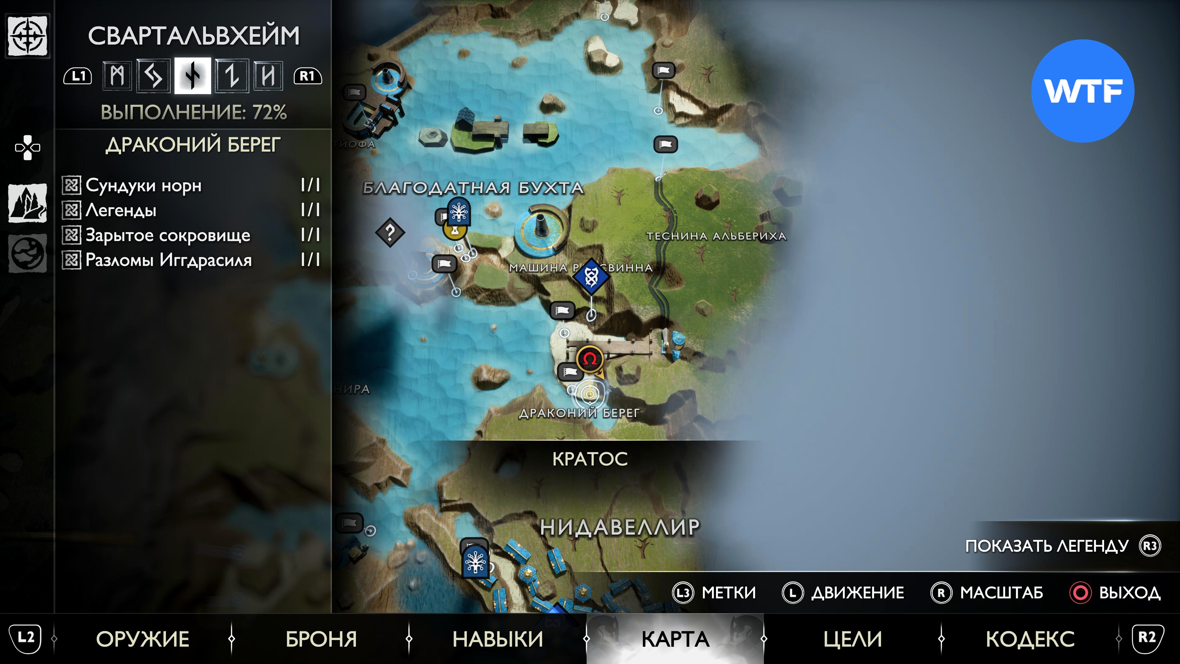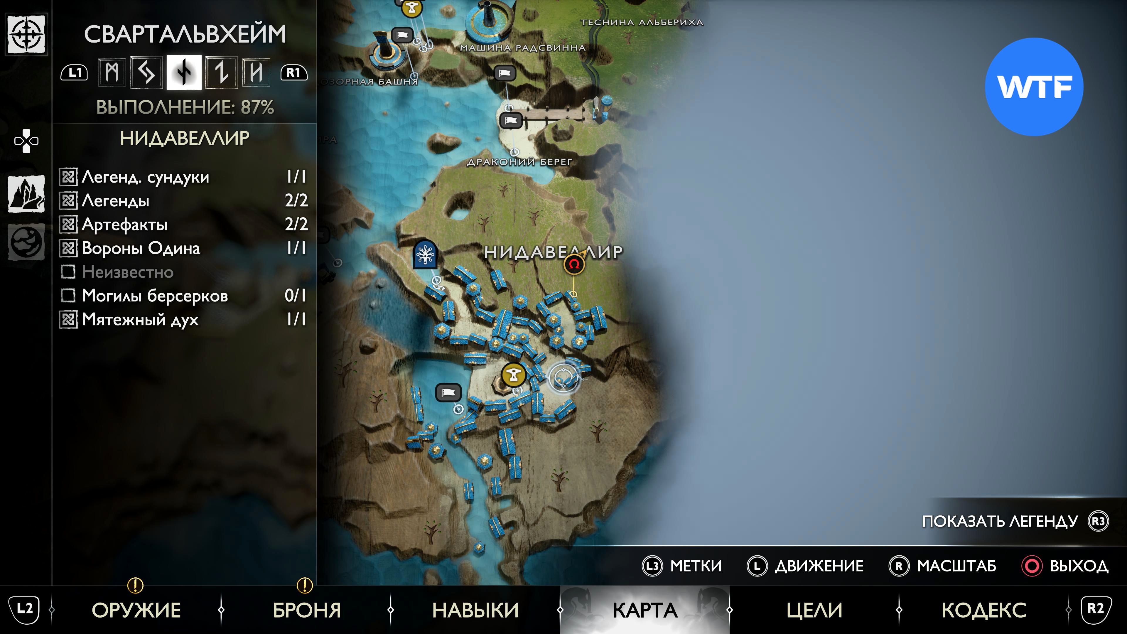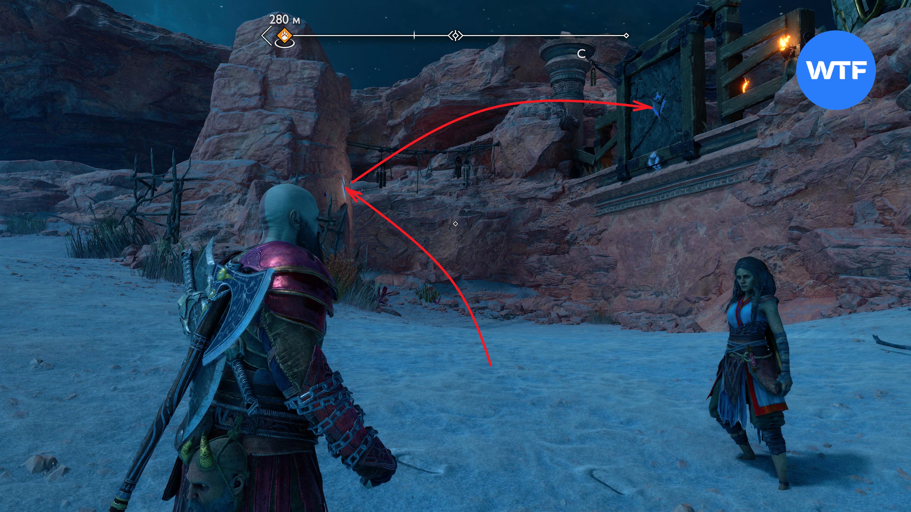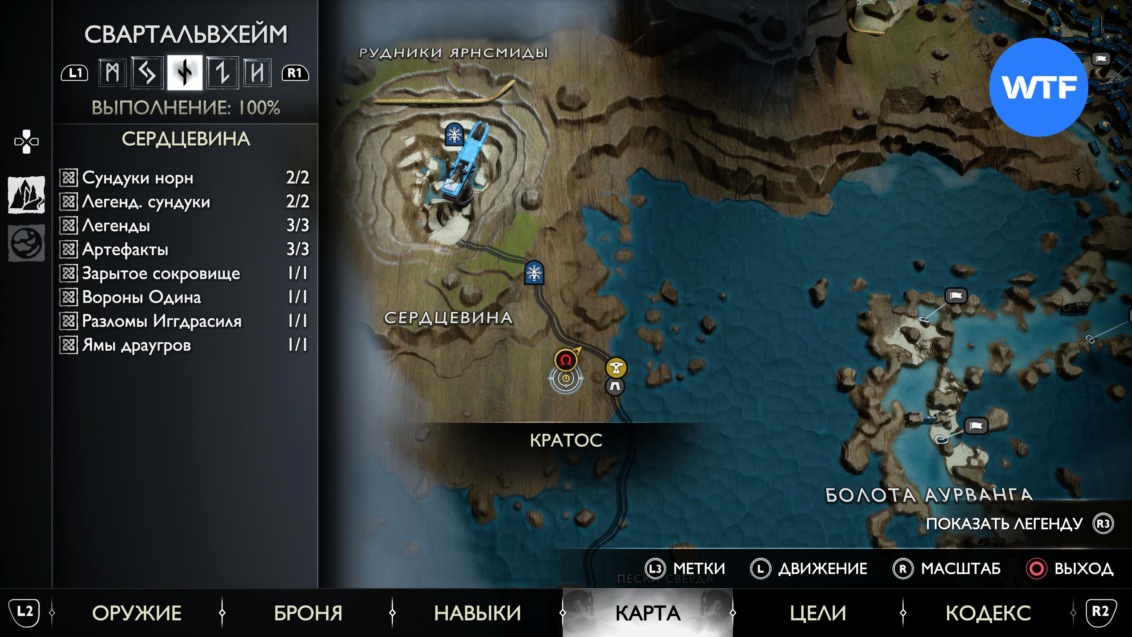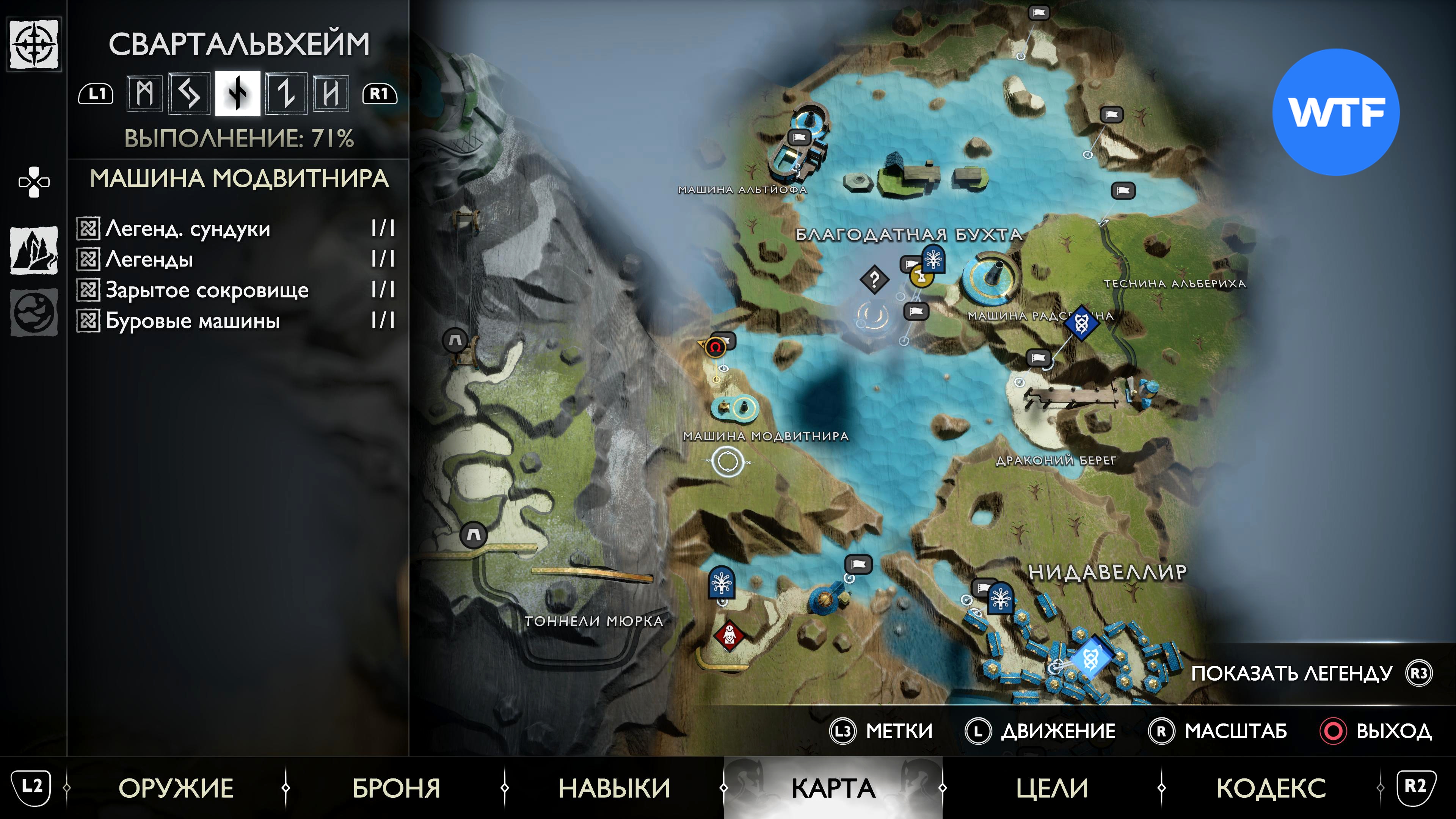 - Где карта: вернитесь в Нидавеллир после выполнения сюжетной задачи «Кузнец своей судьбы» и получения копья. Пройдя через шахту слева от лавки гномов, сразу же поверните налево и идите в другую шахту. Следуя по этому пути, вы в конце концов доберетесь до места, где в стену можно воткнуть копье и подняться наверх. Карта лежит возле легендарного сундука.