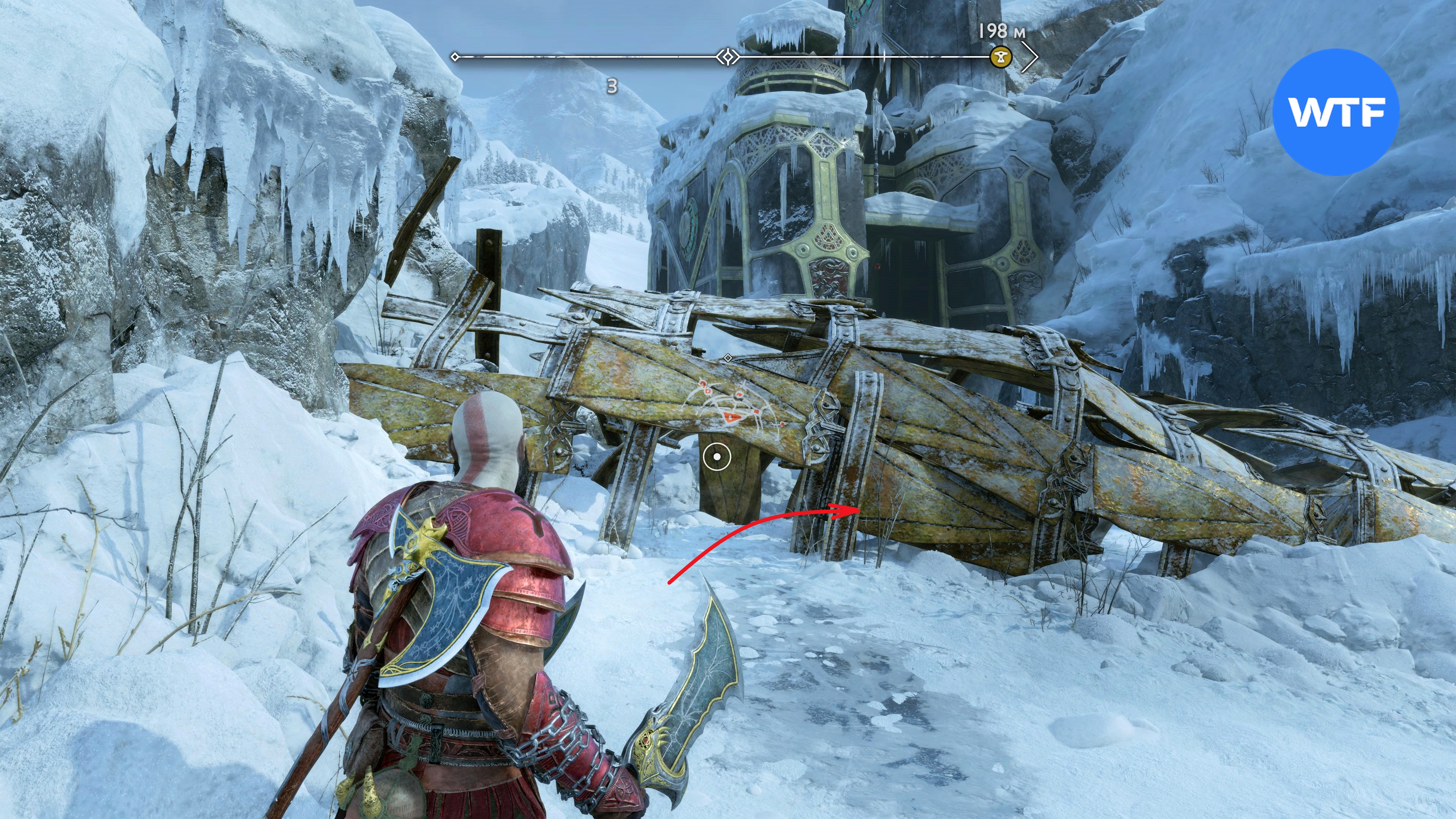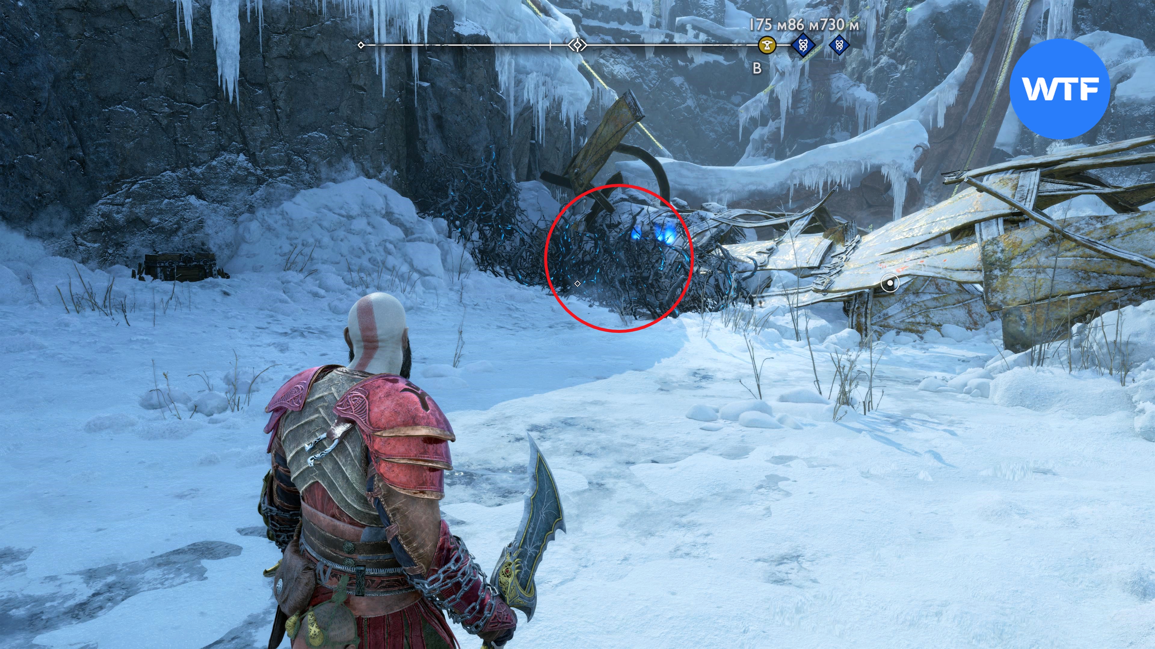 К северо-востоку от храма Тюра есть деревянные обломки, через которые вы можете перелезть для доступа к локации Берега девяти. После этого пролезьте под большим камнем и идите к обломкам статуи перед вами. Пройдя через них, вы сможете сжечь лозы с другой стороны и выкопать этот кусок брони.