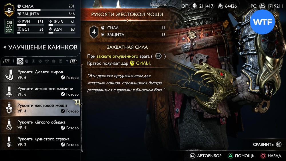 - Захватная сила — при захвате оглушённого врага R3 Кратос получает дар силы.