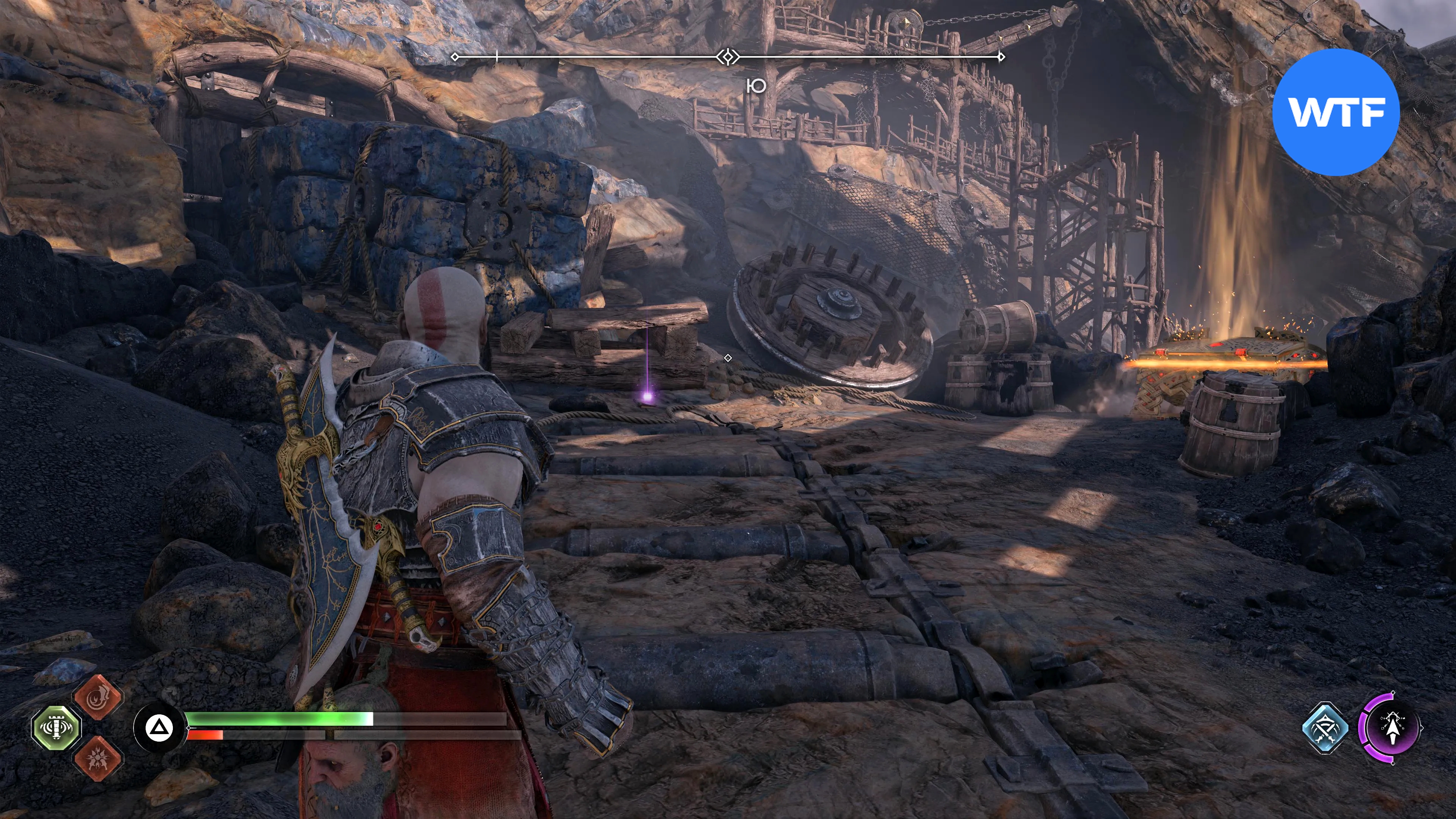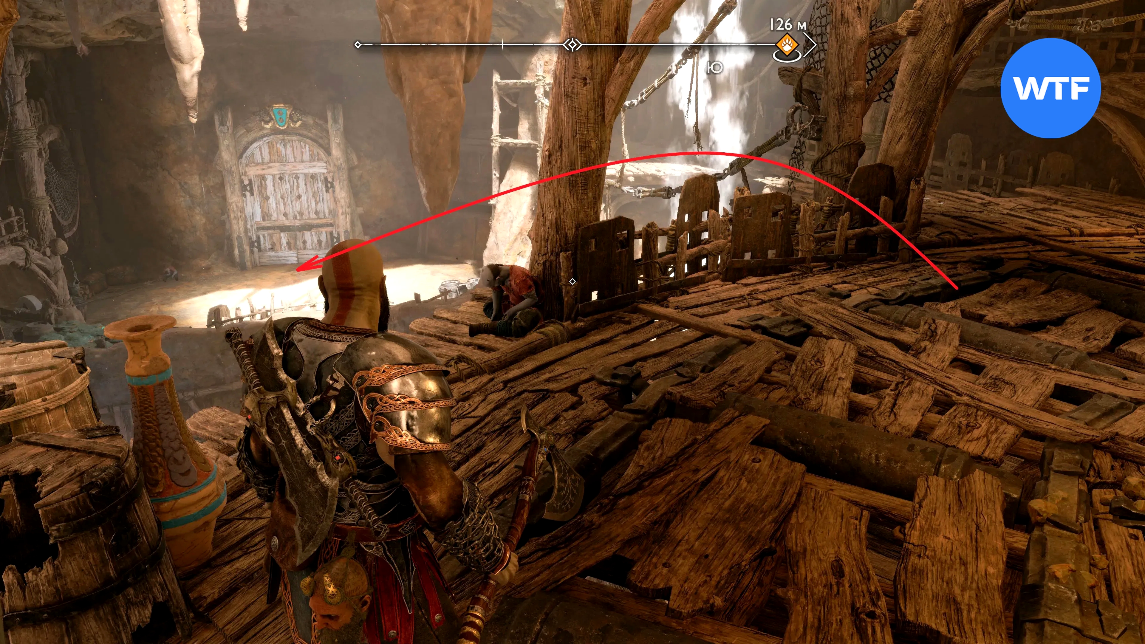 После выполнения сюжетной задачи «Кузнец своей судьбы» и получения копья вам нужно вернуться в Нидавеллир в Свартальвхейме. Пройдя через шахту слева от лавки гномов, сразу же поверните налево и идите в другую шахту. Следуя по этому пути, вы в конце концов доберетесь до места, где в стену можно воткнуть копье и подняться к сундуку (см. скриншот 4).