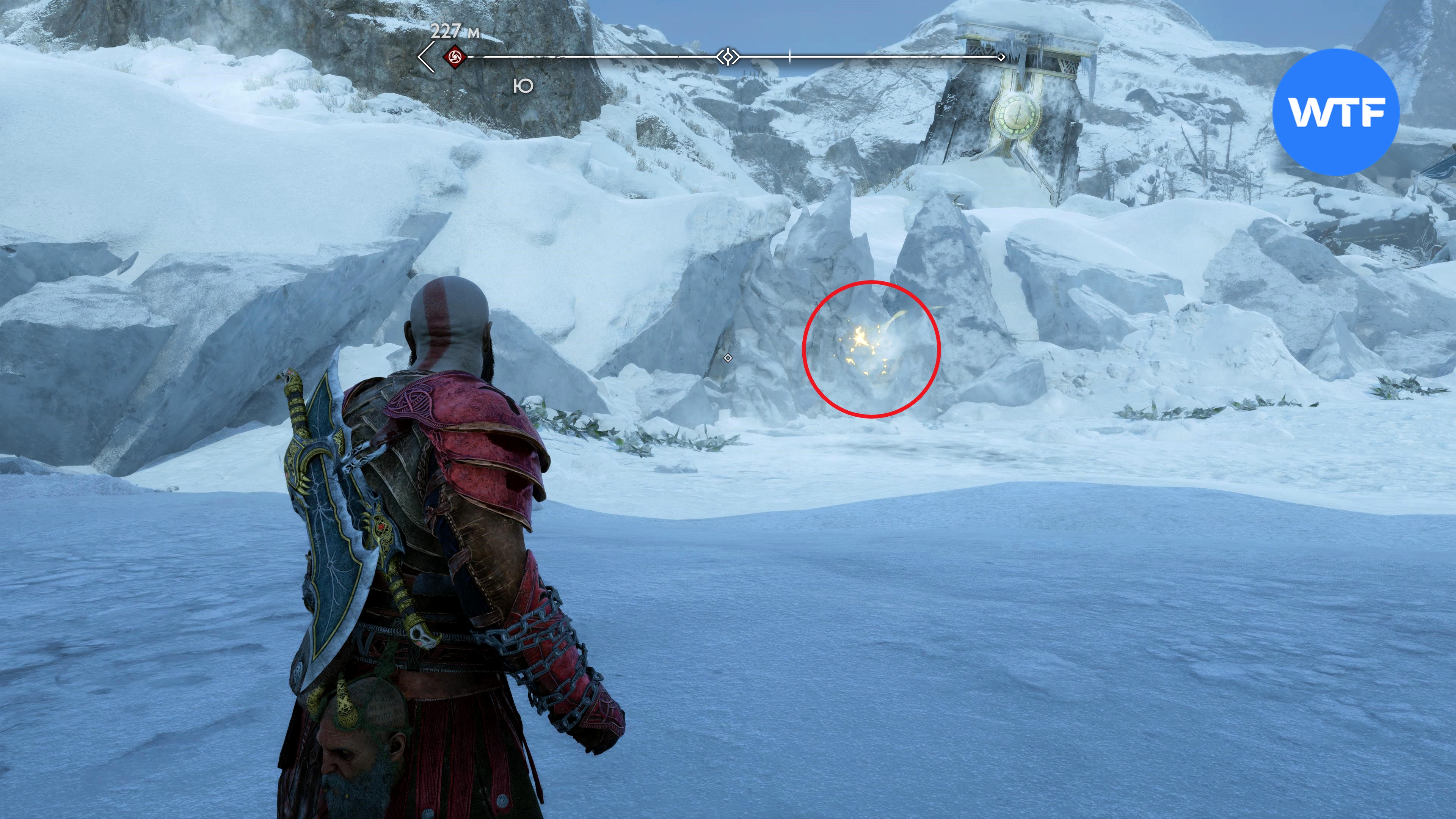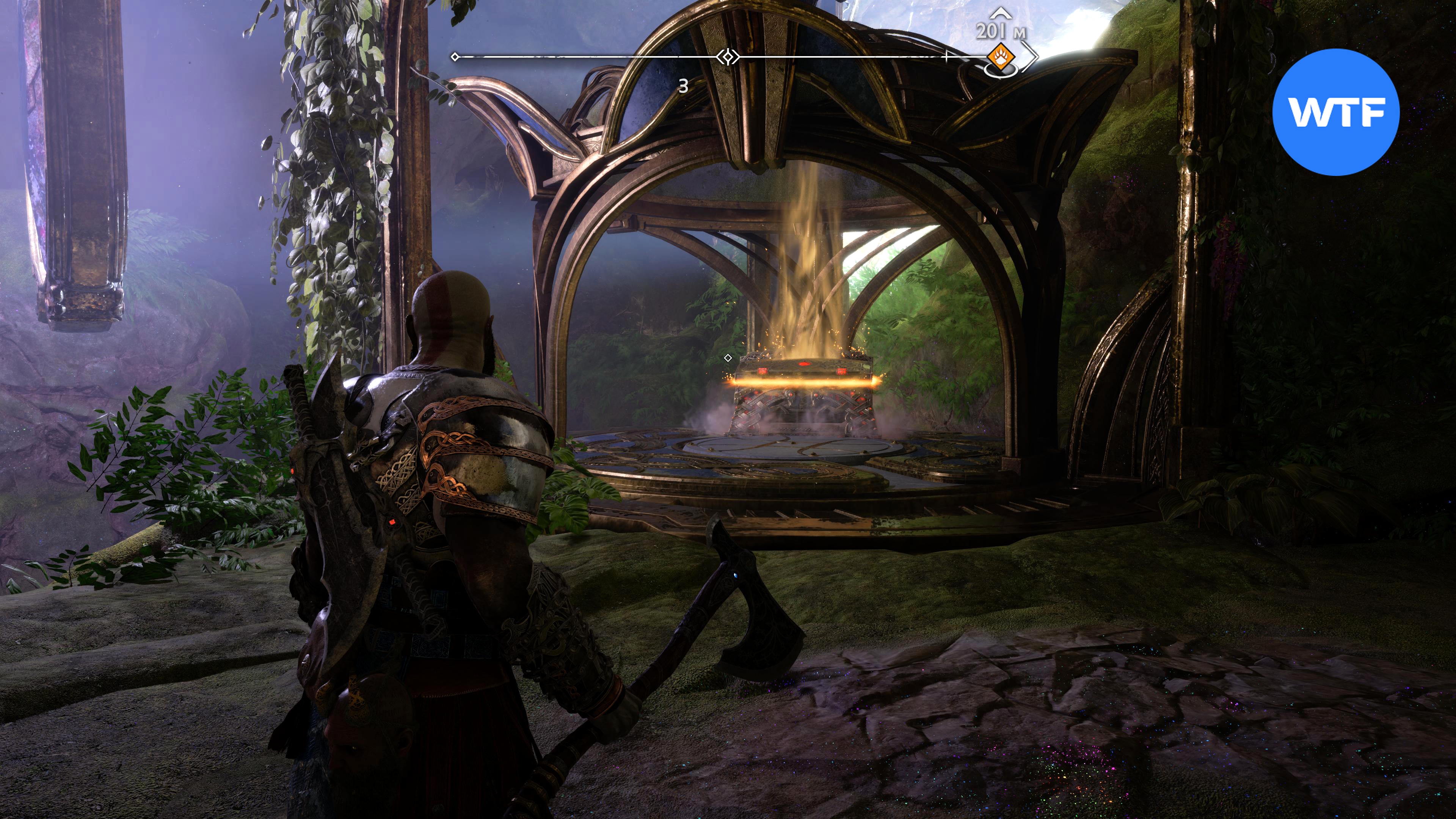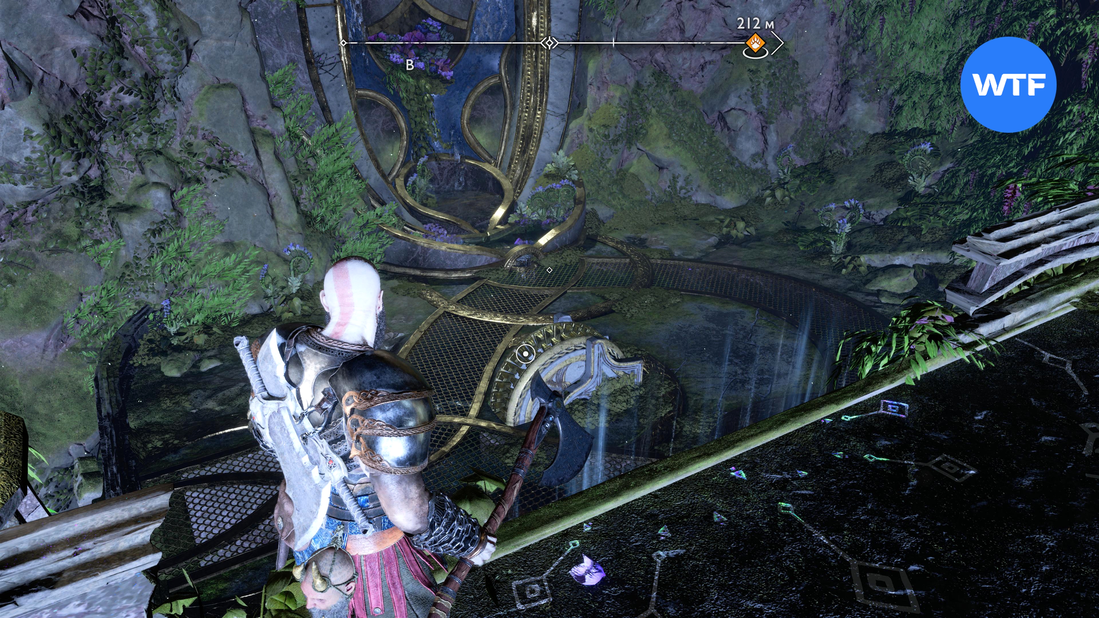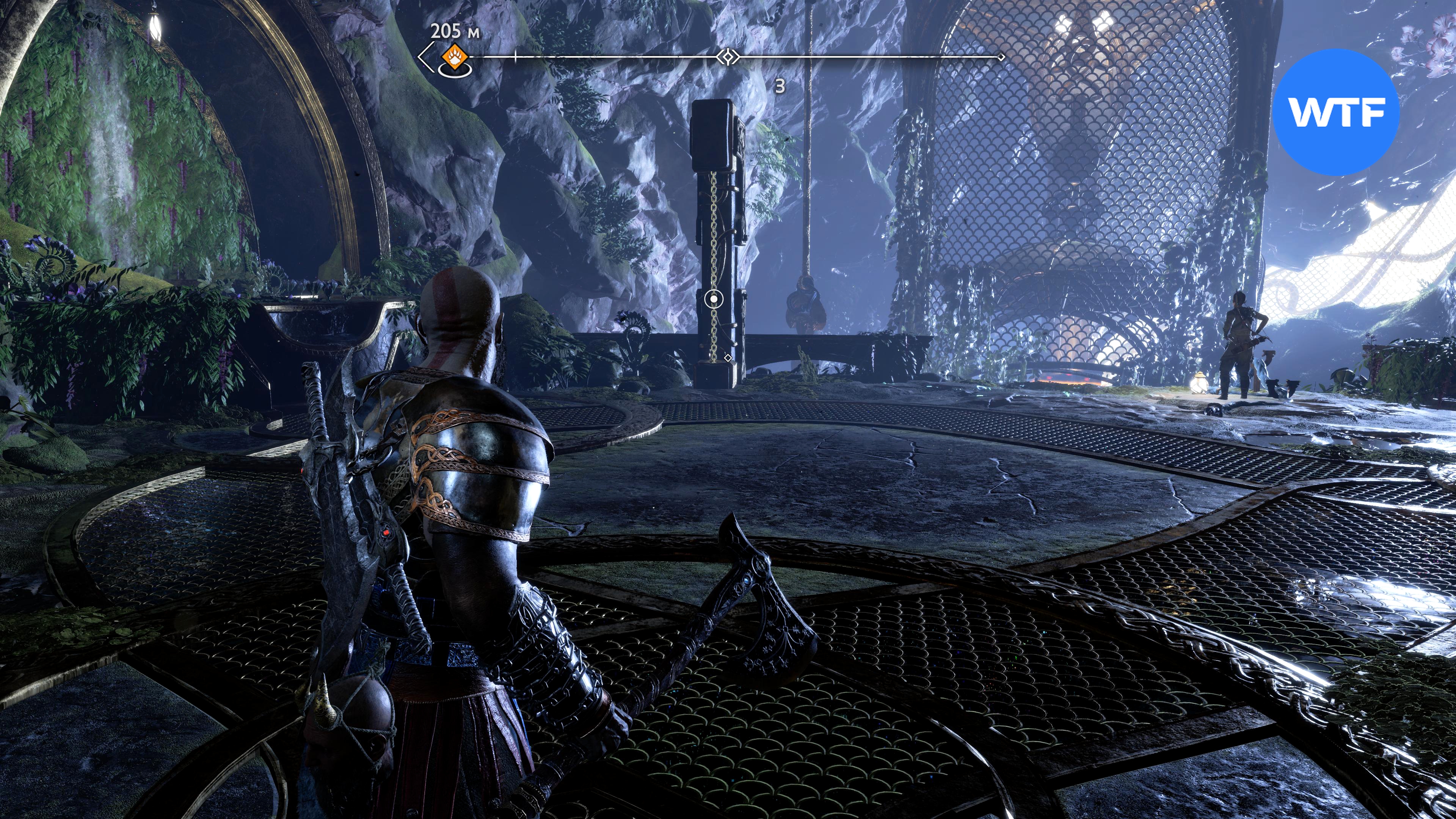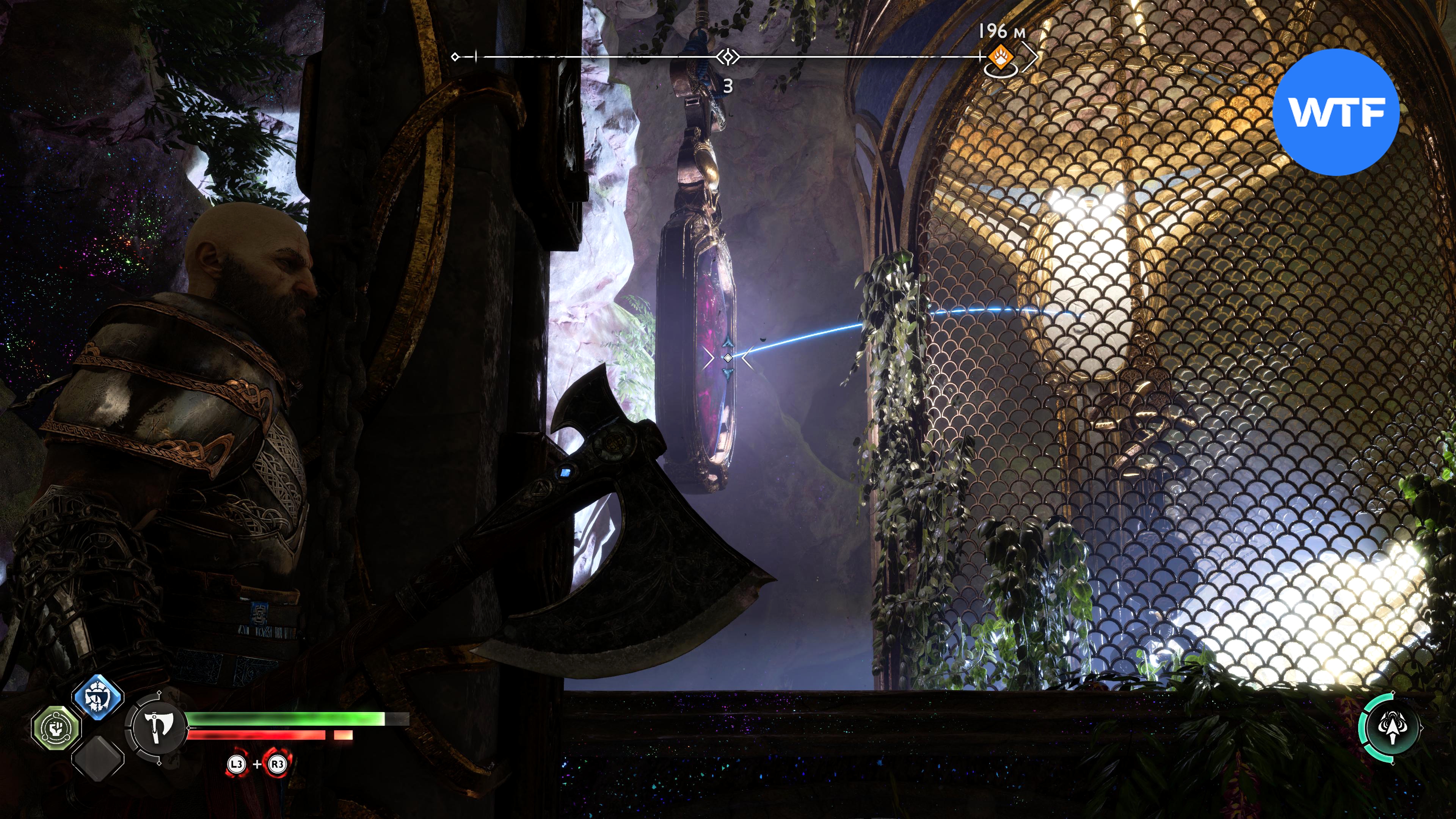 Прямо возле этой шестерни есть дверь, вам туда. Чтобы добраться до сундука, потяните цепь, киньте топор в фиолетовый камень, отпустите цепь, а затем призовите топор обратно (скриншоты 4 - 6). Действие: