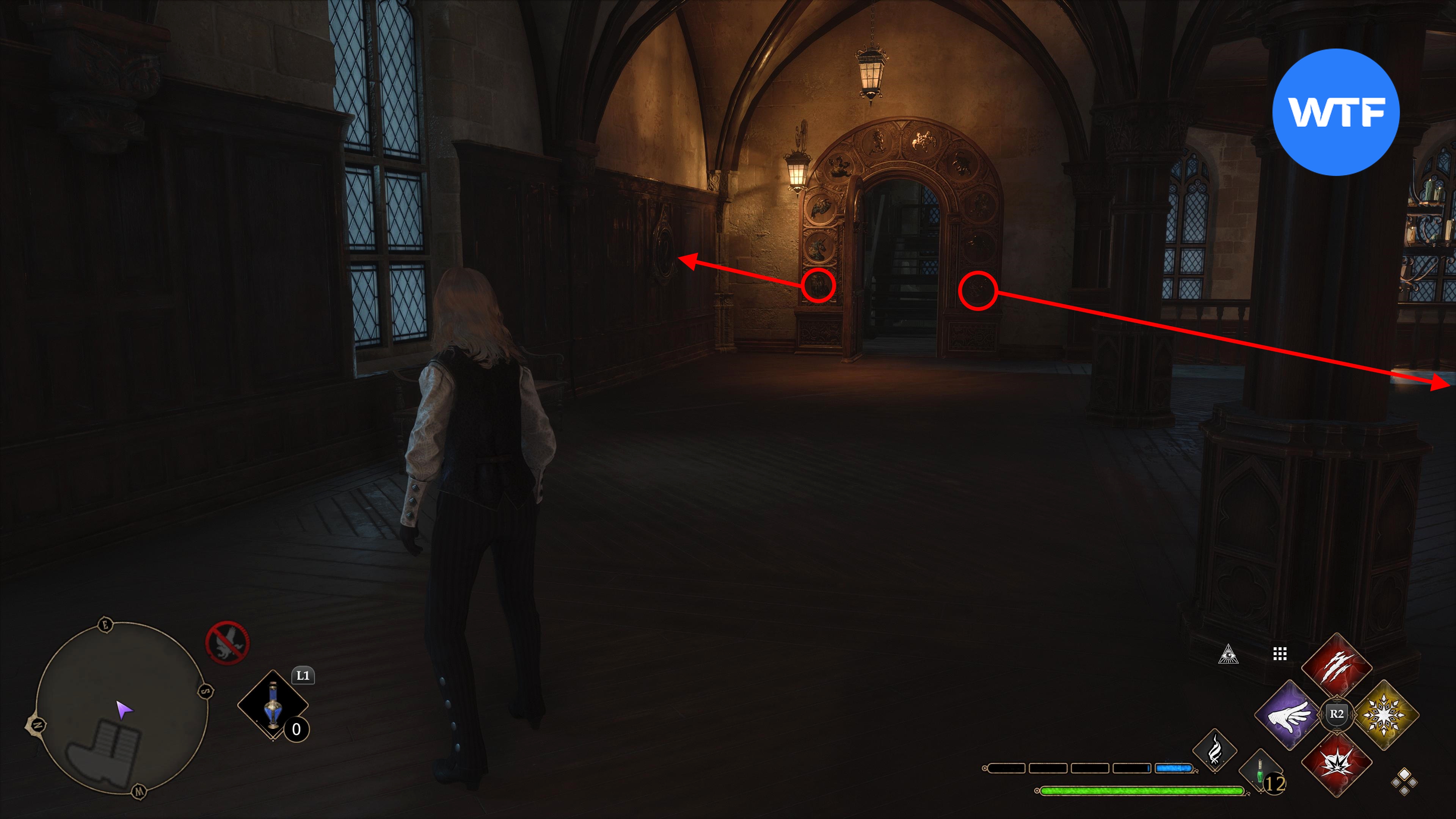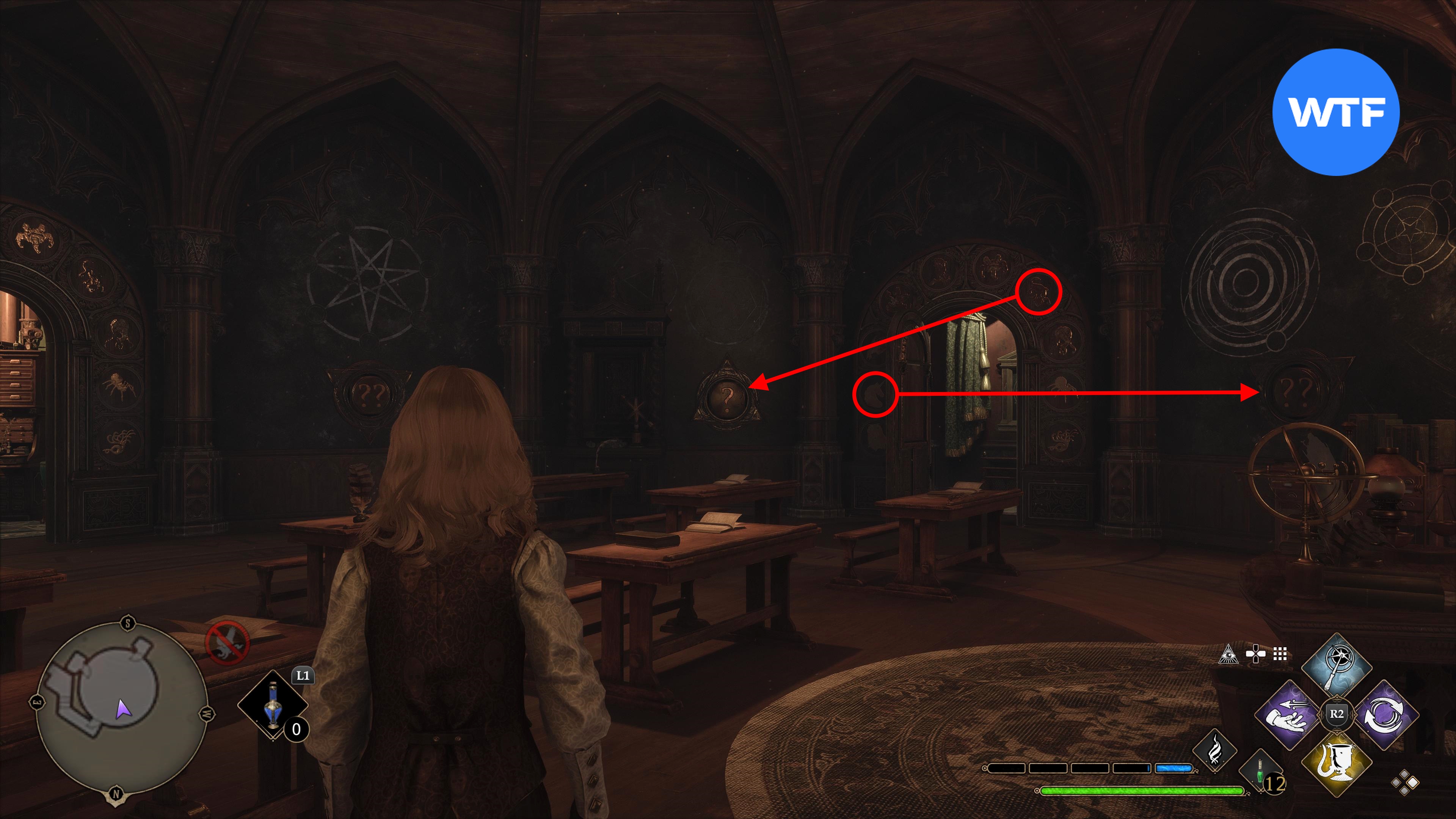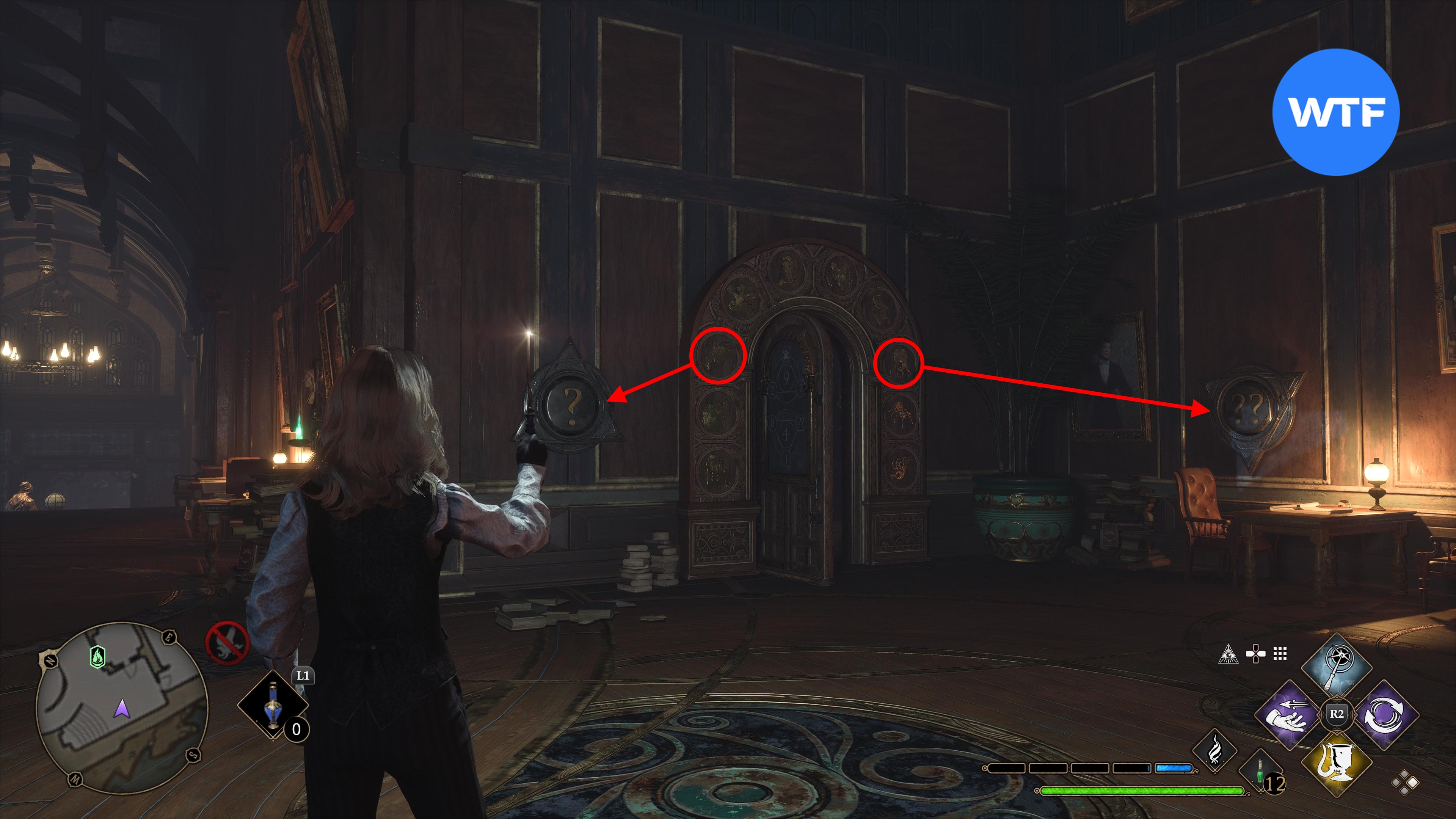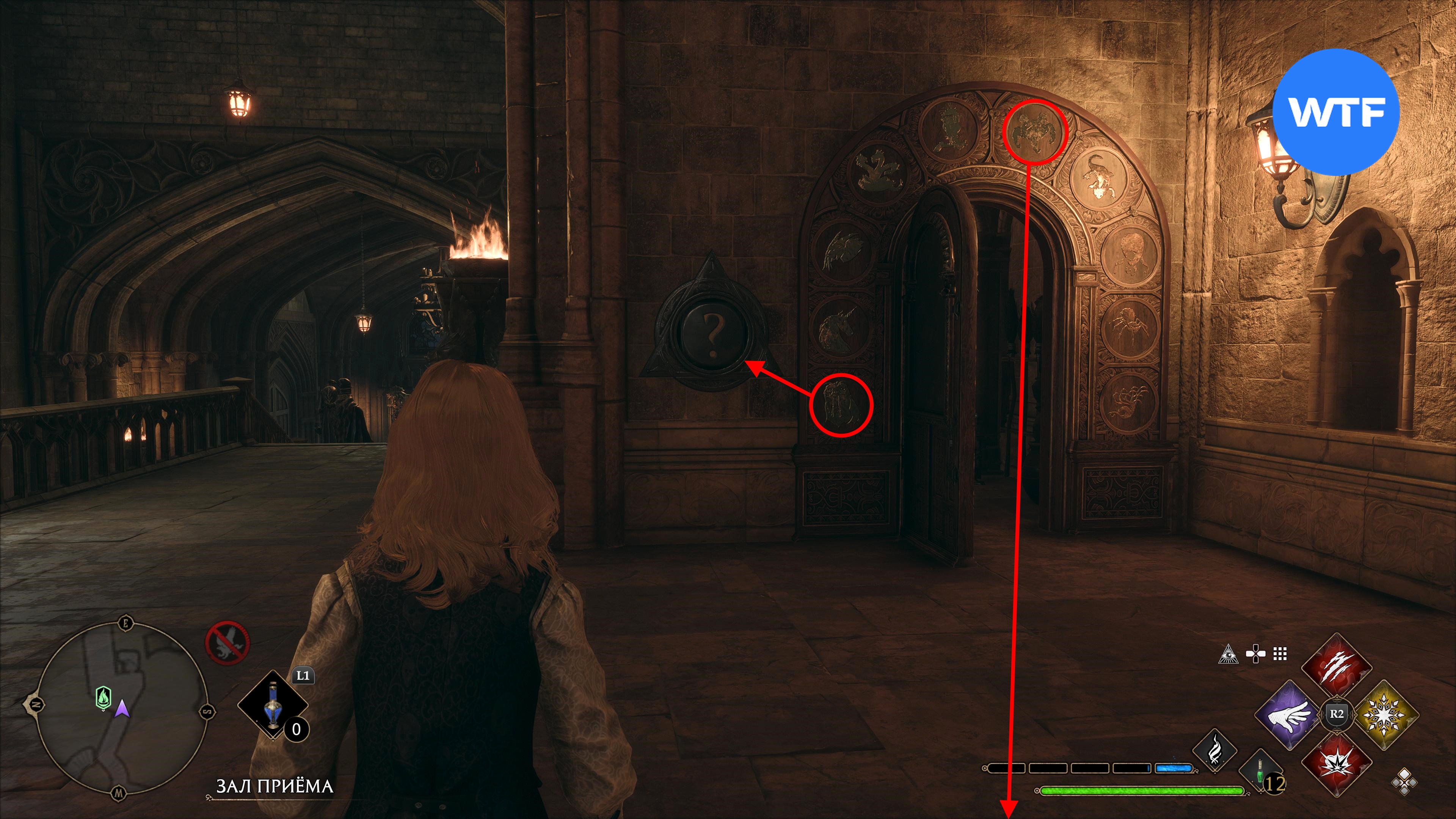 Чтобы найти ключ к разгадке таких дверей, отправляйтесь к точке с летучим пламенем «Класс прорицаний» в Пристройке к библиотеке. Пройдите через арку прямо за вами (см. скриншот 2).
