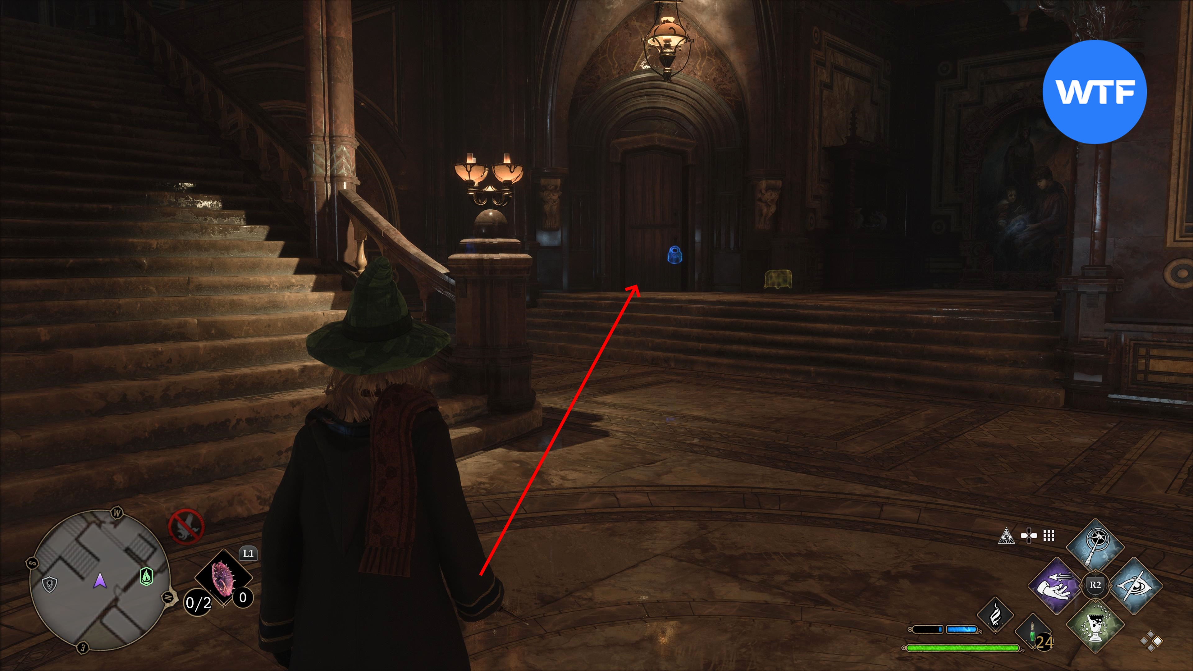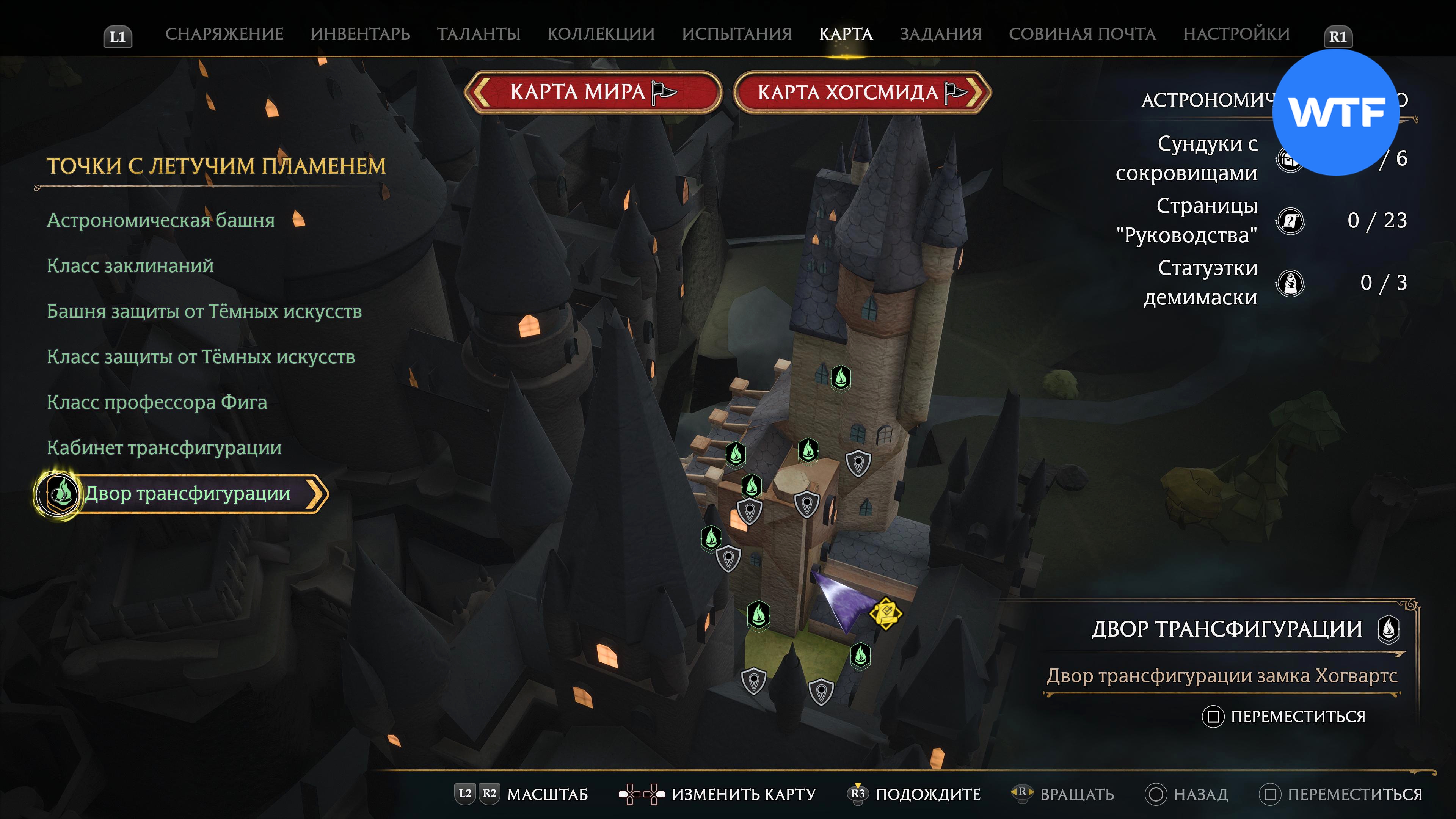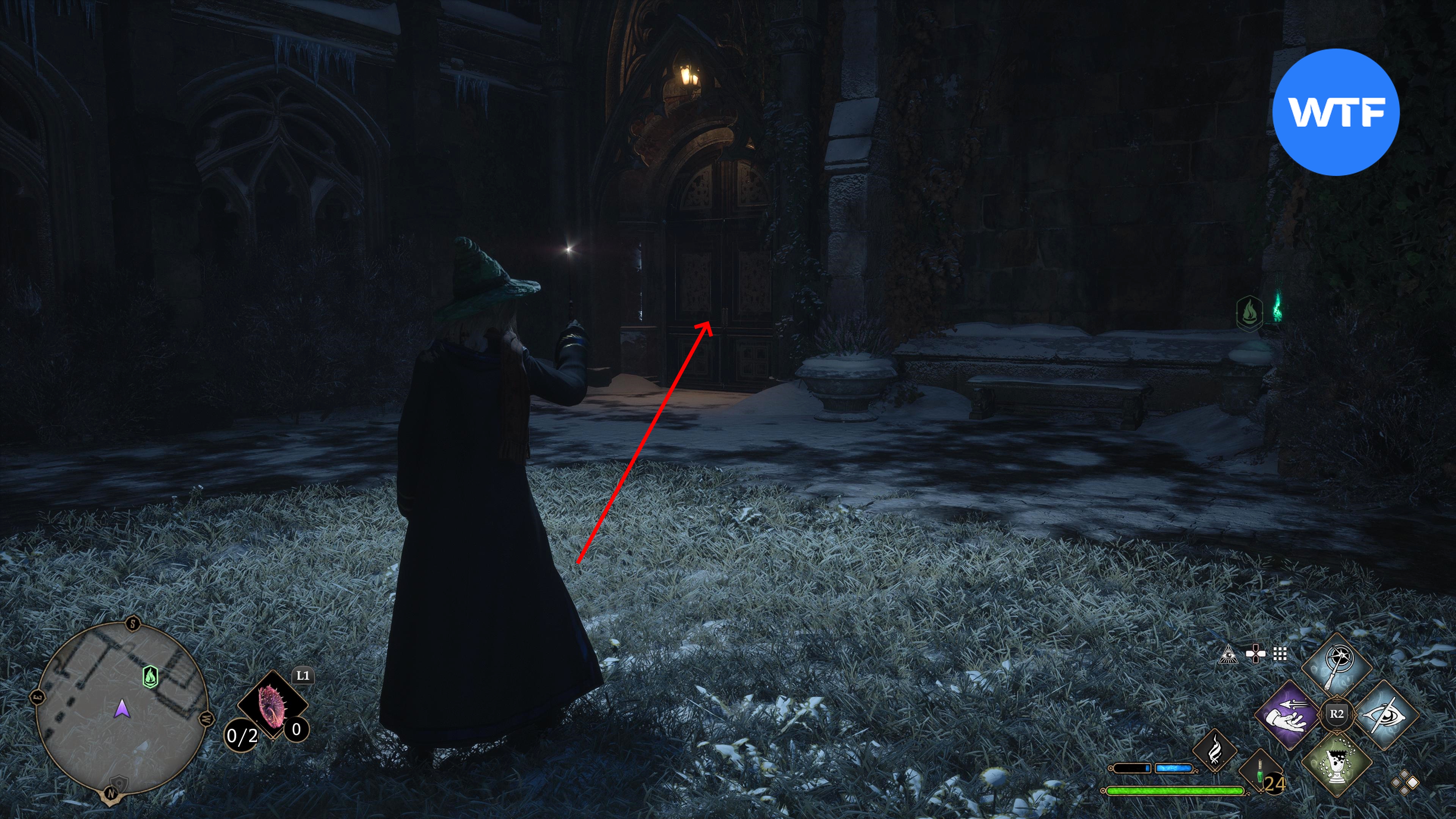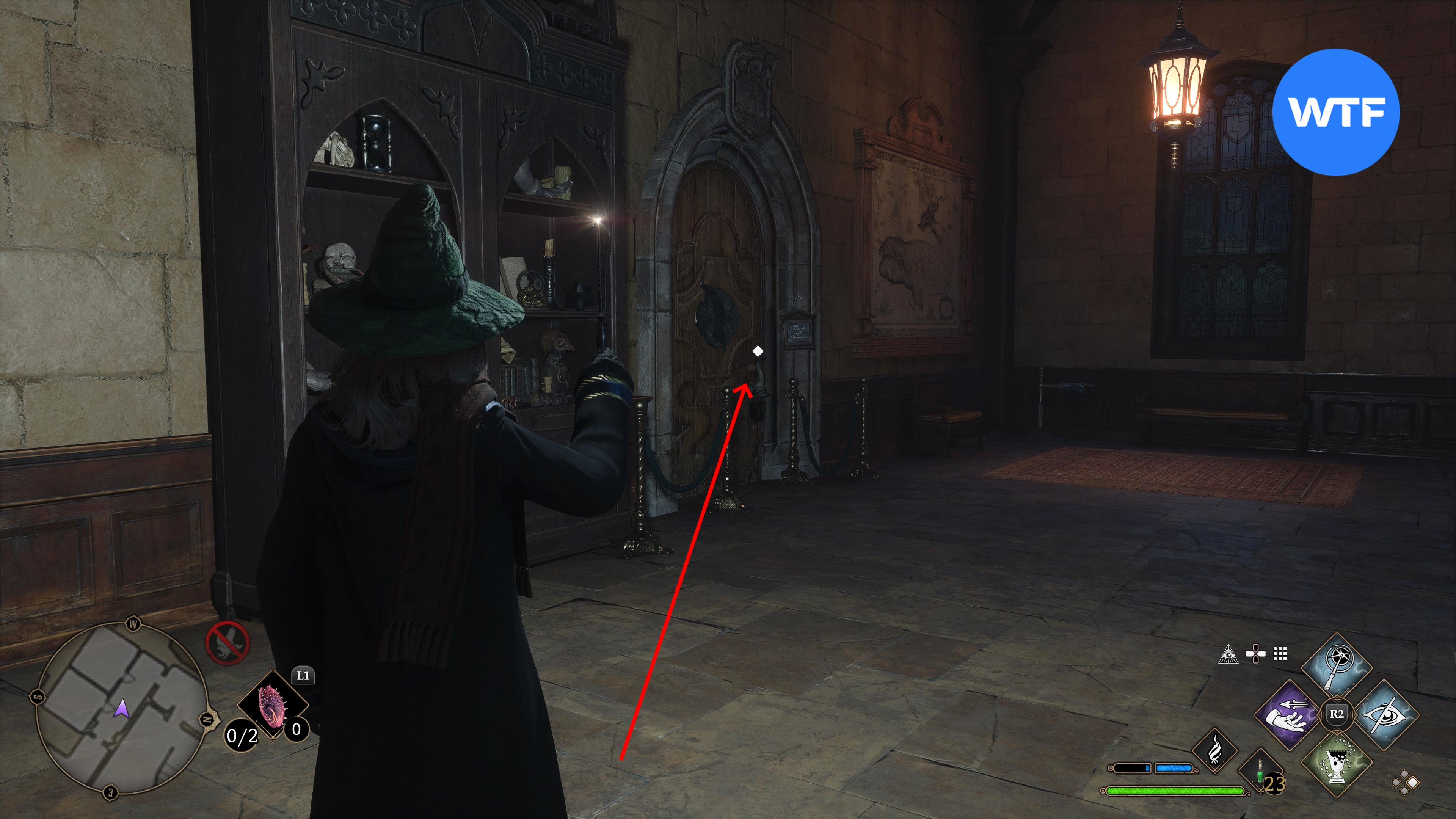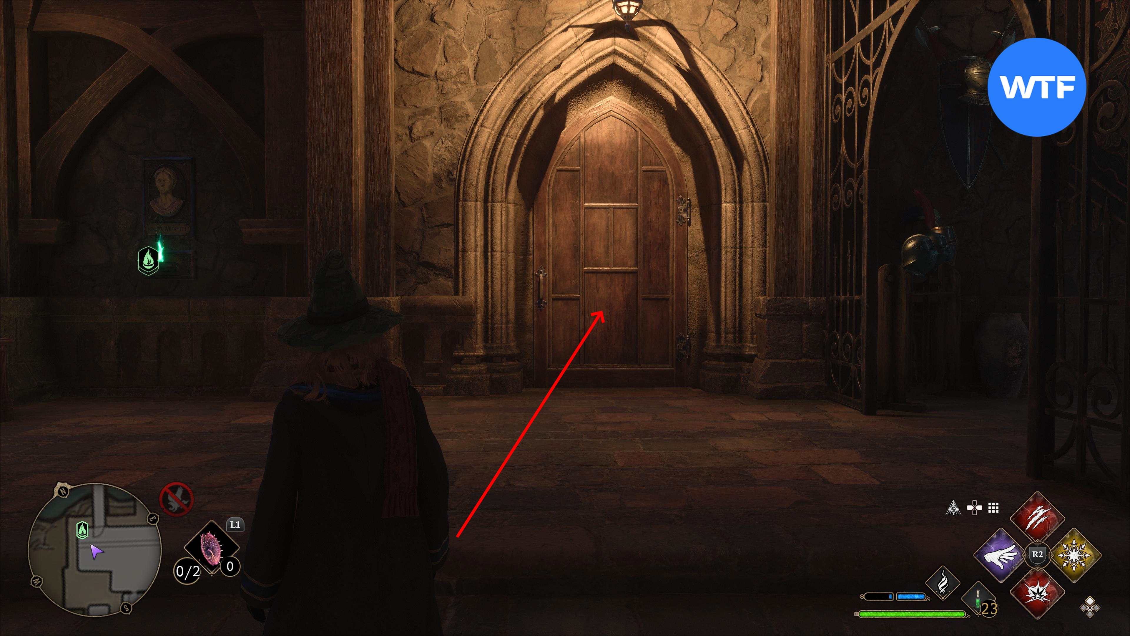 Станьте лицом к точке быстрого перемещения Двор трансфигурации в Астрономическом крыле и пройдите в дверь слева от неё. Сразу после этого посмотрите направо, чтобы увидеть еще одну дверь с замком 2 уровня. Статуэтка с луной стоит прямо за ней.