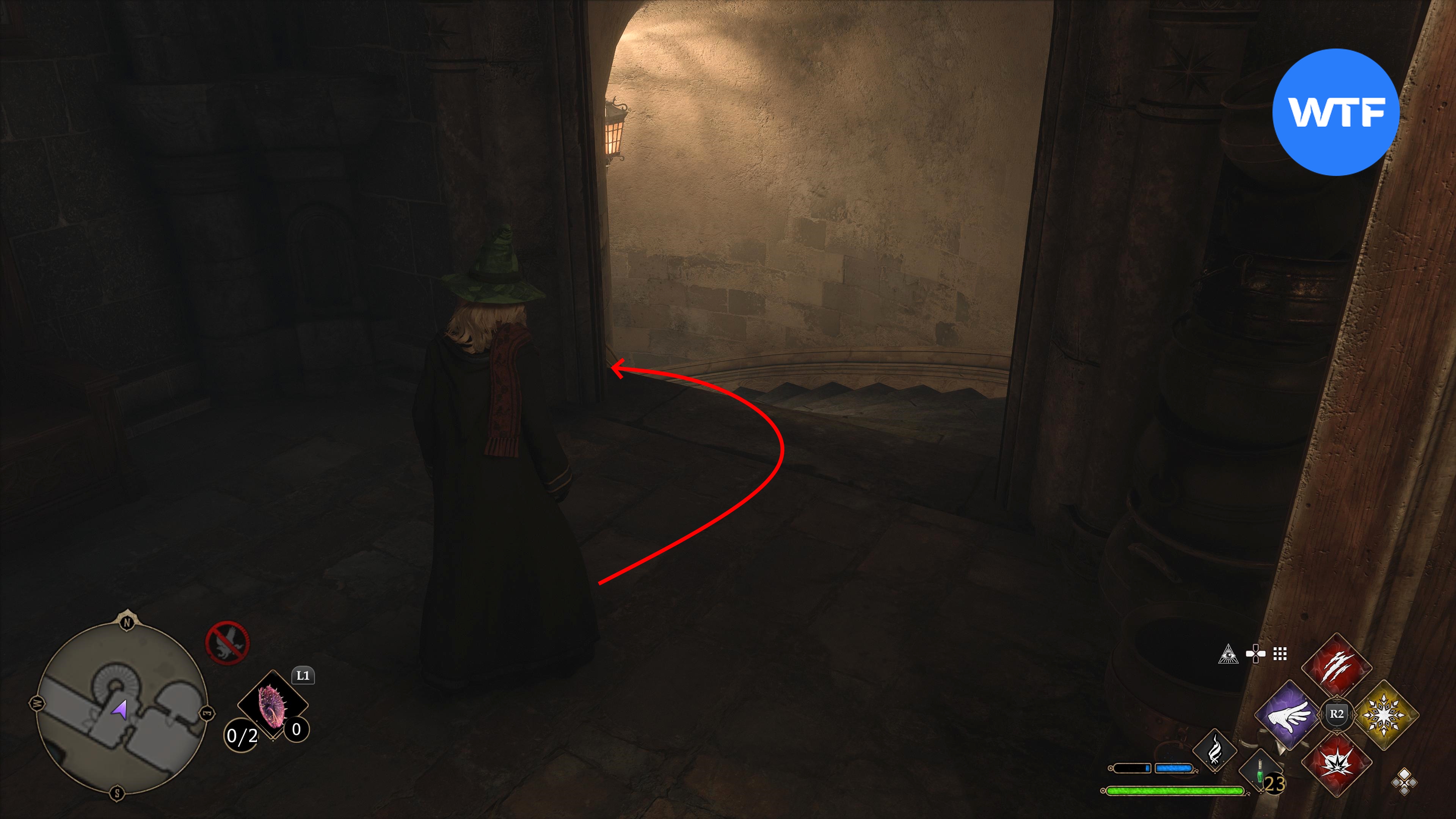 Переместитесь к Северному выходу из Хогвартса в Крыле колокольной башни. От места появления развернитесь и идите вдоль левой стены, пока не увидите лестницу. Под ней есть комната, дверь в которую заперта на замок 1 уровня. Статуэтка демимаски стоит внутри.