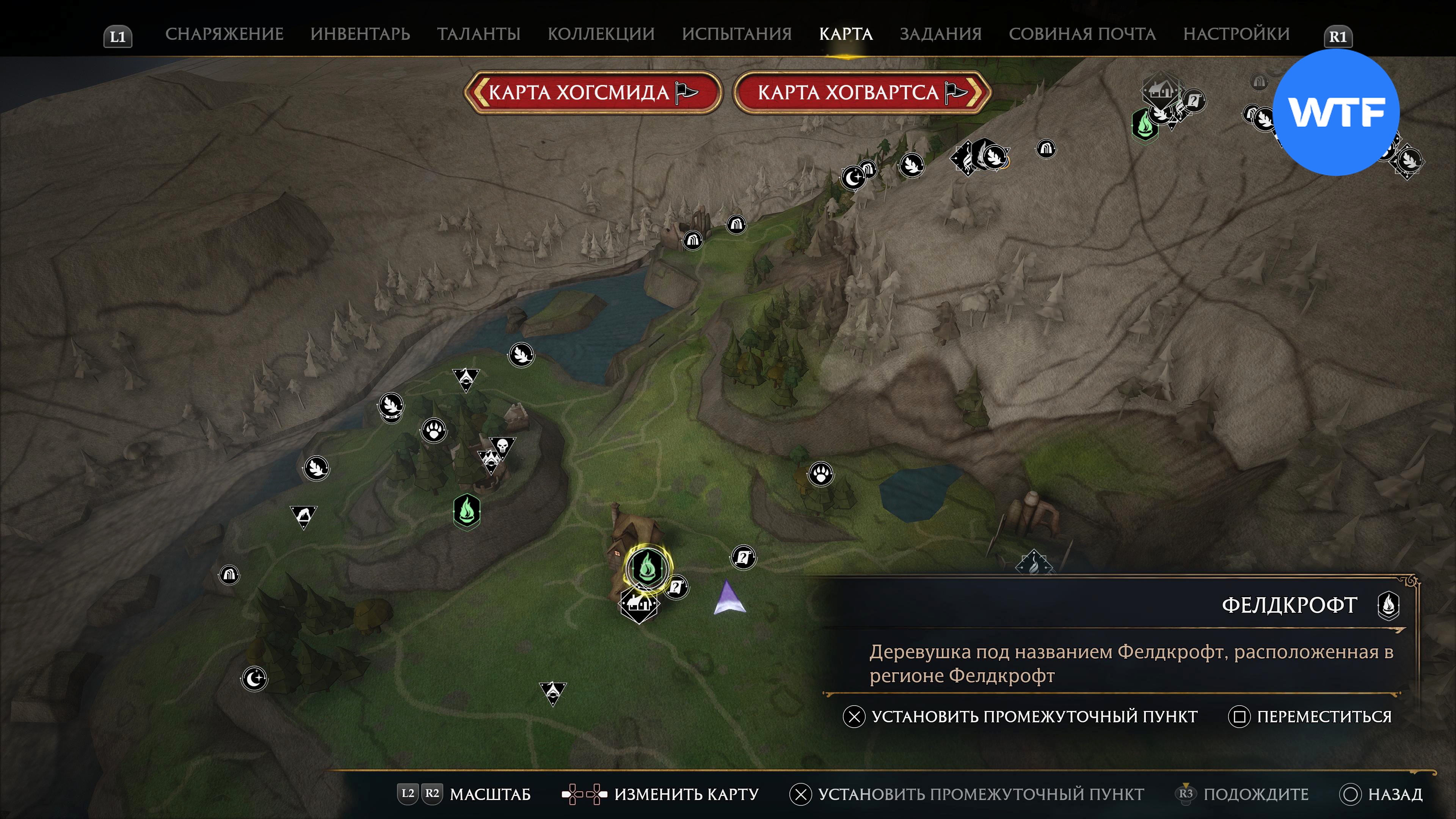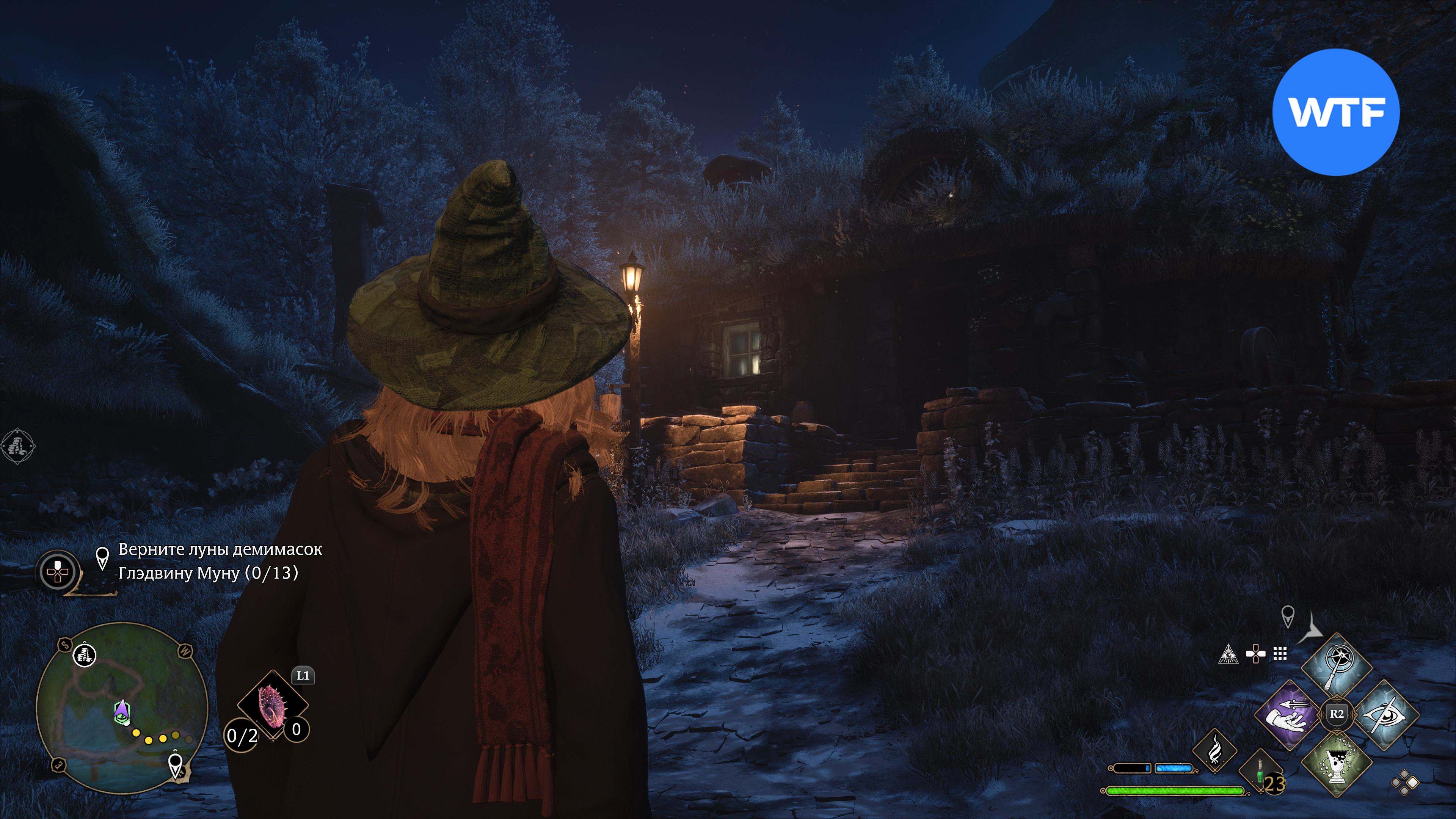 Деревня Фелдкрофт расположена к югу-западу от Хогвартса, в центральной части карты. Луну демимаски для Глэдвина Муна можно забрать в домике со светящимися окнами (см. скриншот 2).