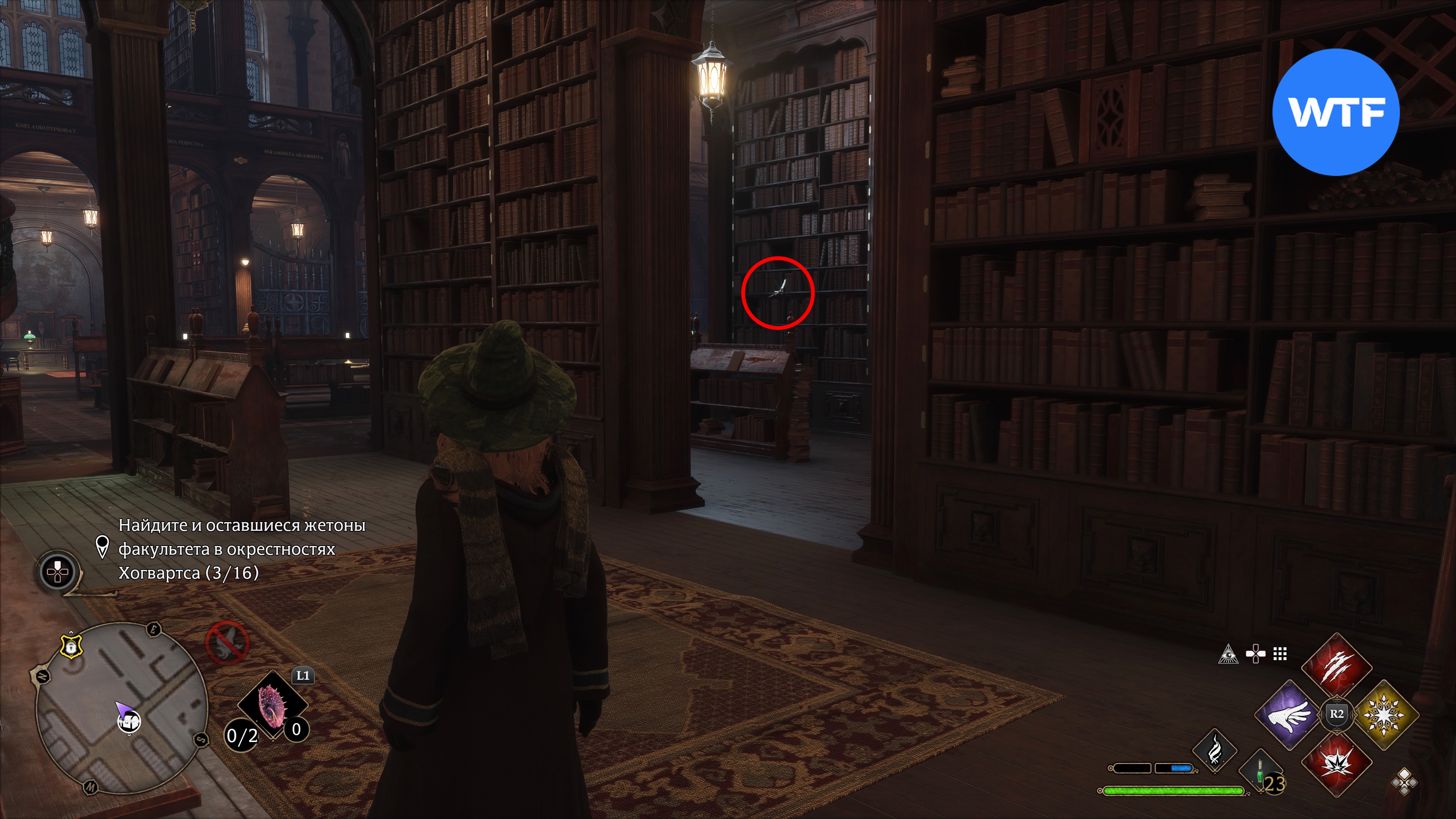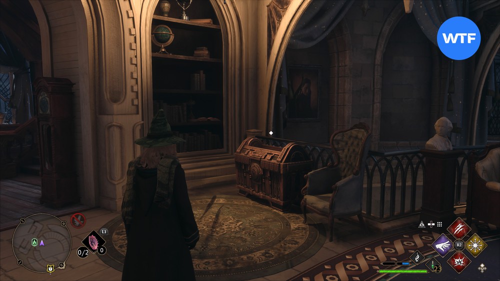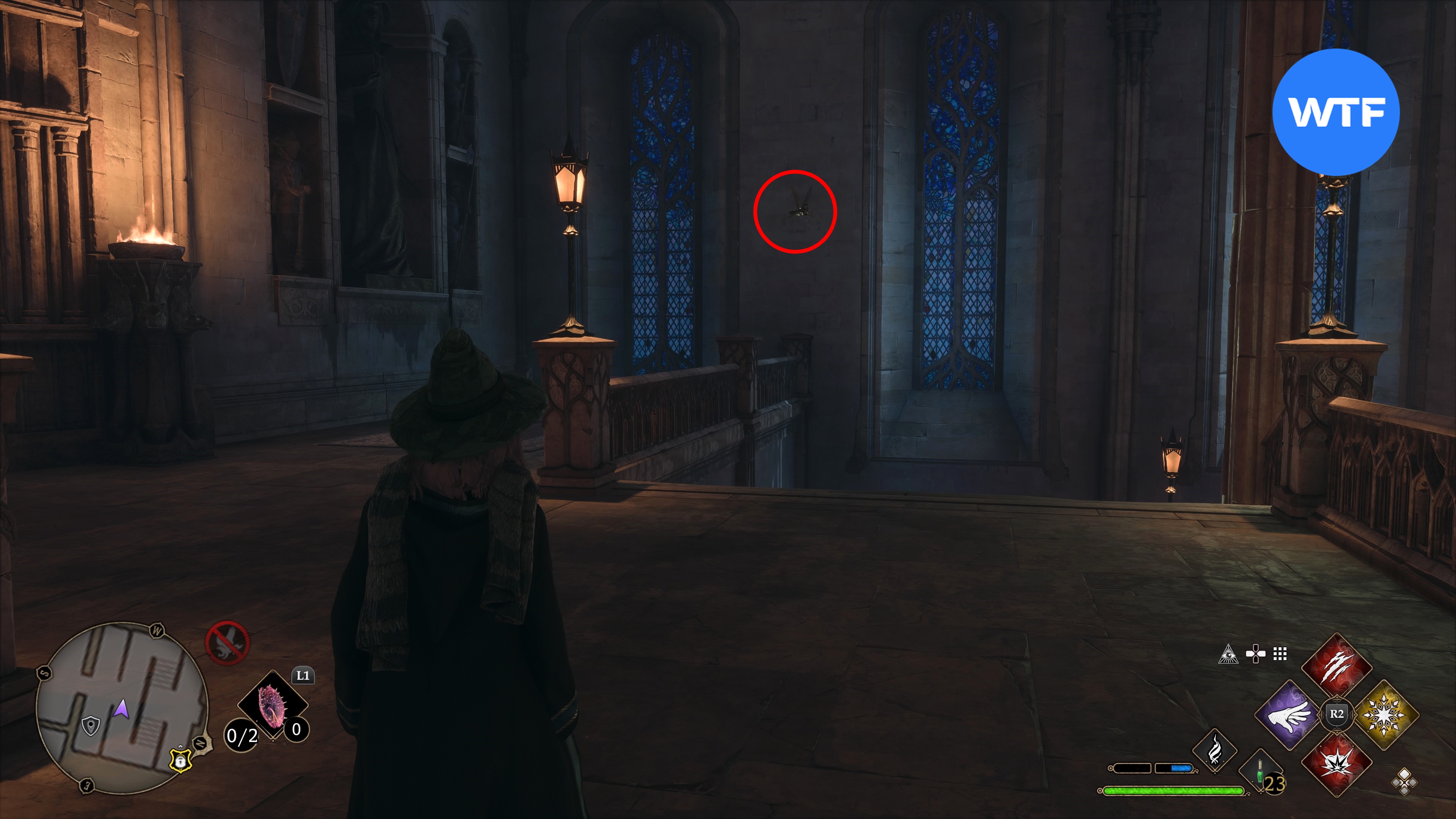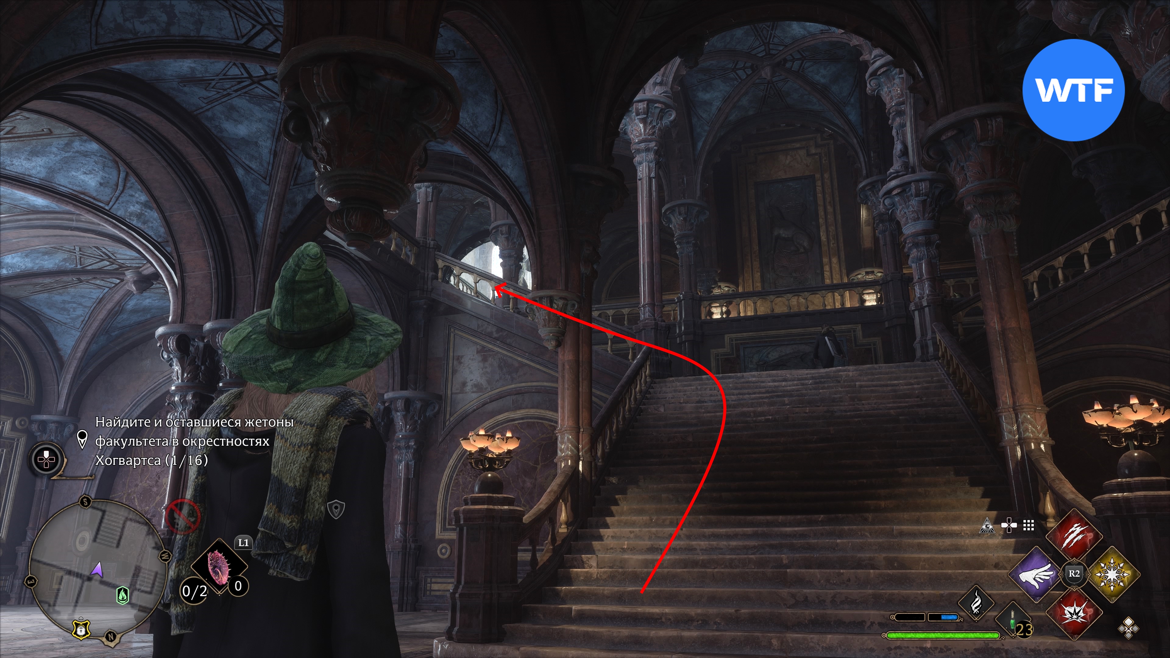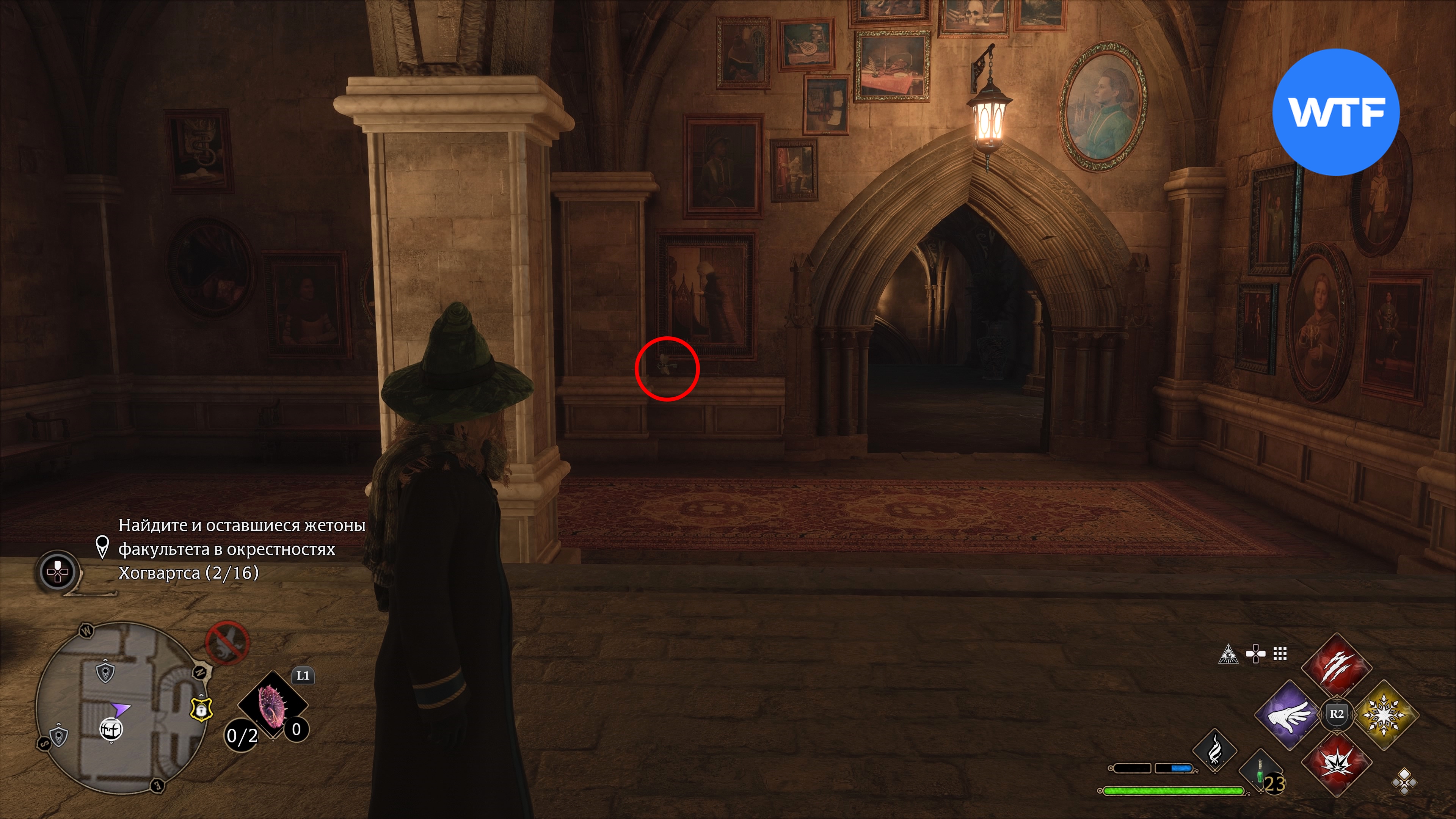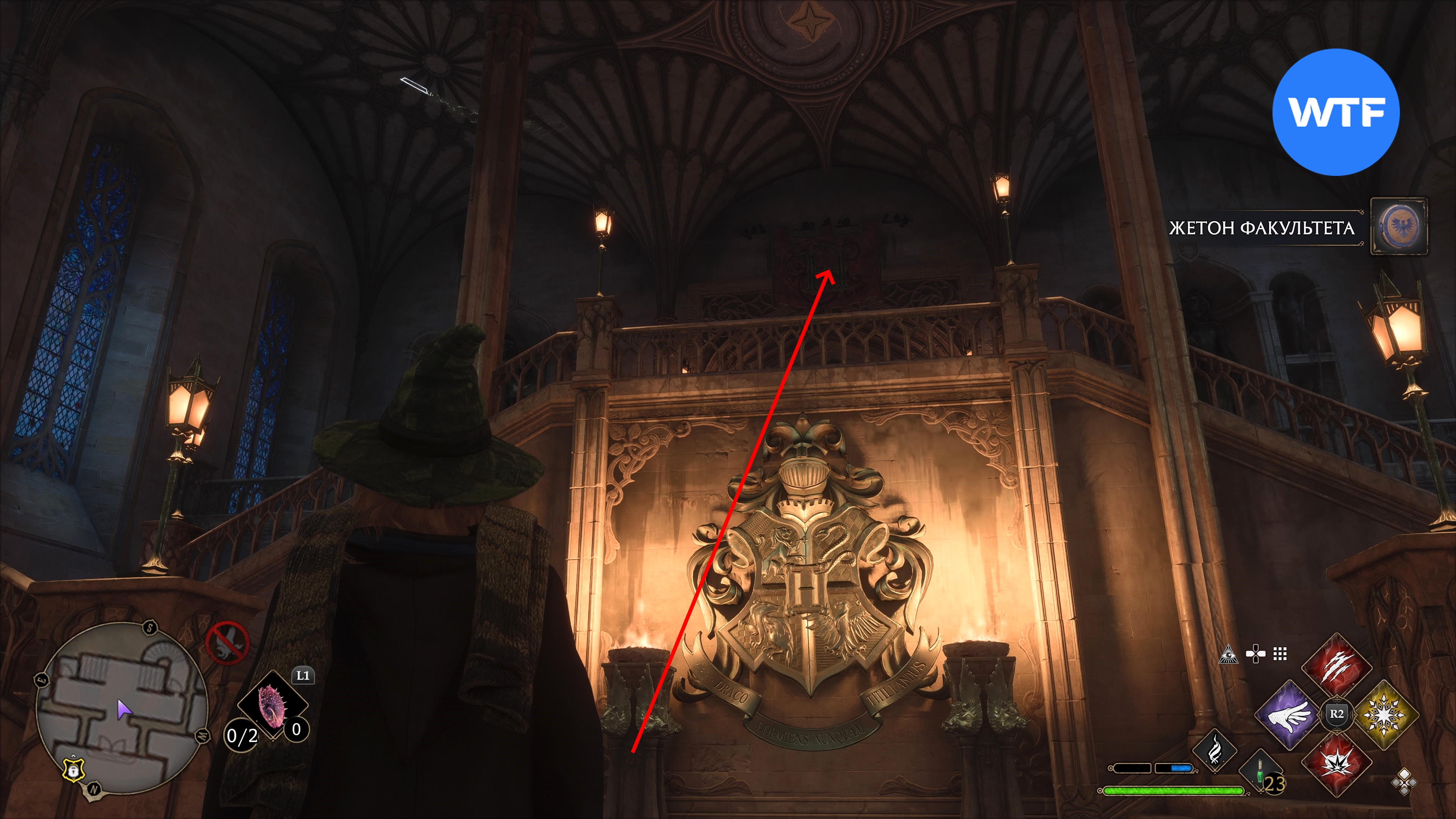 От точки появления пройдите через дверь прямо перед вами и посмотрите налево, чтобы увидеть хитроумный ключ, летающий возле лестницы. Она же приведет вас к шкафу факультета с жетоном, к которому летит ключ.