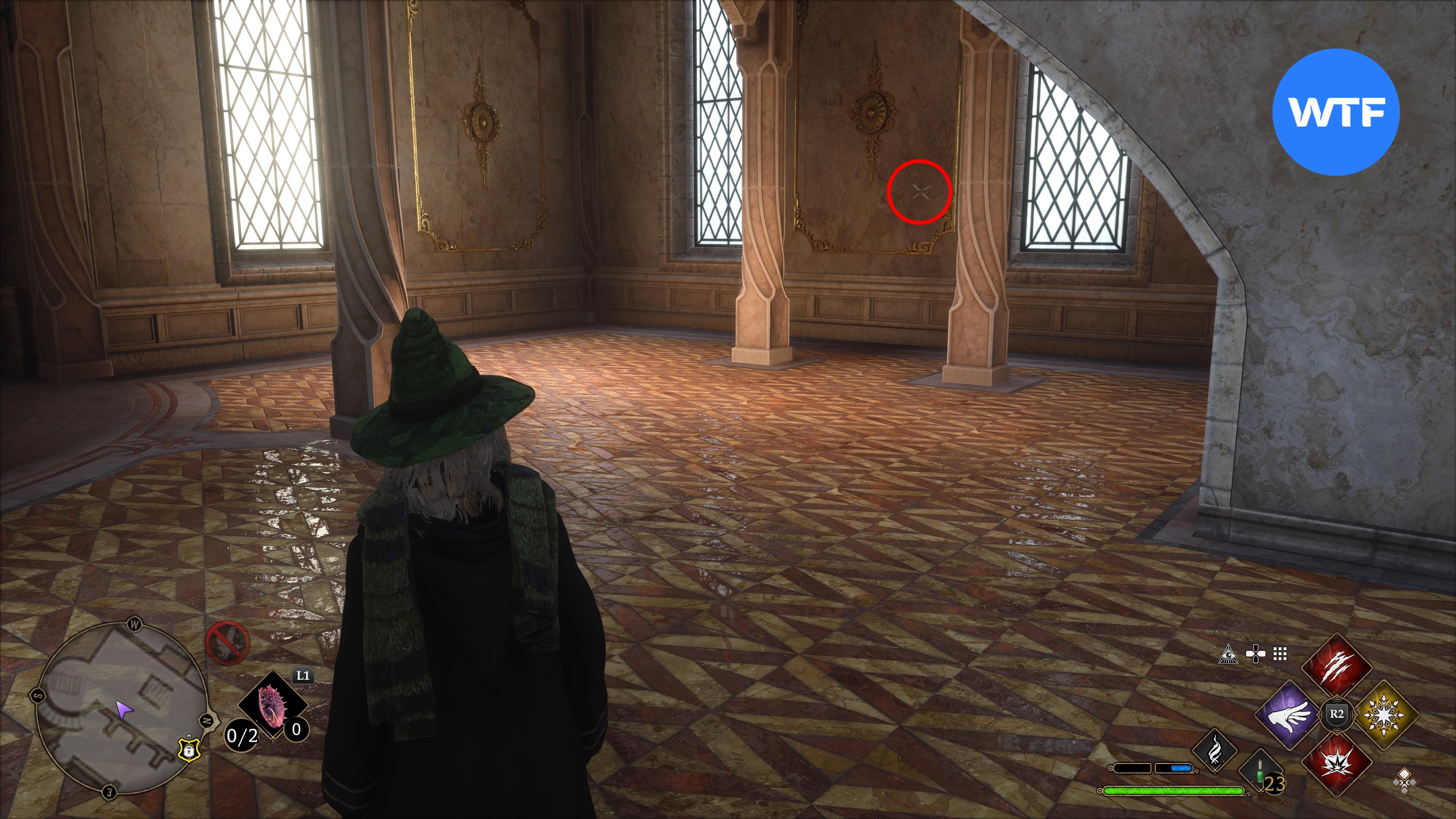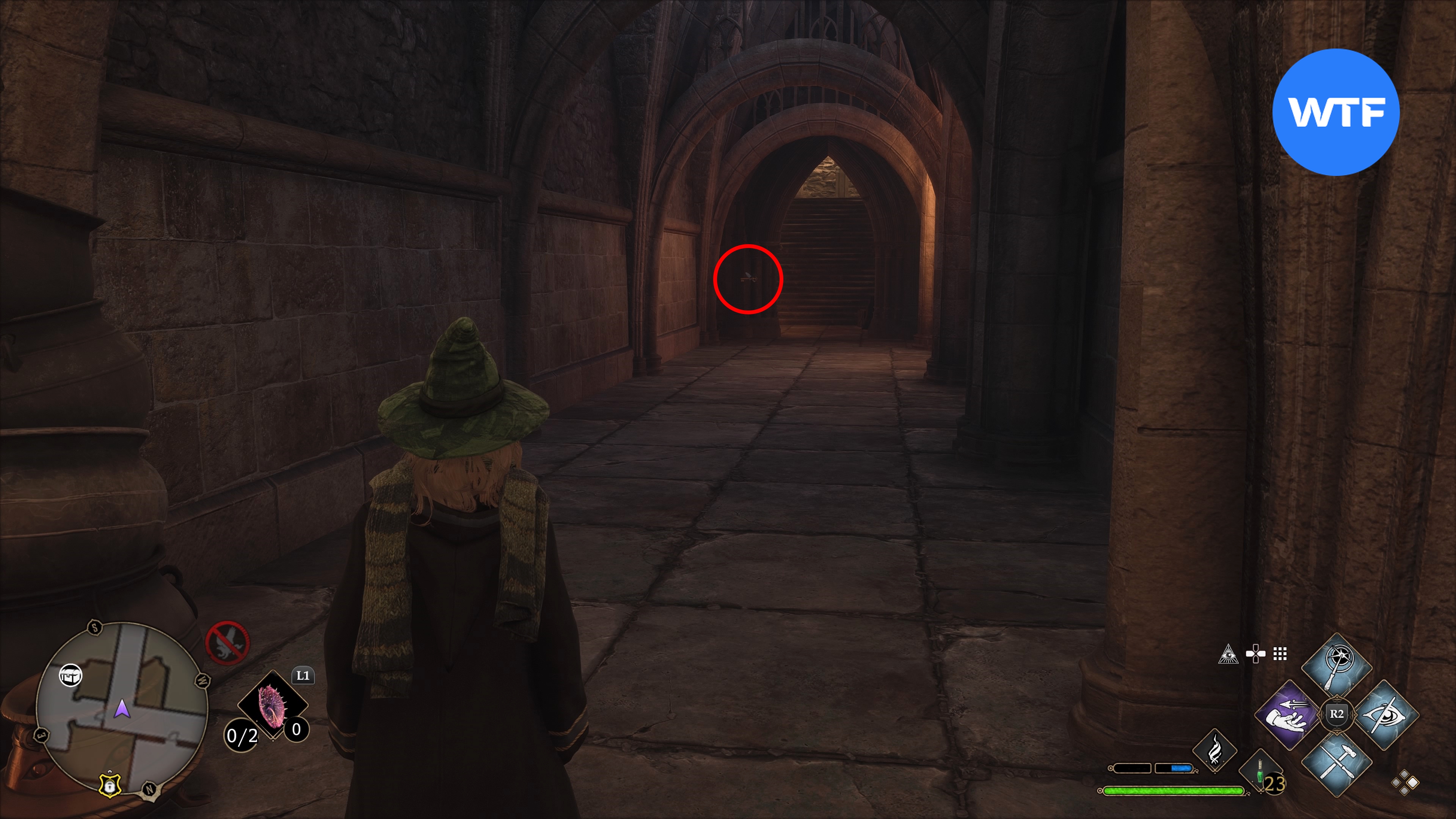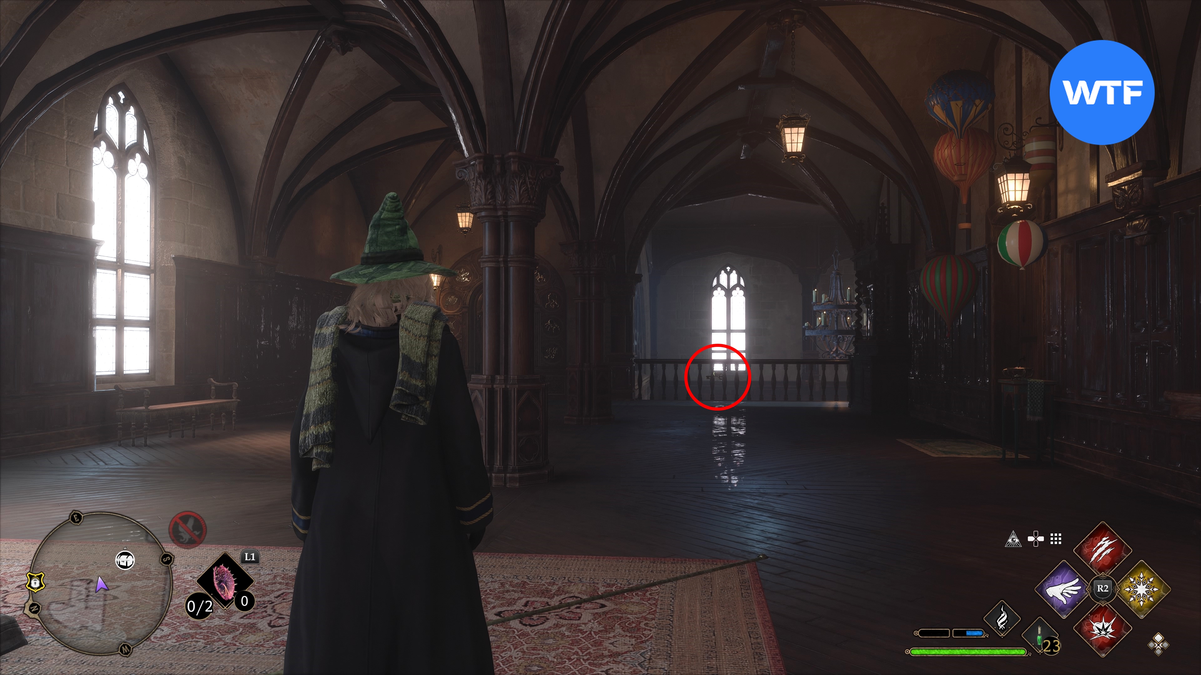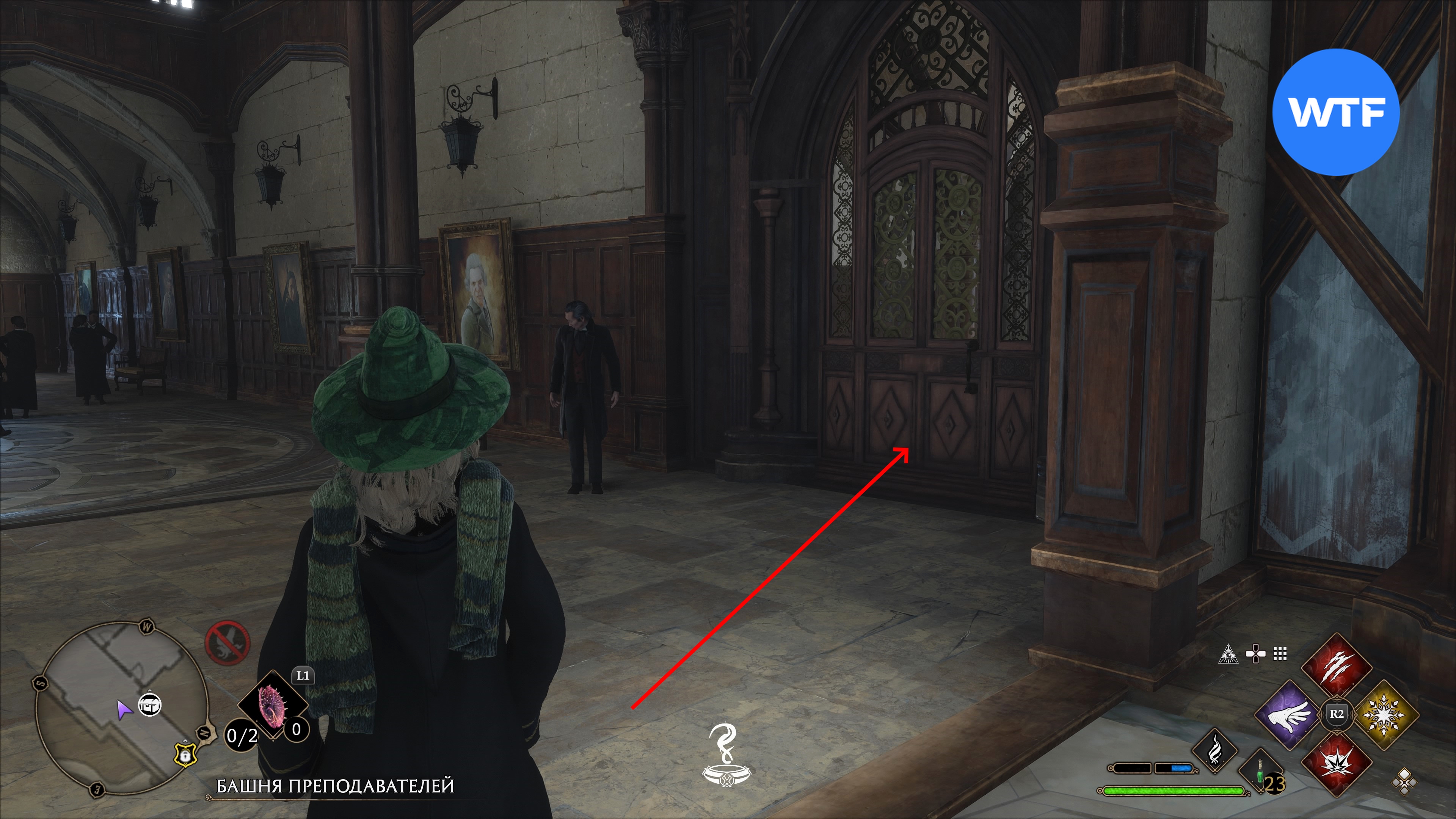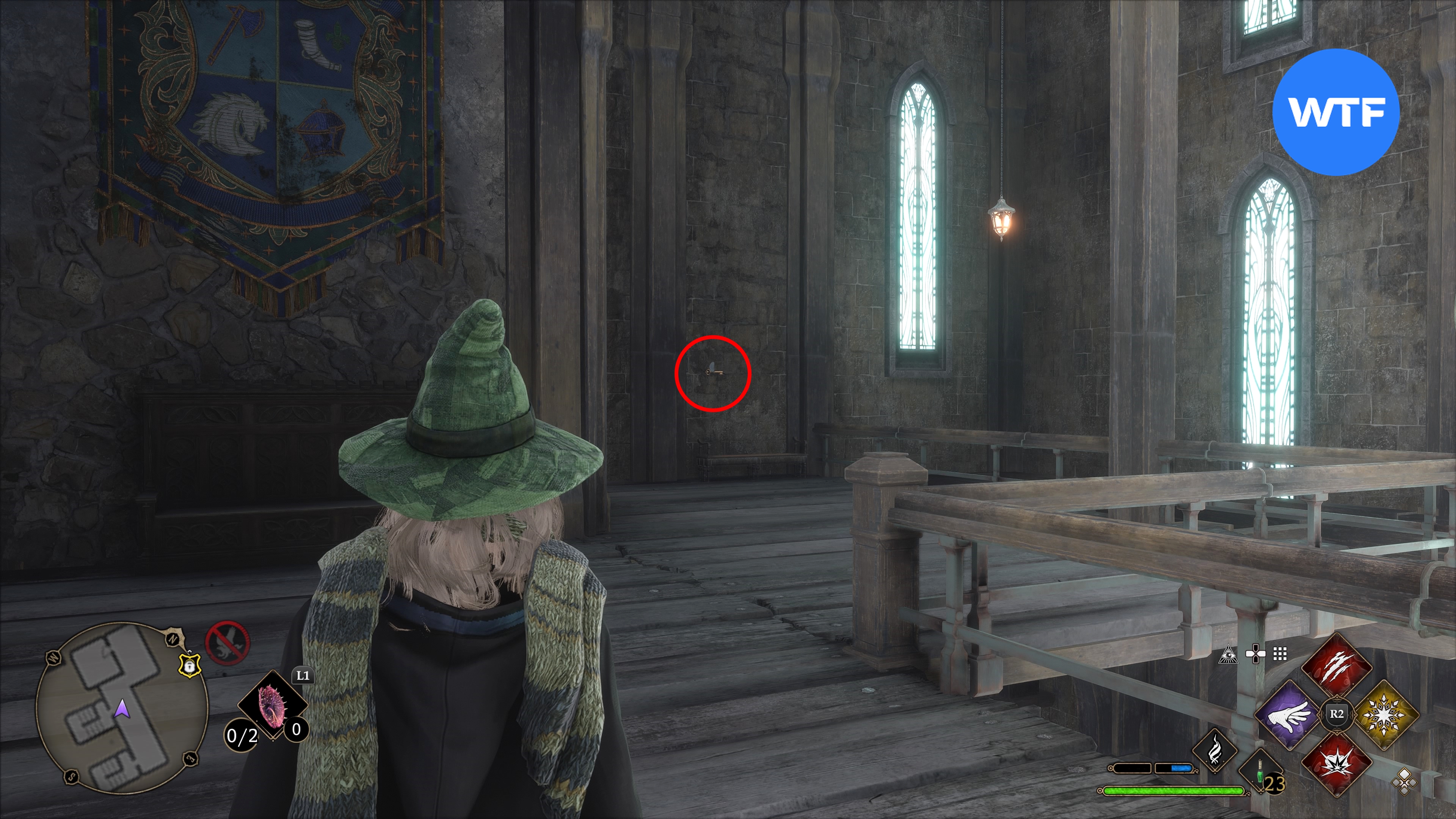 От точки появления пройдите через дверь прямо перед вами и посмотрите налево, чтобы увидеть хитроумный ключ, летающий возле лестницы. Она же приведет вас к шкафу факультета с жетоном, к которому летит ключ.