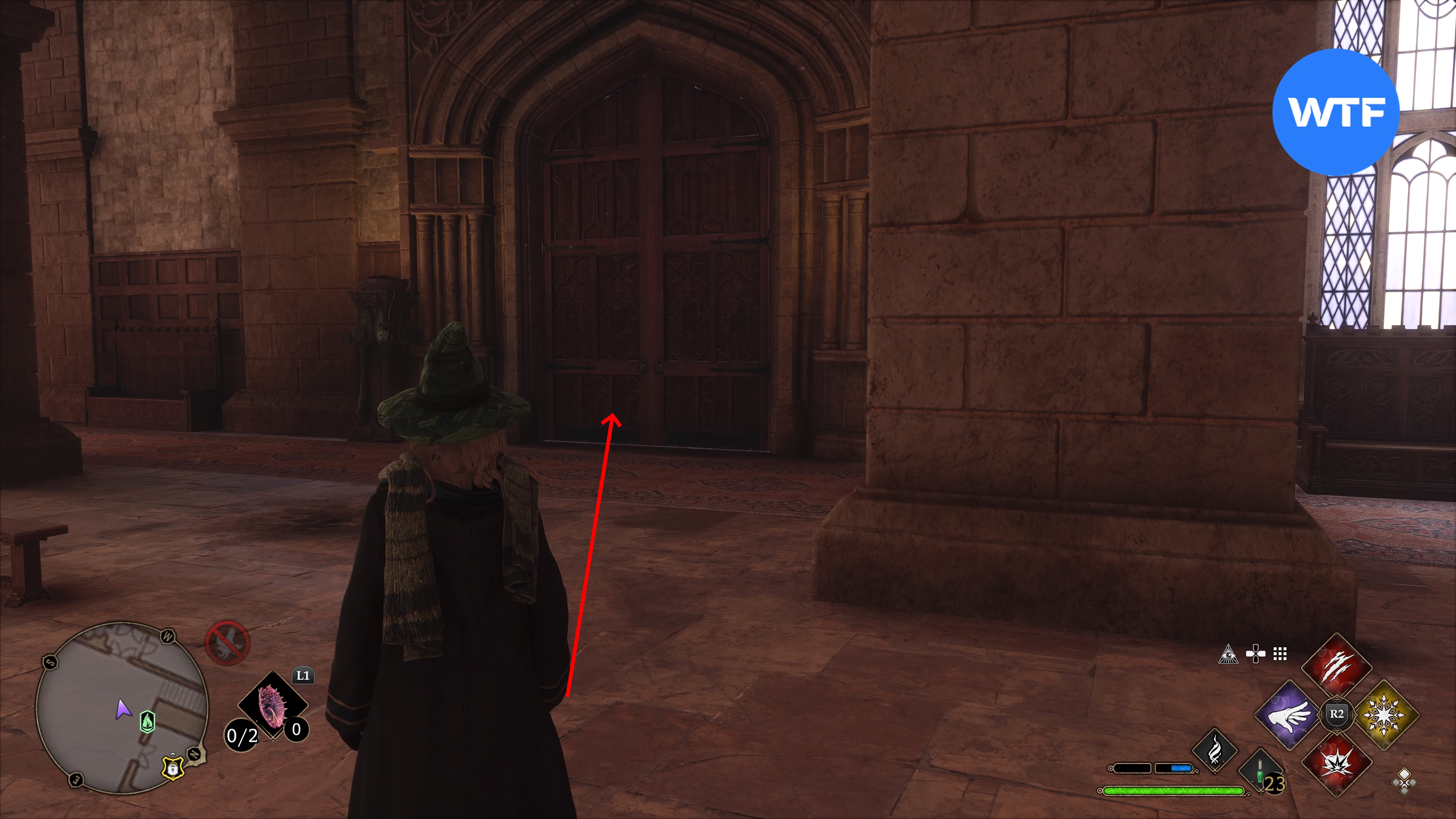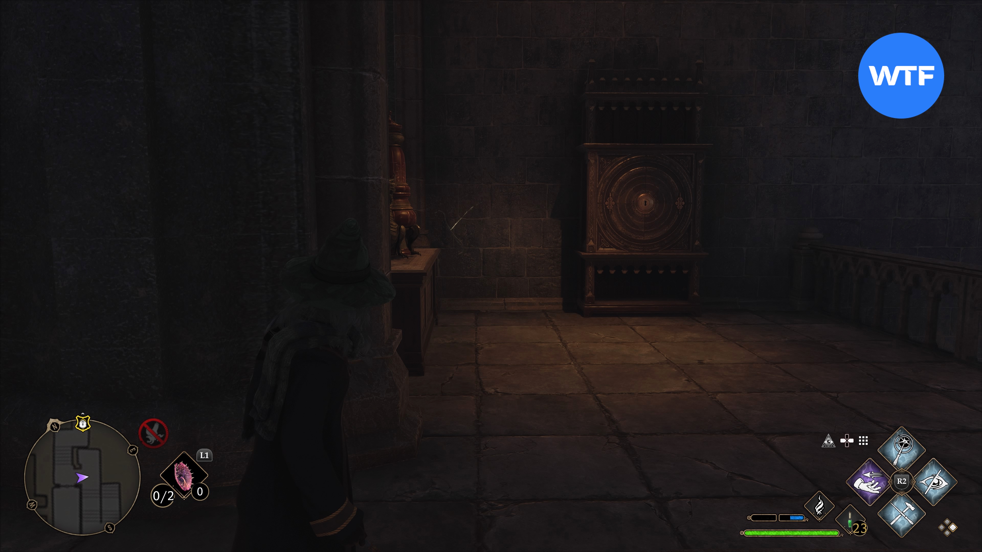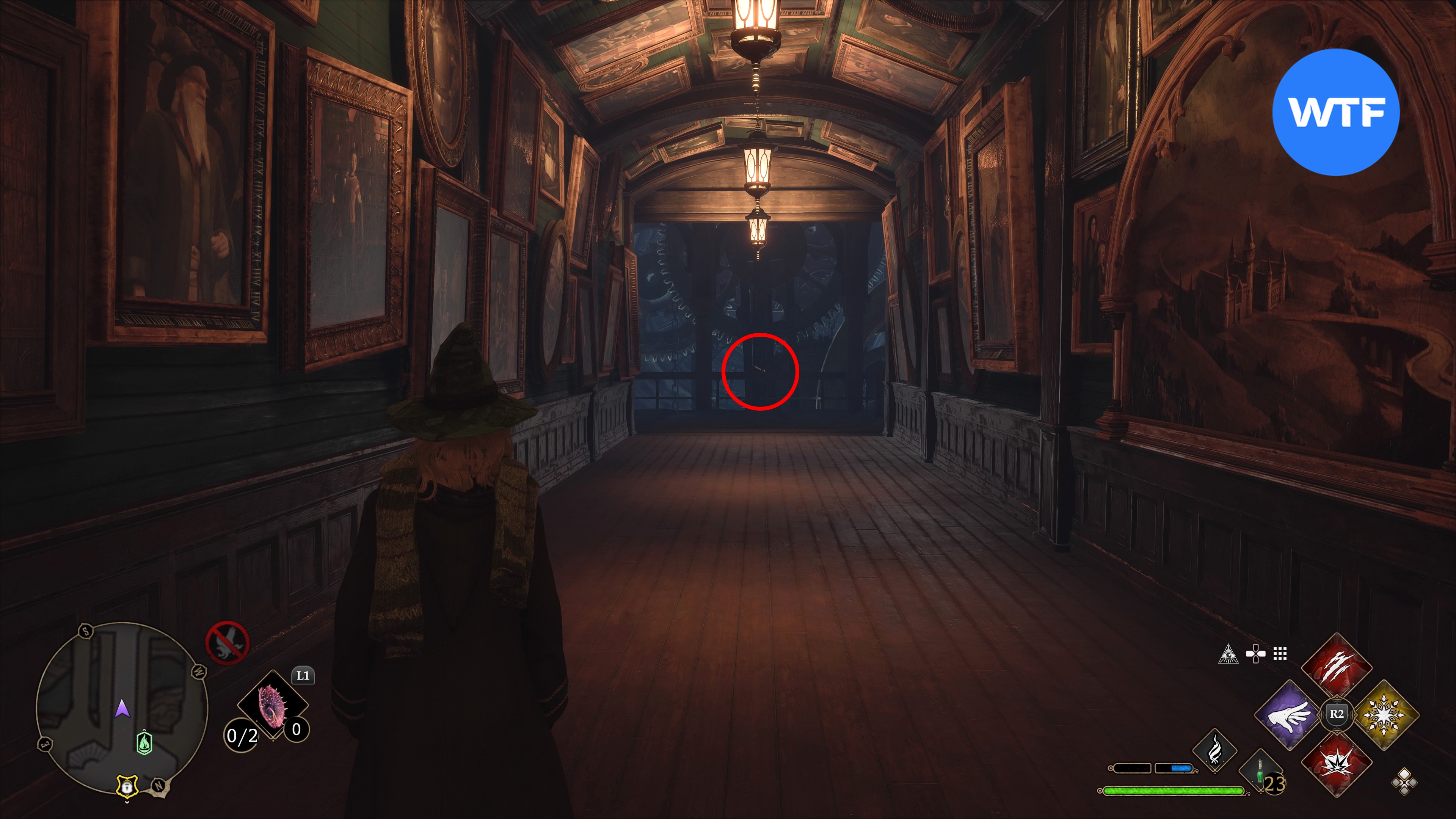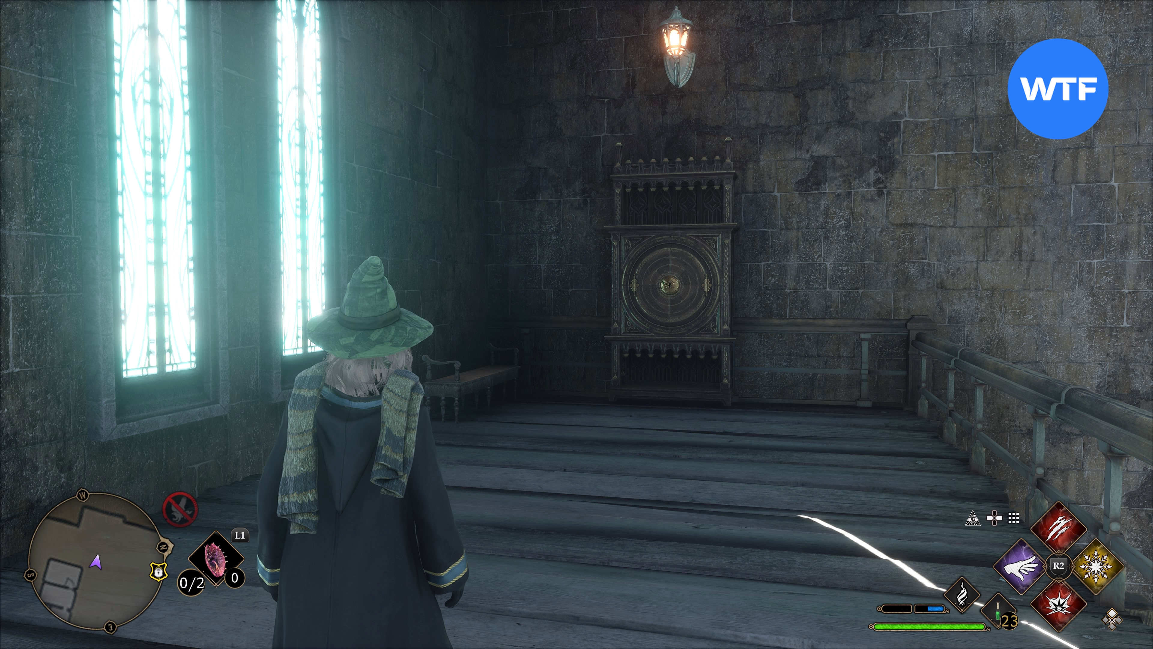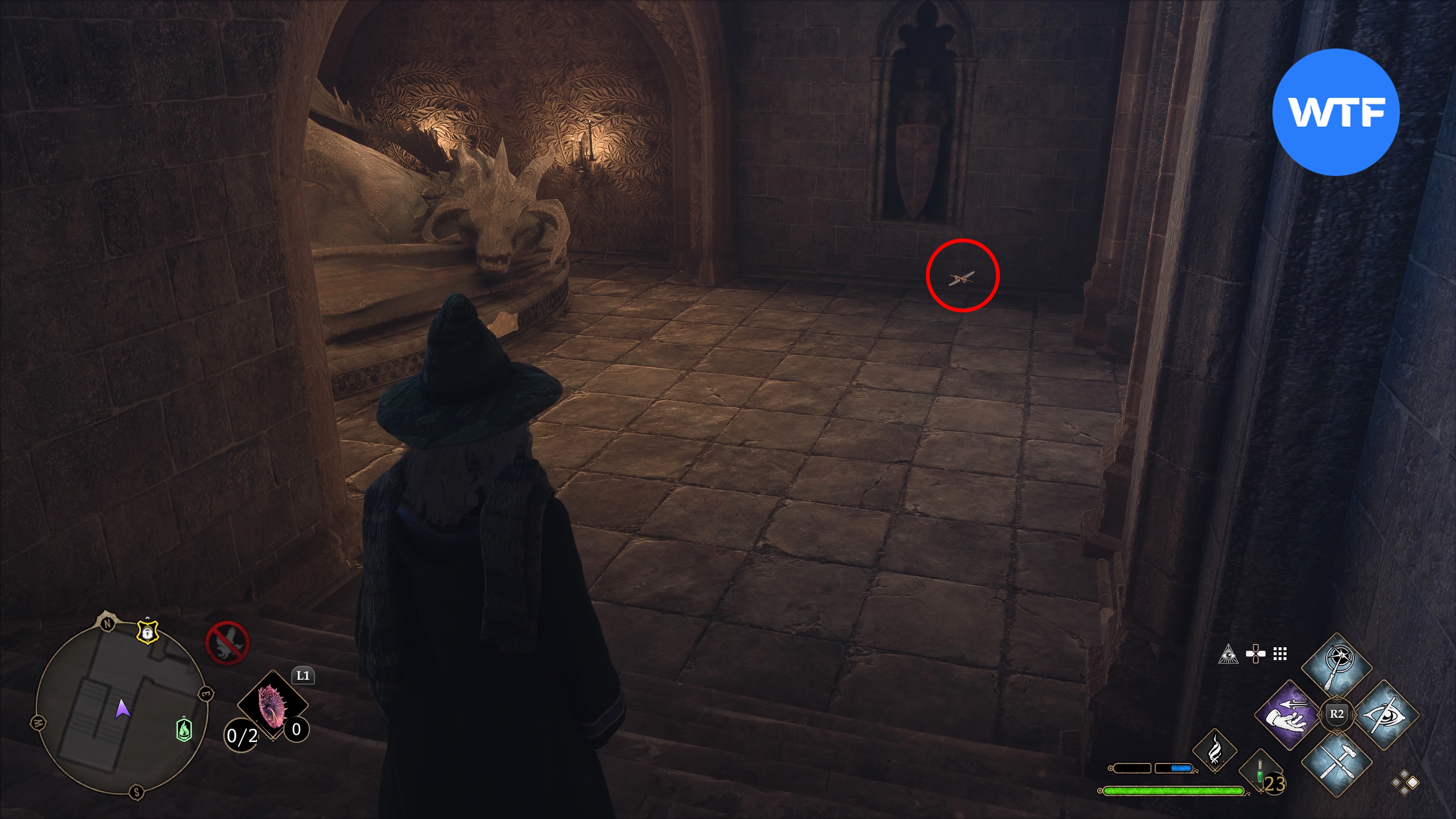 От точки появления пройдите через дверь прямо перед вами и посмотрите налево, чтобы увидеть хитроумный ключ, летающий возле лестницы. Она же приведет вас к шкафу факультета с жетоном, к которому летит ключ.