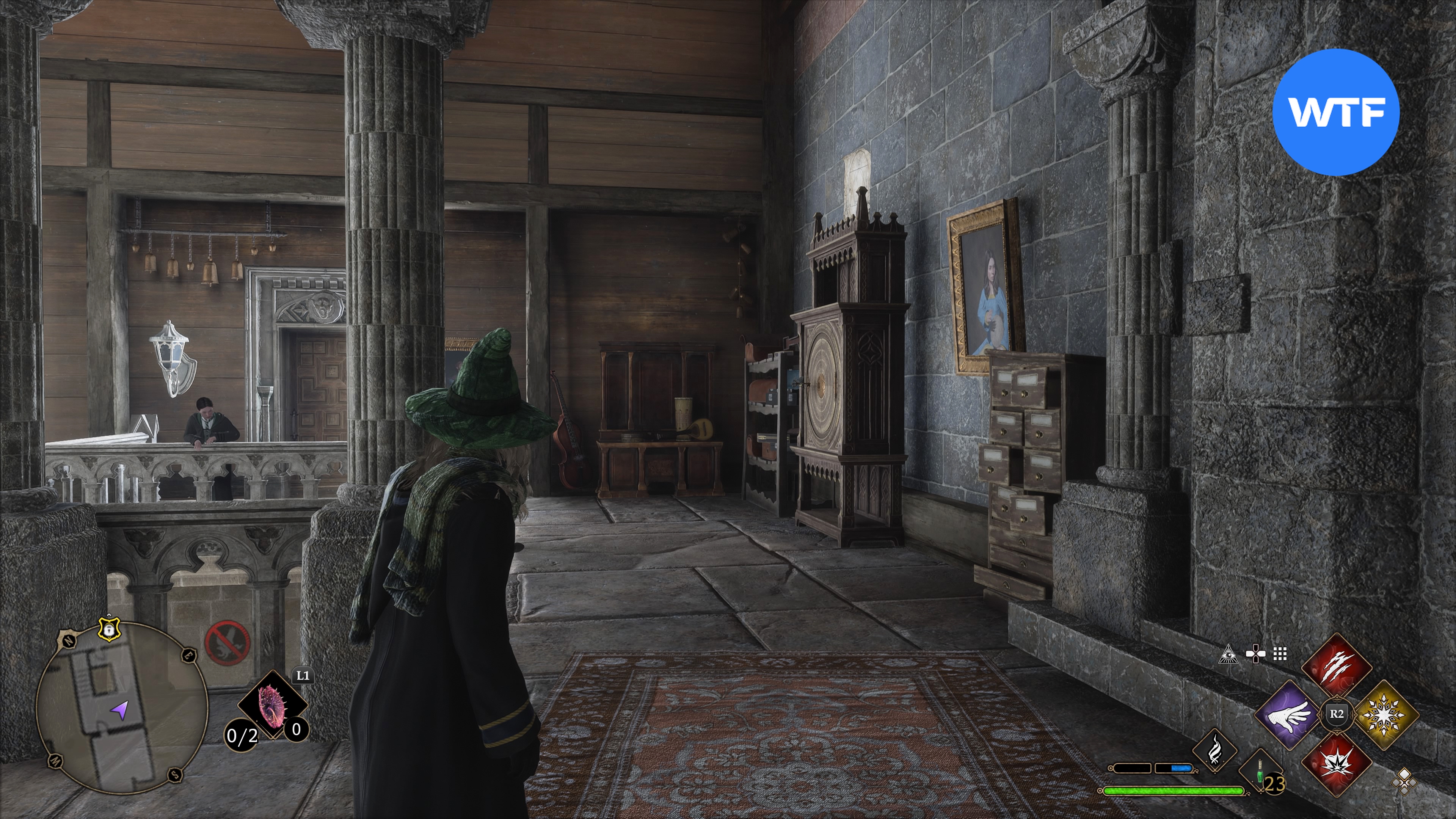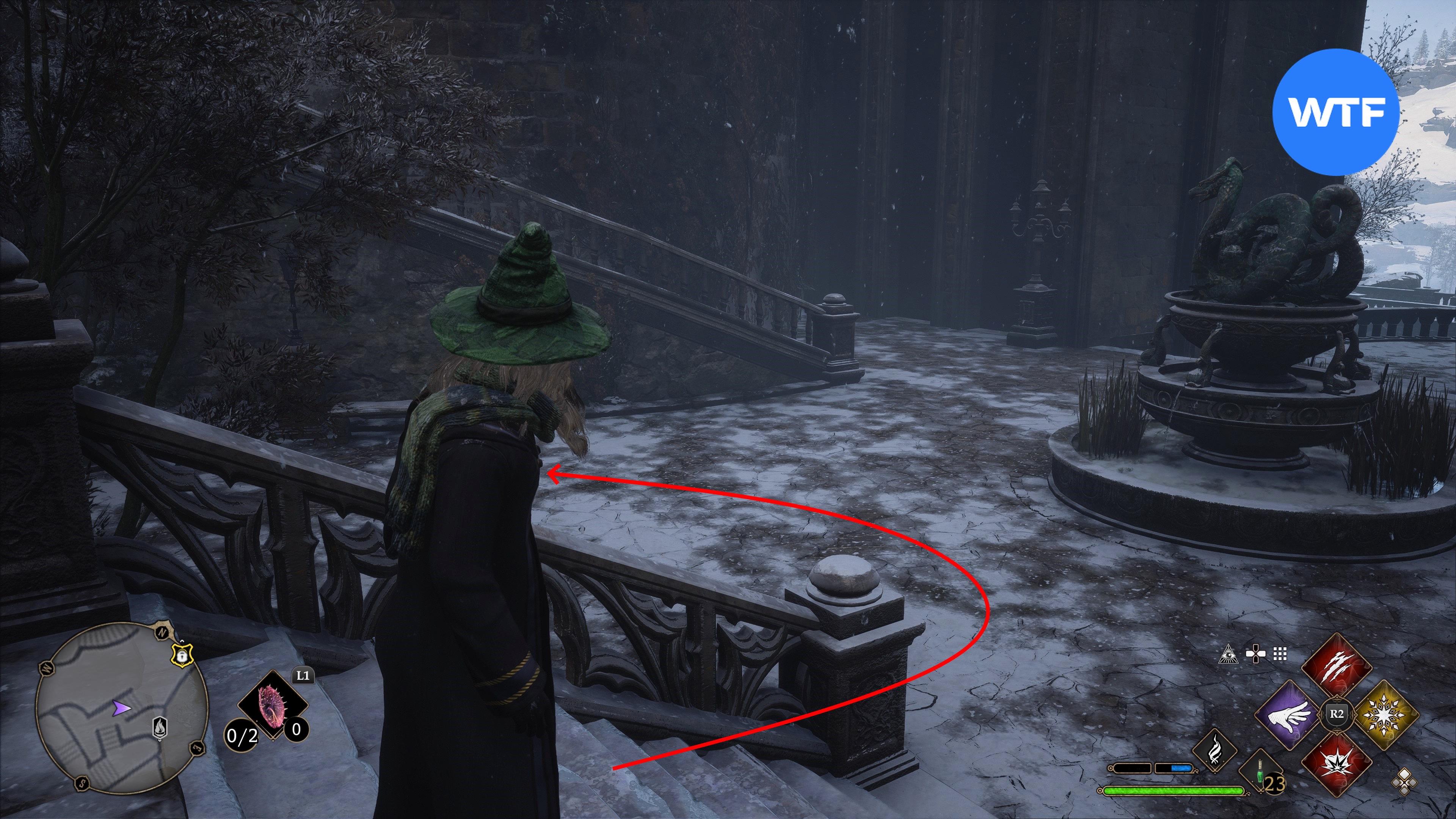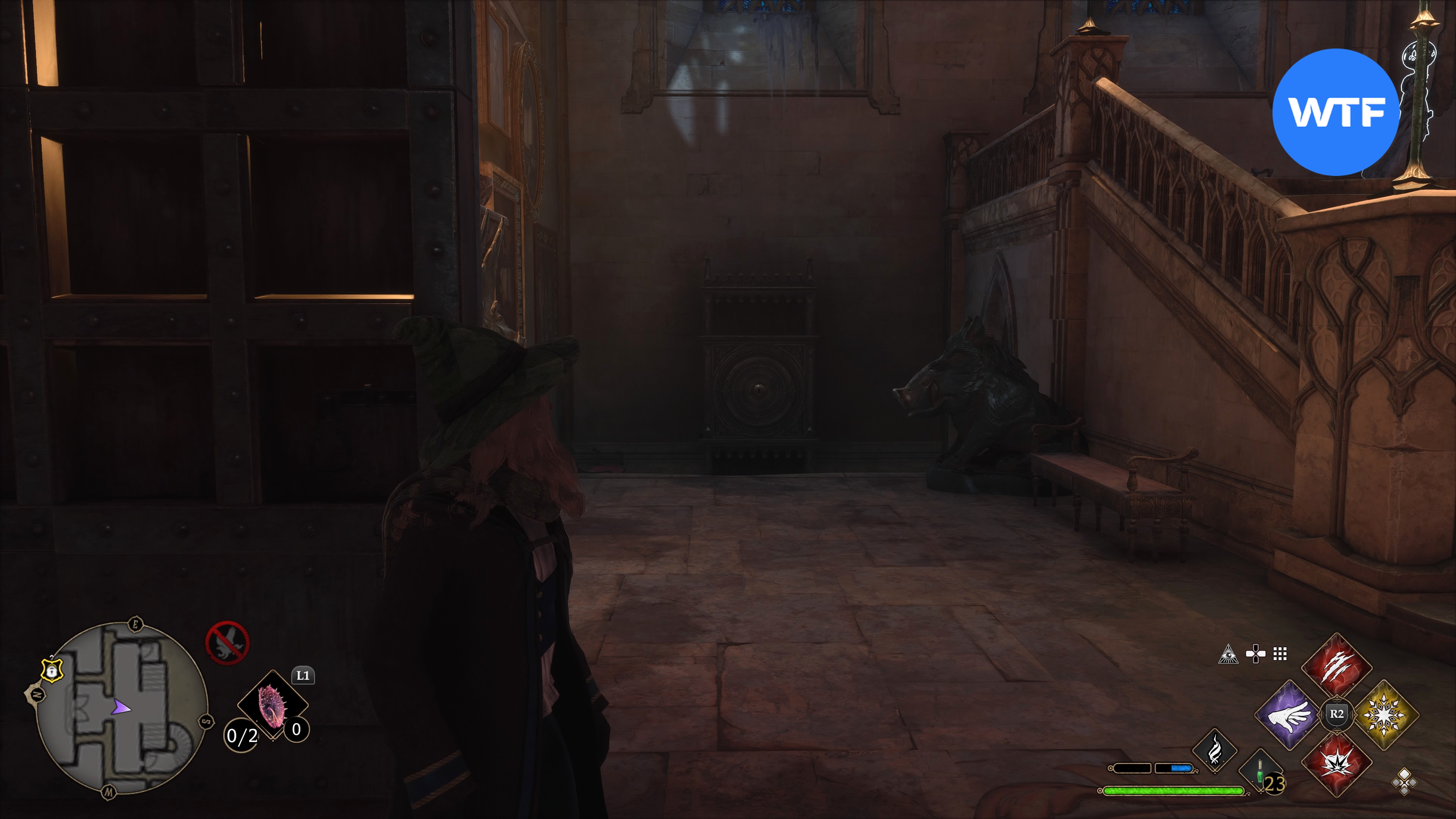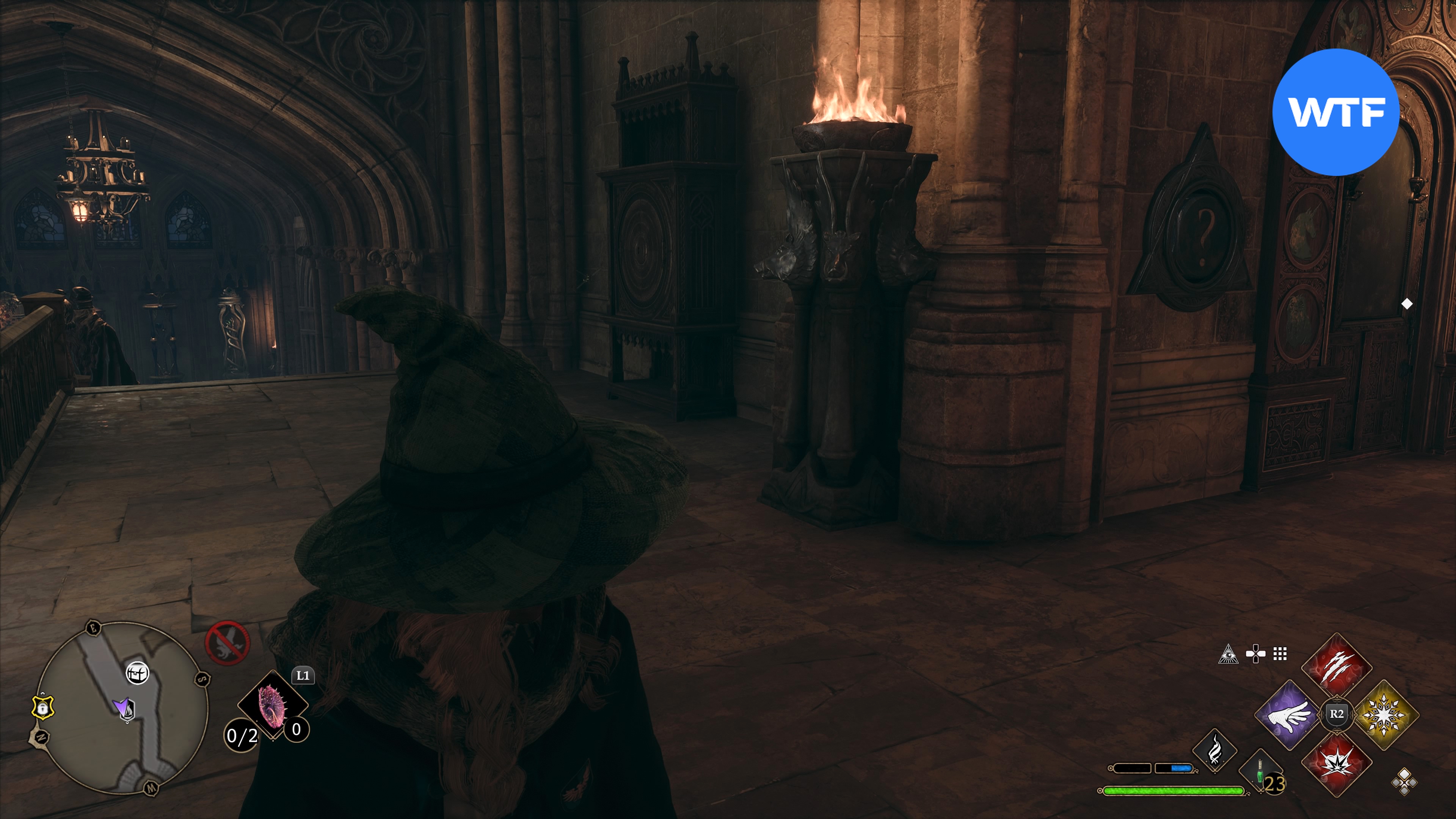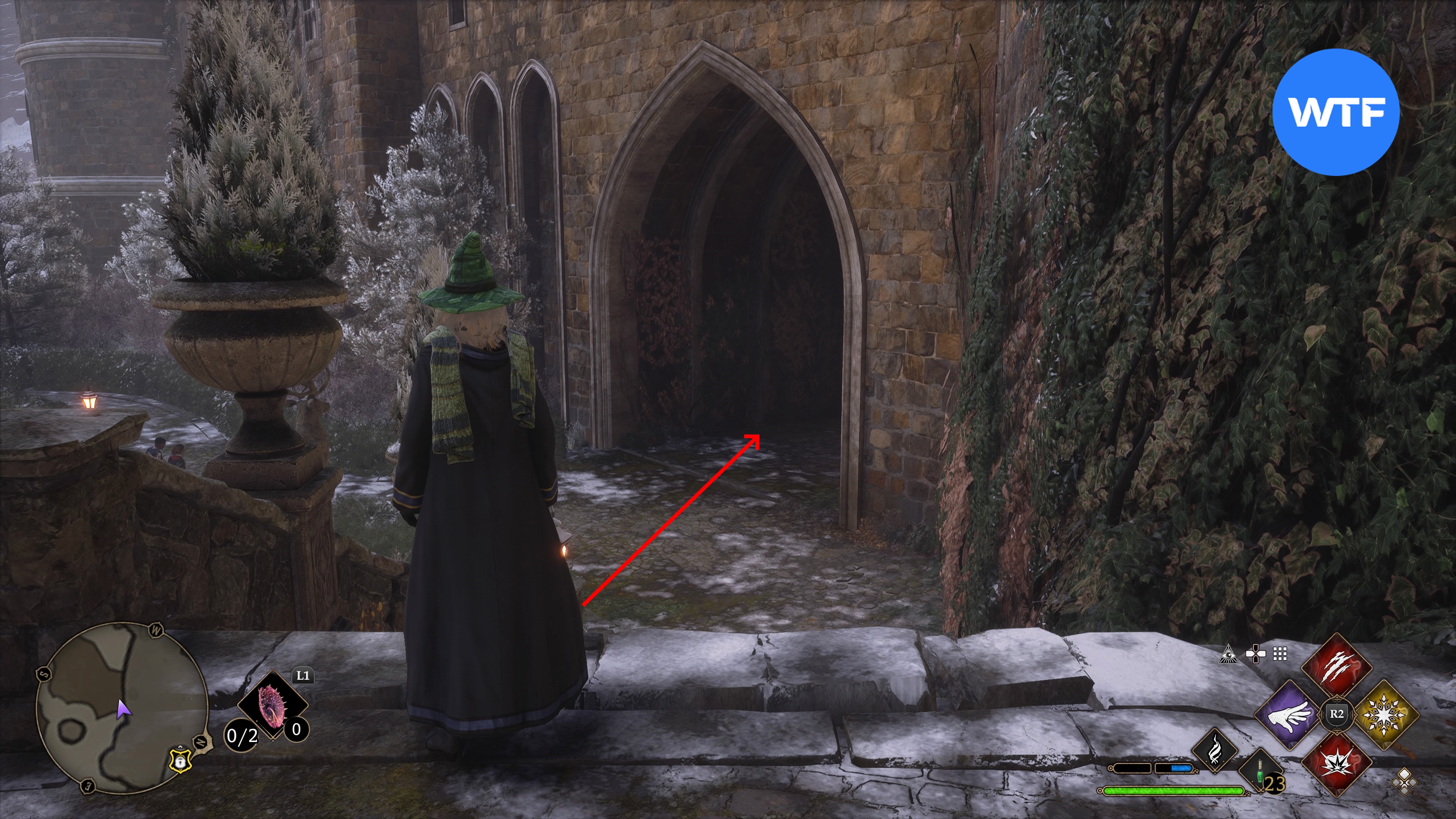 От точки появления пройдите через дверь прямо перед вами и посмотрите налево, чтобы увидеть хитроумный ключ, летающий возле лестницы. Она же приведет вас к шкафу факультета с жетоном, к которому летит ключ.