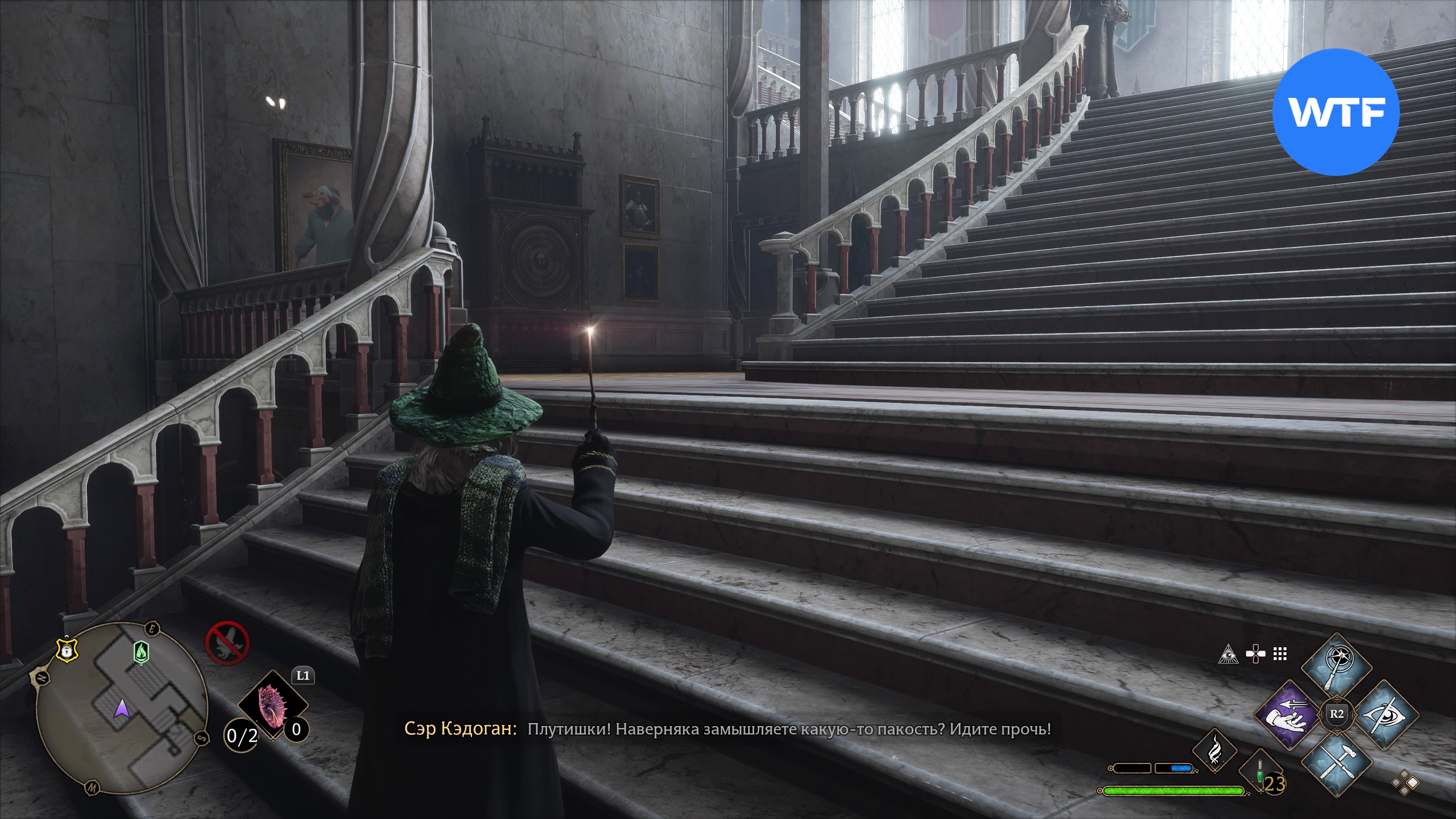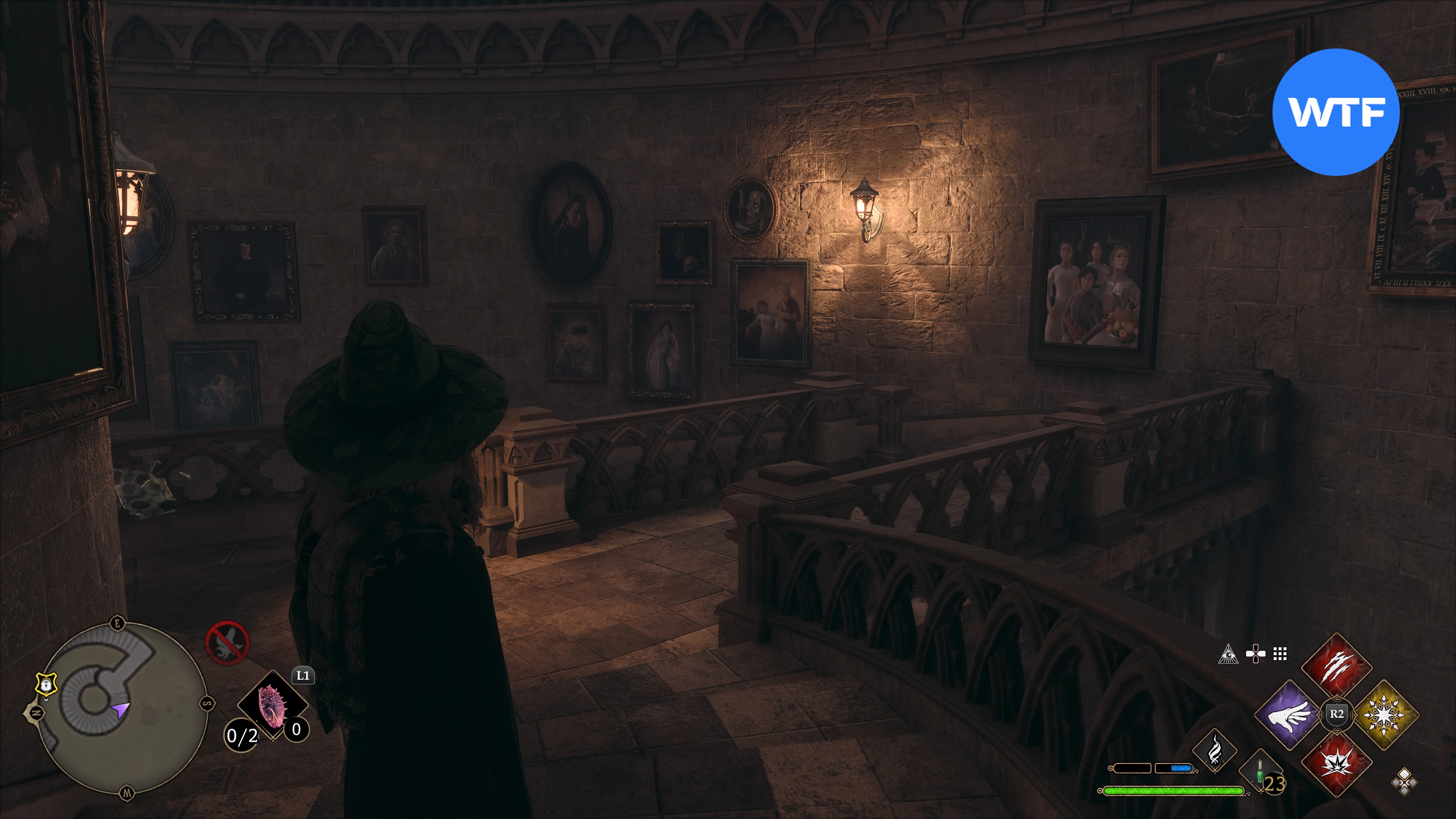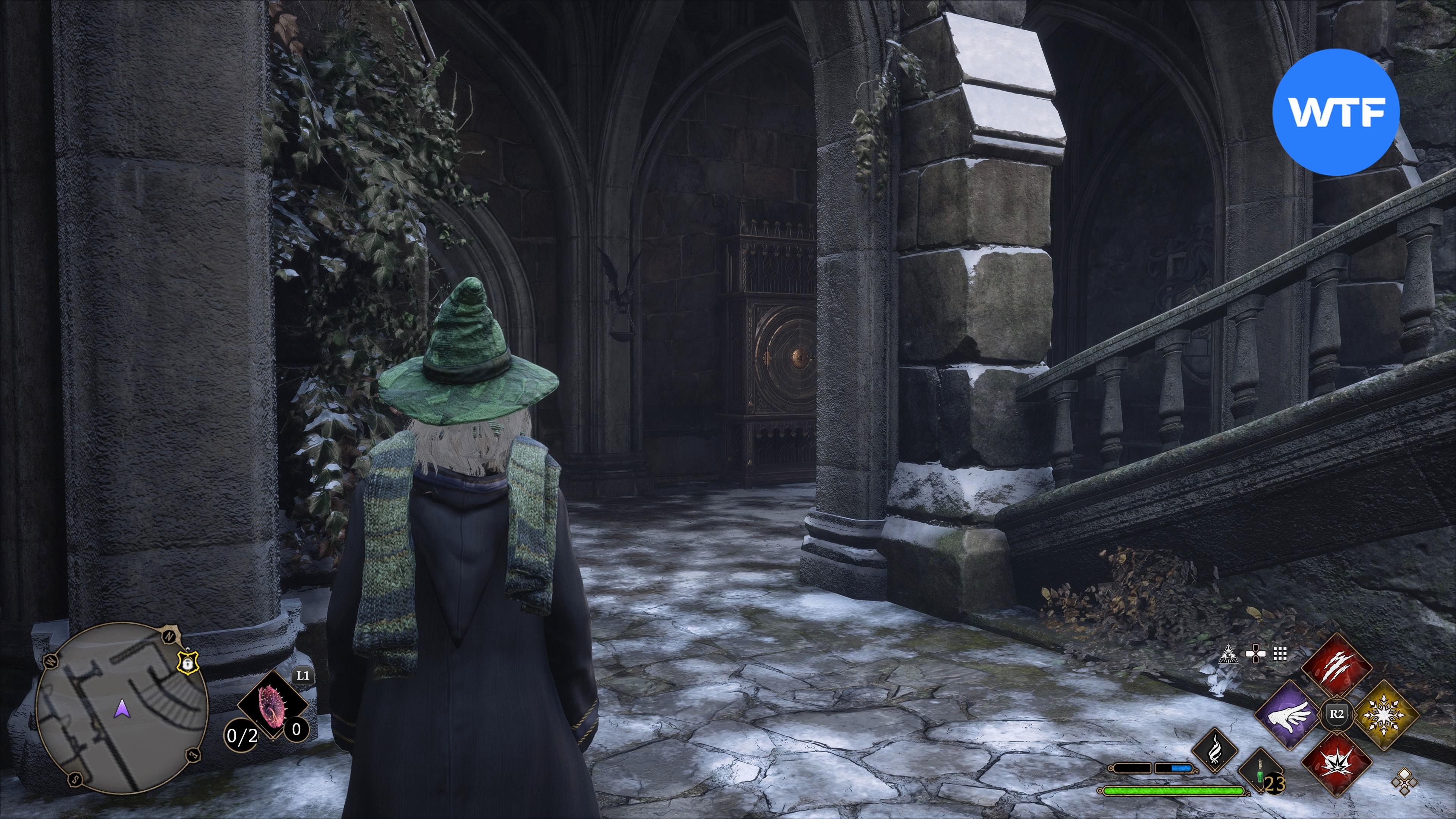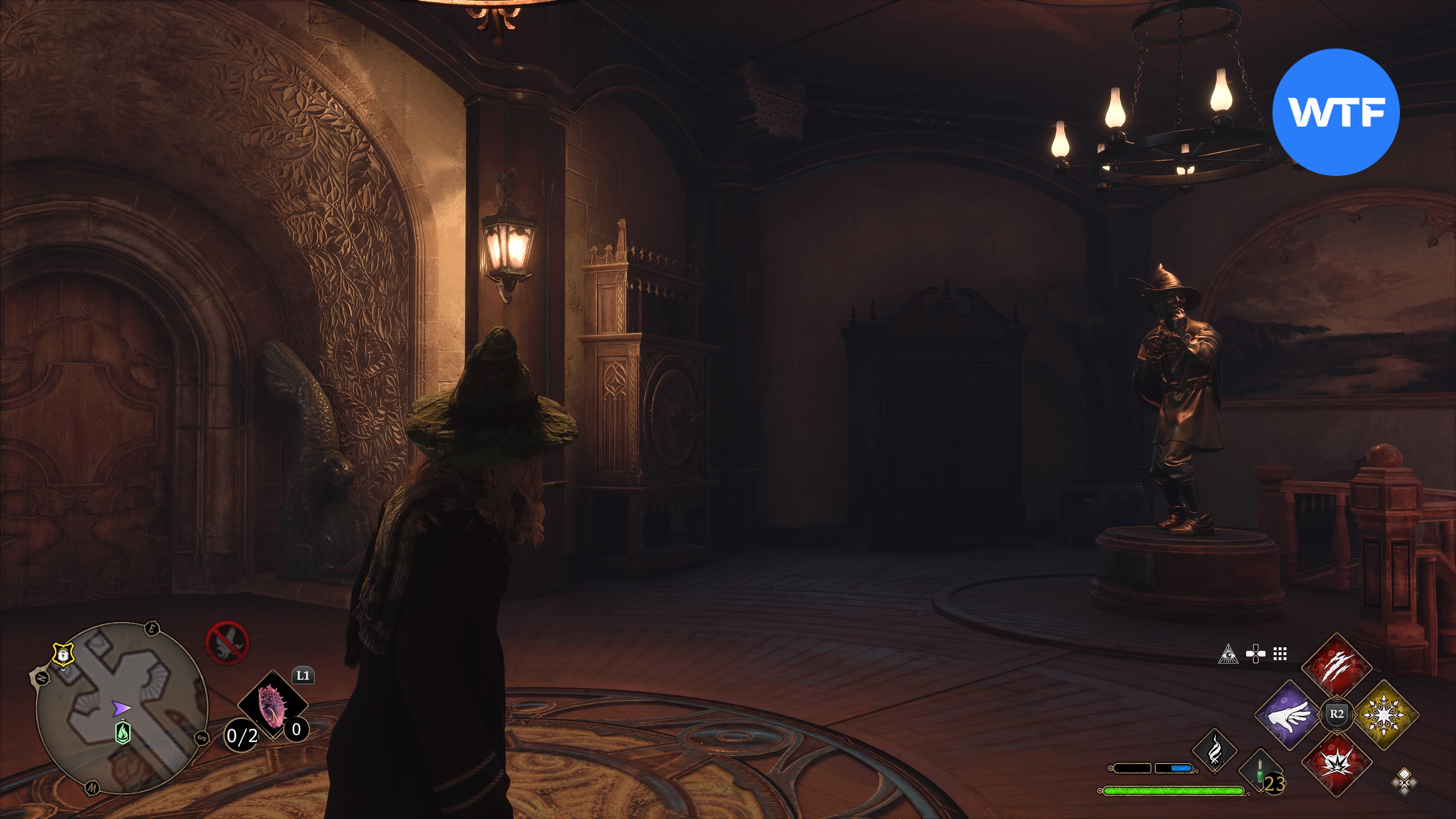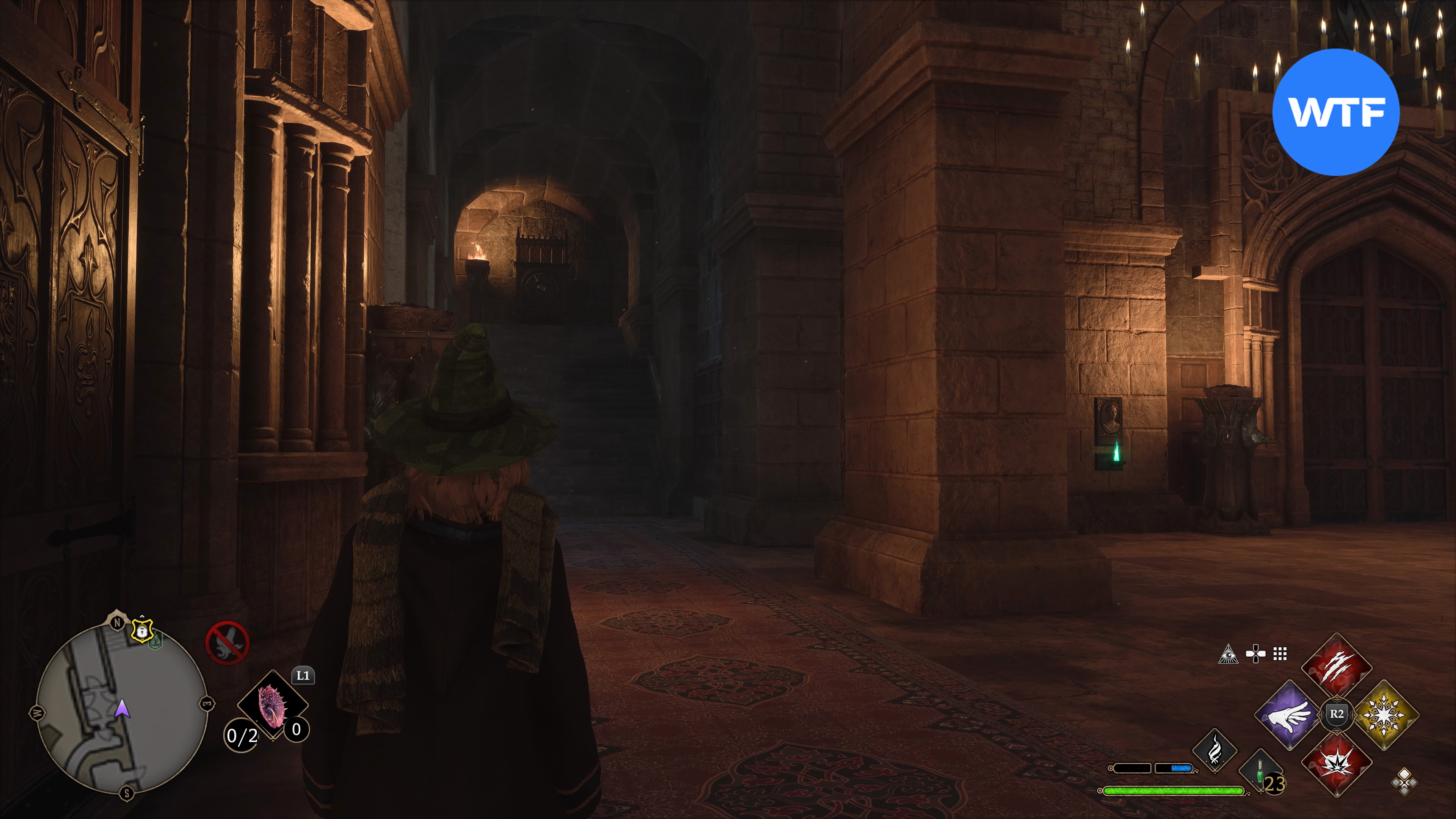 От точки появления пройдите через дверь прямо перед вами и посмотрите налево, чтобы увидеть хитроумный ключ, летающий возле лестницы. Она же приведет вас к шкафу факультета с жетоном, к которому летит ключ.
