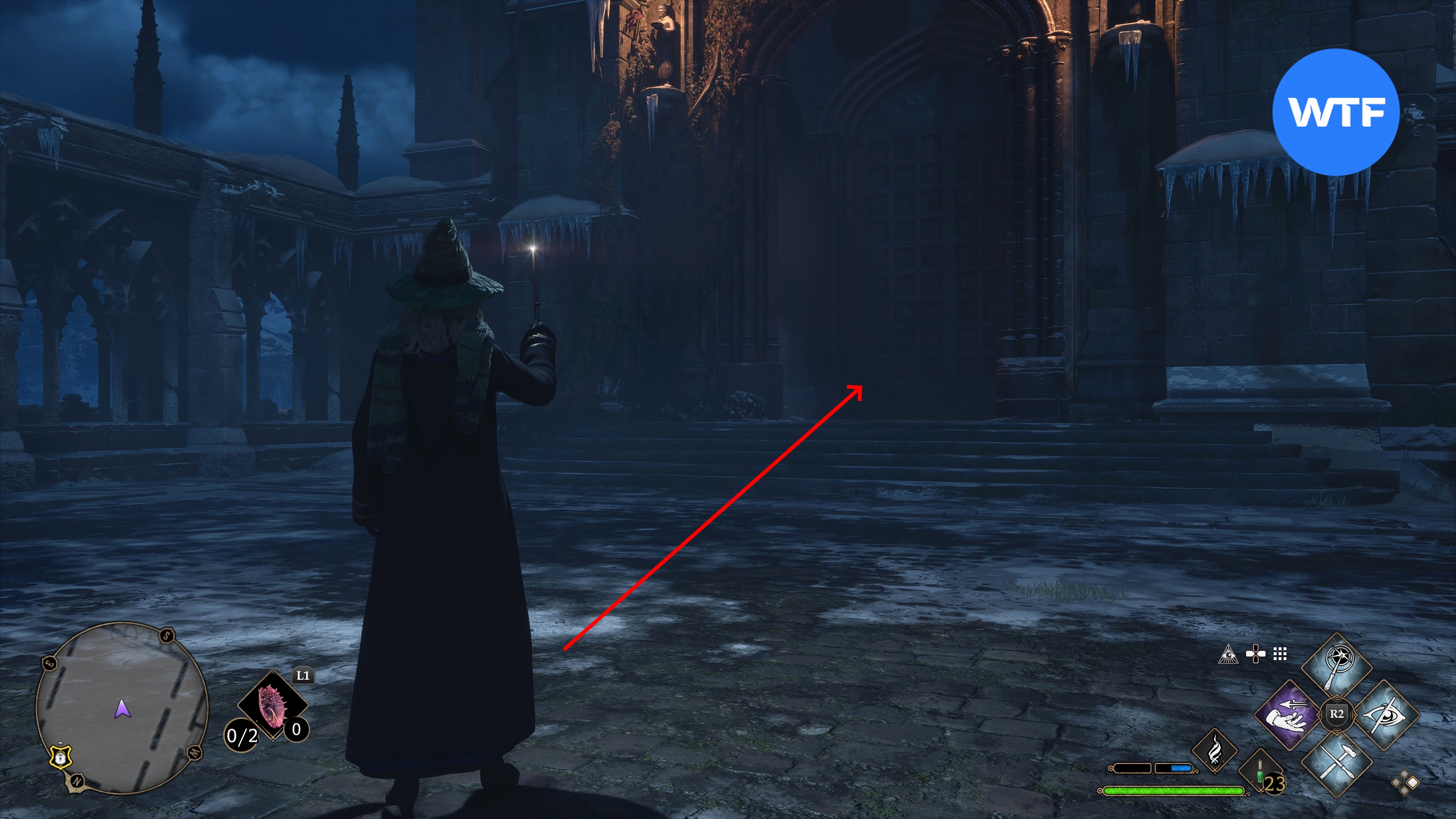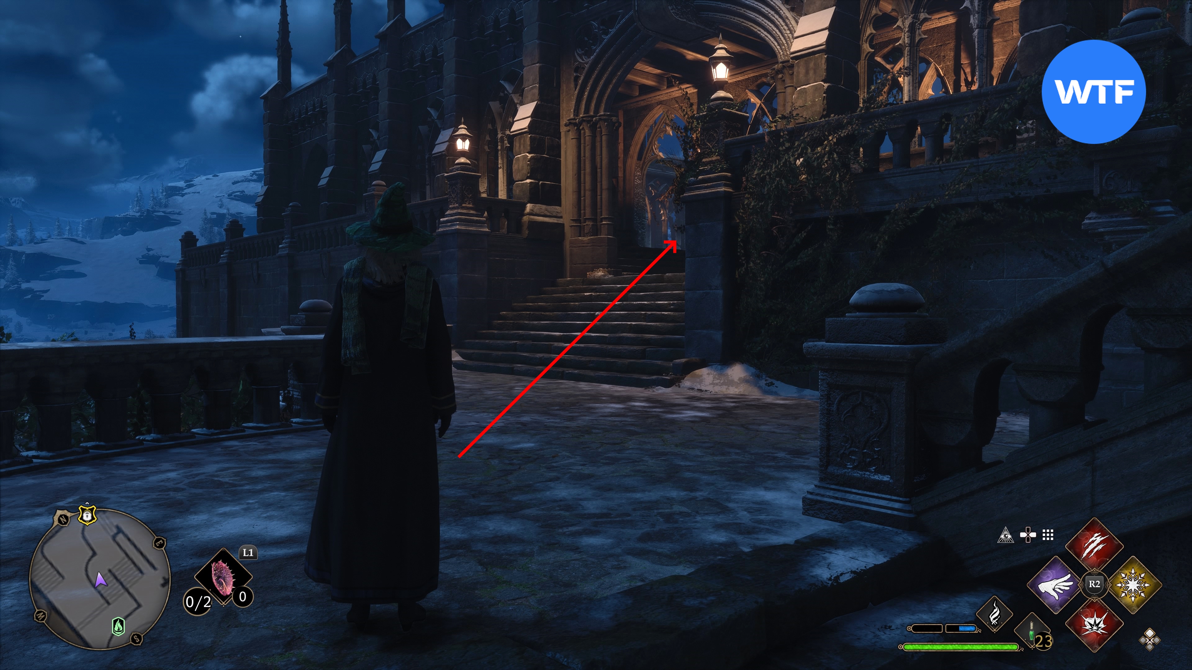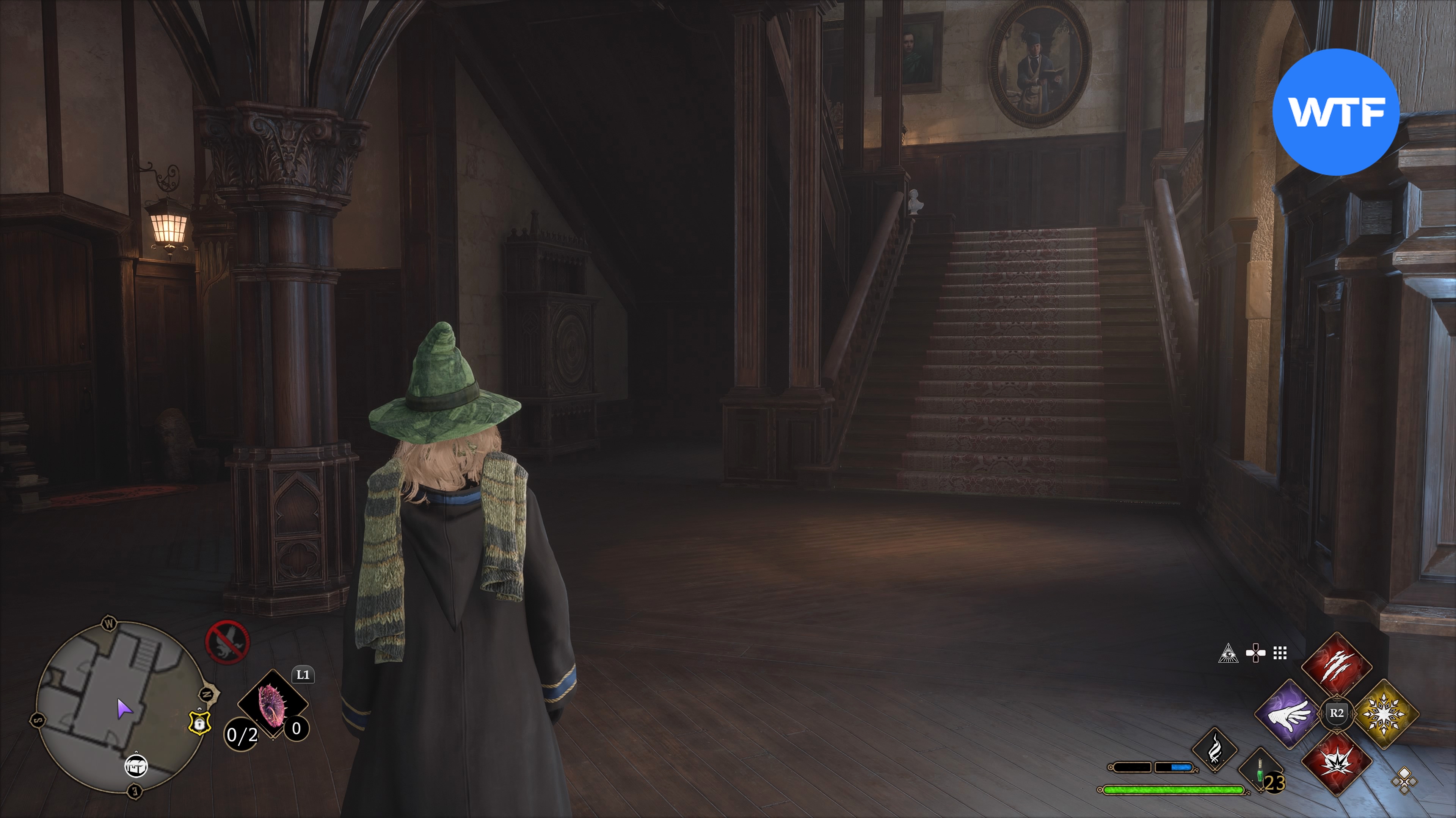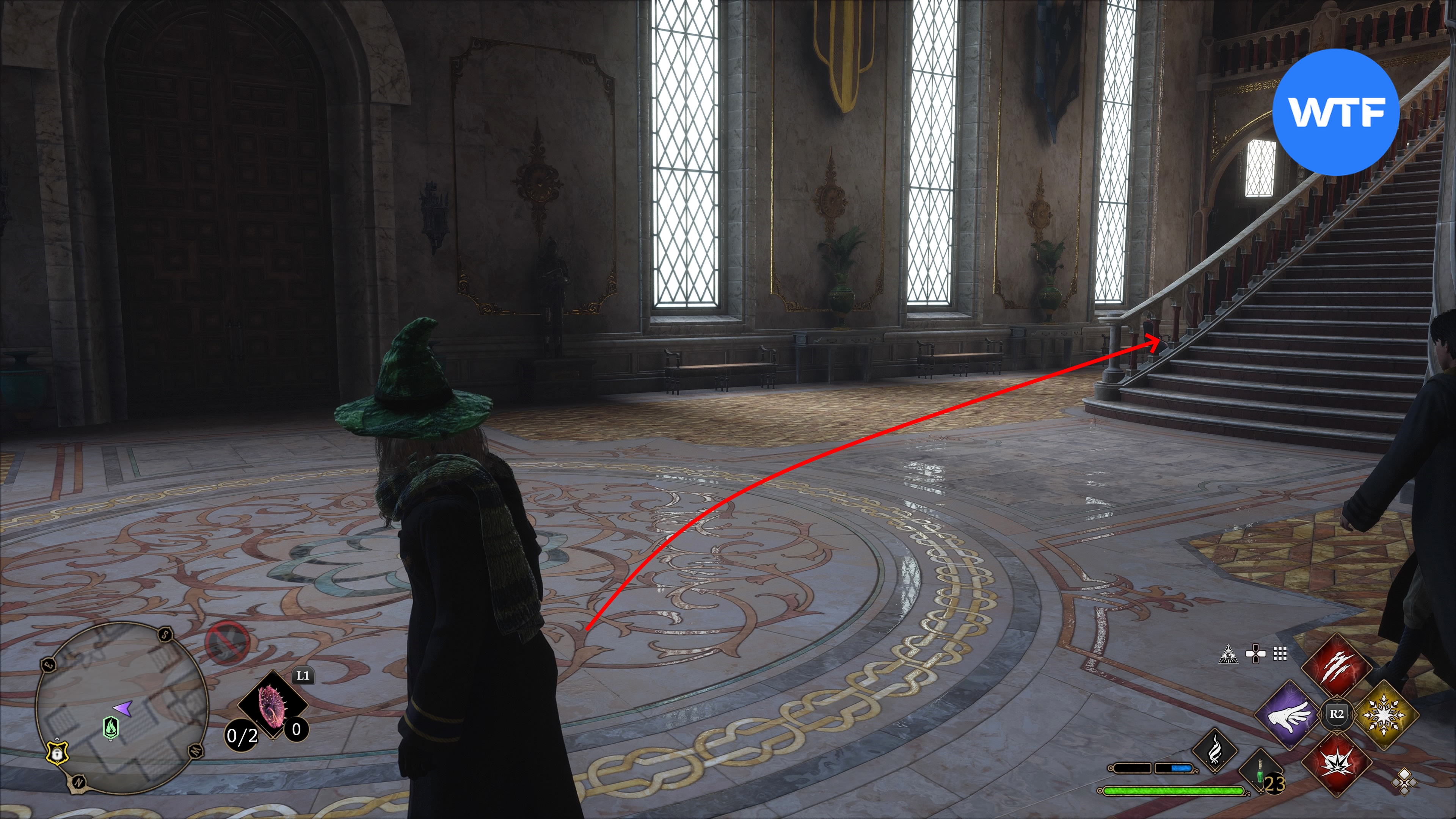 От точки появления идите вперед по коридору и пройдите через решетчатую дверь справа, которую вы открываете во время квеста «Жалоба смотрителя на Луну». Прямо перед вами будет лестница, возле которой которой стоит шкаф с жетоном факультета. Чтобы найти летающий ключ, нужно подняться по лестнице наверх.