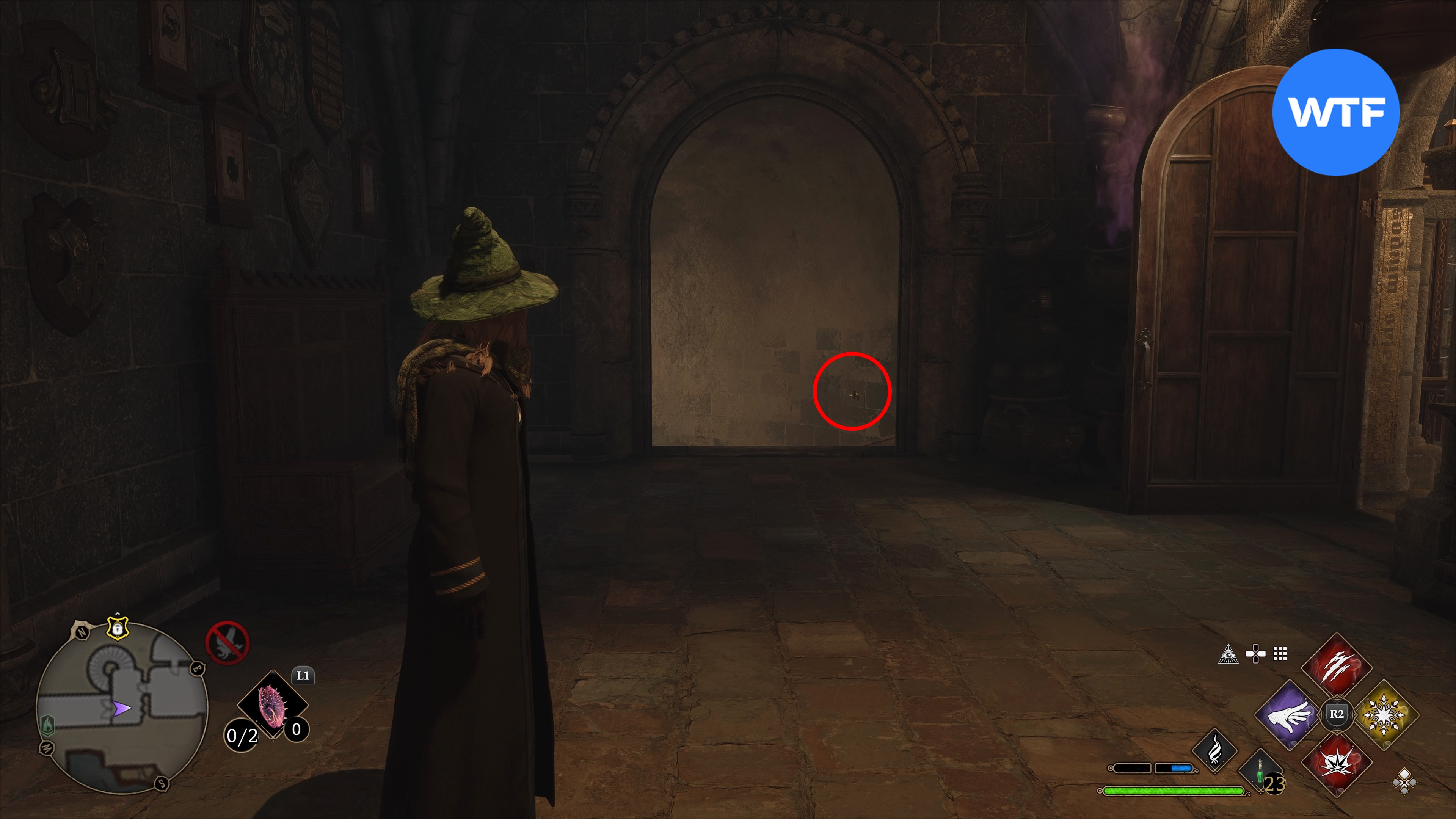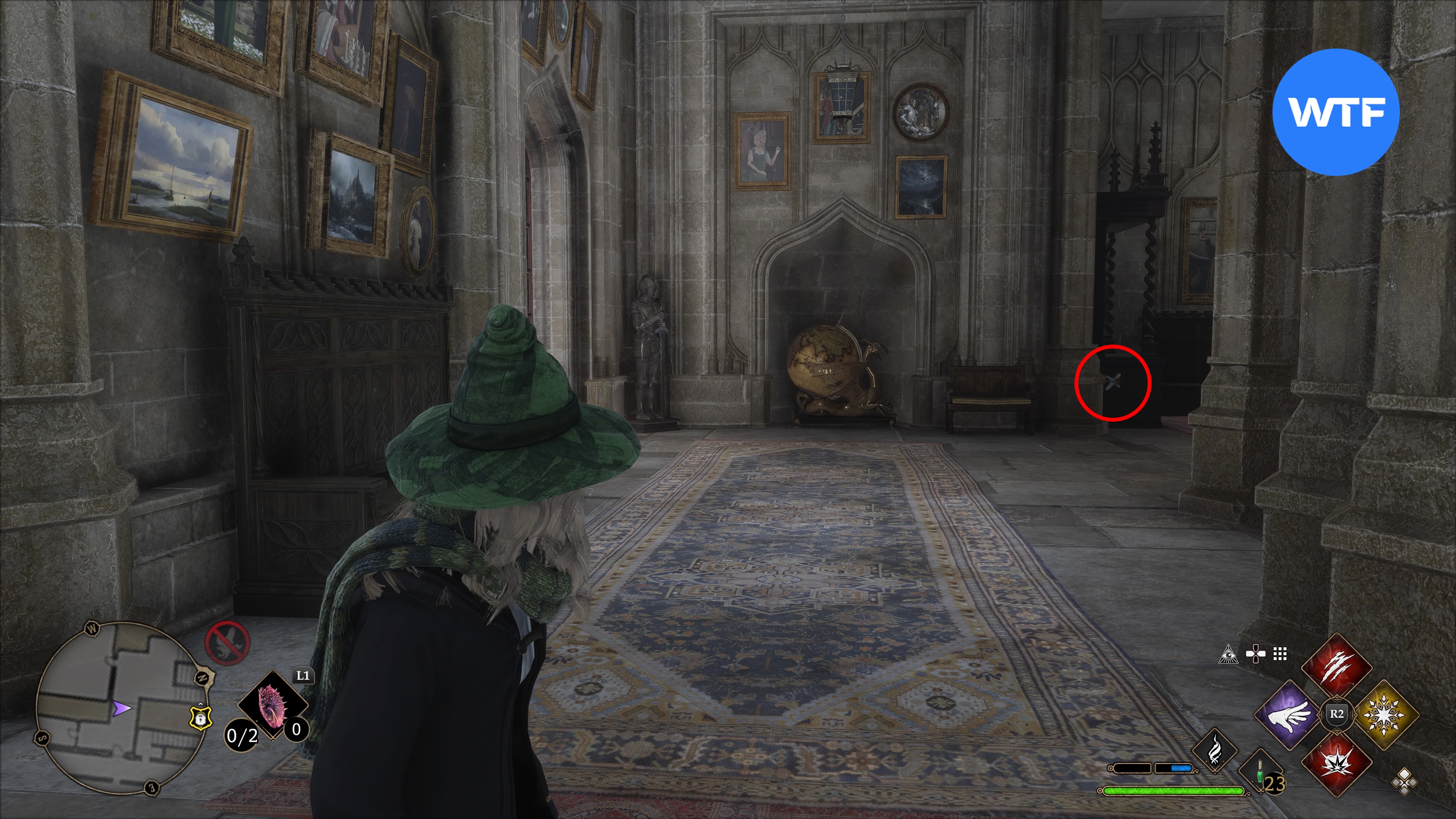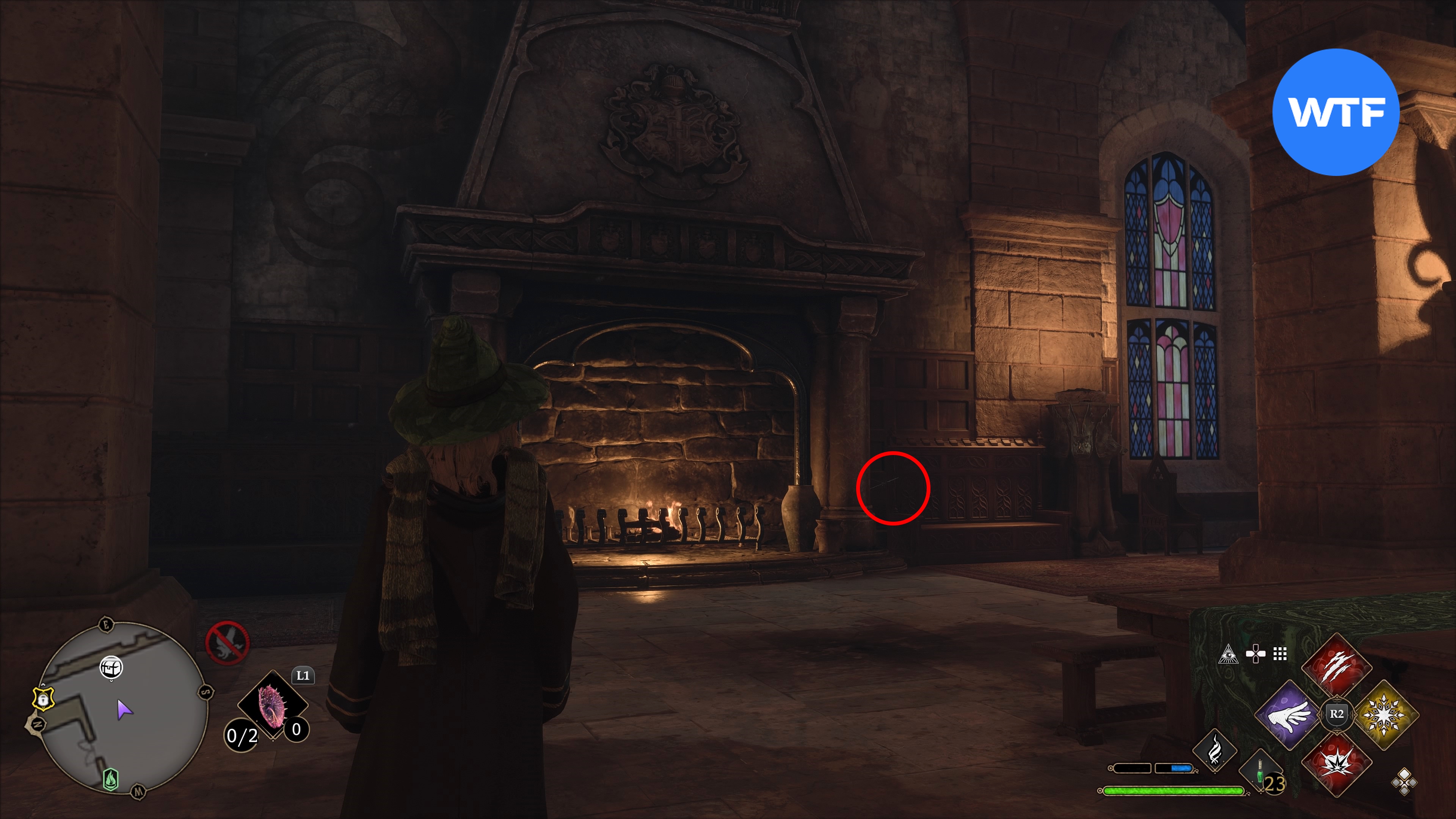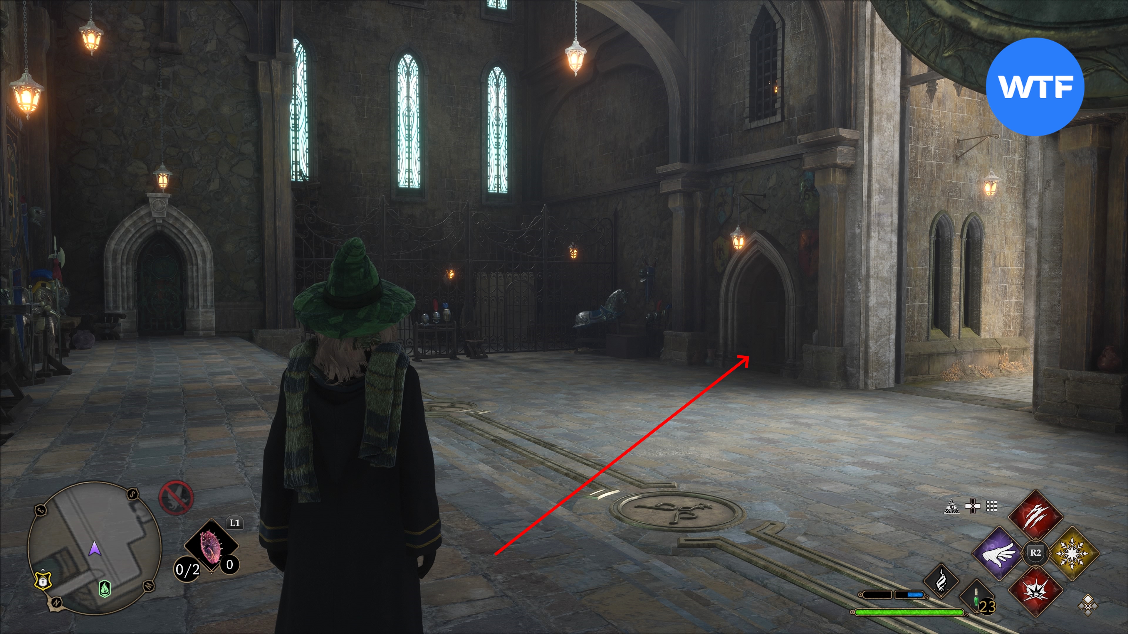 От точки появления идите налево, чтобы найти летающий ключ возле большого камина. Он приведет вас к шкафу факультета в противоположном углу комнаты, с другой стороны от точки быстрого перемещения.