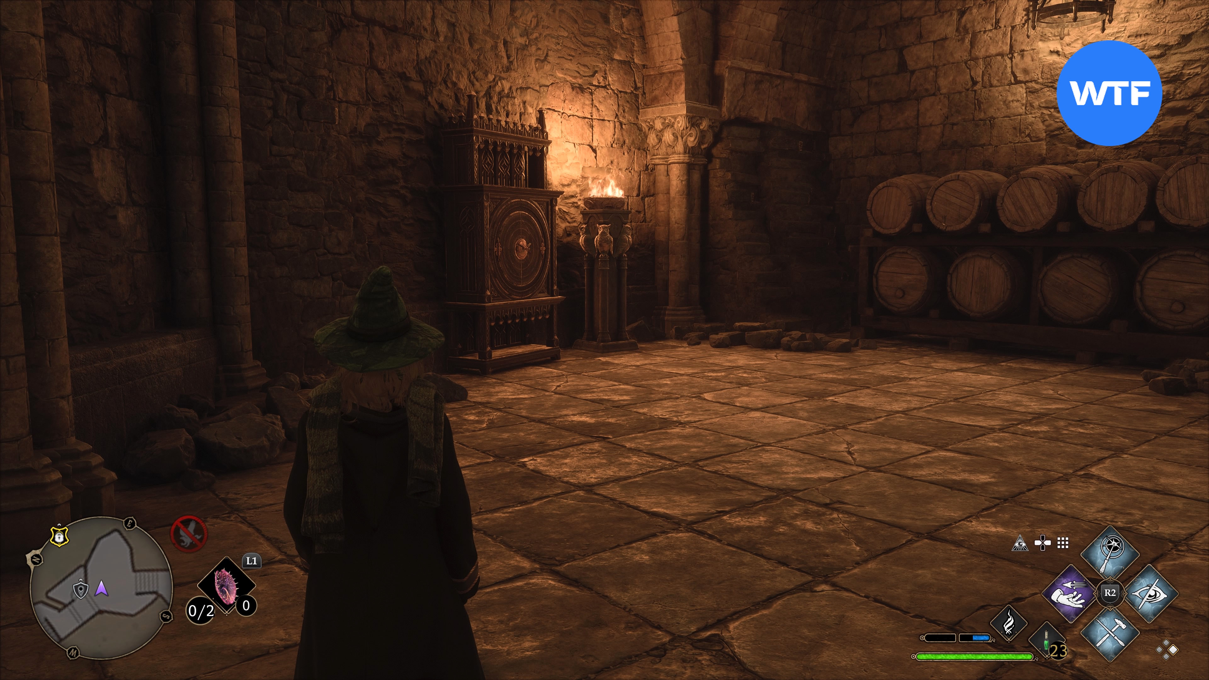 От точки появления развернитесь и зайдите в первую дверь слева от вас, ведущую в Северный зал. Пройдите вперед и спуститесь по лестнице вниз до упора, к статуе спящего дракона. Пройдите мимо него и продолжайте идти вперед по коридору, пока не заметите летающий ключ. Он полетит вперед и налево, в комнату с бочками, где и расположен шкаф с жетоном факультета.