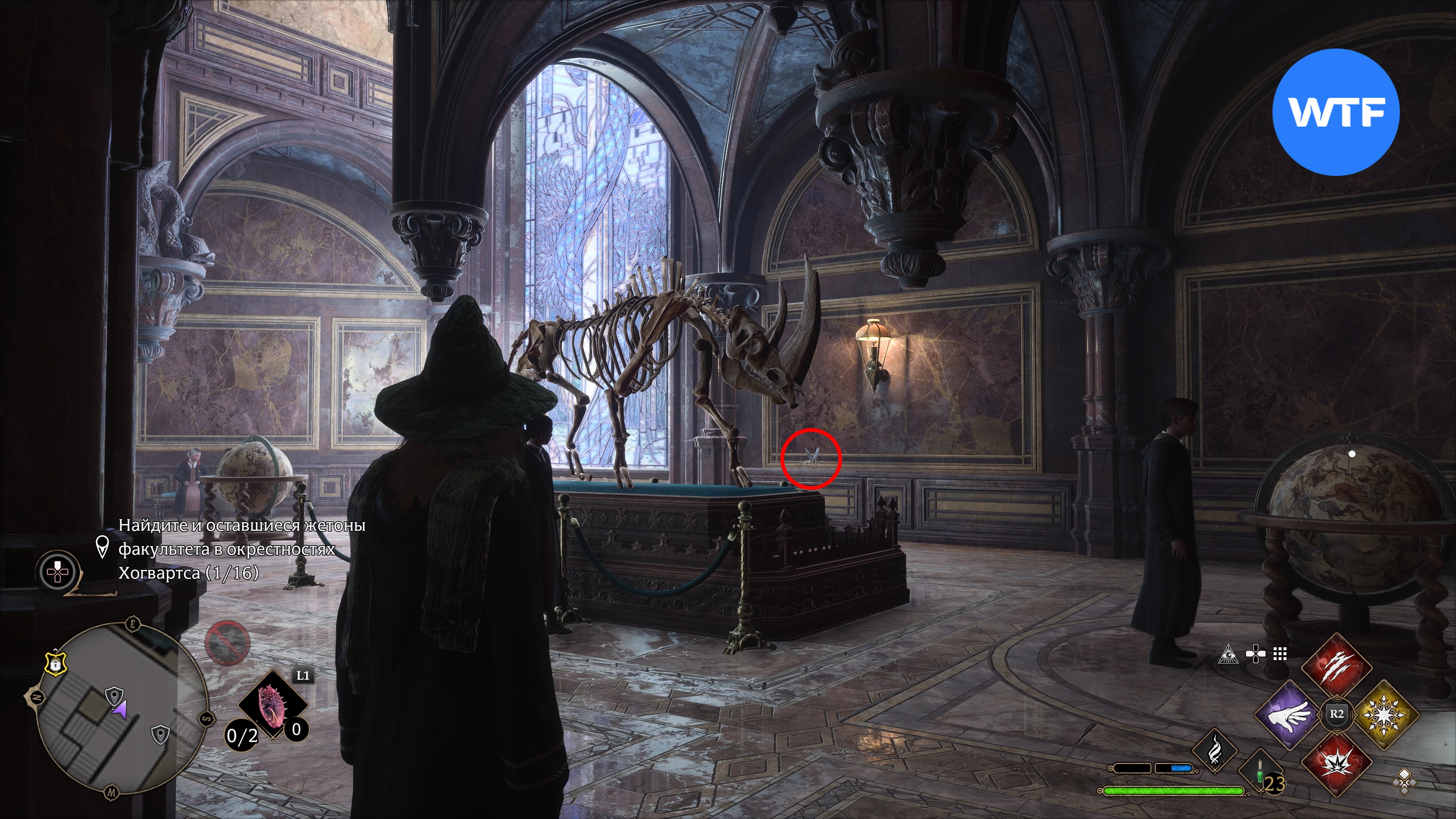 От точки появления пройдите через дверь позади вас, затем поднимитесь по лестнице вверх и налево. Хитроумный ключ летает возле большого скелета носорога. Шкаф с жетоном факультета, к которому он ведет, находится на балконе прямо над этим скелетом.