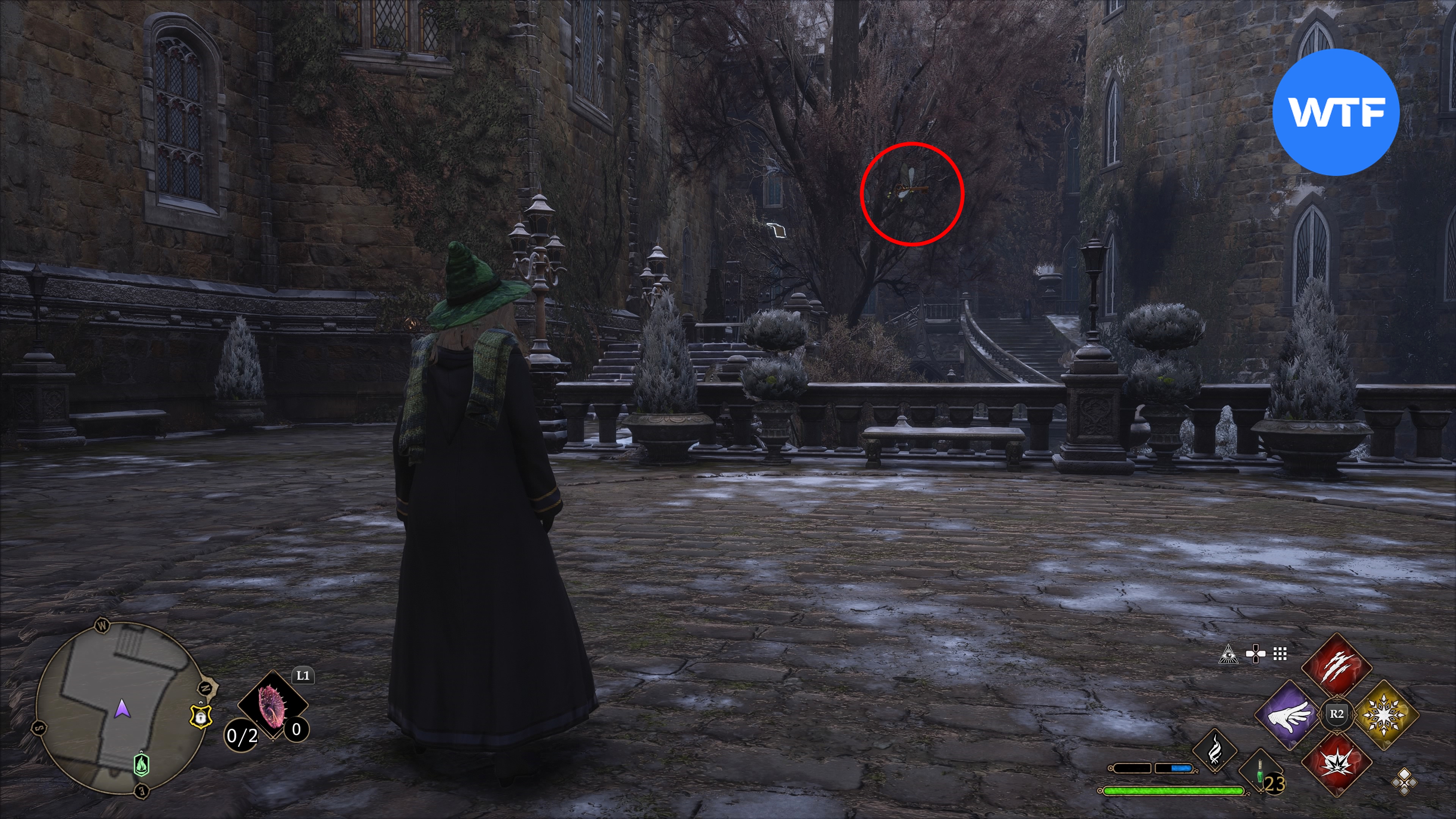 От точки появления спуститесь по лестнице вниз, а затем направо. Хитроумный ключ летает возле больших дверей, ведущих в Теплицы. Чтобы найти шкаф, поднимитесь обратно по лестнице, пройдите мимо фонтана и спуститесь вниз. Шкаф с жетоном стоит справа от дверей, ведущих во Двор трансфигурации.