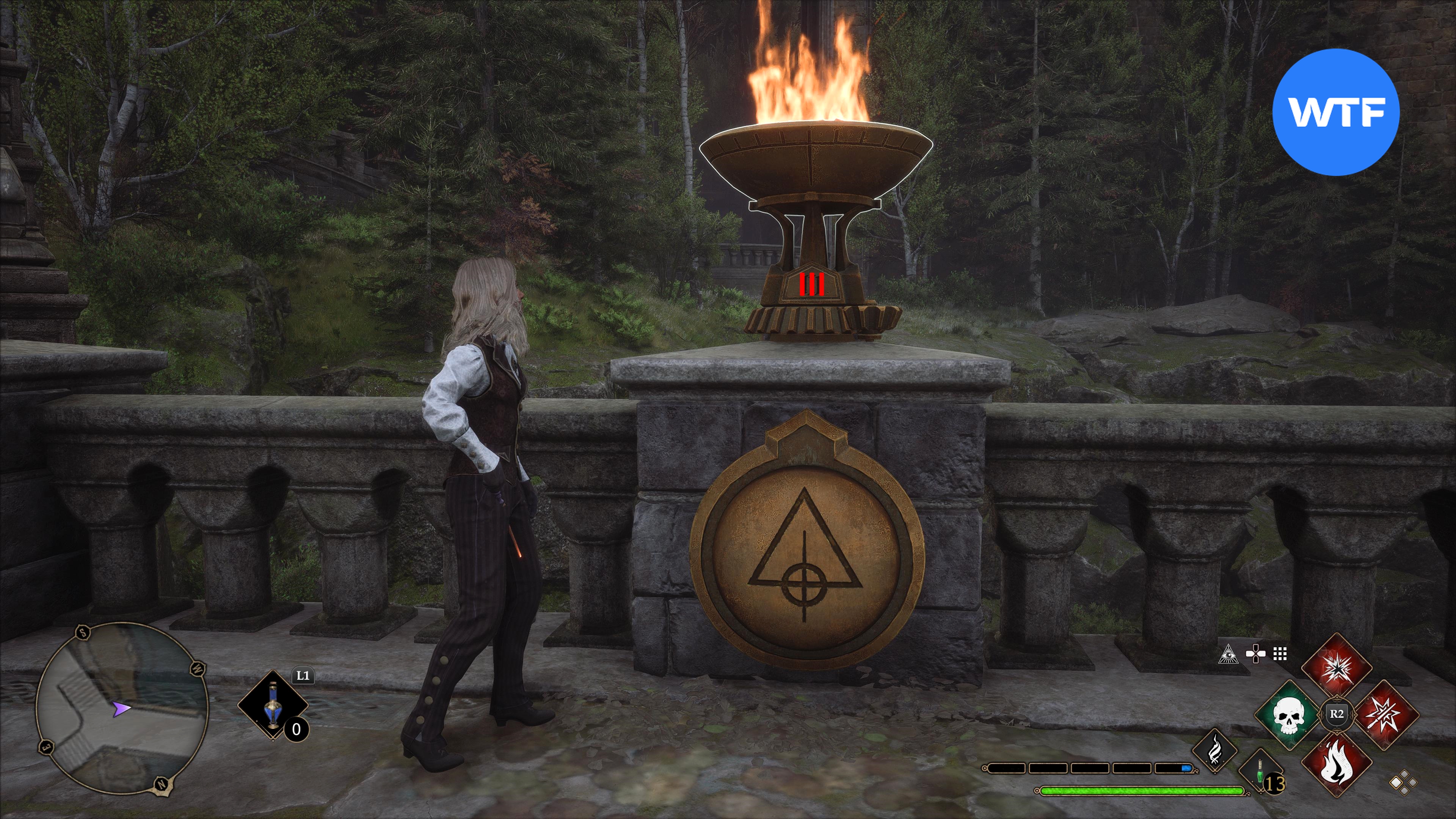Теперь вам нужно как следует осмотреться. Ваша задача заключается в том, чтобы найти четыре чаши с факелами и железный люк с символами на одной из сторон моста. Чтобы поджечь жаровни, воспользуйтесь любым огненным заклинанием (например, здесь подойдет Конфринго или Инсендио). Когда жаровни загорятся, вы сможете поворачивать шестеренку у основания и менять римские цифры при взаимодействии для решения загадки.