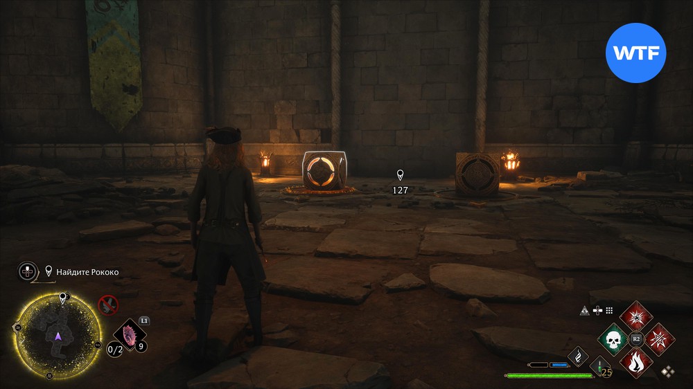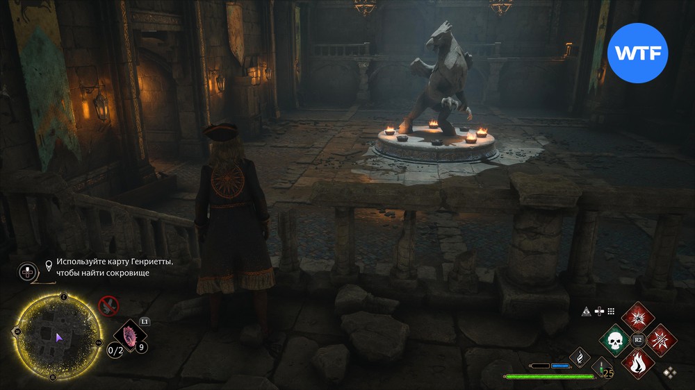 Внутри вы увидите статую гиппогрифа с горящими вокруг неё огнями. Ваша задача — зажечь те жаровни, что отмечены на карте Генриетты, и потушить лишние. Тушить можно заклинанием Глациус.