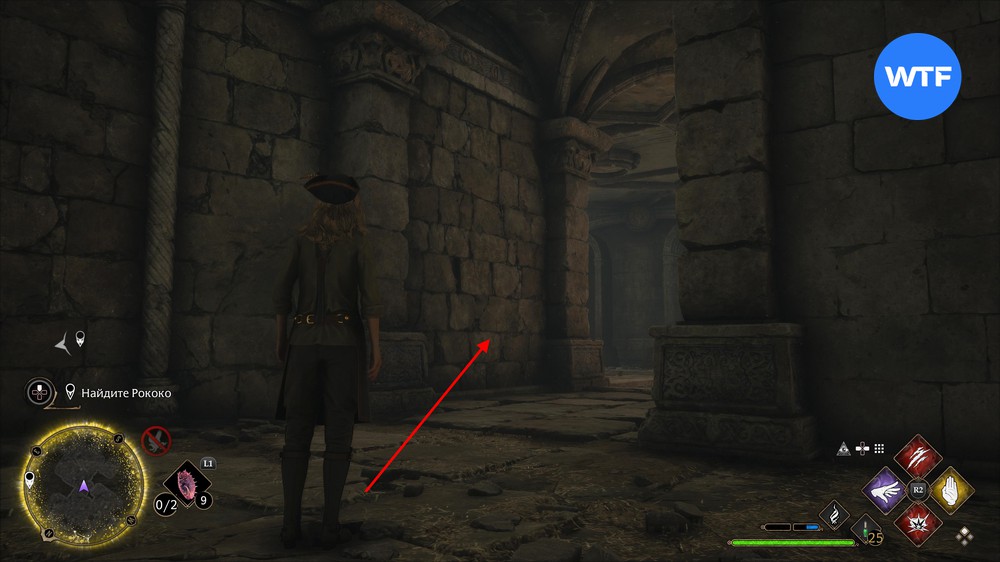 В следующем зале вам нужно подойти вплотную к указанному ниже участку стены под лестницей. Так вы попадете в комнату рядом и сможете забрать музыкальную карту со стола.