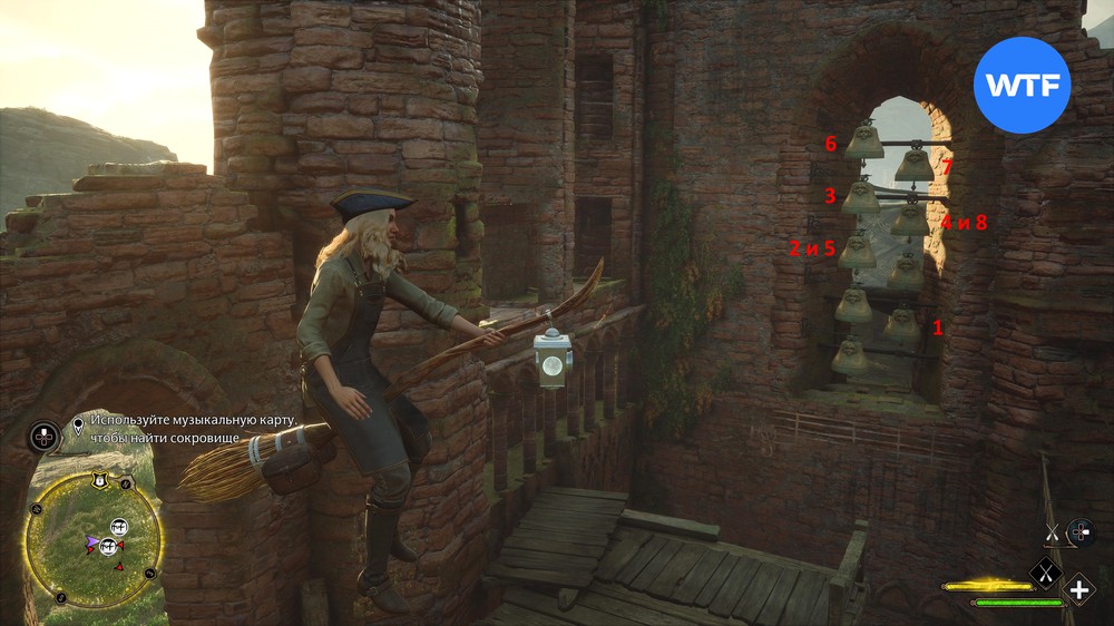 Разберитесь с врагами и отыщите внутри замка стену, на которой висят колокольчики. Ваша задача — сыграть мелодию, показанную на музыкальной карте. Для этого нужно выстрелить по колокольчикам в порядке со скриншота ниже. После этого возле вас появится сундук с наградой.
