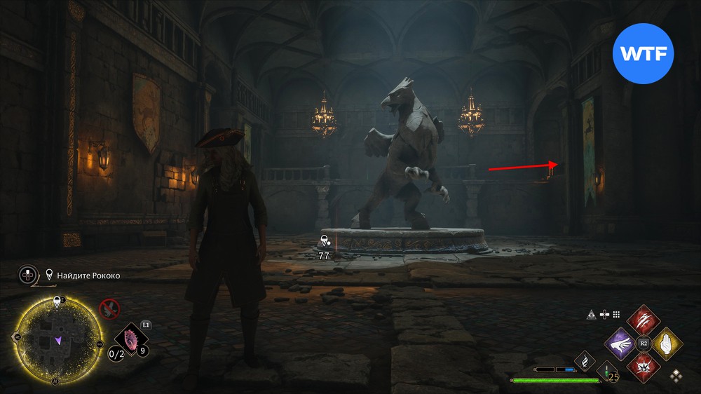 В следующем зале вы увидите статую гиппогрифа. Если у вас уже есть карта Генриетты, вы сможете забрать сокровище. Если нет, то идите дальше и поднимитесь на балкон за статуей по лестнице слева.