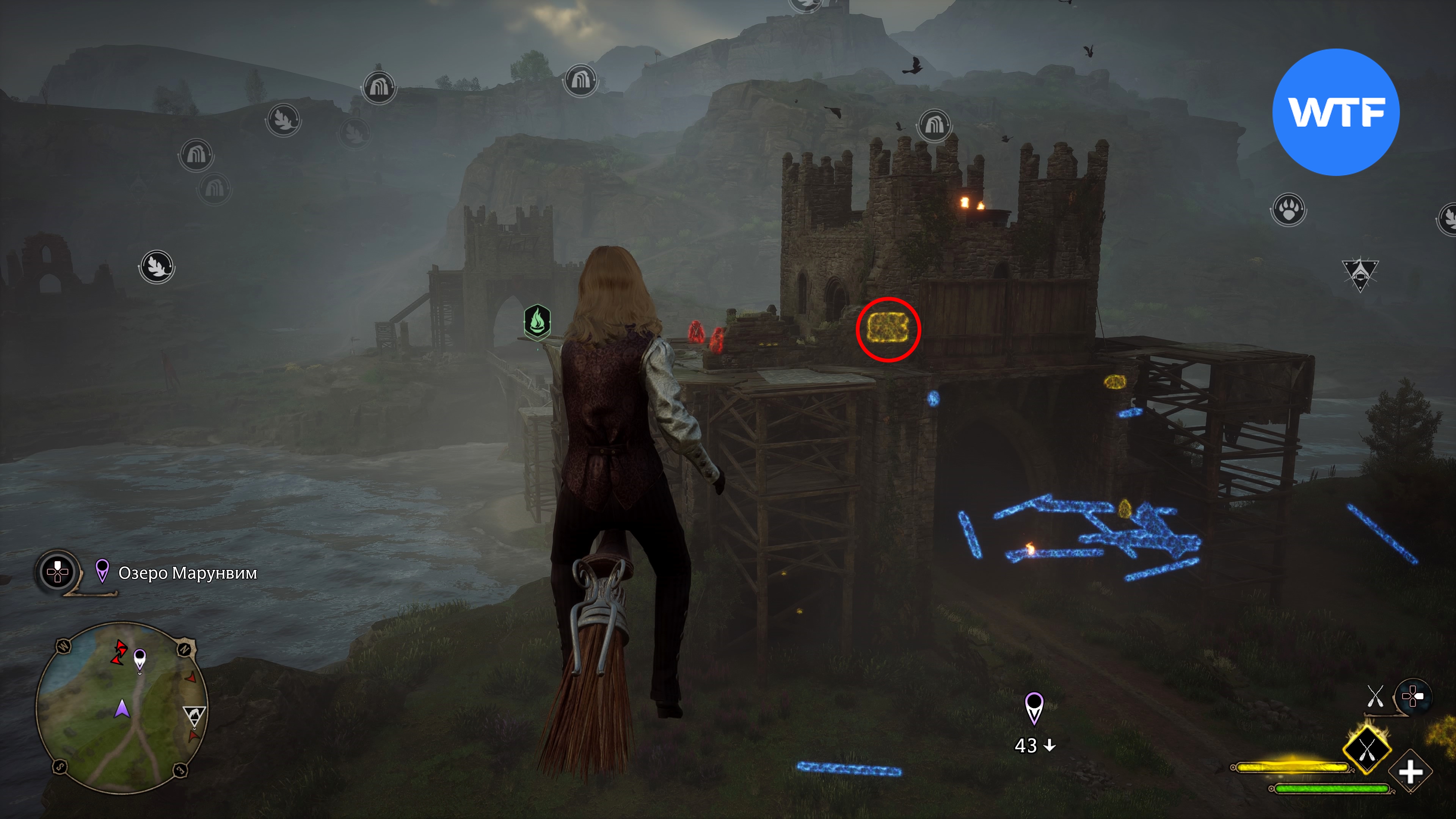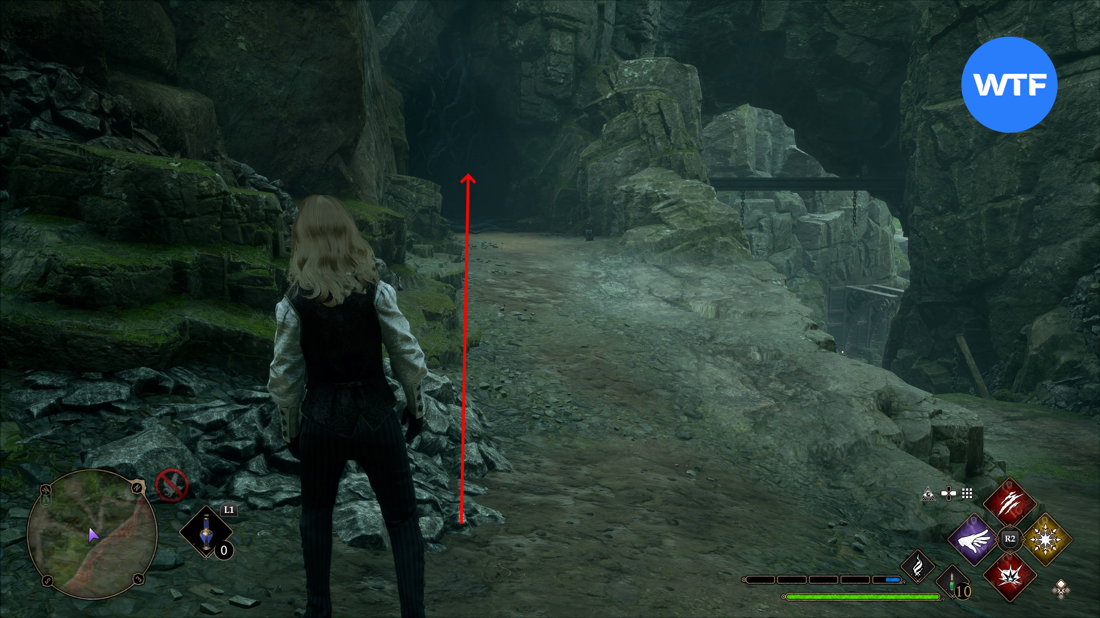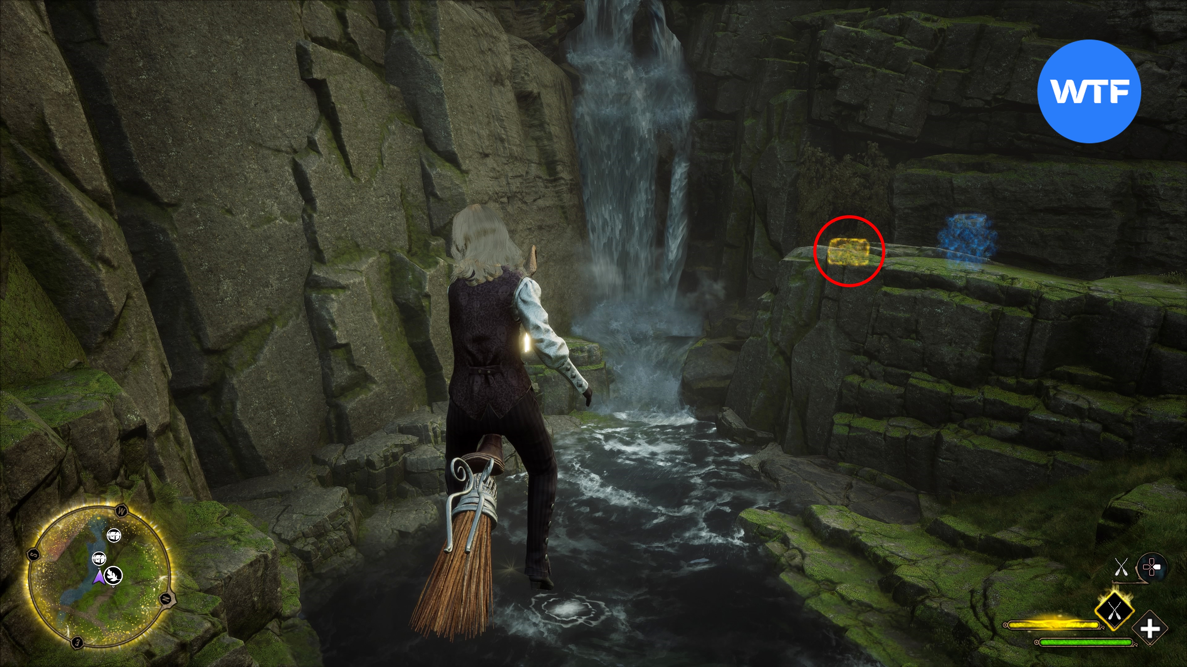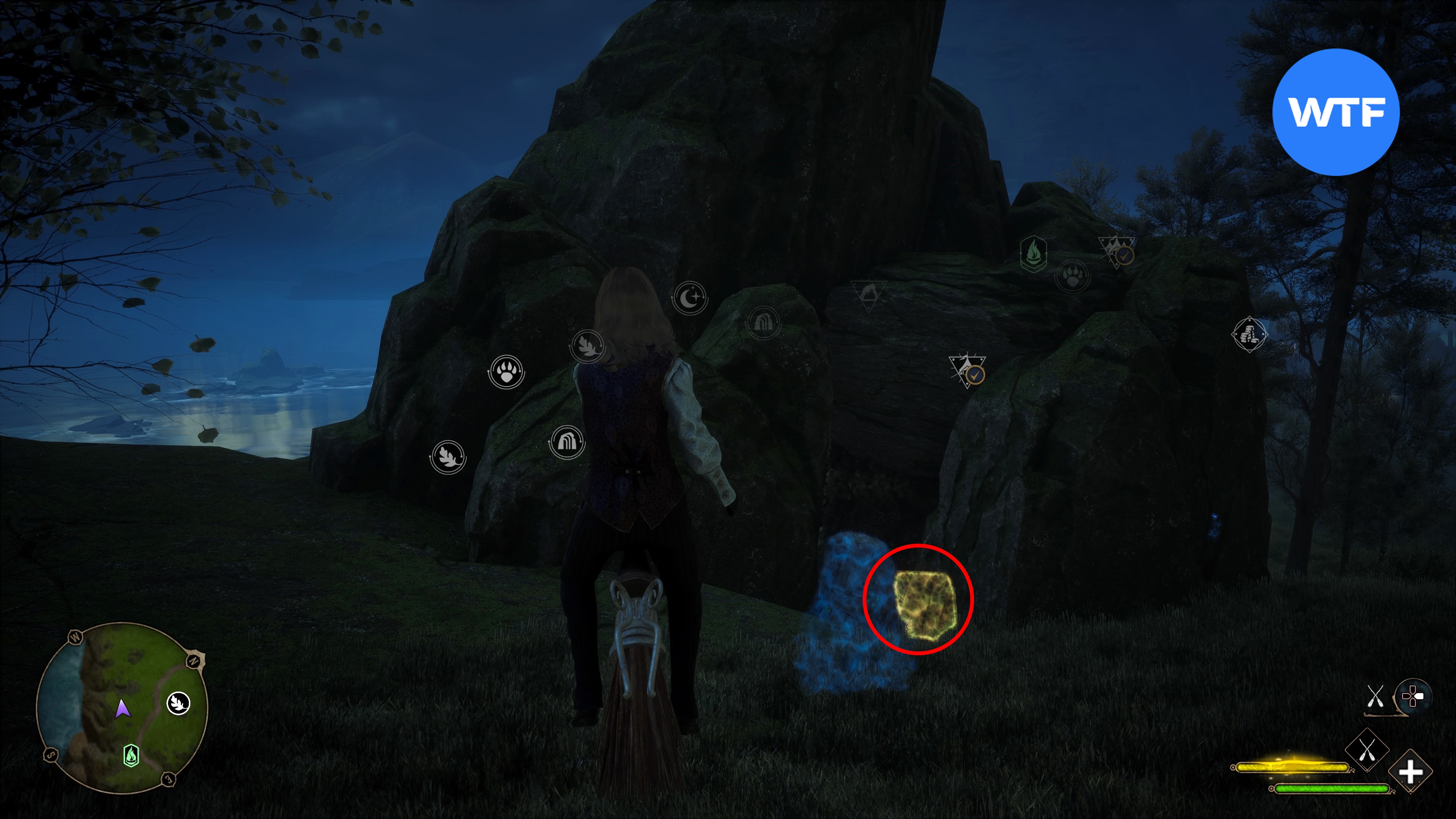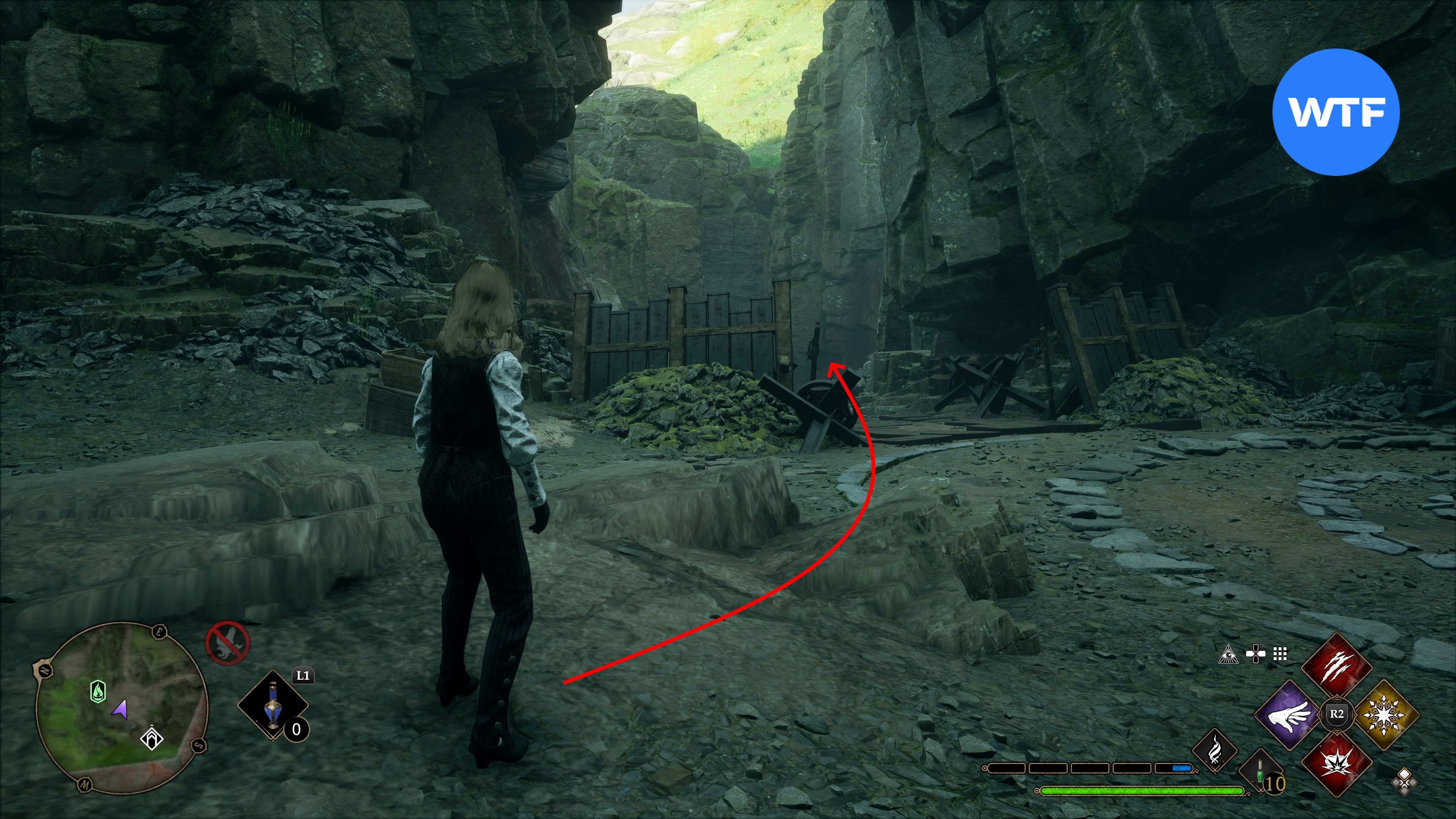 От точки быстрого перемещения Башня с туннелем в восточной части региона Озеро Марунвим идите по тропинке налево. Пройдя немного вперед, вы увидите слева от себя кучу камней, которые можно взорвать, чтобы расчистить проход. После этого используйте заклинание Люмос, чтобы пройти мимо дьявольских силков к сундуку.