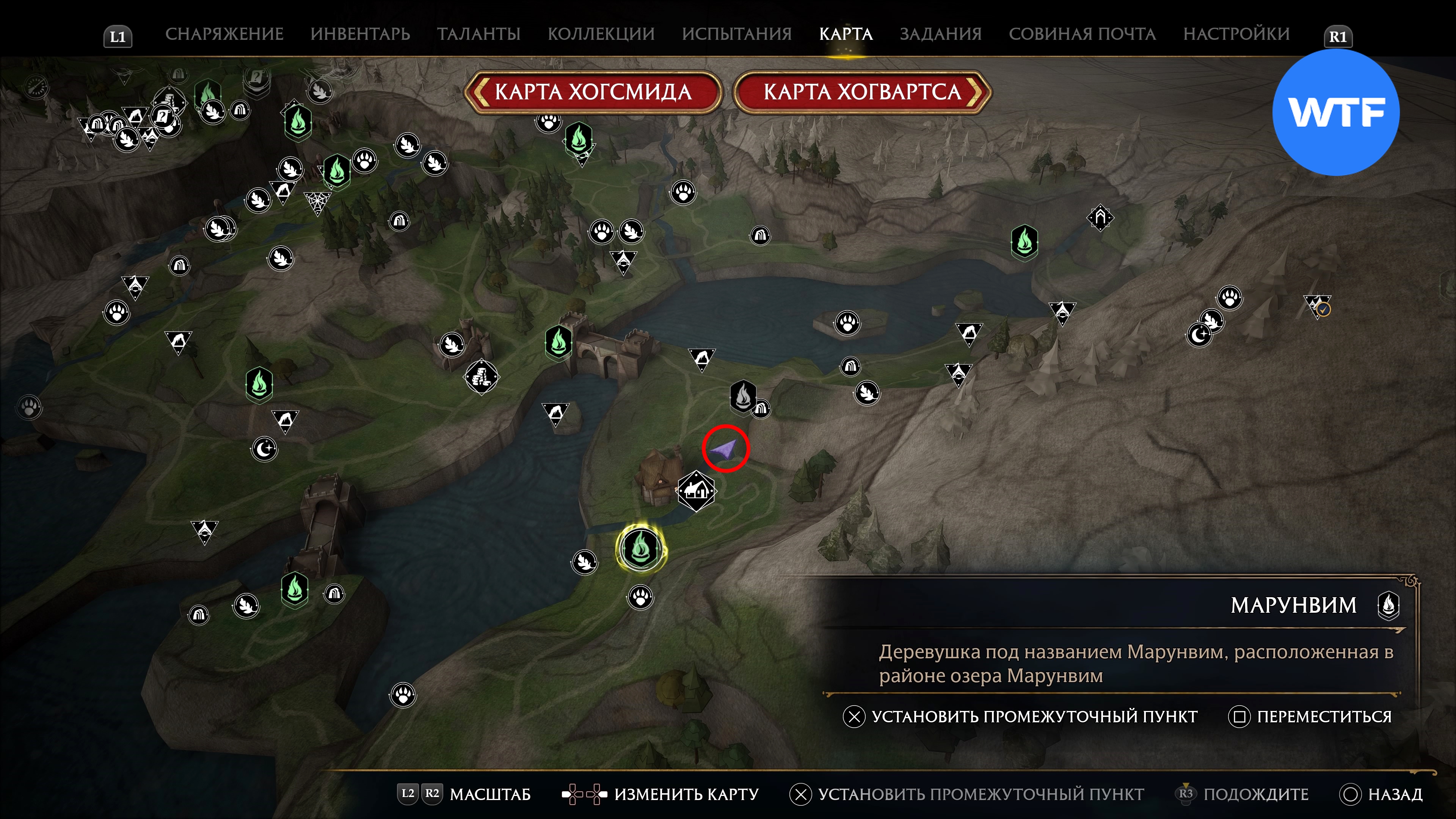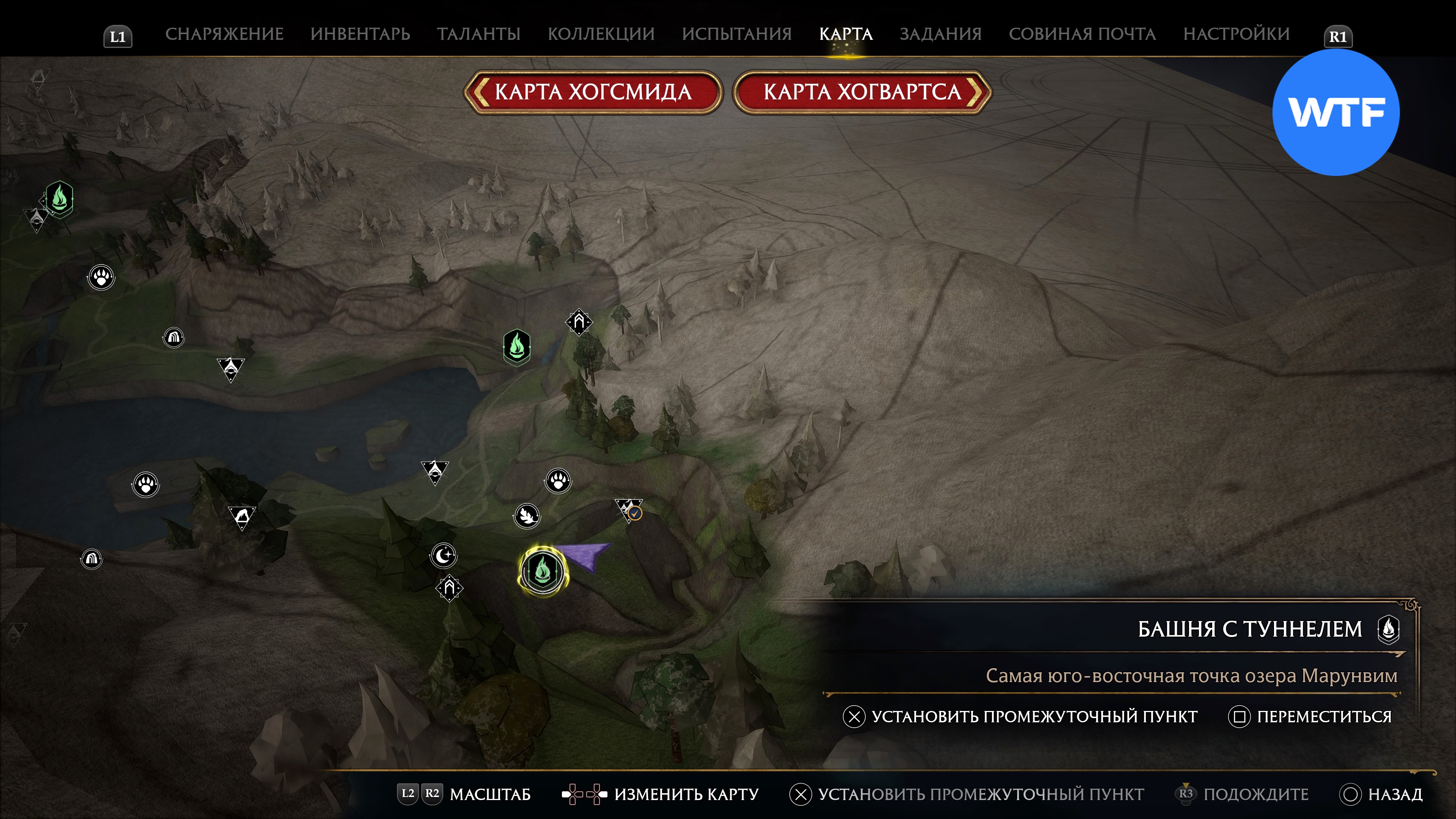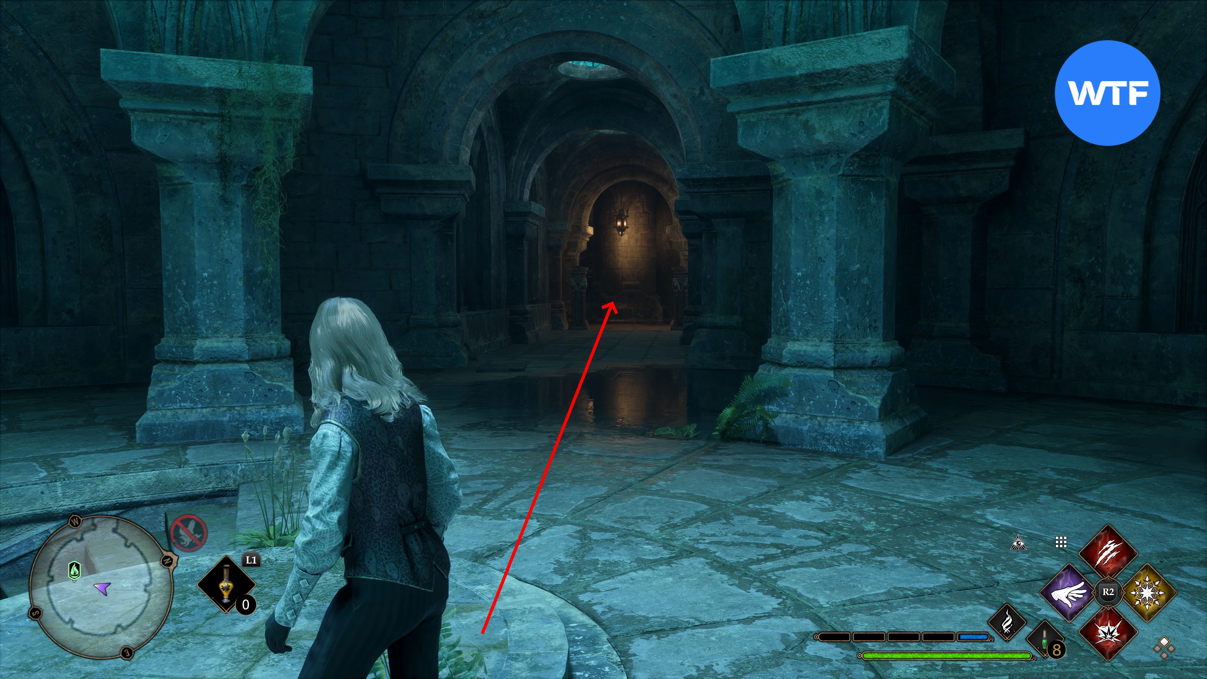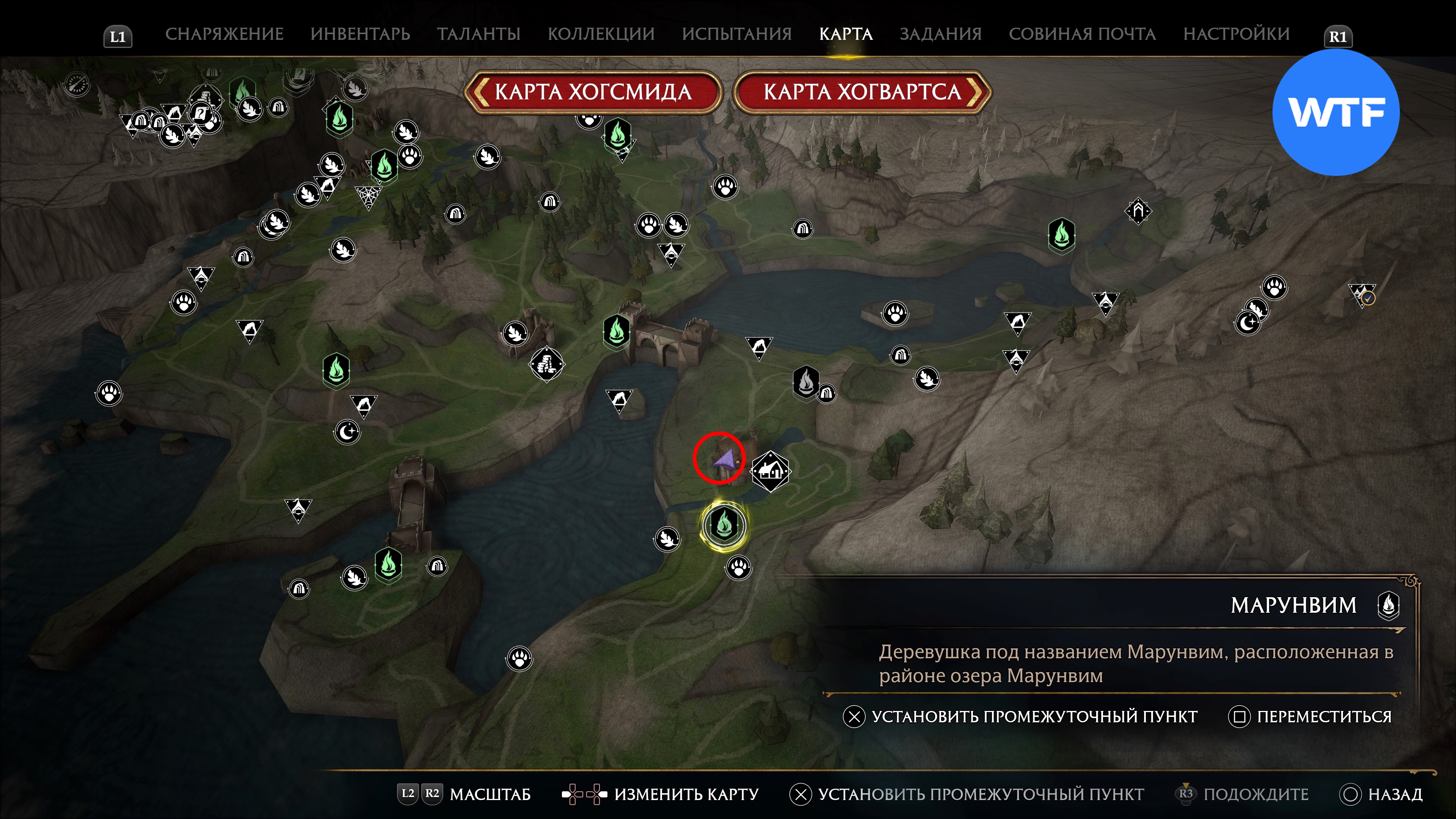 От точки быстрого перемещения Башня с туннелем в восточной части региона Озеро Марунвим идите по тропинке налево. Пройдя немного вперед, вы увидите слева от себя кучу камней, которые можно взорвать, чтобы расчистить проход. После этого используйте заклинание Люмос, чтобы пройти мимо дьявольских силков к сундуку.