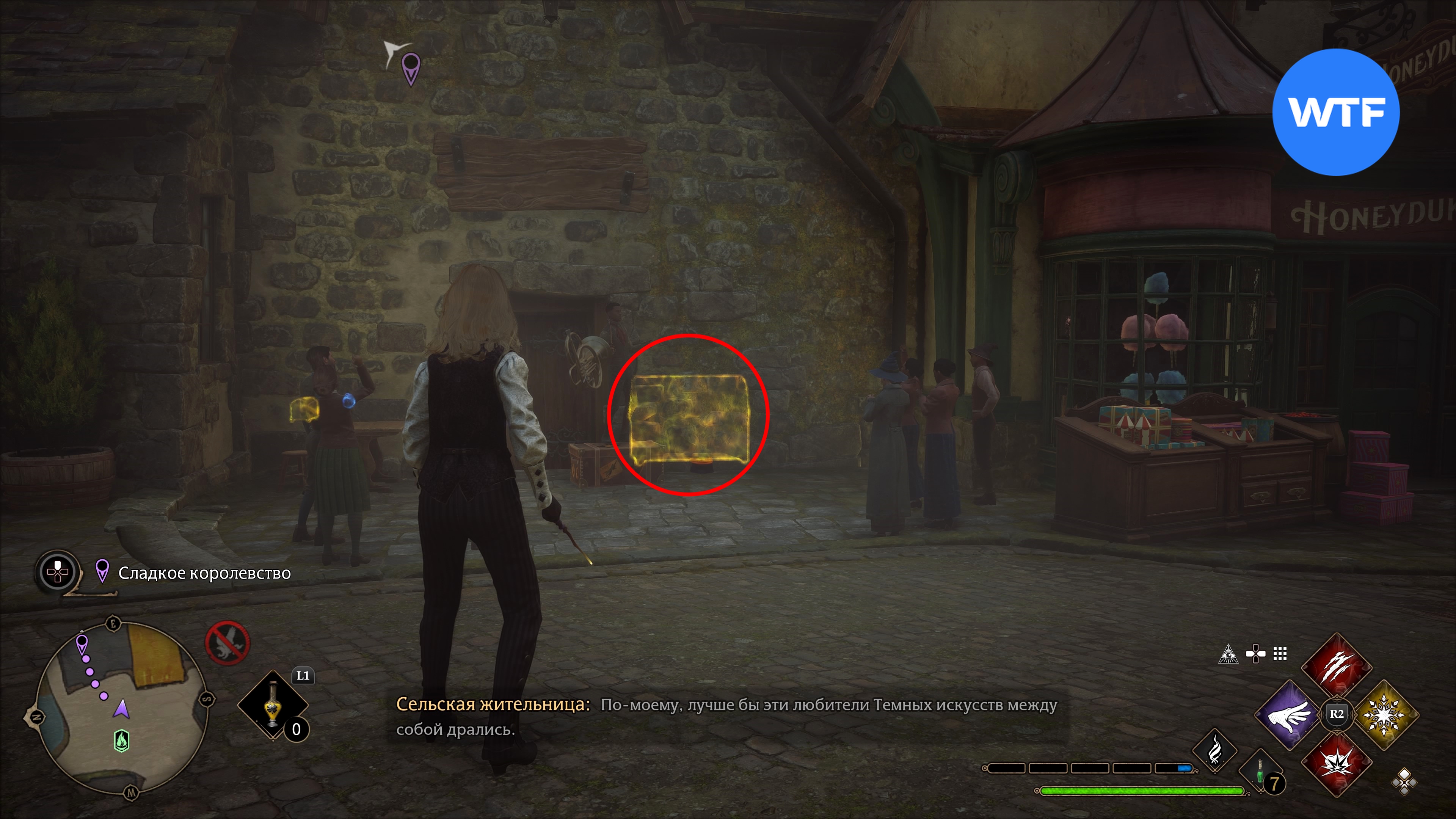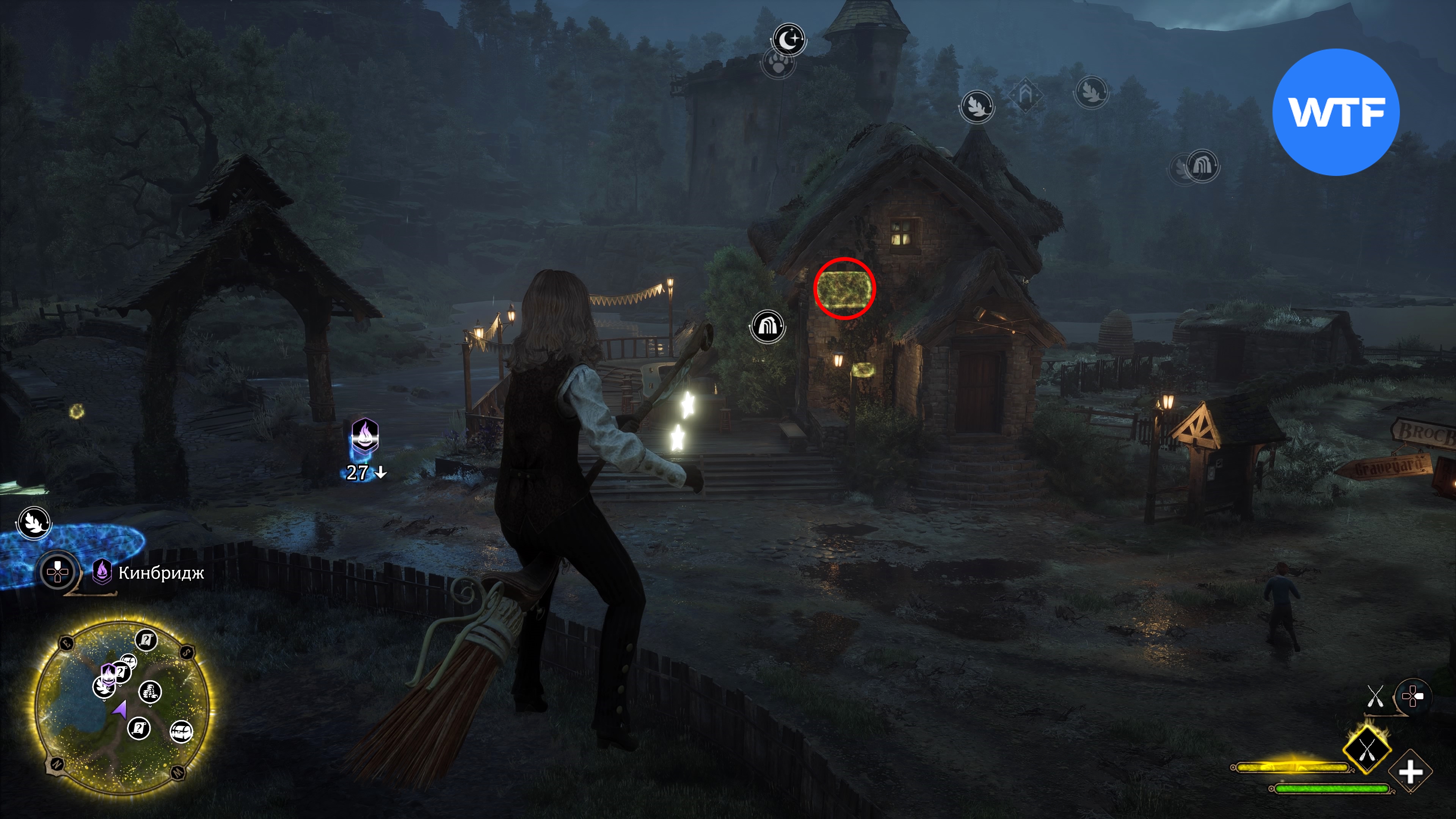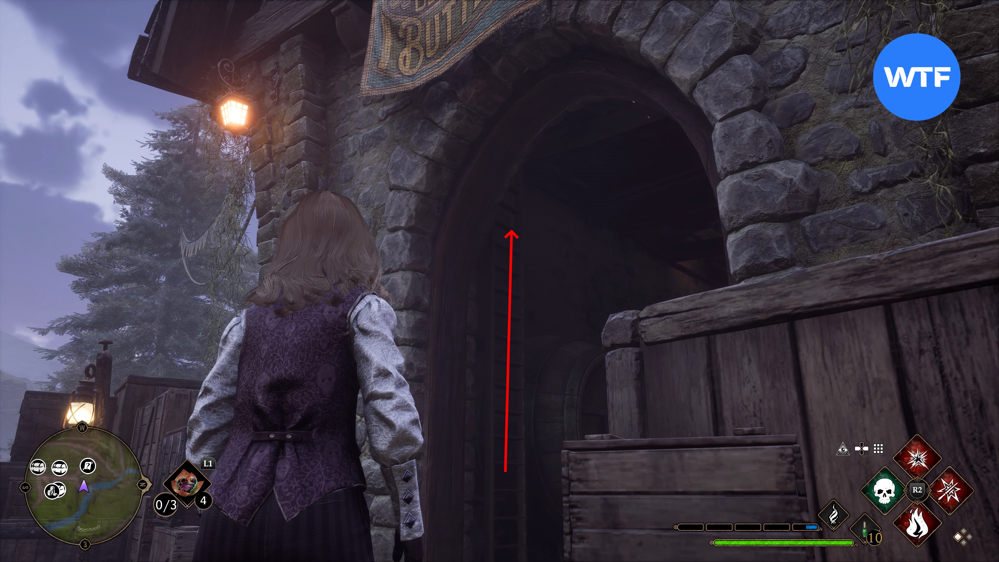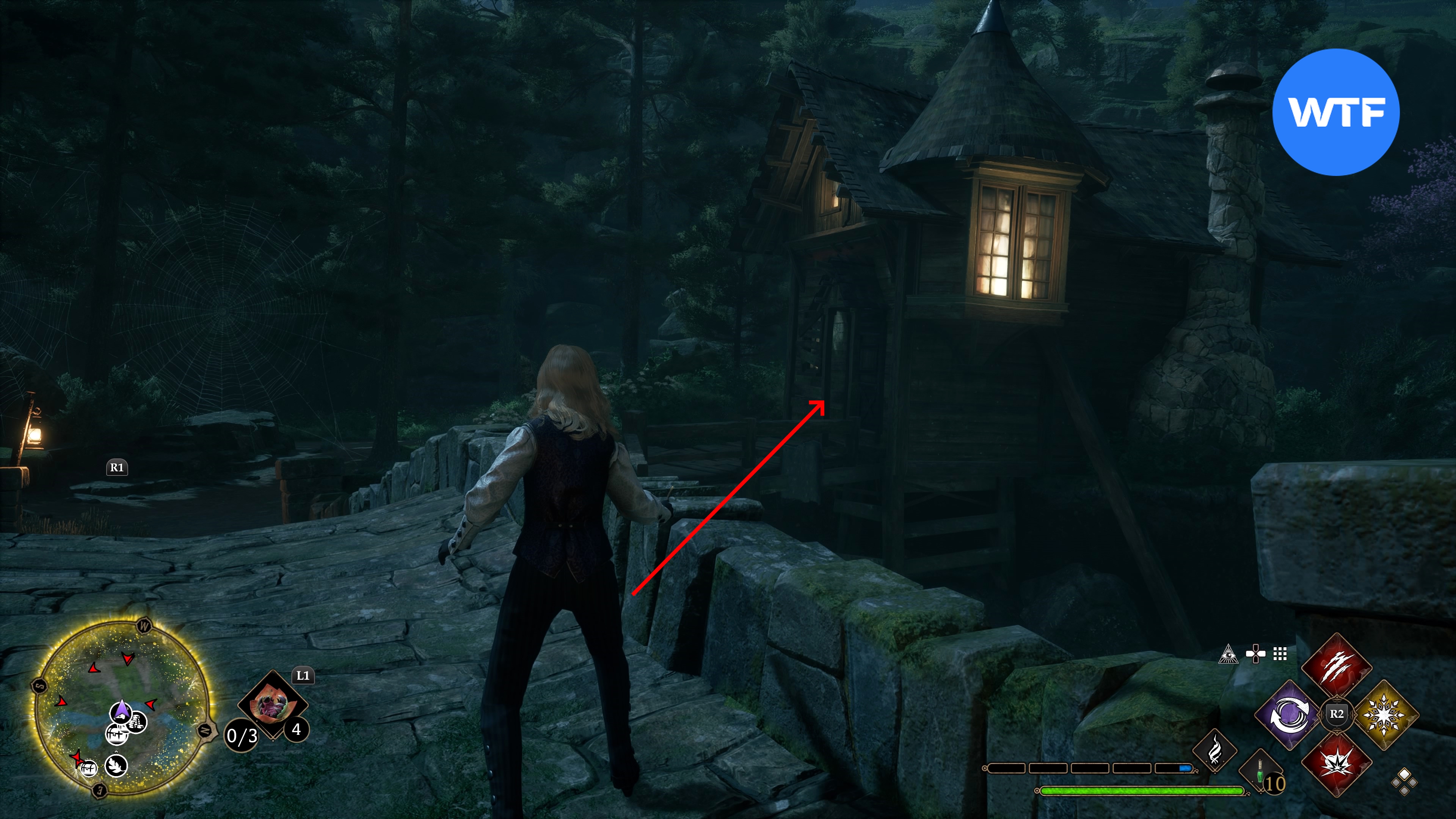 Отправляйтесь в Верхний Хогсфилд и ищите дом с вывеской Delicious Butterbeer. Слева у входа есть приставная лестница, по которой можно подняться на 2 этаж. Останется только сжечь паутину.