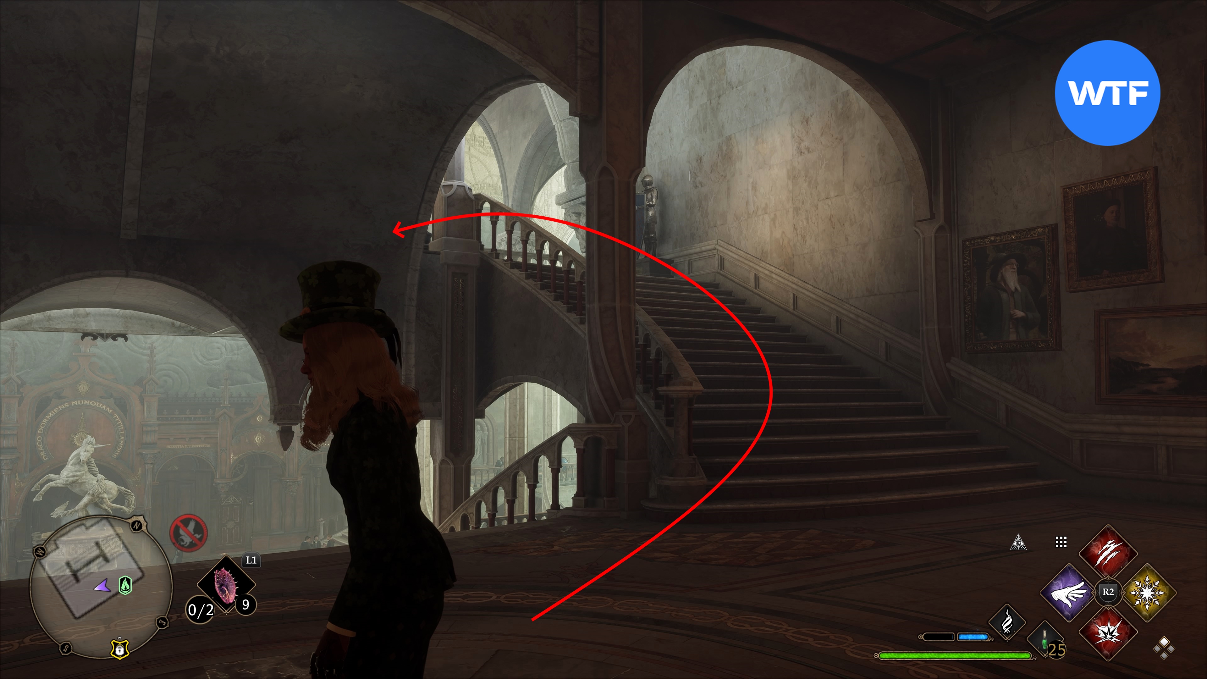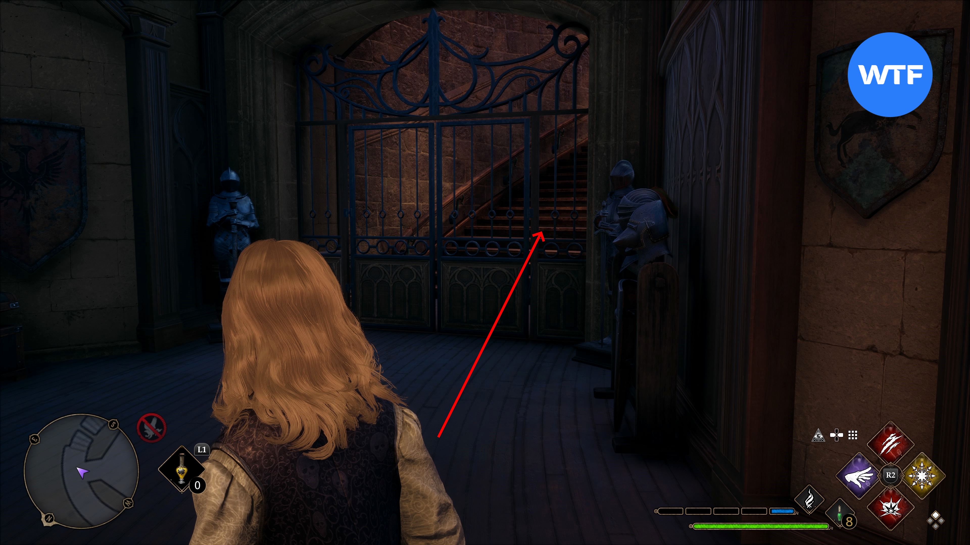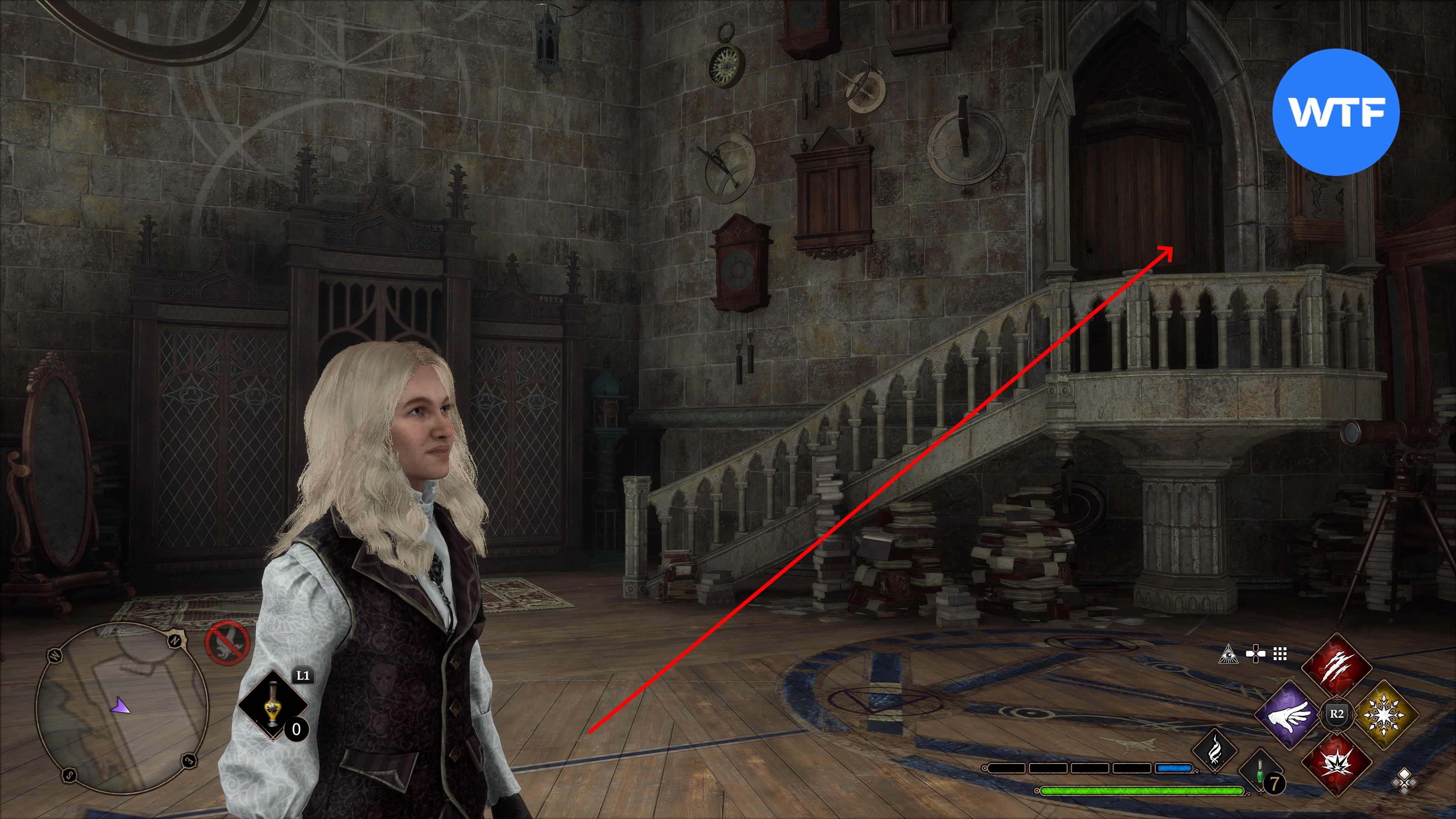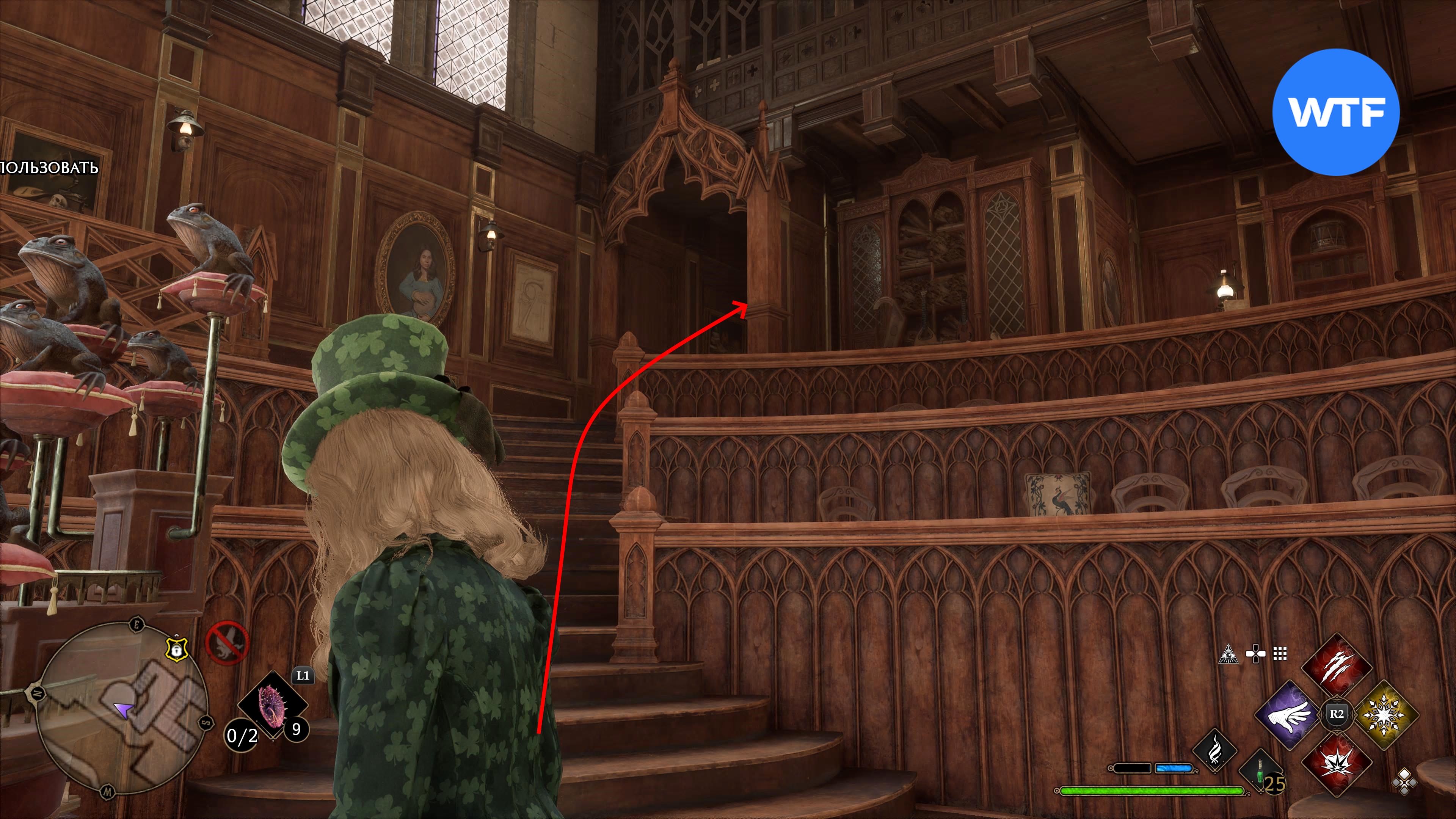 От сундука №9 продолжайте подниматься по винтовой лестнице и она приведет вас в коридор со статуями. Слева будет еще одна каменная лестница, ведущая в кабинет директора.