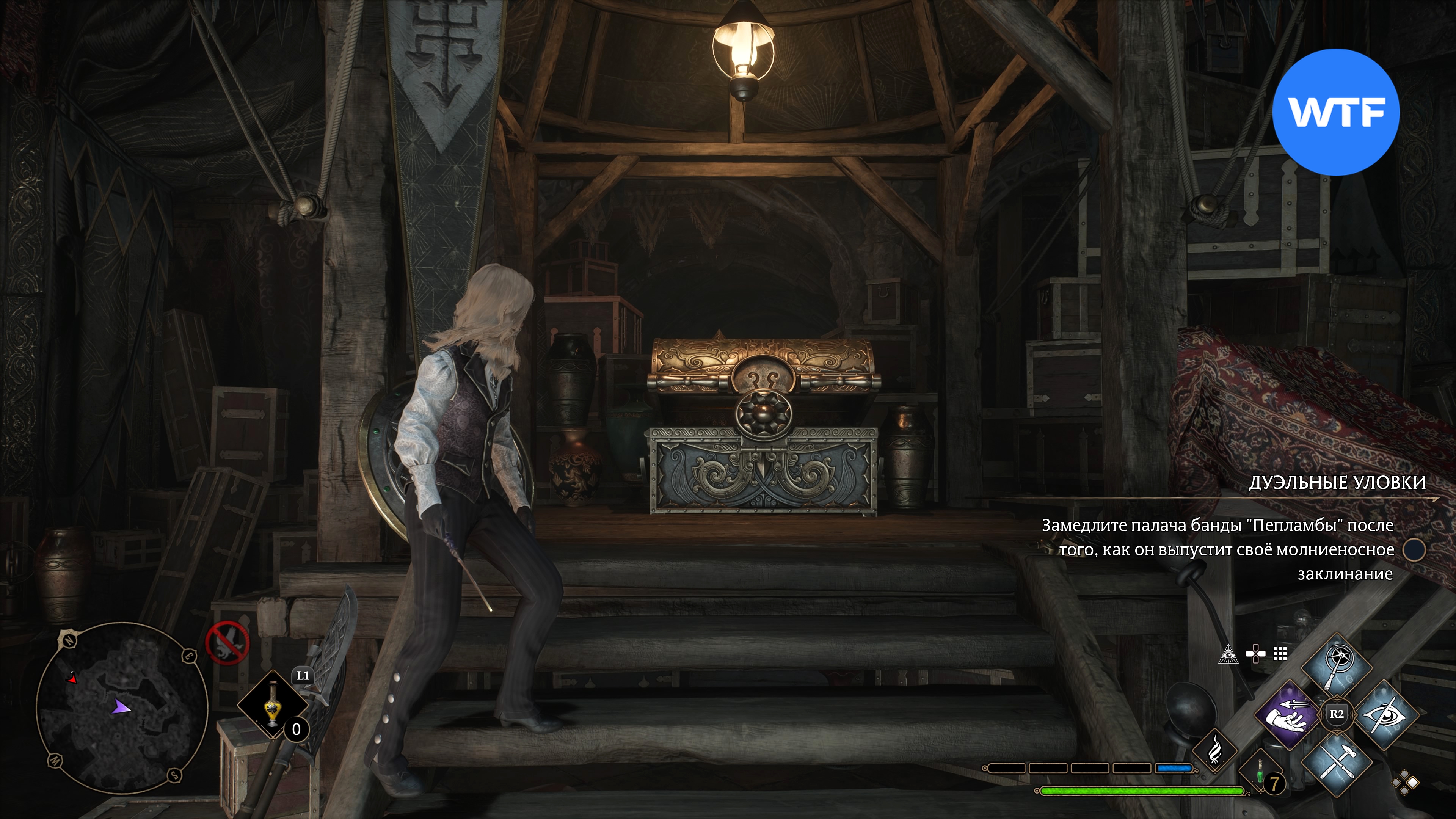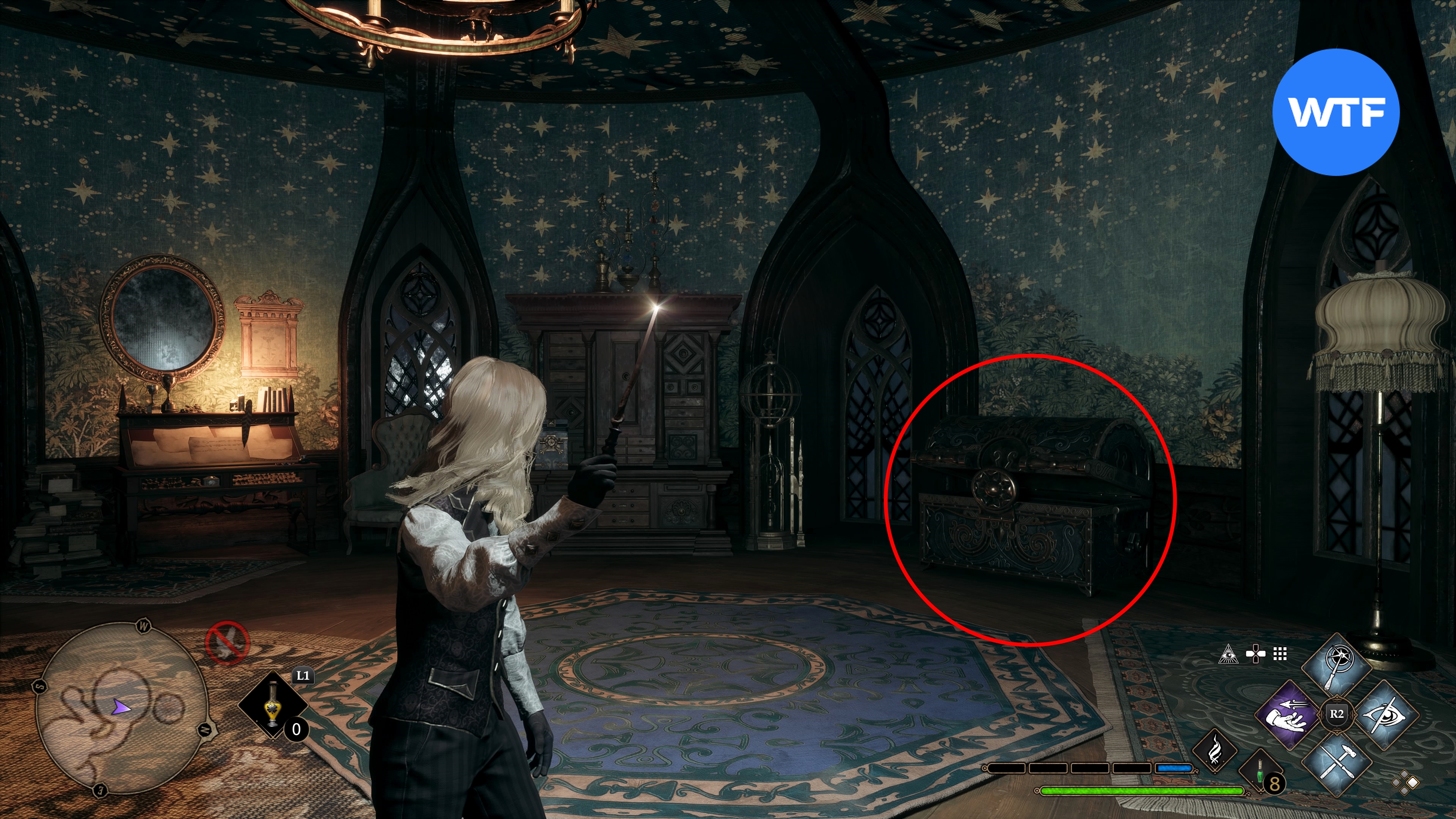 Этот сундук находится в Тайном убежище банды Пепламбы на юго-западе Хогсмида. Вы получите доступ в эту скрытую область во время дополнительного задания «Основа для шантажа» из квестовой цепочки Натсай Онай. Сундук стоит в первом большом зале с врагами.