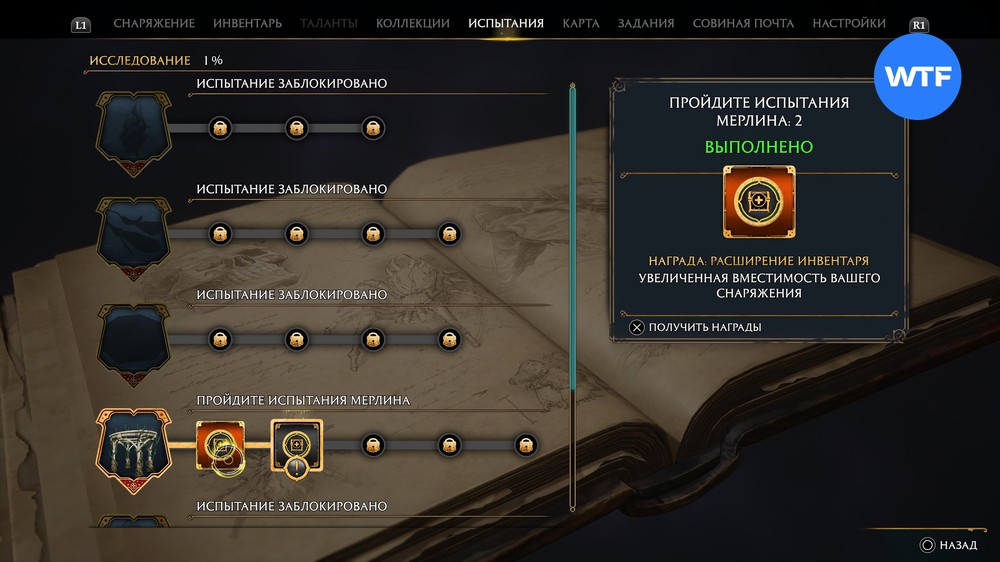 Выполняя испытания Мерлина, вы также расширяете инвентарь своего персонажа. Зайдя в раздел «Исследование» из меню испытаний, вы увидите сколько еще испытаний нужно пройти для разблокировки следующих ячеек: