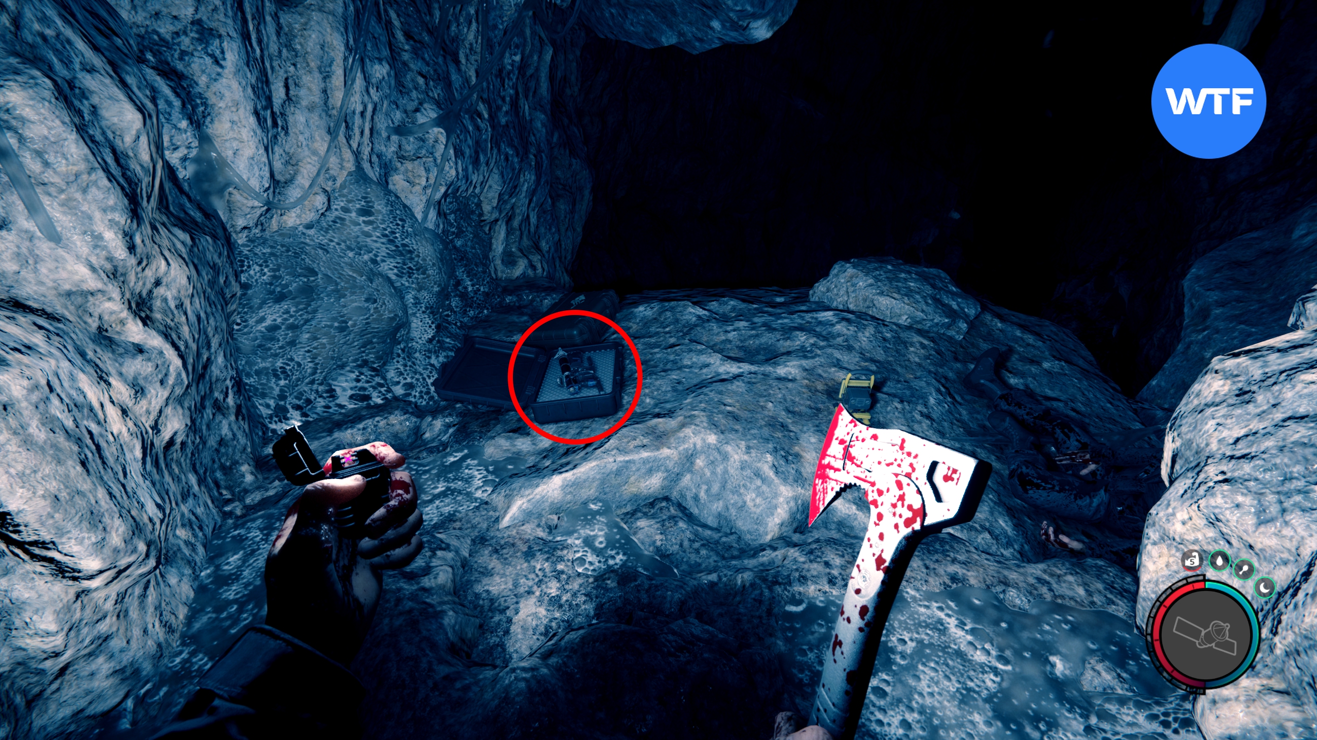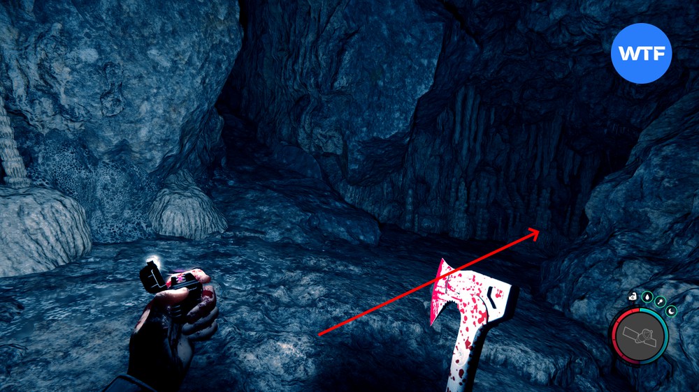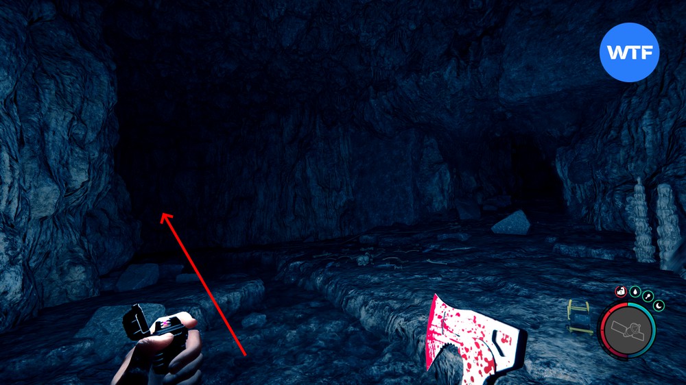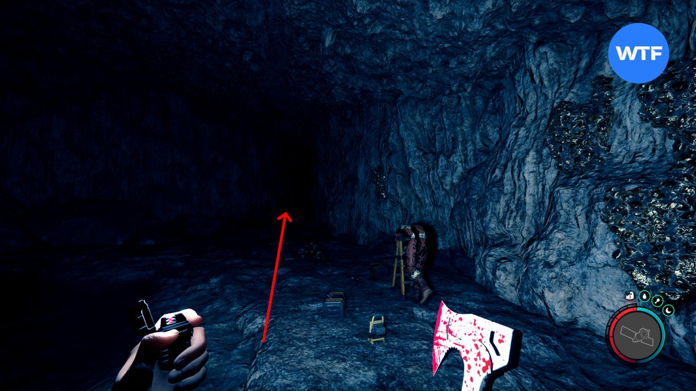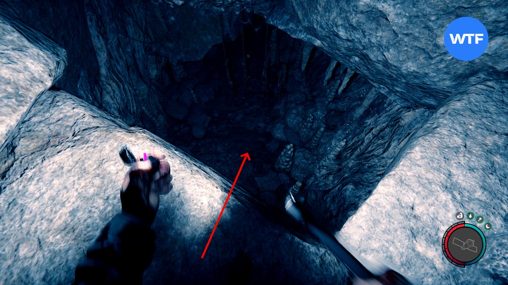 После входа в пещеру с лопатой пройдите немного вперед, а затем воспользуйтесь тросометом, чтобы съехать вниз по веревке. После спуска ныряйте и используйте акваланг: вам нужно проплыть в скрытую часть локации через дыру на дне.