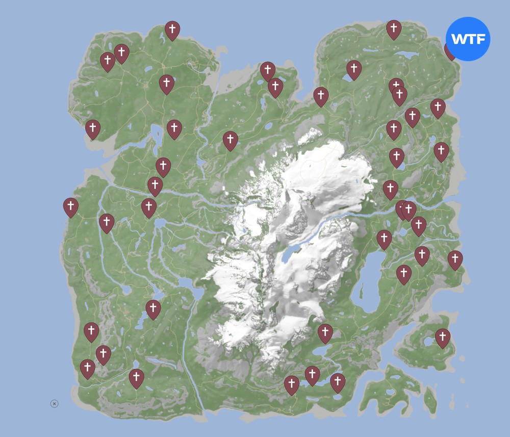 Могилы, где благодаря лопате можно получить что-нибудь полезное, разбросаны по всему игровому миру. Ниже вы найдете карту с примерными отметками таких мест — здесь с помощью лопаты можно выкапывать разнообразные предметы и ресурсы. Например, в одной из могил вы найдете дробовик.