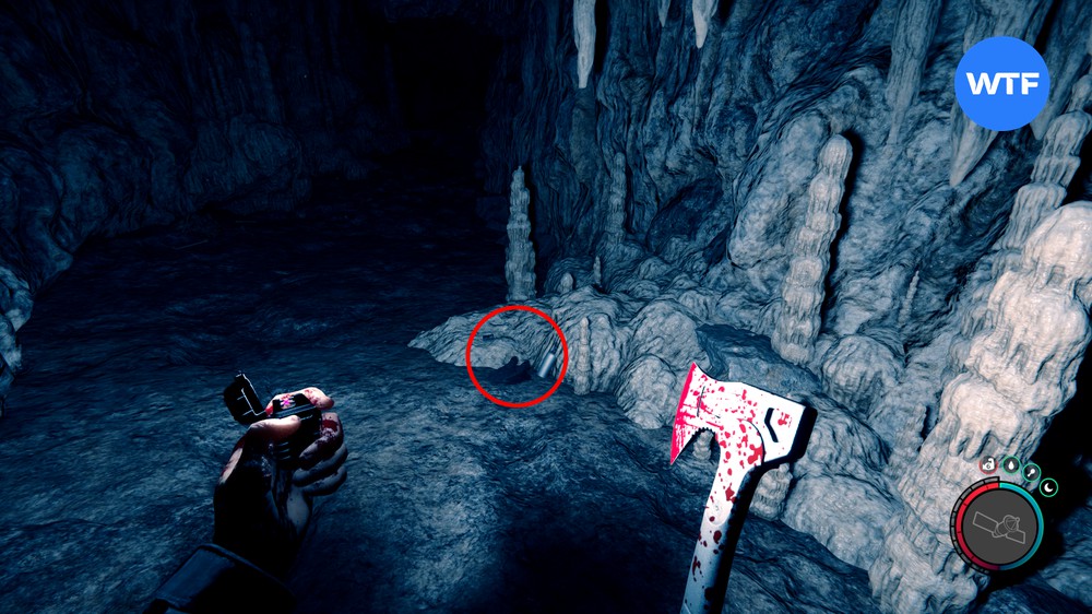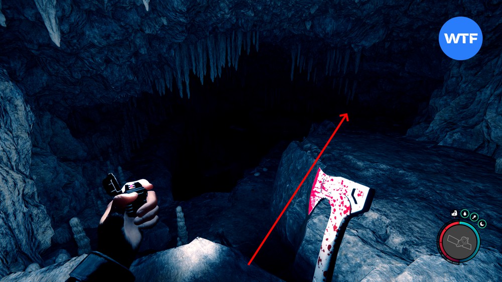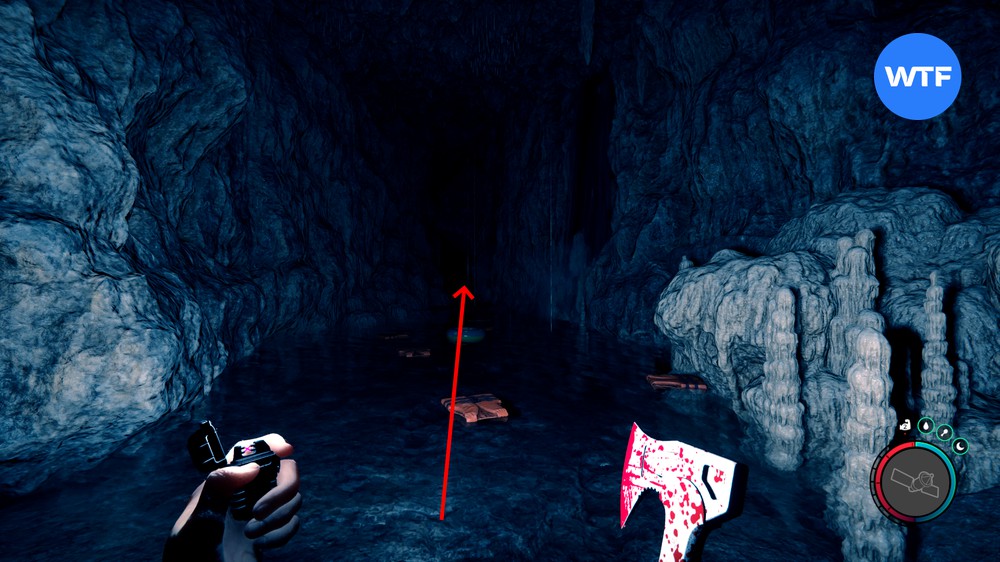 В итоге вы дойдете до области с высоким сводом, в нижней части которой в воде плавает акула. Если разобраться с ней и занырнуть с аквалангом — можно найти еще один выход из пещеры.