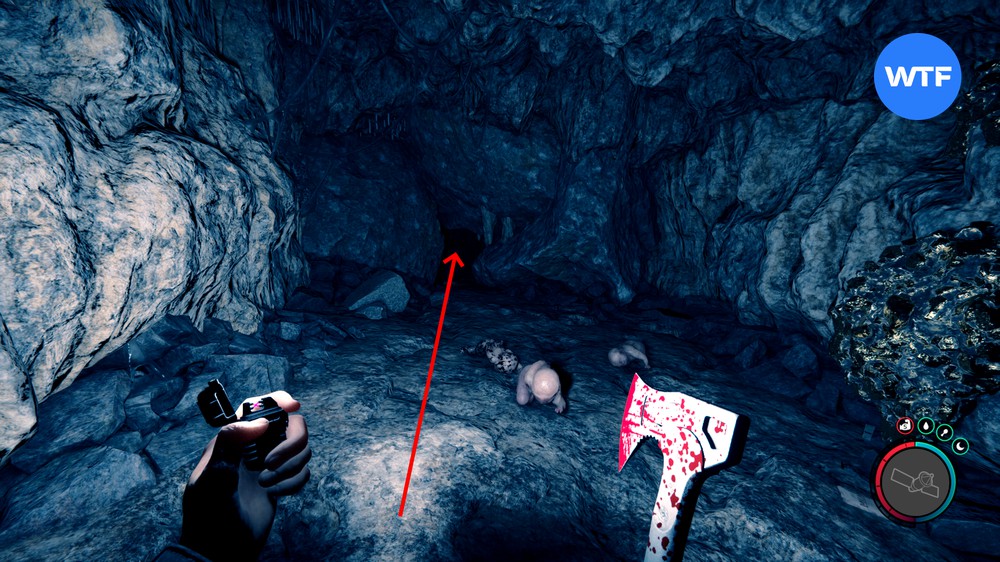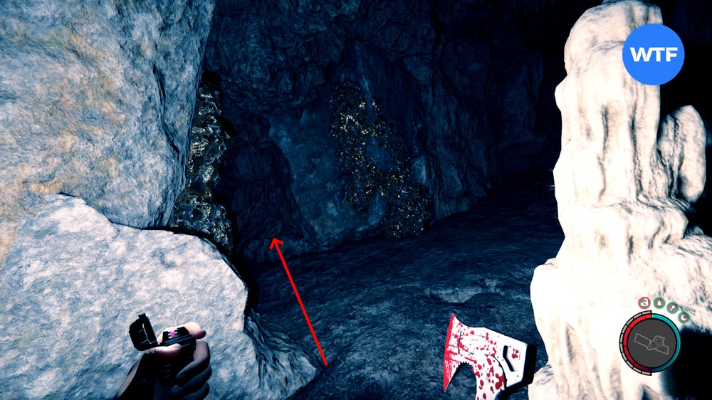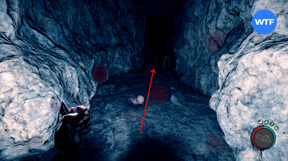 В конце этого тоннеля посмотрите направо: там в стене есть еще один мутант, который перекрывает проход. Используйте взрывчатку, чтобы расчистить путь, и запомните это место. Вам нужно будет вернуться сюда в конце, когда решите покинуть пещеру.