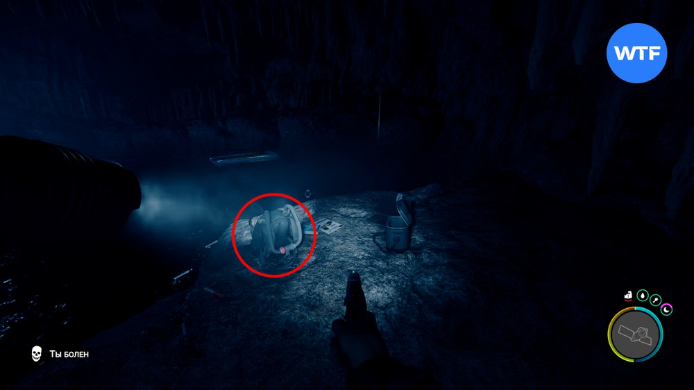Следующий ориентир — вторая затопленная область в этой пещере. Если видите плавающие в воде спасательные жилеты и надувные круги, значит, продолжайте двигаться в этом направлении.
